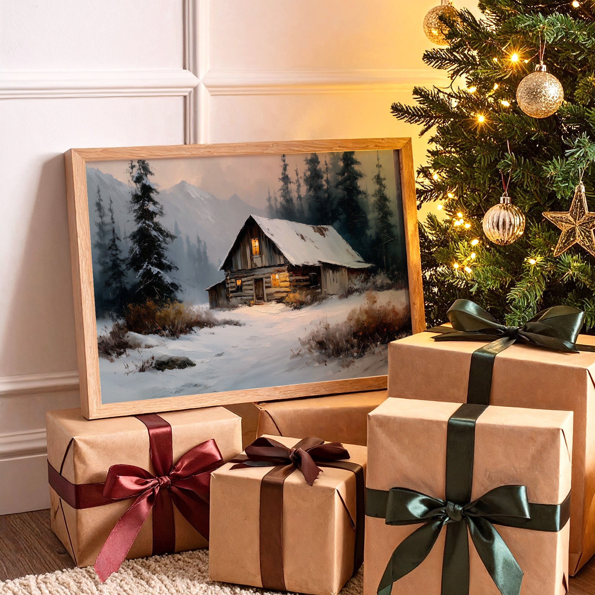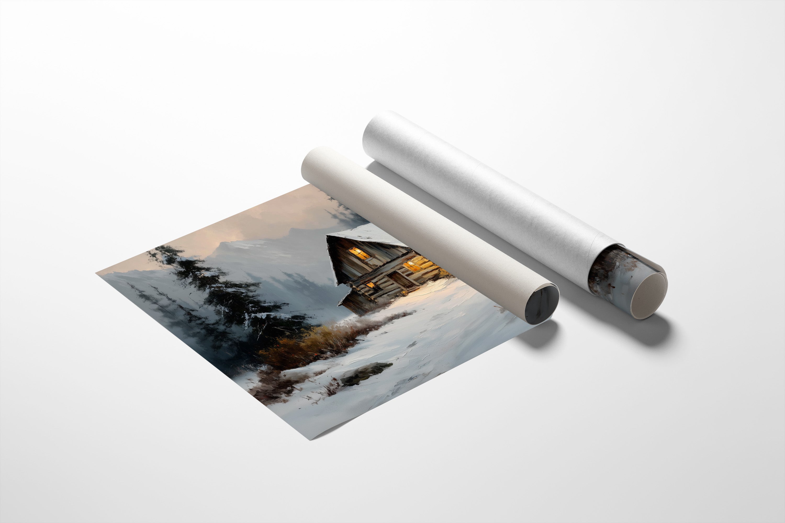 Golden light spills from frosted windows, a beacon of warmth against the crisp winter evening. The rustic log cabin stands resolute among towering evergreens, its weathered walls telling stories of countless mountain seasons. Snow-laden paths wind through the peaceful scene, while misty peaks rise majestically in the distance, their silhouettes softened by the approaching dusk. This tranquil winter landscape captures the essence of solitude and comfort found in nature's embrace. Perfect for creating a cozy atmosphere in a reading nook, home office, or any space where you seek to evoke a sense of peaceful retreat.