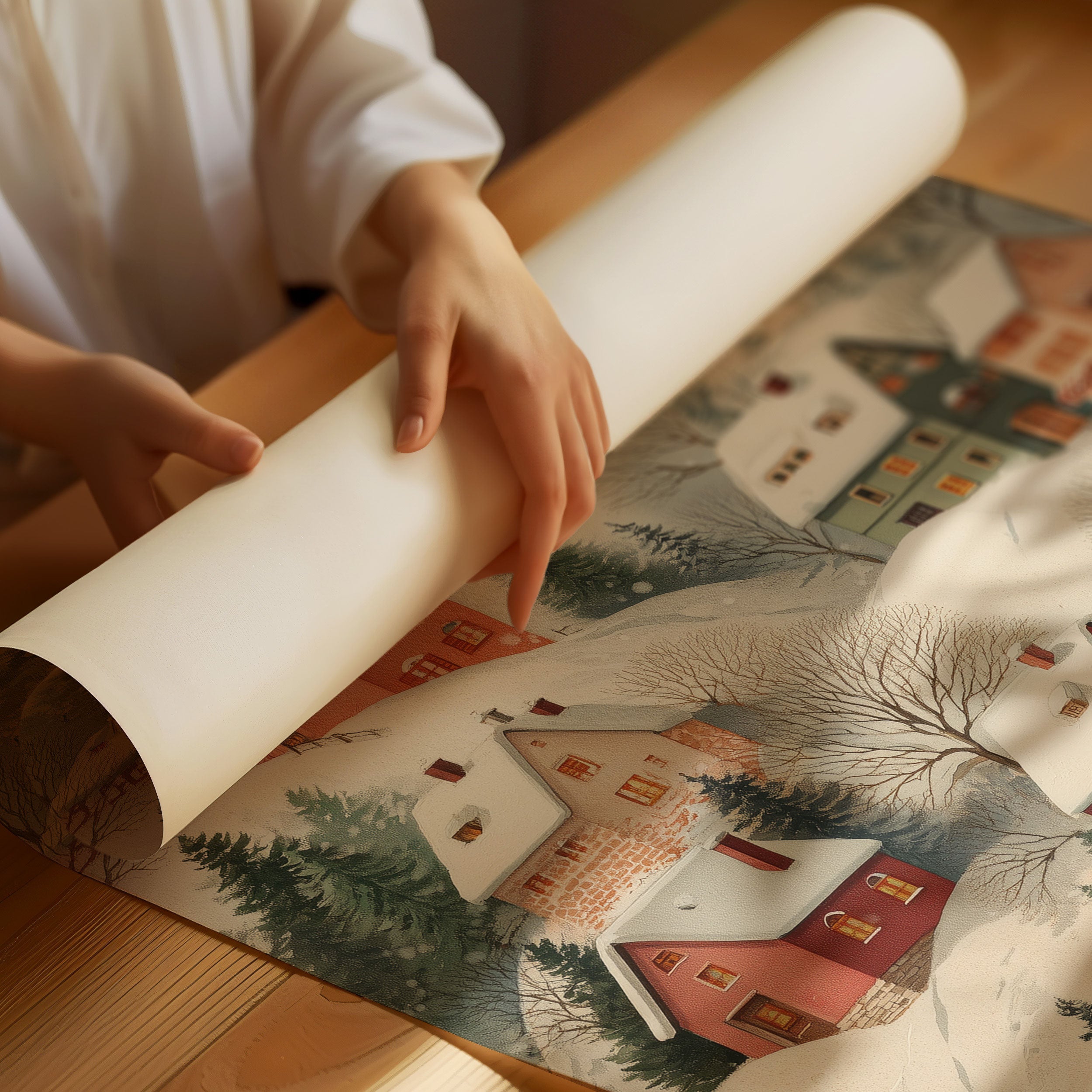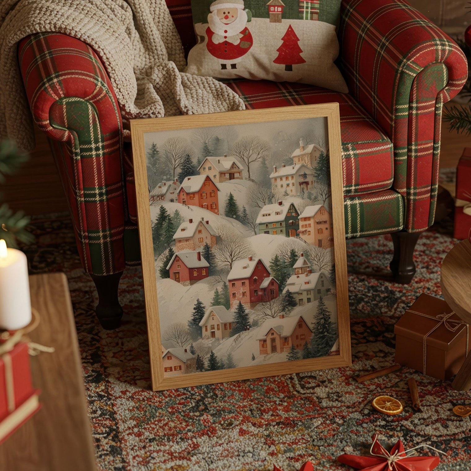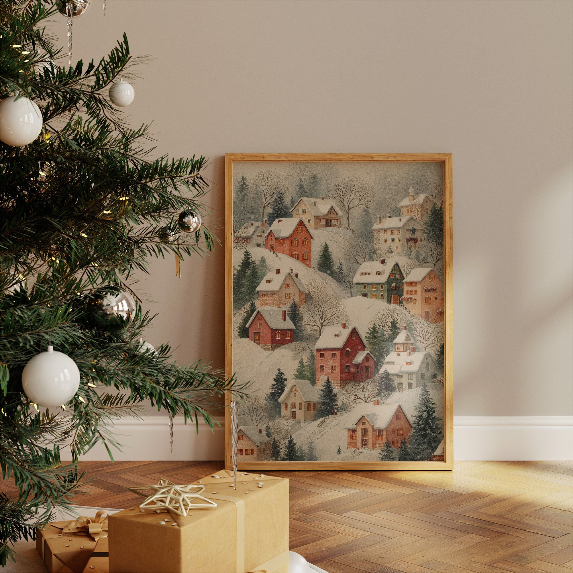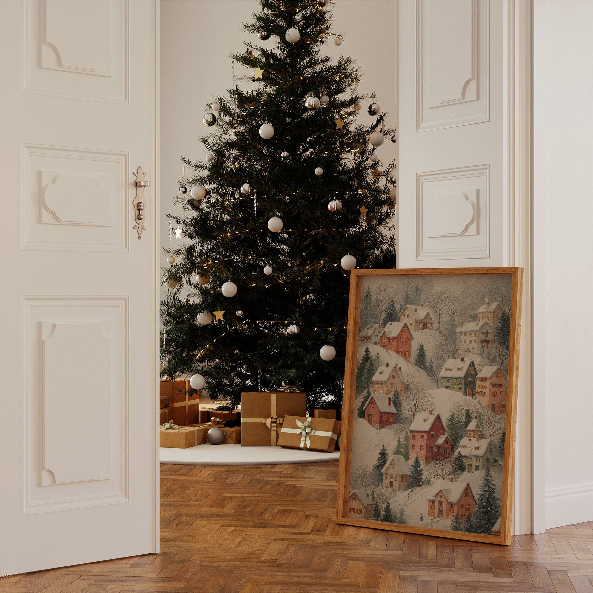 Gentle winter light streams through sheer curtains, illuminating a serene corner where nostalgia meets modern simplicity. A charming vintage-style painting depicts a hillside village dusted with snow, its red and cream houses nestled among evergreen trees like a scene from a cherished holiday memory. The warm glow of a white Christmas tree creates an ethereal atmosphere, its lights reflecting softly against the neutral walls and wooden elements. This tranquil vignette would transform any living space into a peaceful sanctuary, perfect for a reading nook or meditation corner where winter stories unfold.