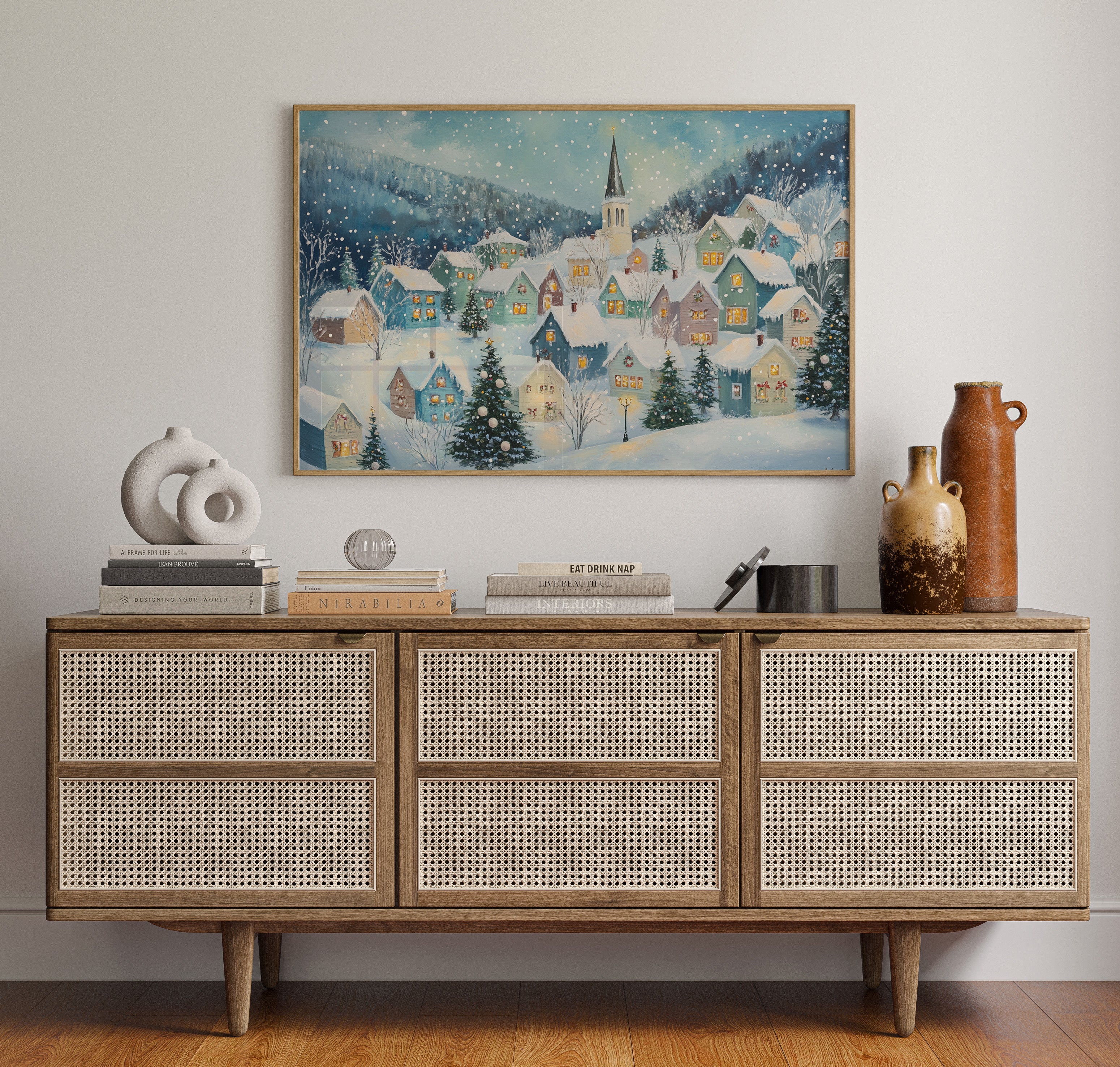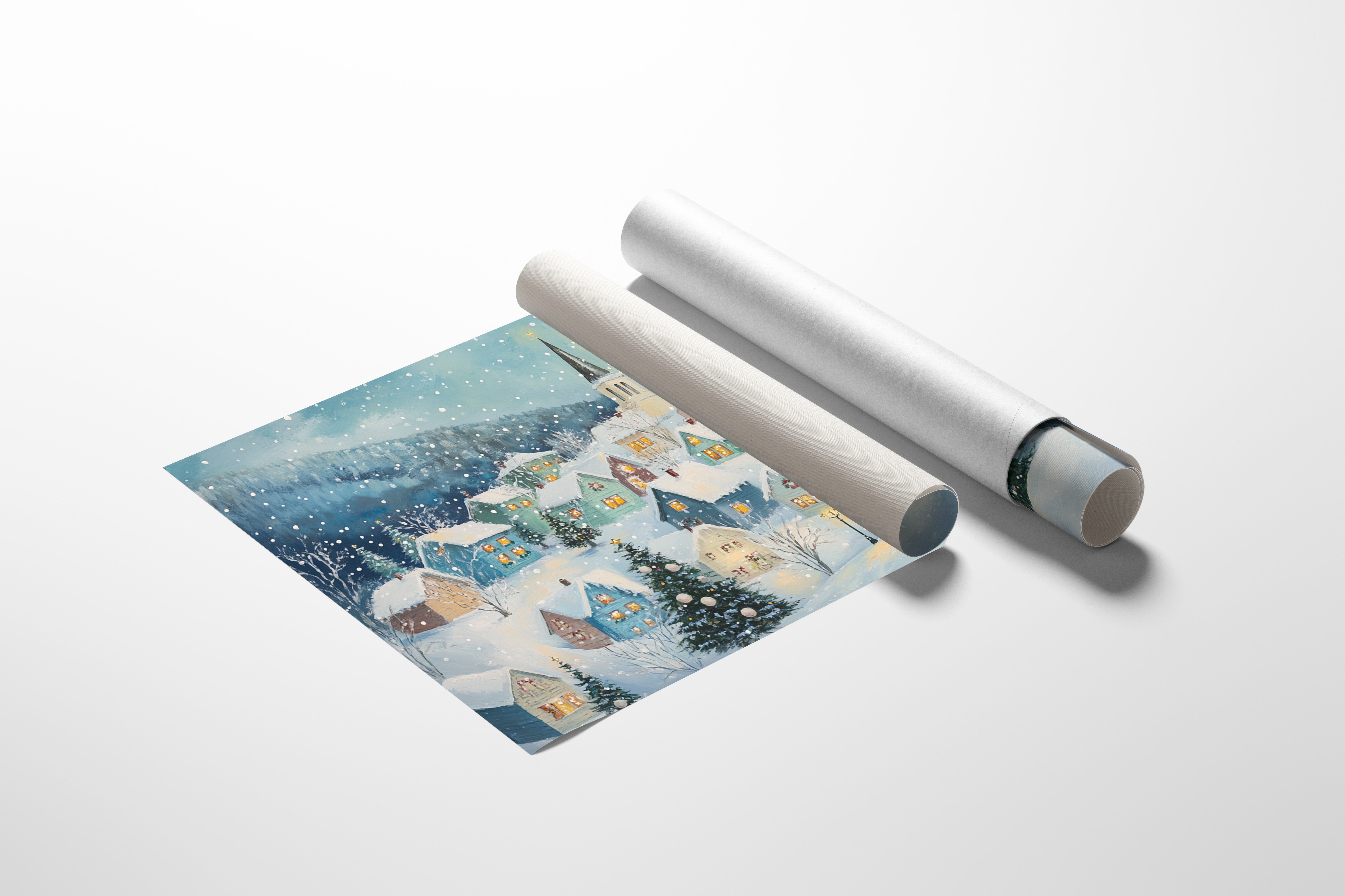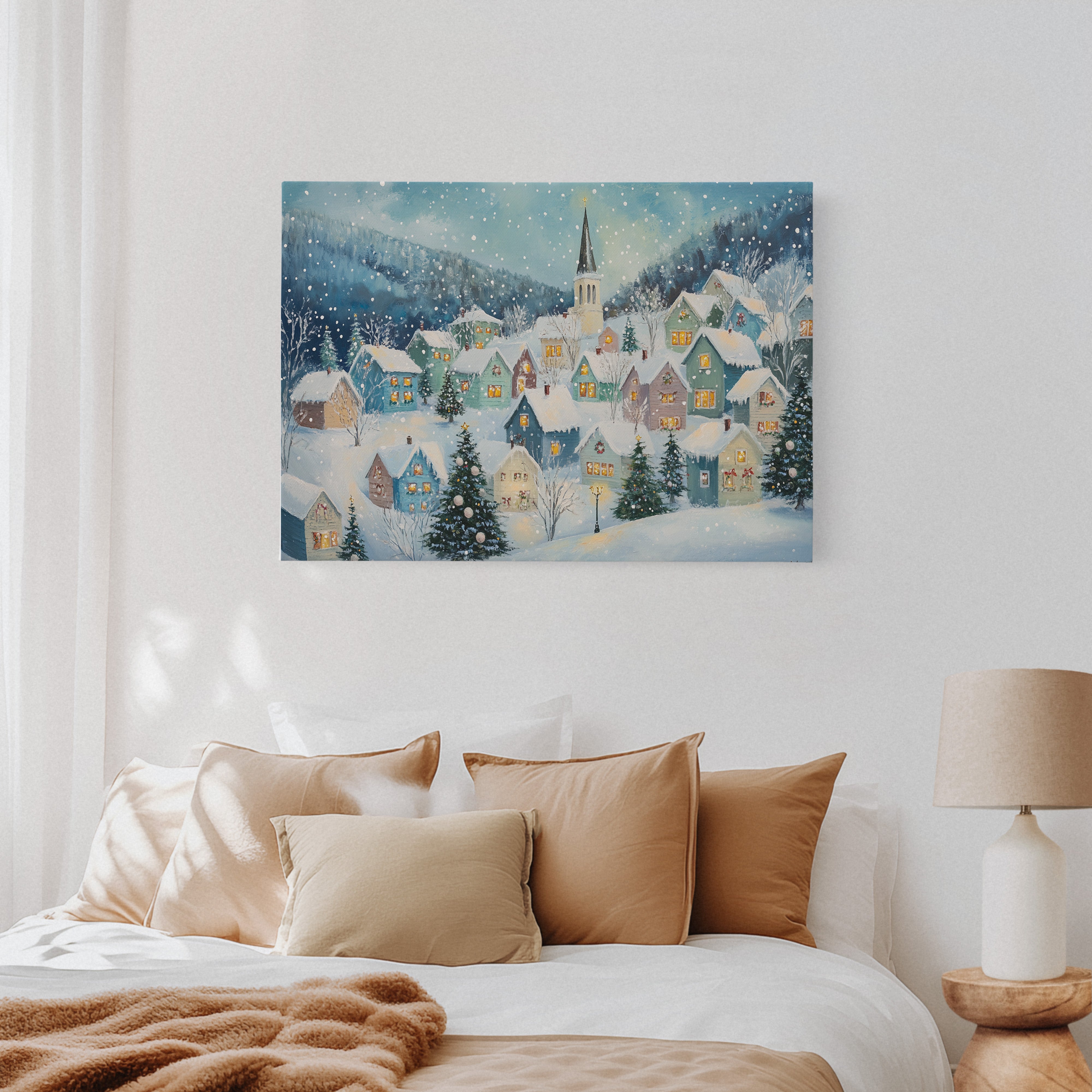 Gentle snowflakes drift through the evening air, dancing past windows that glow like warm honey against the winter twilight. A quaint village nestles into the mountainside, its collection of mint green, powder blue, and cream-colored houses creating a patchwork of comfort against the deepening night. Church spires pierce the starlit sky while evergreens stand sentinel between the homes, their branches heavy with fresh snow. This scene captures the essence of winter's quiet magic, where each illuminated window tells its own story of warmth and belonging. Perfect for creating a cozy atmosphere in living rooms, bedrooms, or any space where you want to invoke the peaceful charm of a snow-blessed evening.