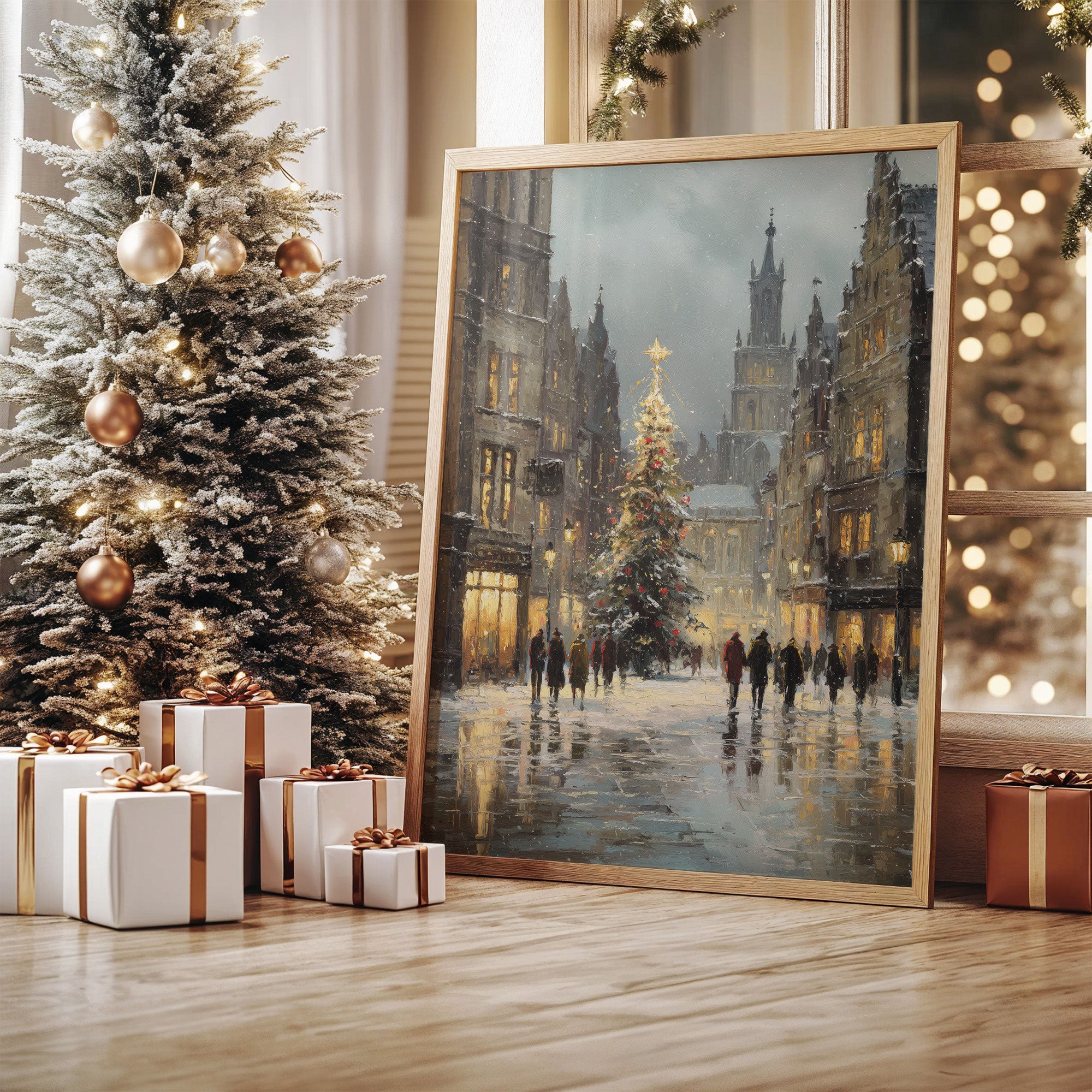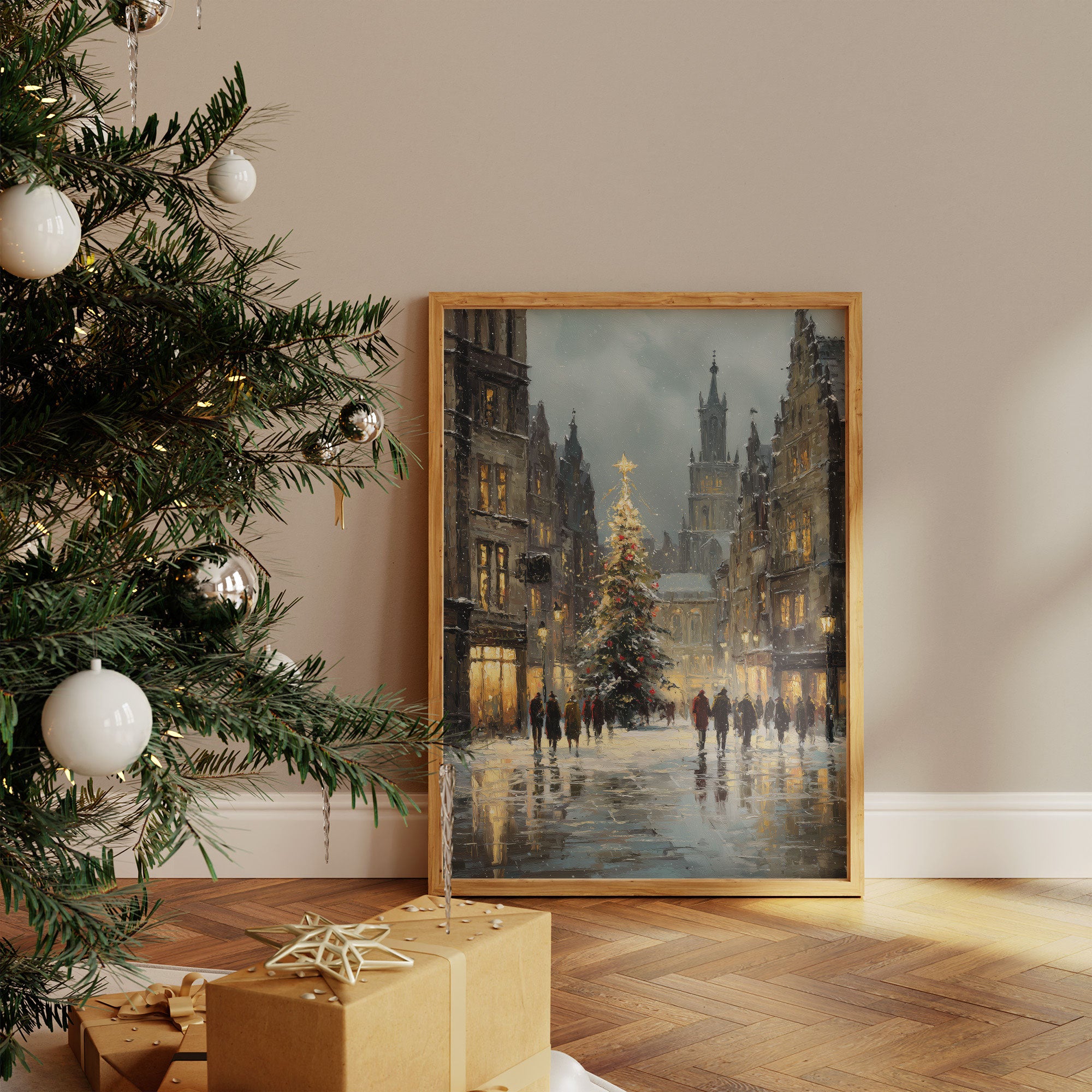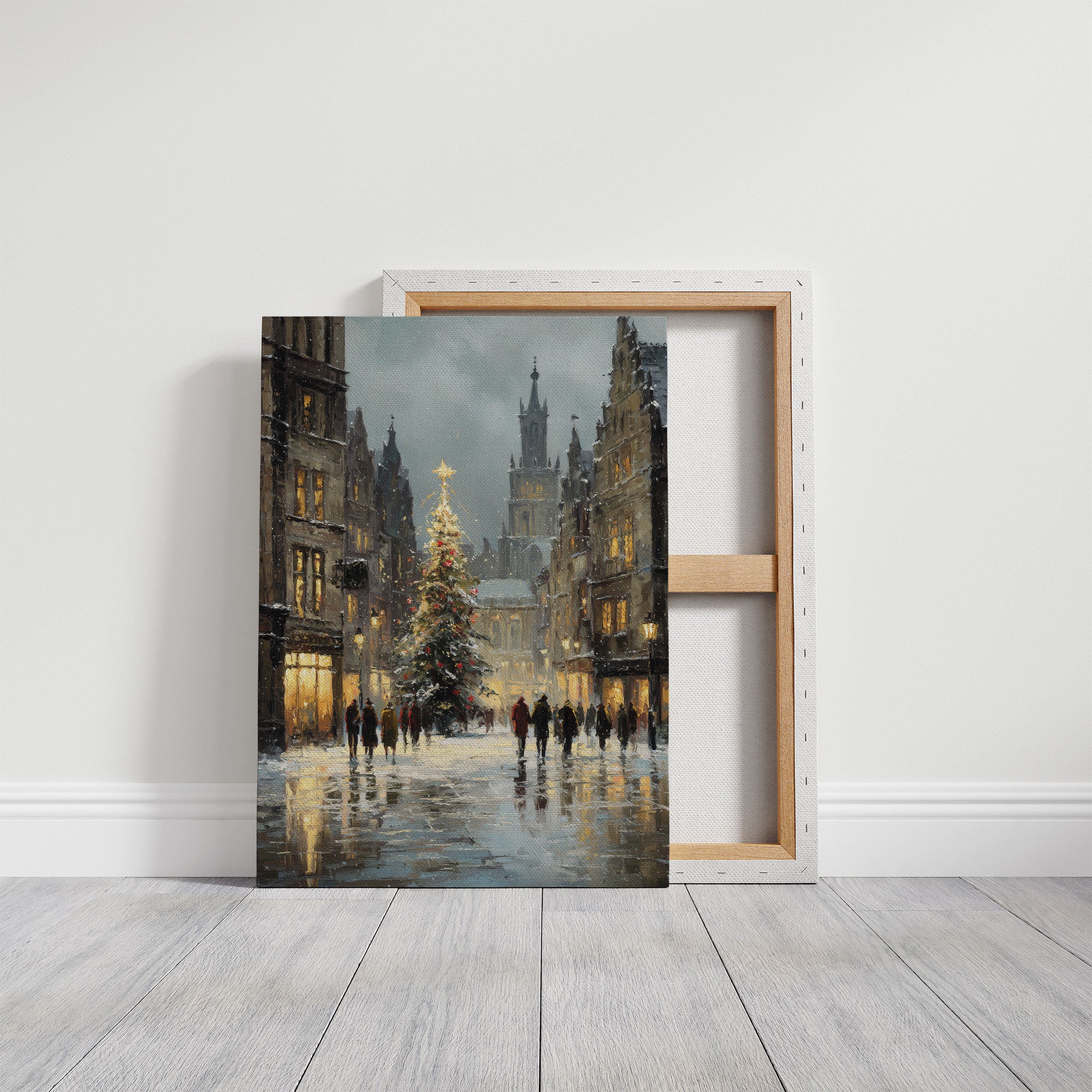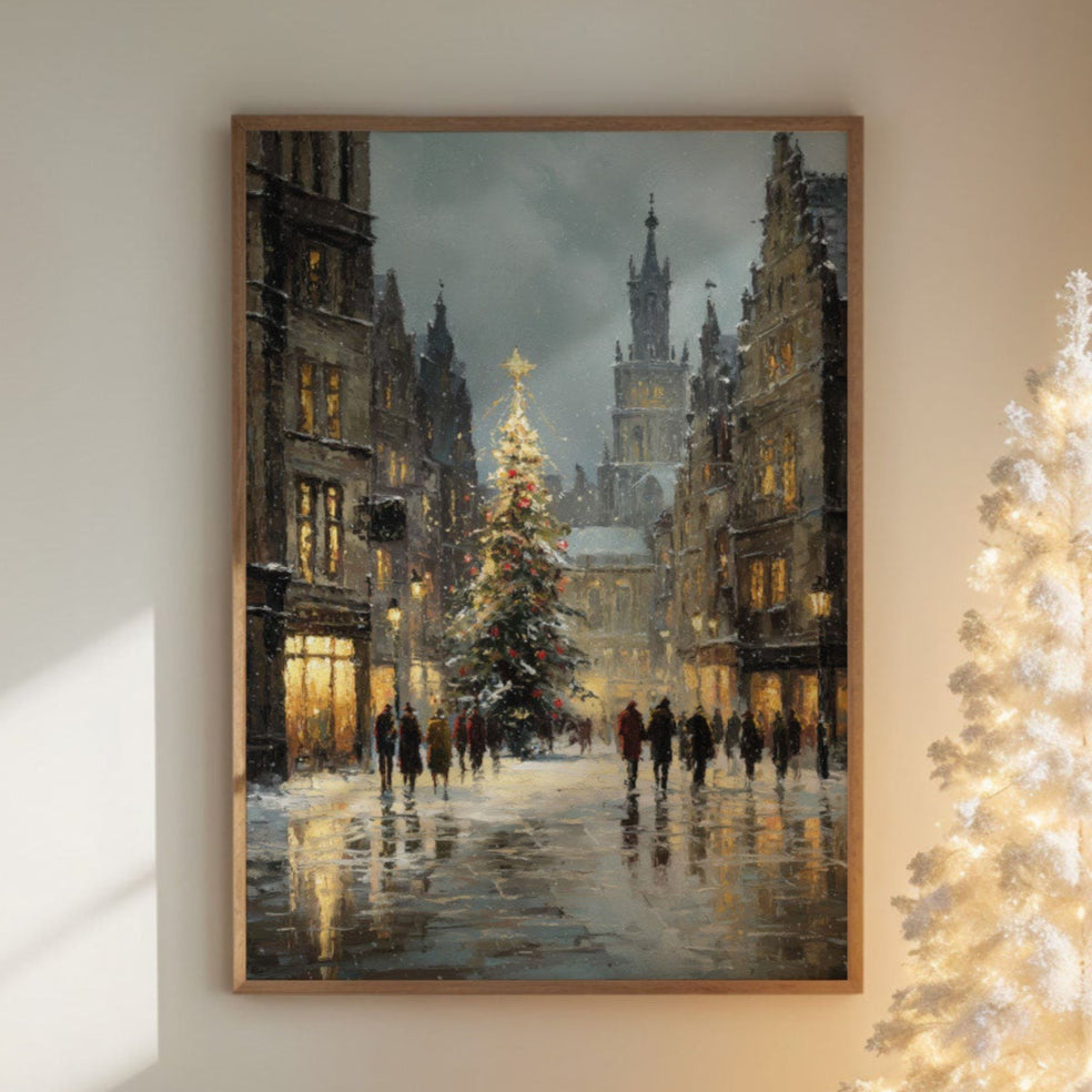 Golden light spills across wet cobblestones, where figures move like brushstrokes through the winter evening. A majestic Christmas tree stands sentinel between historic buildings, its star piercing the dusky sky as snowflakes begin their gentle descent. The scene captures that magical moment when day fades to night, when windows glow amber and the cathedral spire rises like a prayer into steel-blue clouds. Perfect for creating a cozy corner in living rooms or bedrooms, this piece brings the enchantment of European winter evenings into any space.