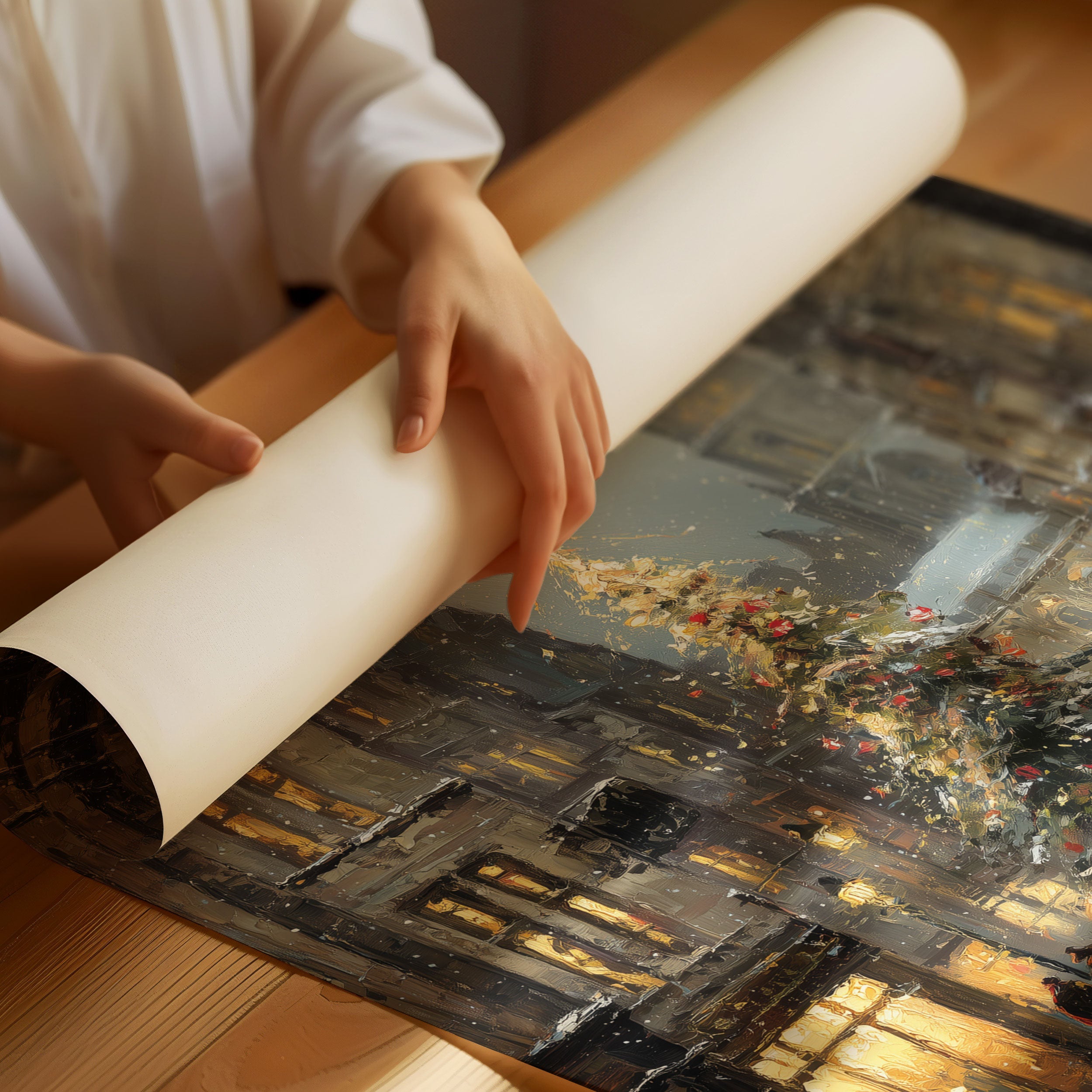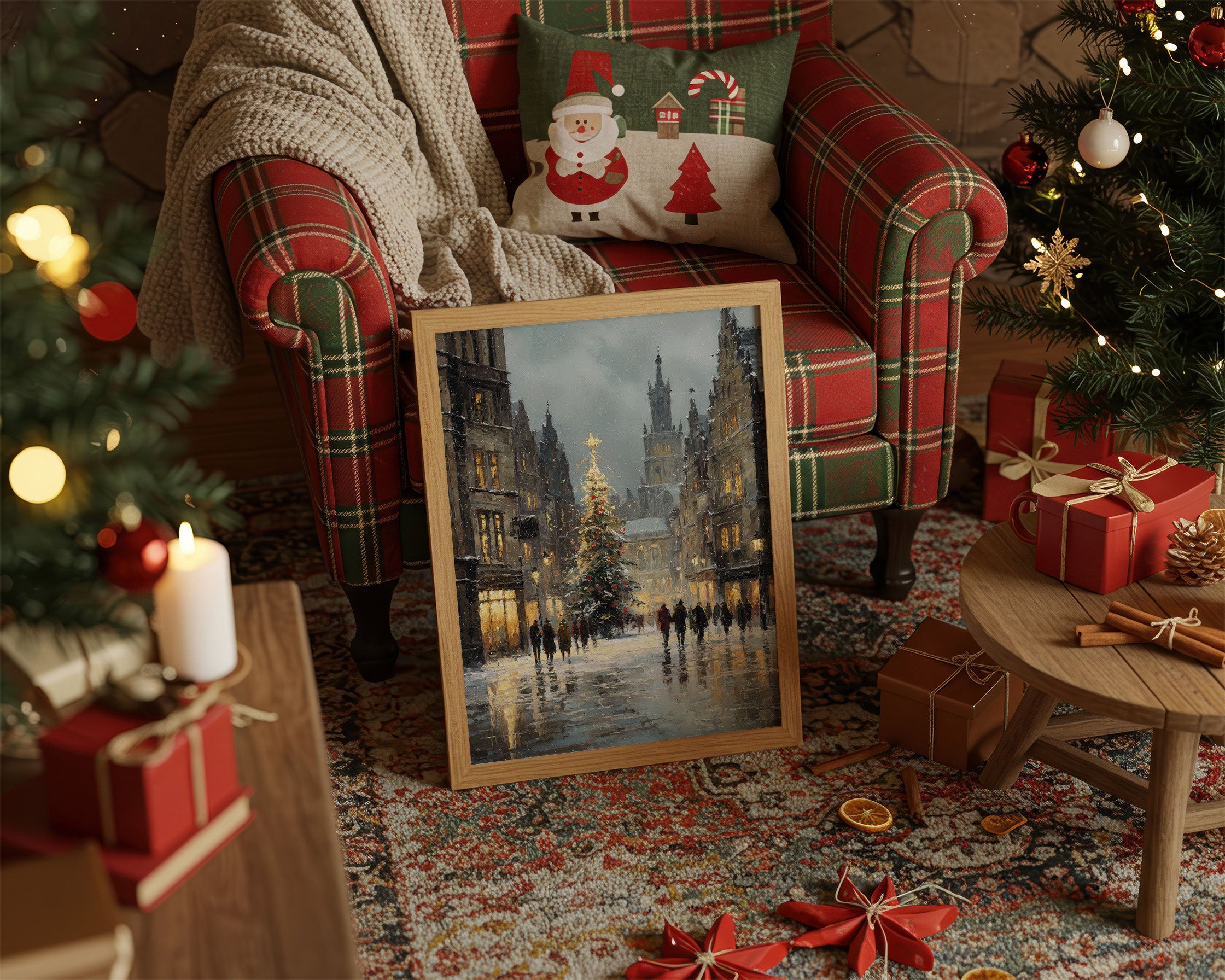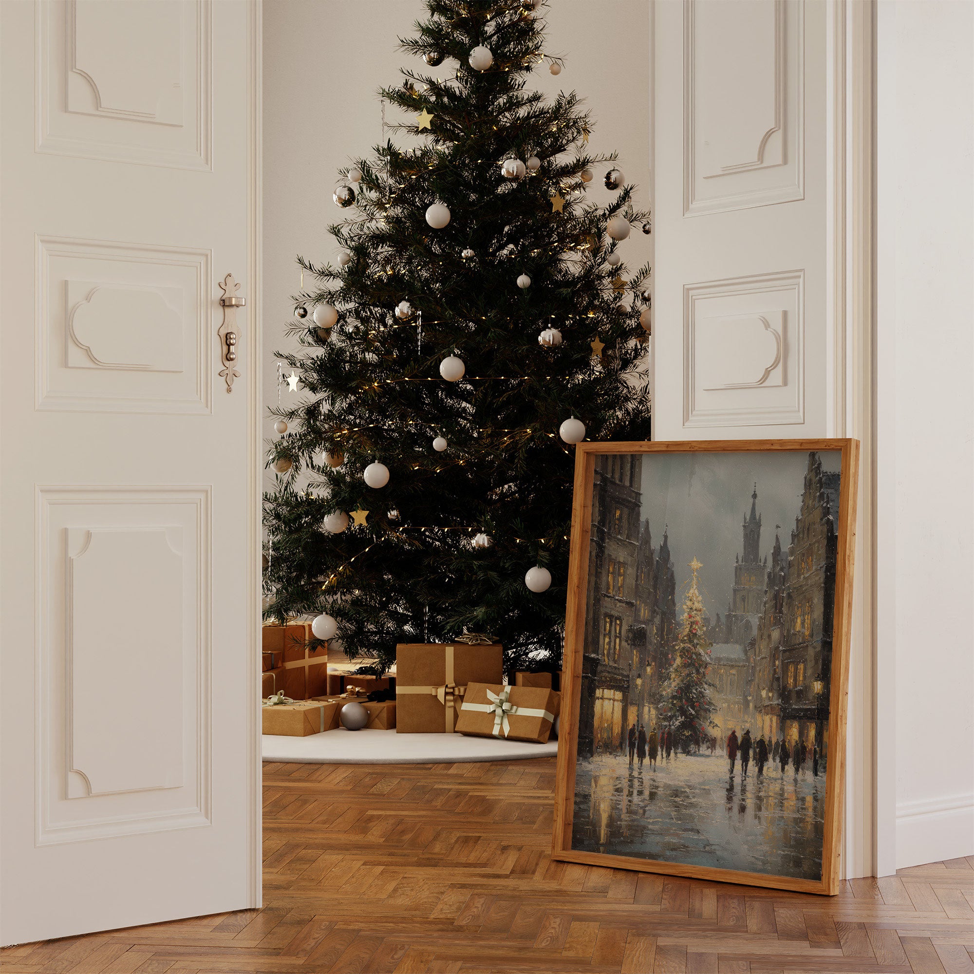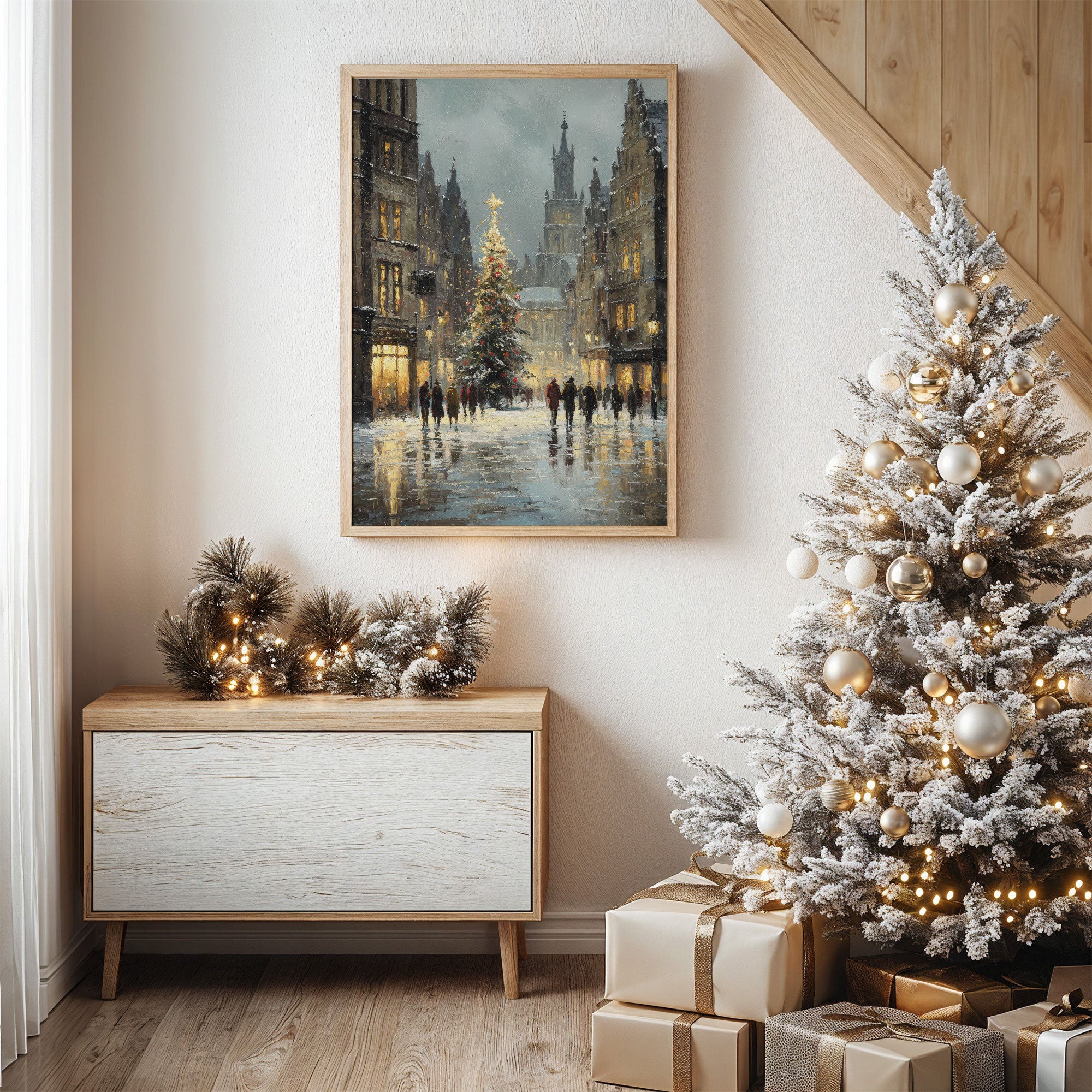 Golden light spills across wet cobblestones, where figures move like brushstrokes through the winter evening. A majestic Christmas tree stands sentinel between historic buildings, its star piercing the dusky sky as snowflakes begin their gentle descent. The scene captures that magical moment when day fades to night, when windows glow amber and the cathedral spire rises like a prayer into steel-blue clouds. Perfect for creating a cozy corner in living rooms or bedrooms, this piece brings the enchantment of European winter evenings into any space.