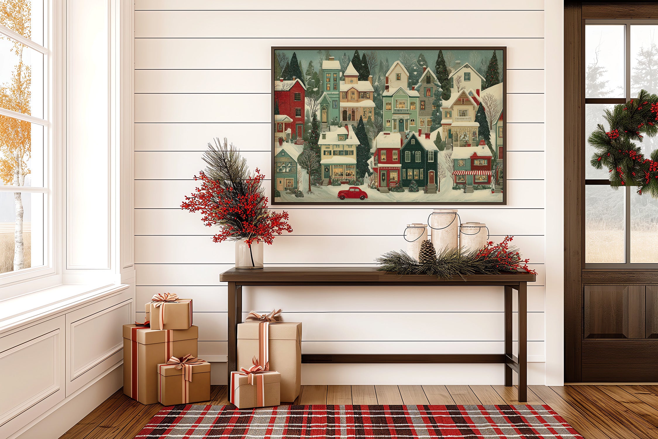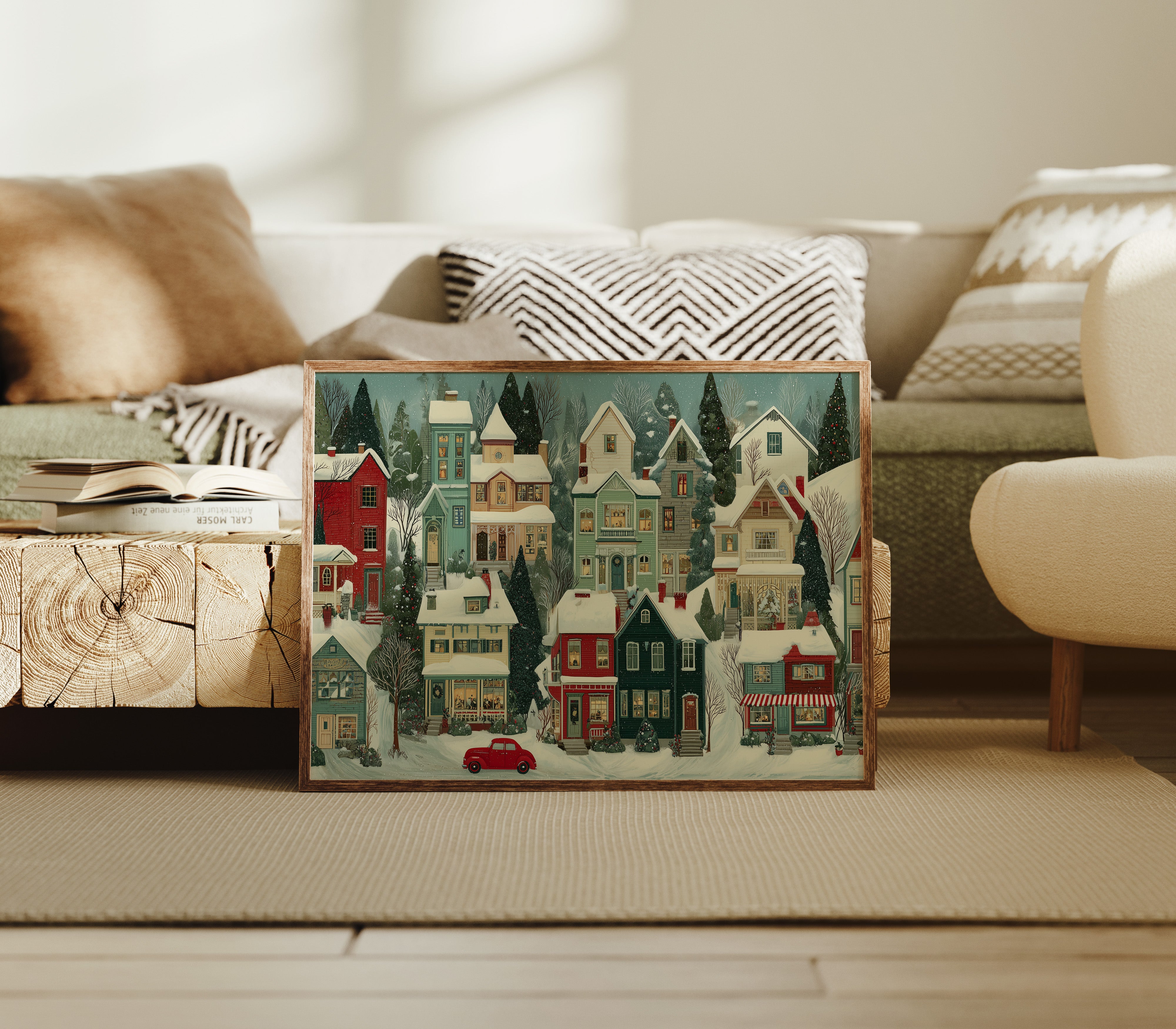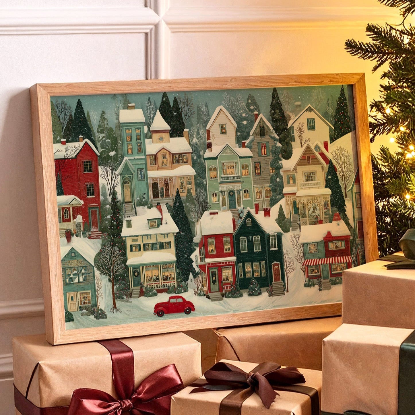 A charming winter village comes alive with the warmth of glowing windows and the gentle dusting of snow. Victorian houses in mint, crimson, and forest green huddle together along winding streets, their architectural details enhanced by holiday decorations and twinkling lights. A small red car adds a pop of nostalgia against the snowy scene, while evergreen trees stand sentinel between the homes like gentle guardians of this peaceful community. This piece brings the cozy essence of a winter evening to any room, perfect for creating a nostalgic focal point in reading nooks or living spaces where stories are shared.