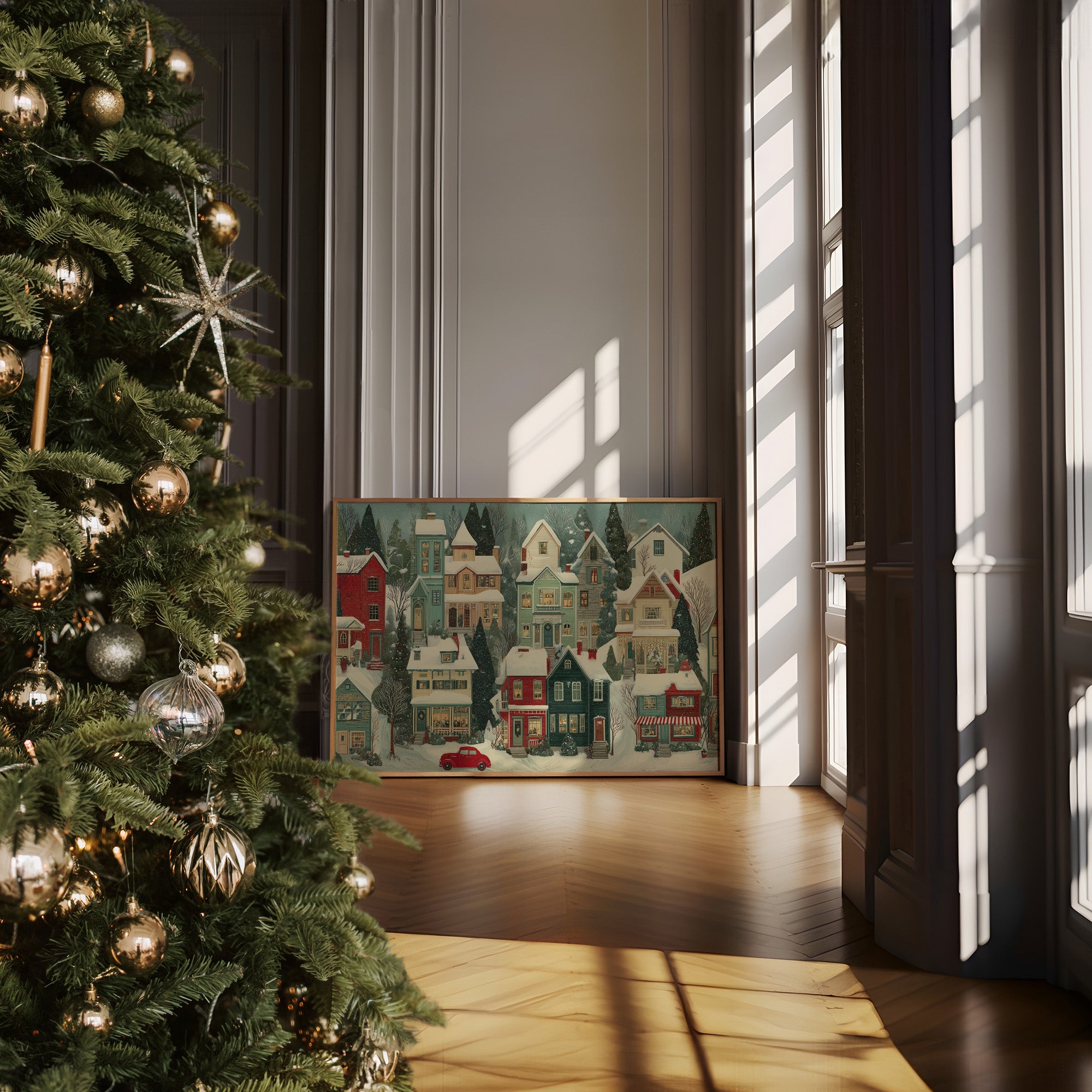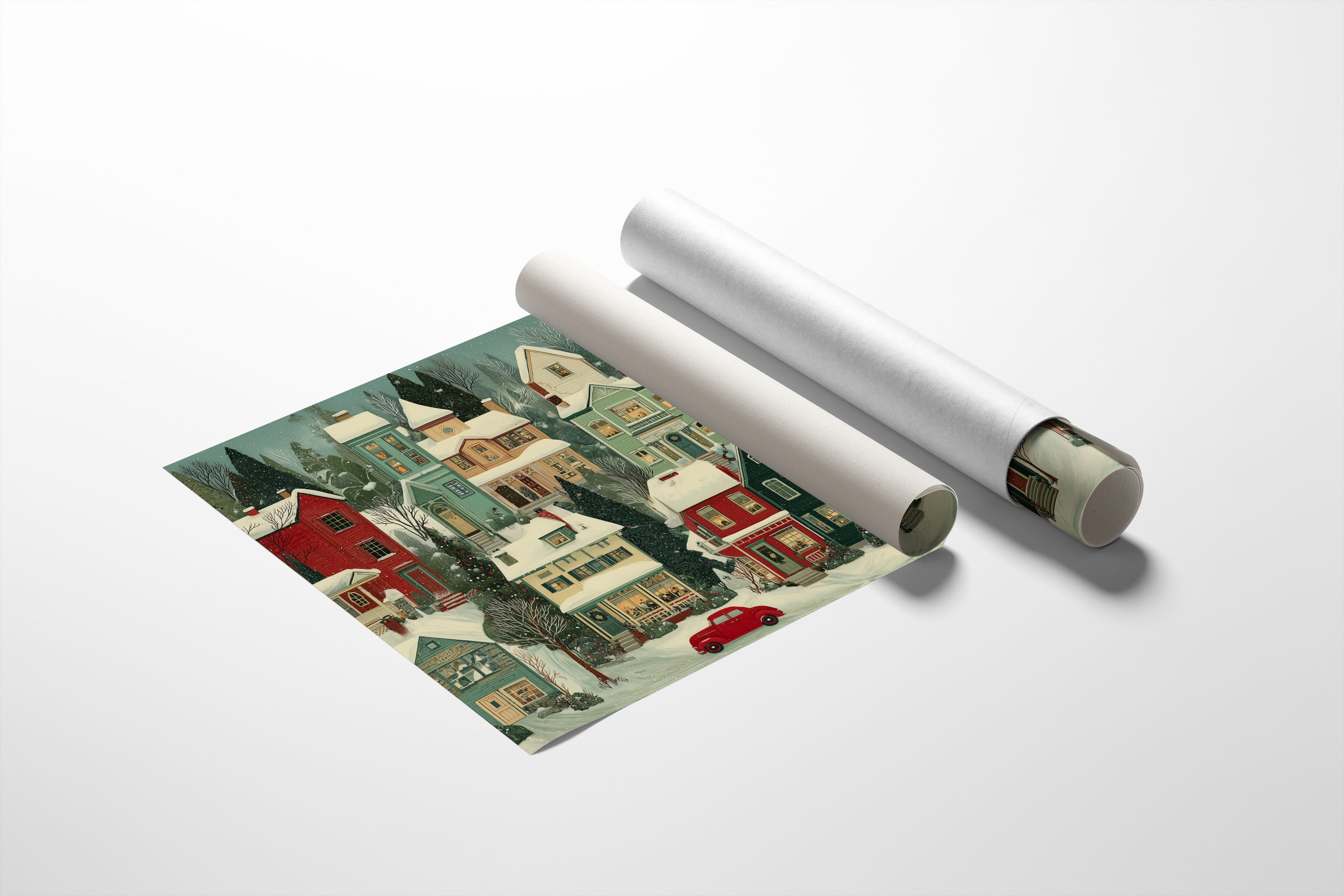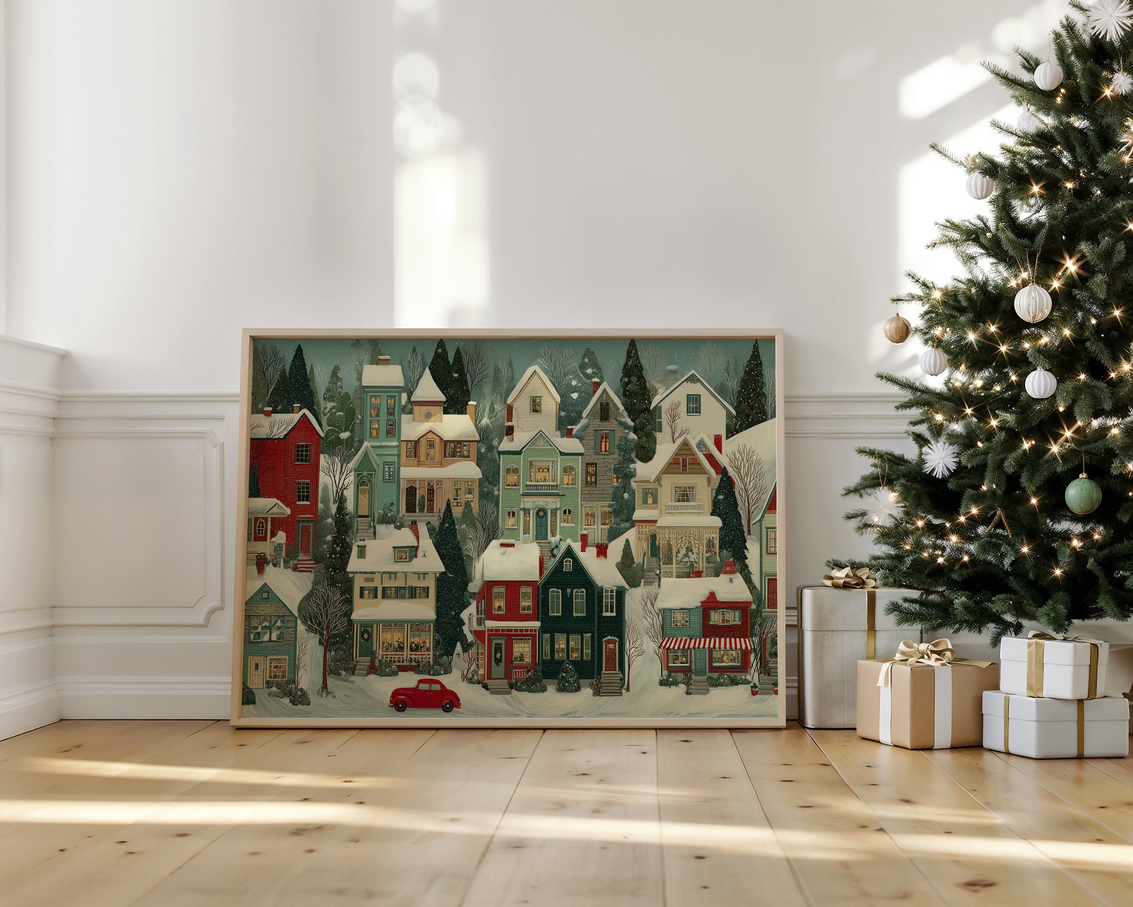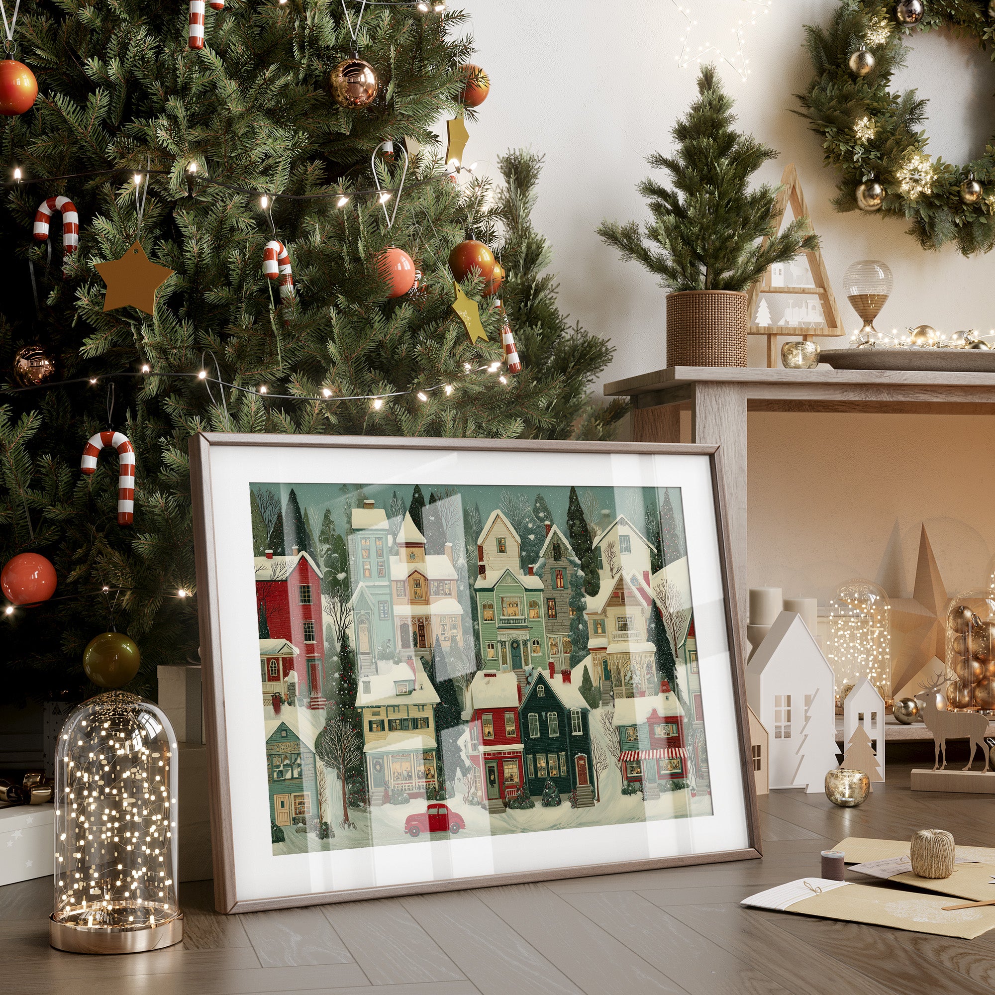 A charming winter village comes alive with the warmth of glowing windows and the gentle dusting of snow. Victorian houses in mint, crimson, and forest green huddle together along winding streets, their architectural details enhanced by holiday decorations and twinkling lights. A small red car adds a pop of nostalgia against the snowy scene, while evergreen trees stand sentinel between the homes like gentle guardians of this peaceful community. This piece brings the cozy essence of a winter evening to any room, perfect for creating a nostalgic focal point in reading nooks or living spaces where stories are shared.
