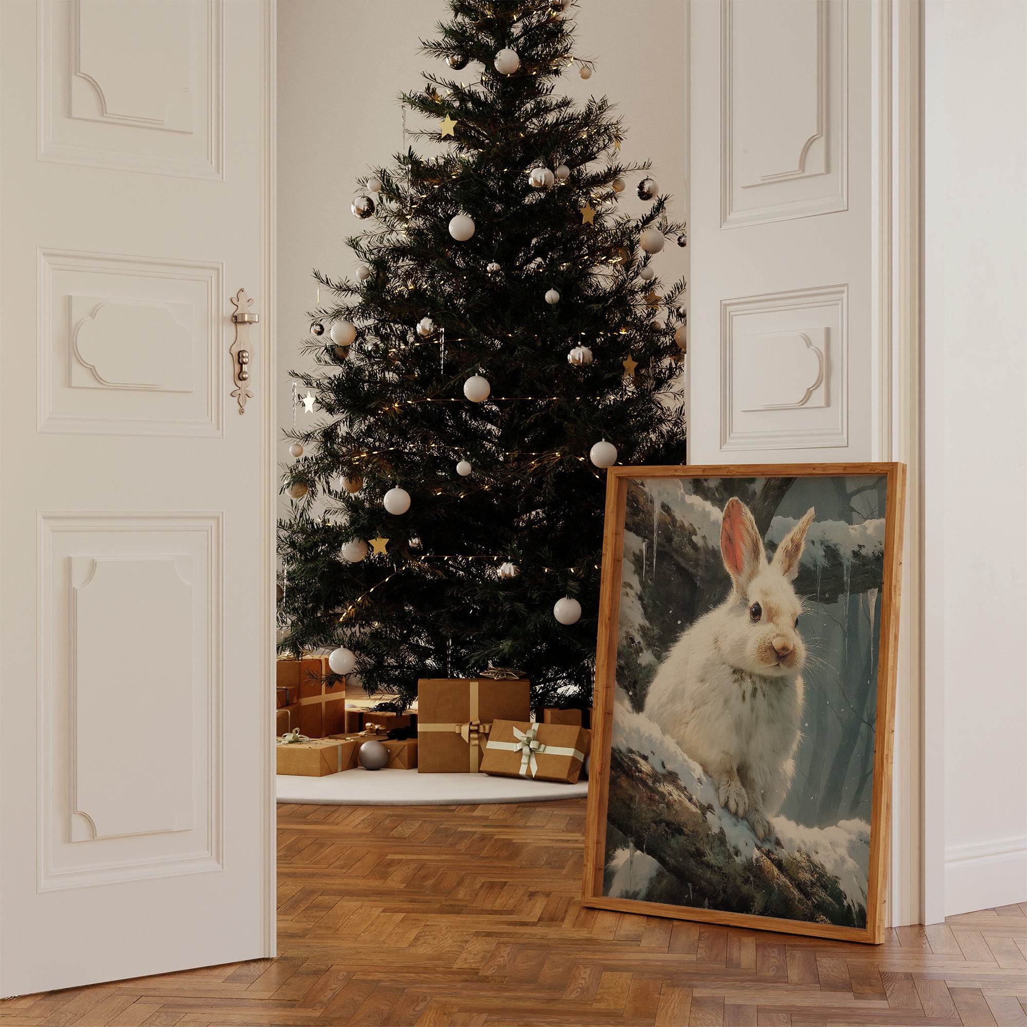 A white rabbit emerges from the winter shadows, its fur glowing like freshly fallen snow against a moody, atmospheric background. The portrait captures an intimate moment as the curious creature peers out, its alert ears and gentle expression drawing us into its enchanted world. Rich blues and whites create a dramatic contrast while delicate brushstrokes capture every detail of its soft fur and bright, attentive eyes. This piece brings a touch of winter wonder to any room, perfect for creating a cozy seasonal atmosphere in living spaces or bedrooms.