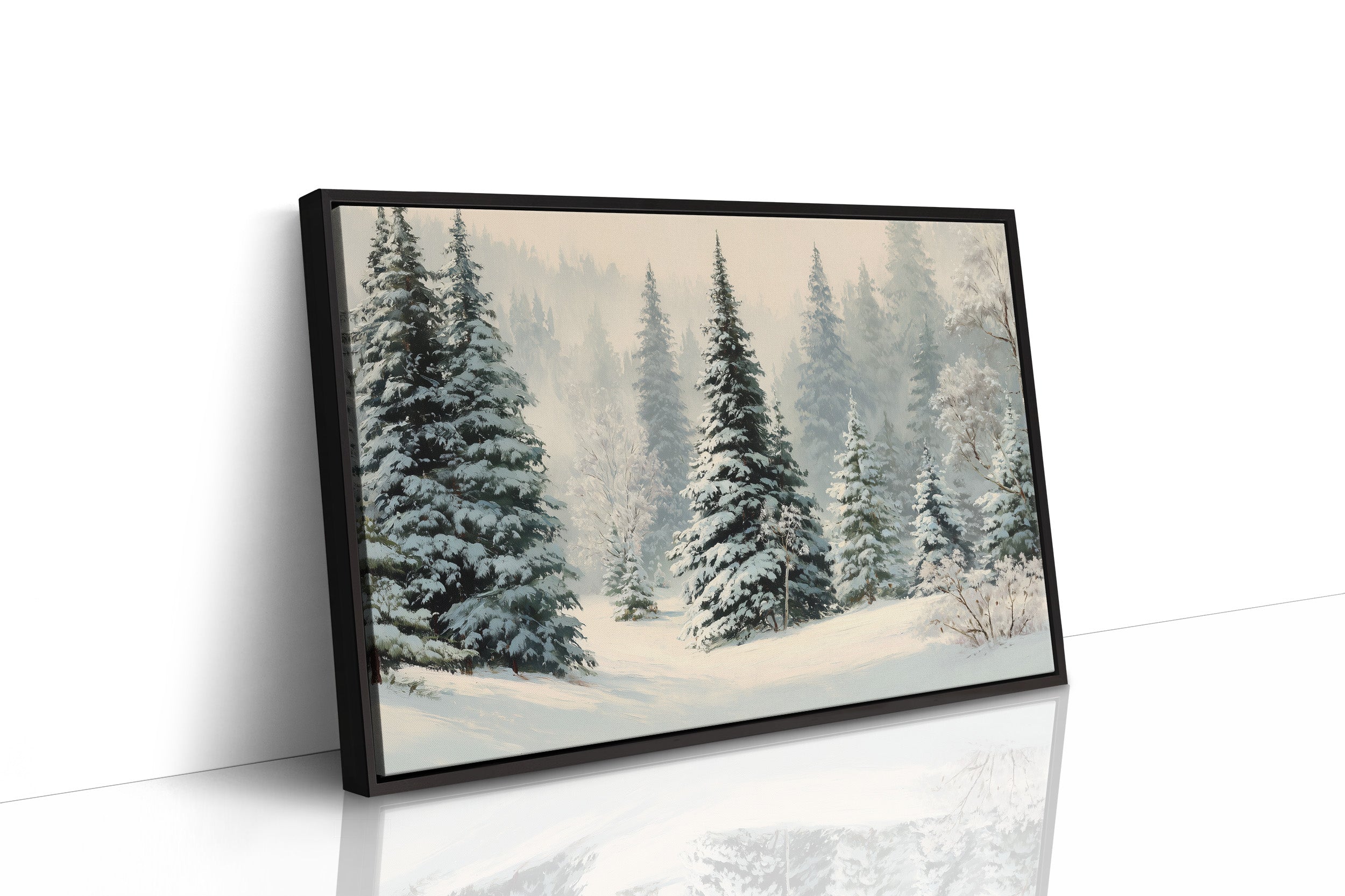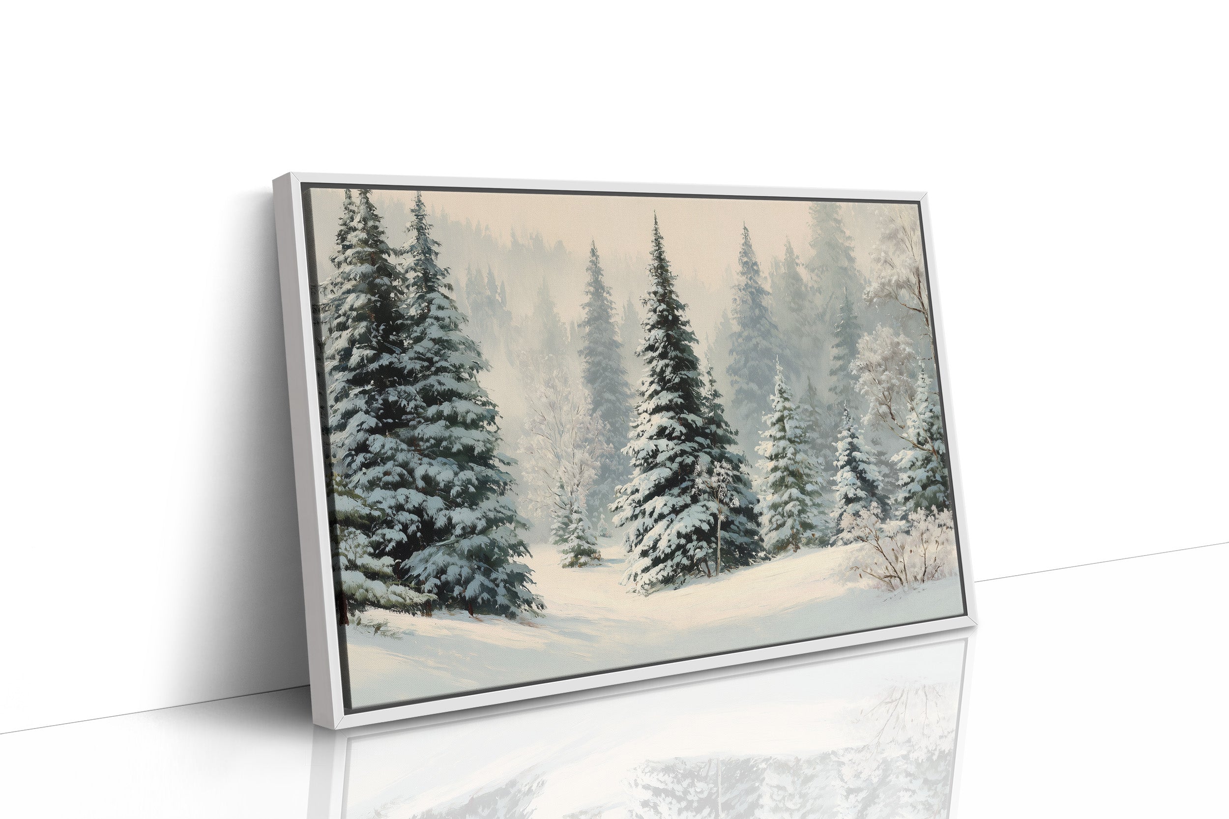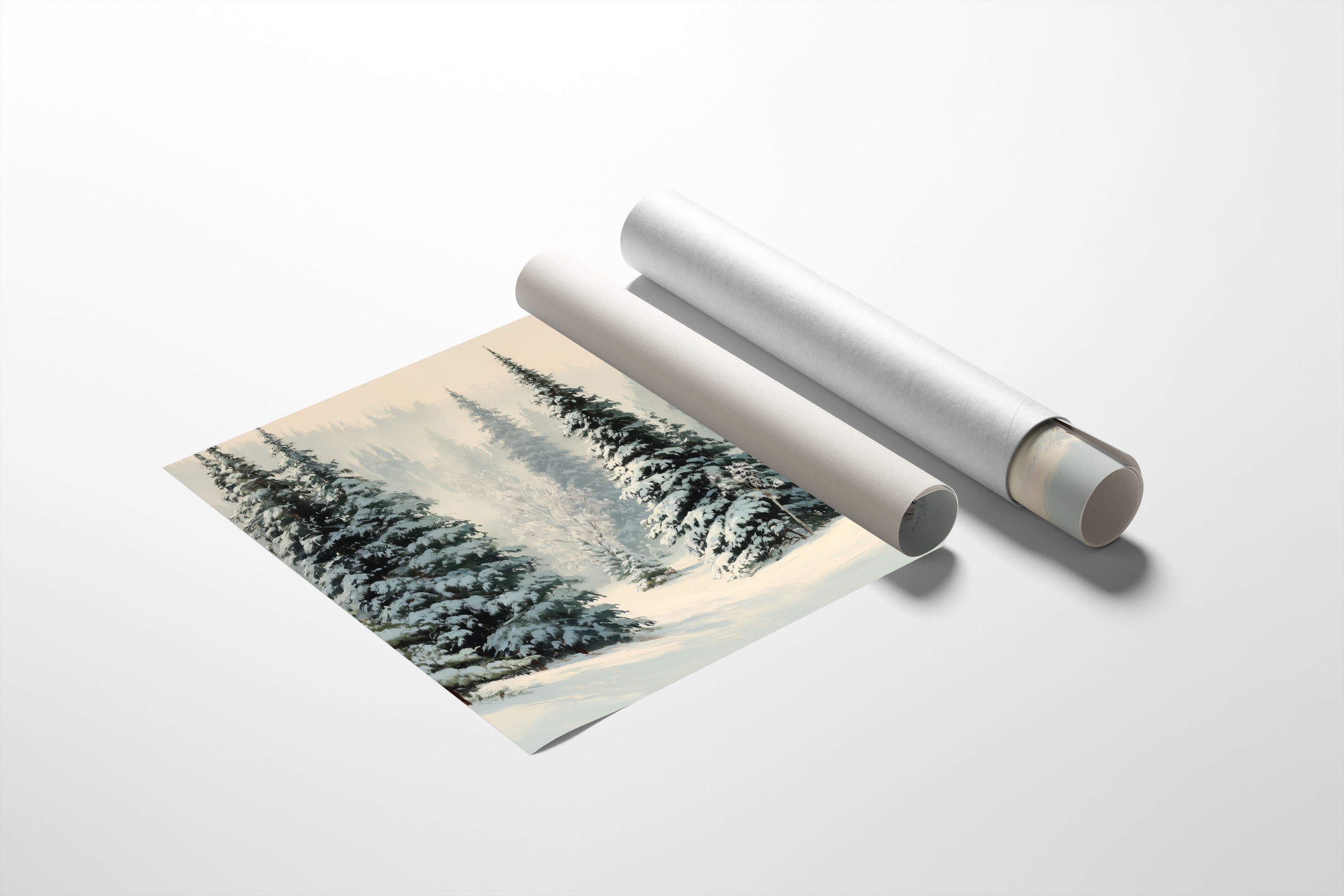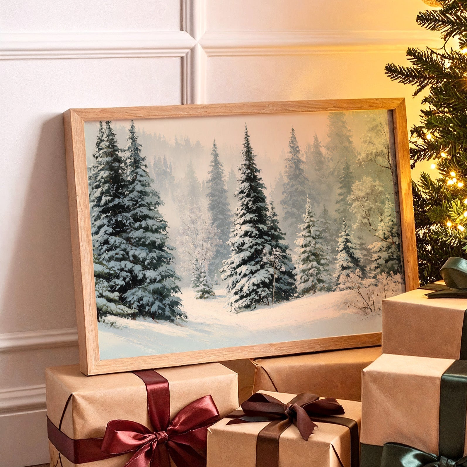 Misty winter morning wraps evergreen sentinels in a gentle blanket of white. Towering spruce trees stand like ancient guardians against a soft gray sky, their snow-laden branches creating a rhythmic dance of light and shadow. The scene captures the pristine stillness of a winter forest, where crystalline snow transforms the landscape into a monochromatic meditation. This piece brings the tranquil essence of winter wilderness into contemporary living spaces, perfect for creating a serene focal point in a modern living room or adding seasonal charm to a cozy reading nook.