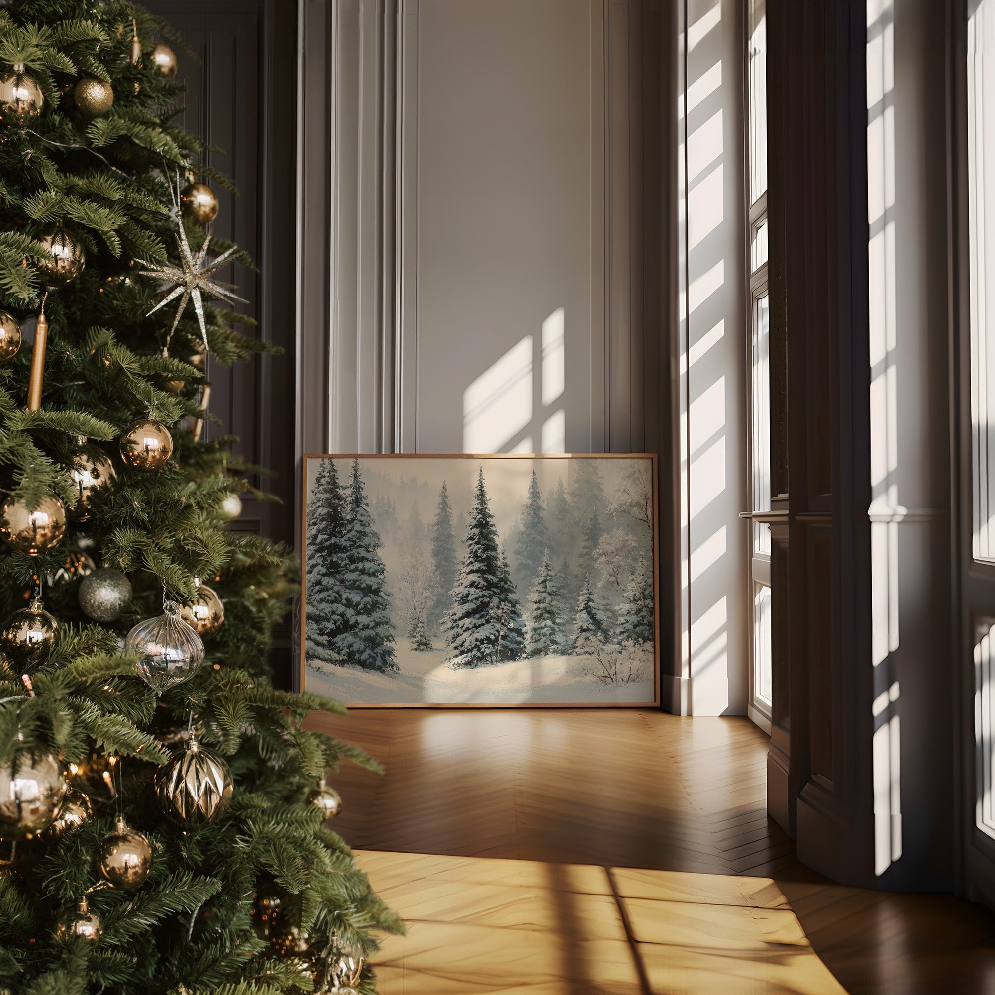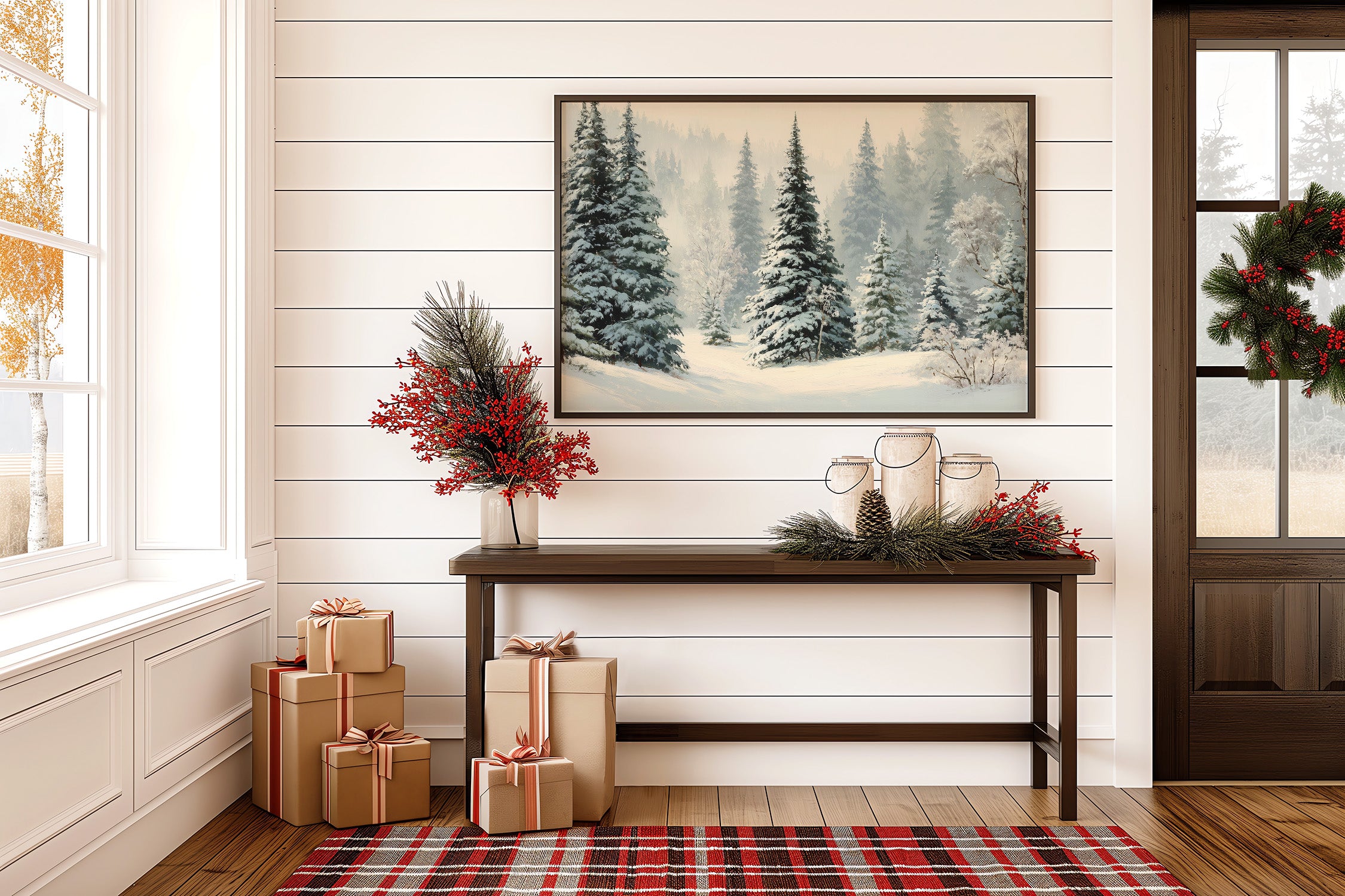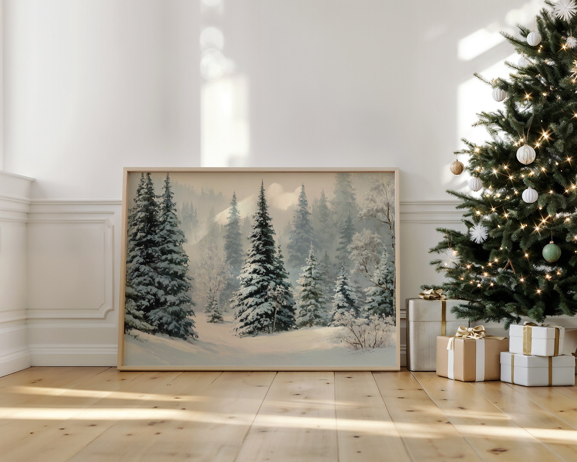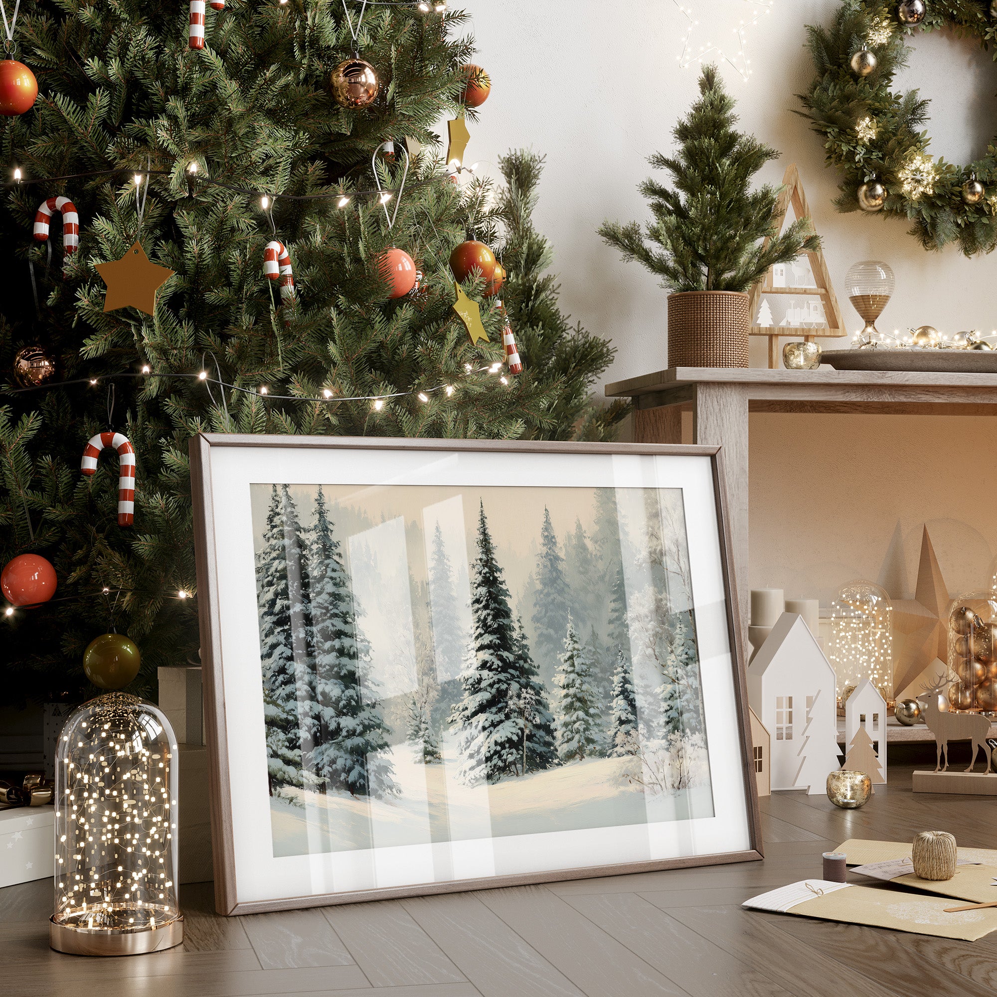 Misty winter morning wraps evergreen sentinels in a gentle blanket of white. Towering spruce trees stand like ancient guardians against a soft gray sky, their snow-laden branches creating a rhythmic dance of light and shadow. The scene captures the pristine stillness of a winter forest, where crystalline snow transforms the landscape into a monochromatic meditation. This piece brings the tranquil essence of winter wilderness into contemporary living spaces, perfect for creating a serene focal point in a modern living room or adding seasonal charm to a cozy reading nook.