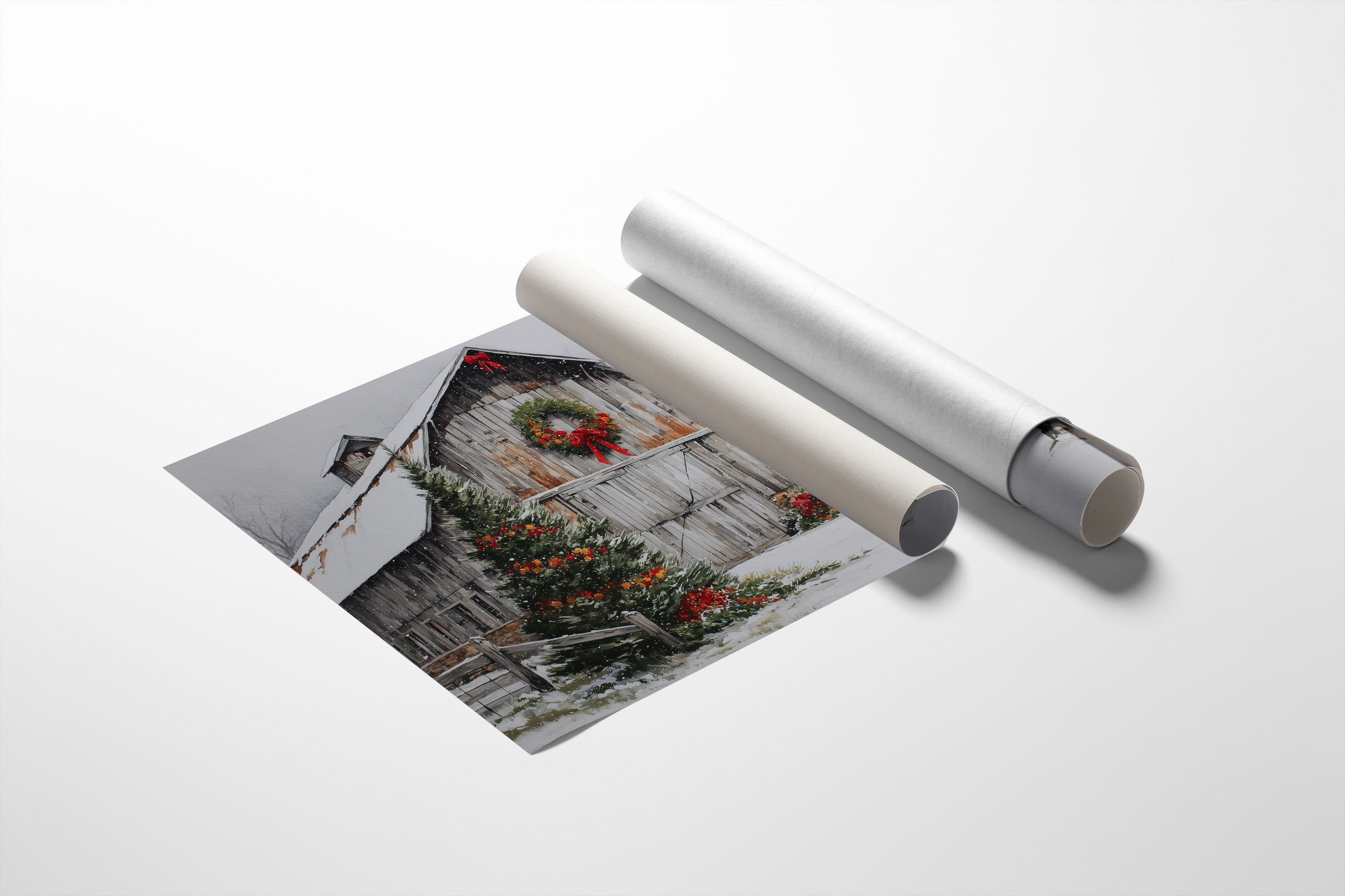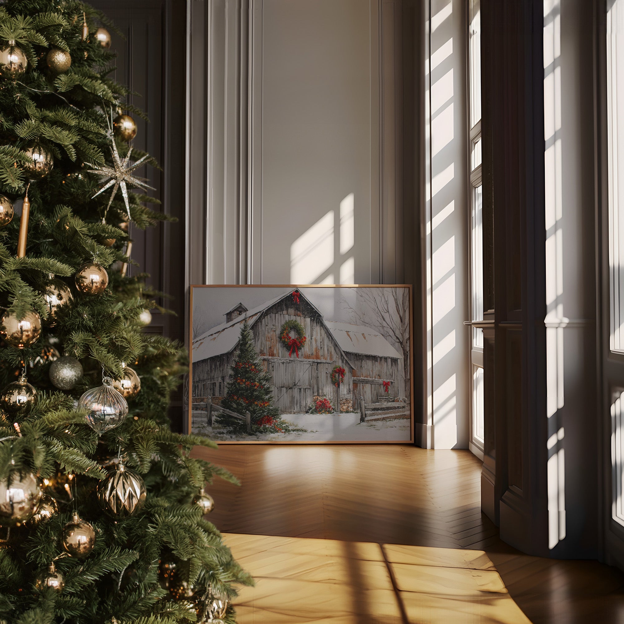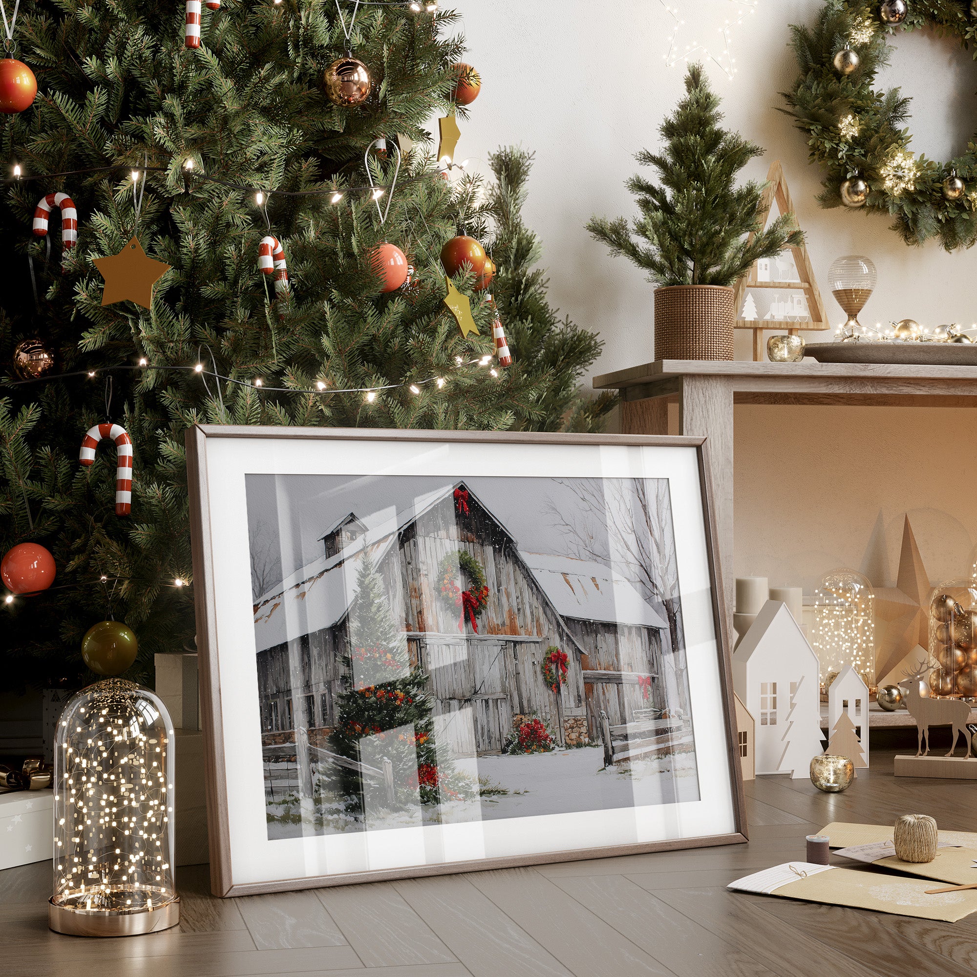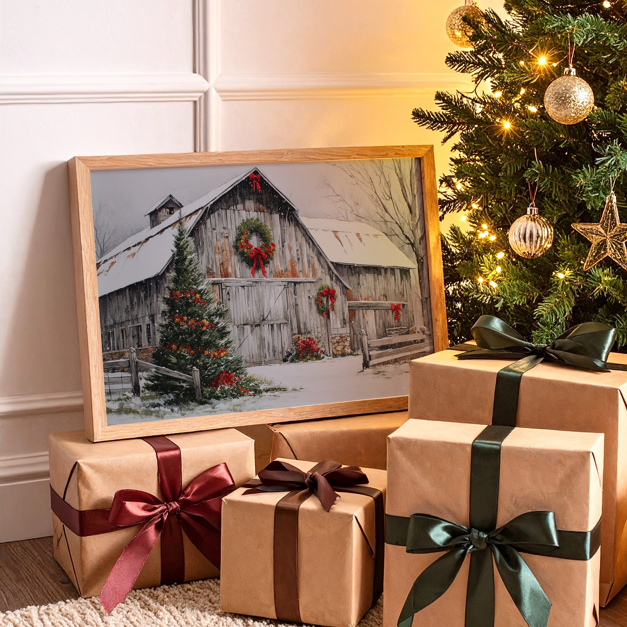 Winter wraps its gentle embrace around an aged barn, where festive wreaths and crimson bows bring warmth to weathered wood. The scene captures a perfect balance between rustic charm and holiday spirit, with snow-dusted evergreens standing sentinel beside the time-worn structure. Rich red accents dance against the barn's silvery patina, while delicate snowflakes dust the peaceful countryside. This nostalgic piece would bring seasonal charm to a family room or create an inviting focal point in a cozy reading nook.