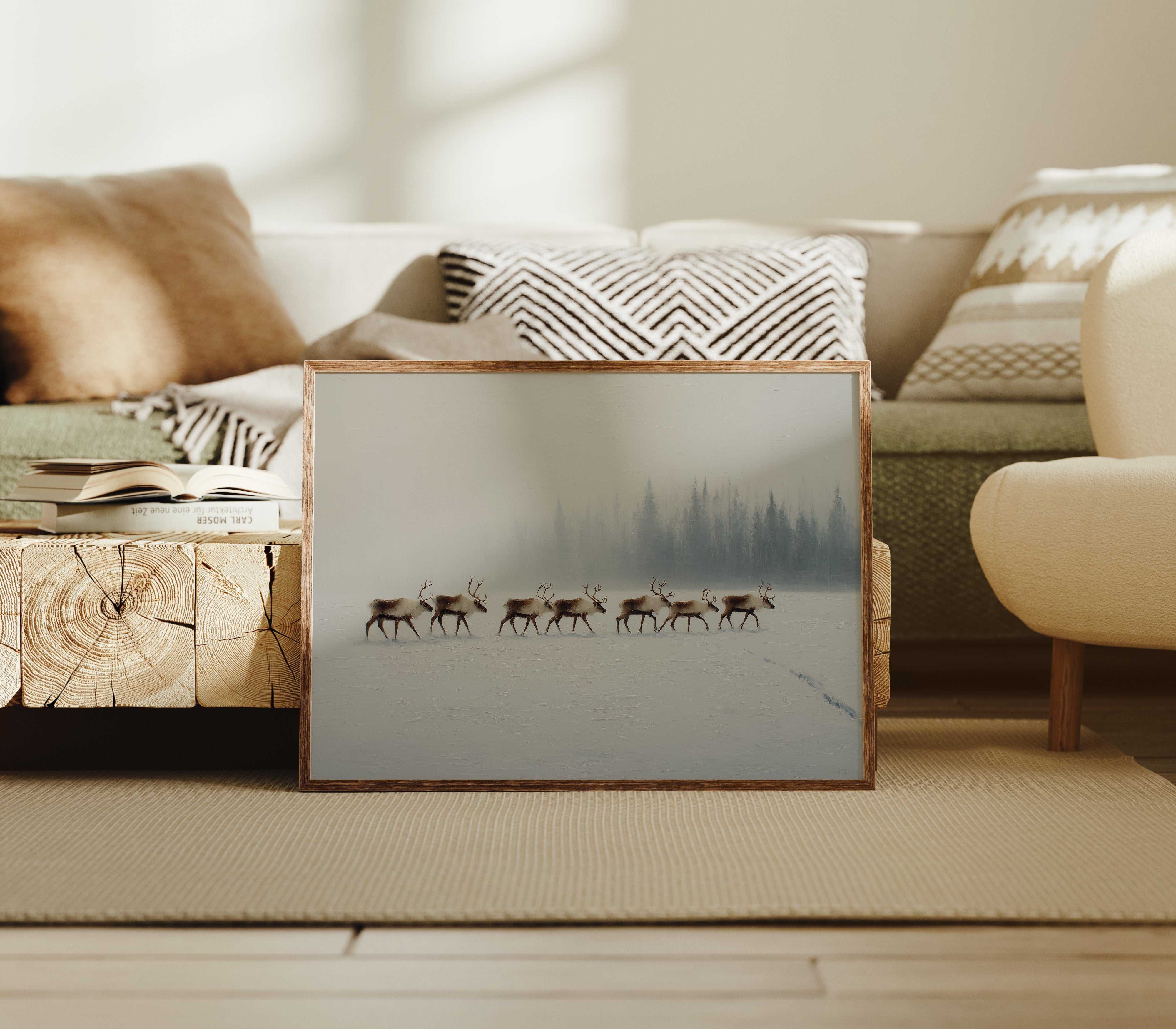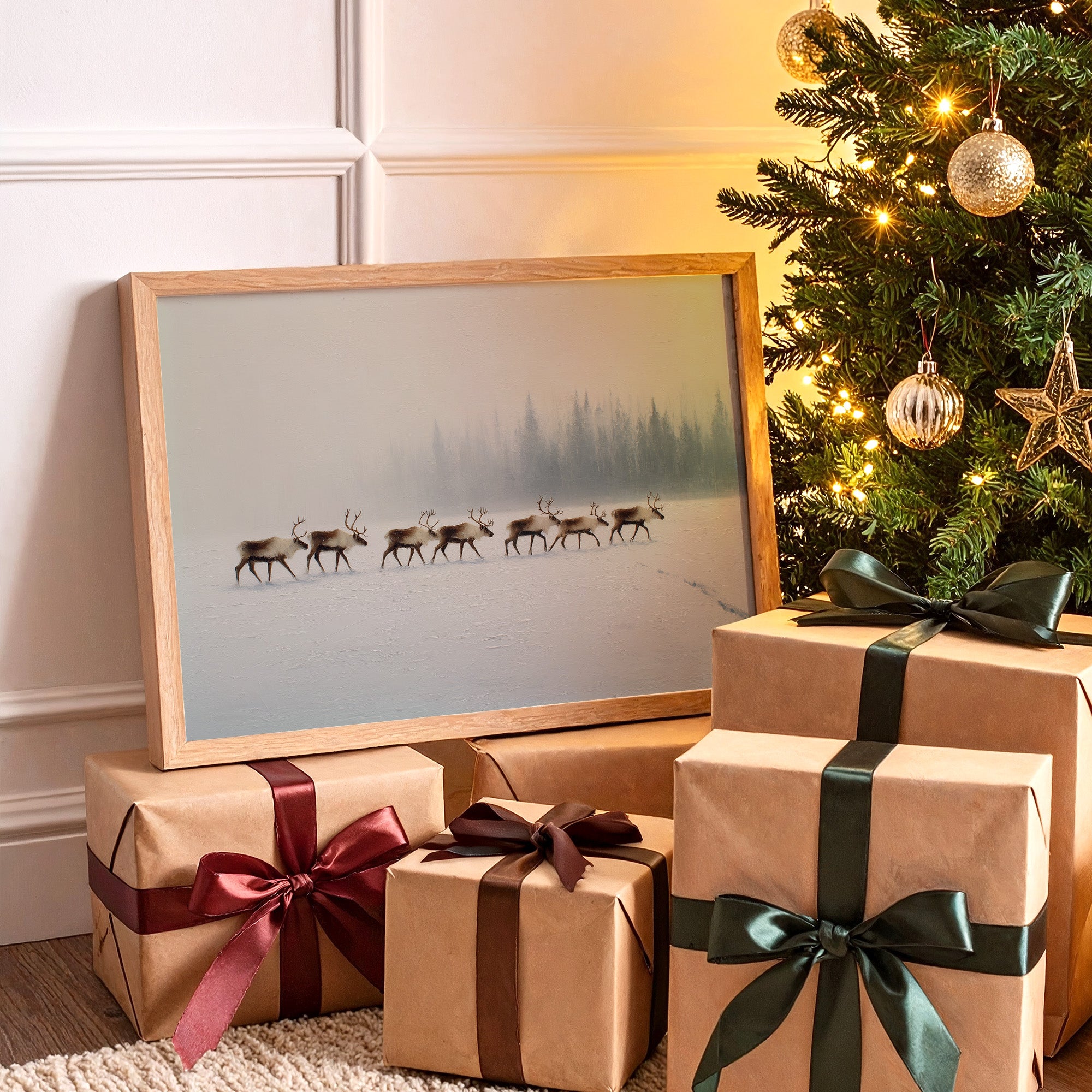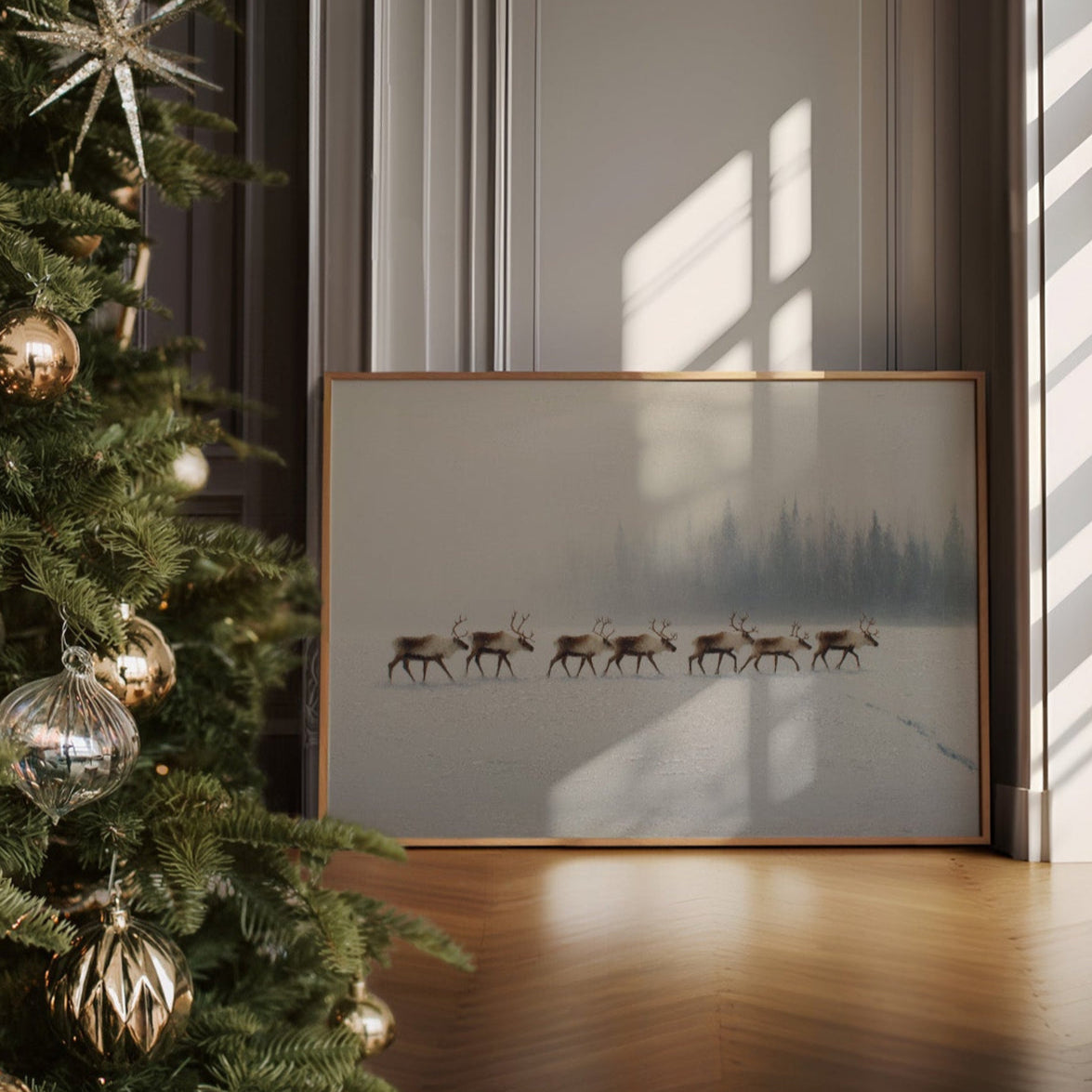 A line of reindeer moves silently through a snow-covered landscape, their forms creating a graceful procession against the winter white. Misty evergreens stand sentinel in the background, their dark silhouettes fading into a pearly gray sky that holds the promise of more snow. The scene captures a moment of natural choreography, where wild creatures navigate their seasonal journey with instinctive purpose. This tranquil winter narrative is perfectly framed in a modern setting, where Christmas decorations and wrapped presents create a harmonious seasonal dialogue with the artwork. Perfect for bringing a sense of northern wilderness and winter wonder to a contemporary living room or sophisticated holiday space.