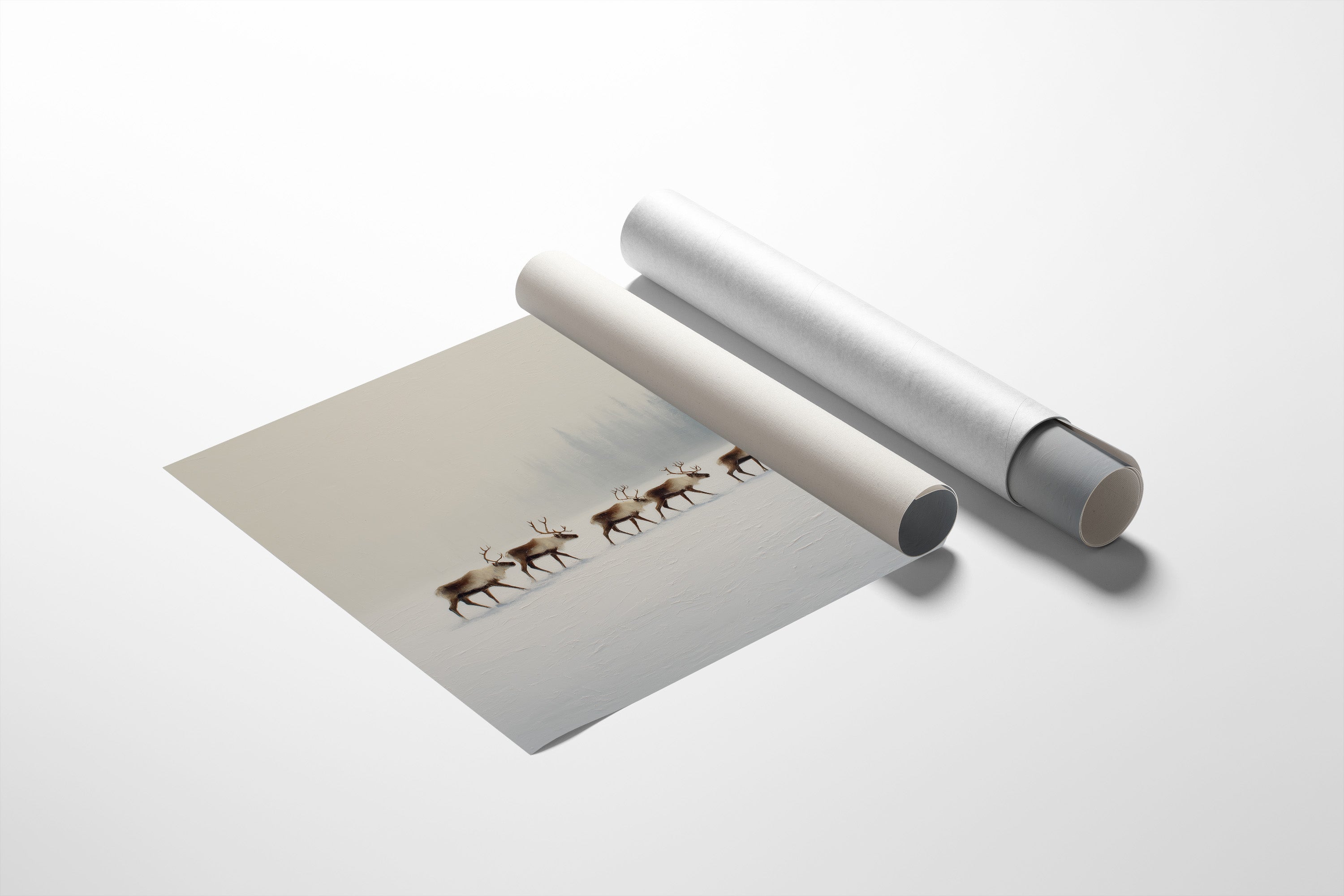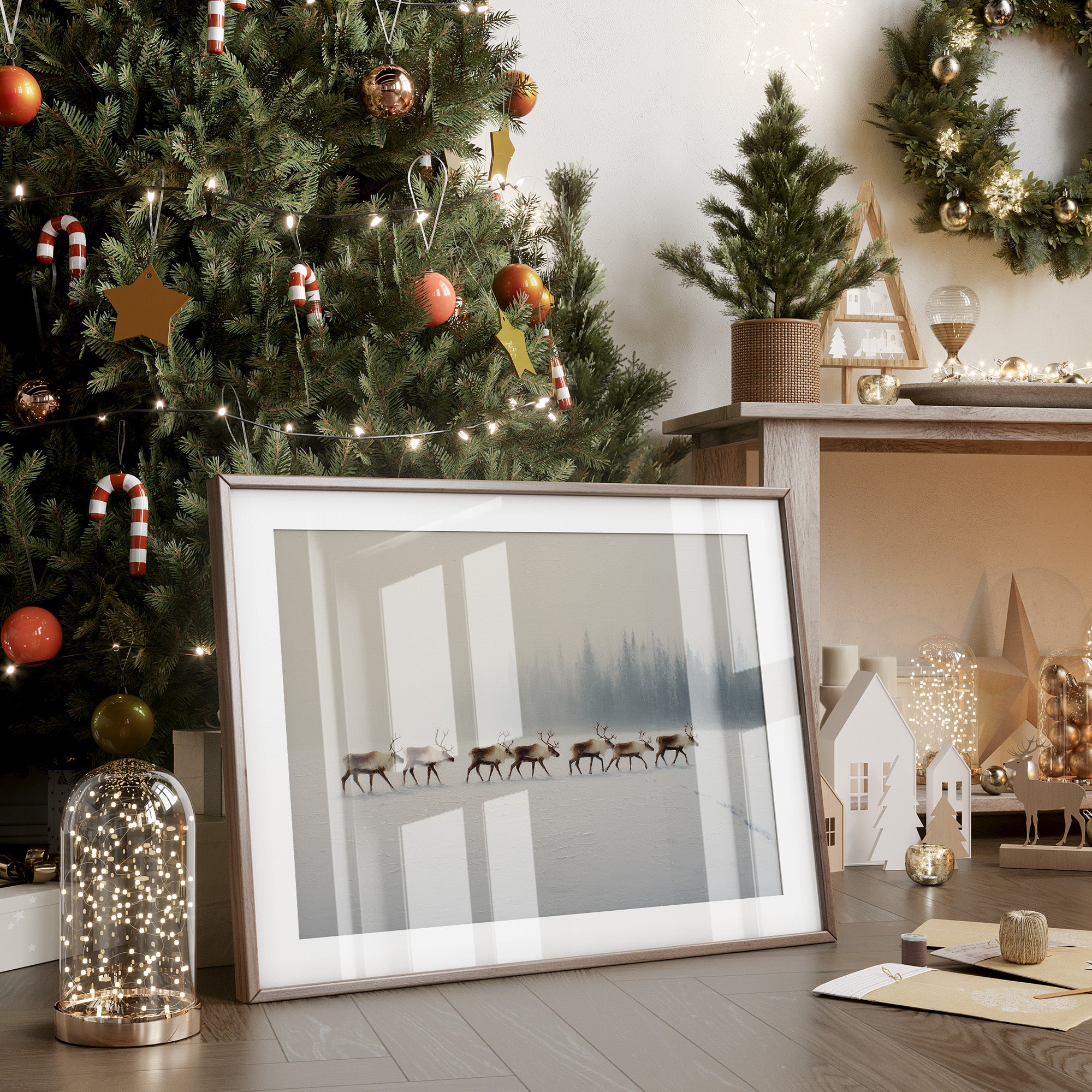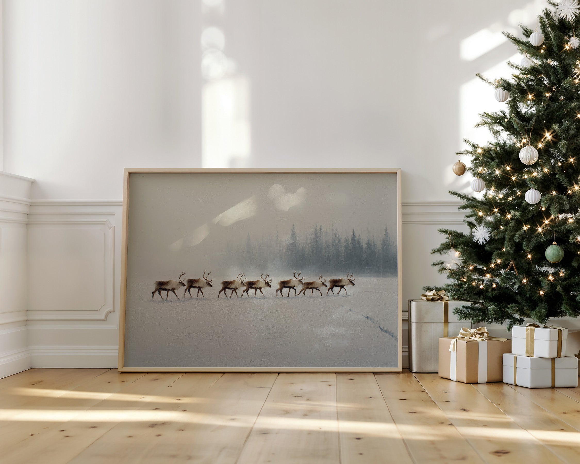 A line of reindeer moves silently through a snow-covered landscape, their forms creating a graceful procession against the winter white. Misty evergreens stand sentinel in the background, their dark silhouettes fading into a pearly gray sky that holds the promise of more snow. The scene captures a moment of natural choreography, where wild creatures navigate their seasonal journey with instinctive purpose. This tranquil winter narrative is perfectly framed in a modern setting, where Christmas decorations and wrapped presents create a harmonious seasonal dialogue with the artwork. Perfect for bringing a sense of northern wilderness and winter wonder to a contemporary living room or sophisticated holiday space.