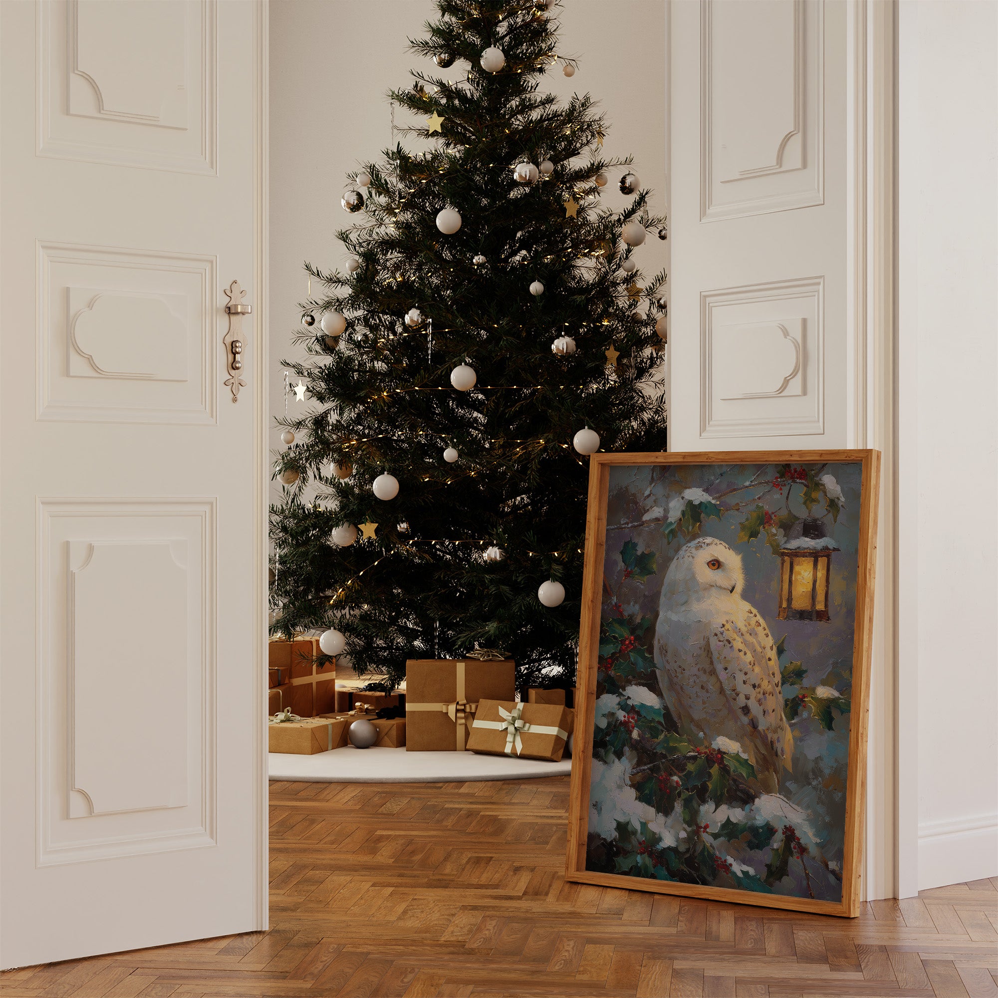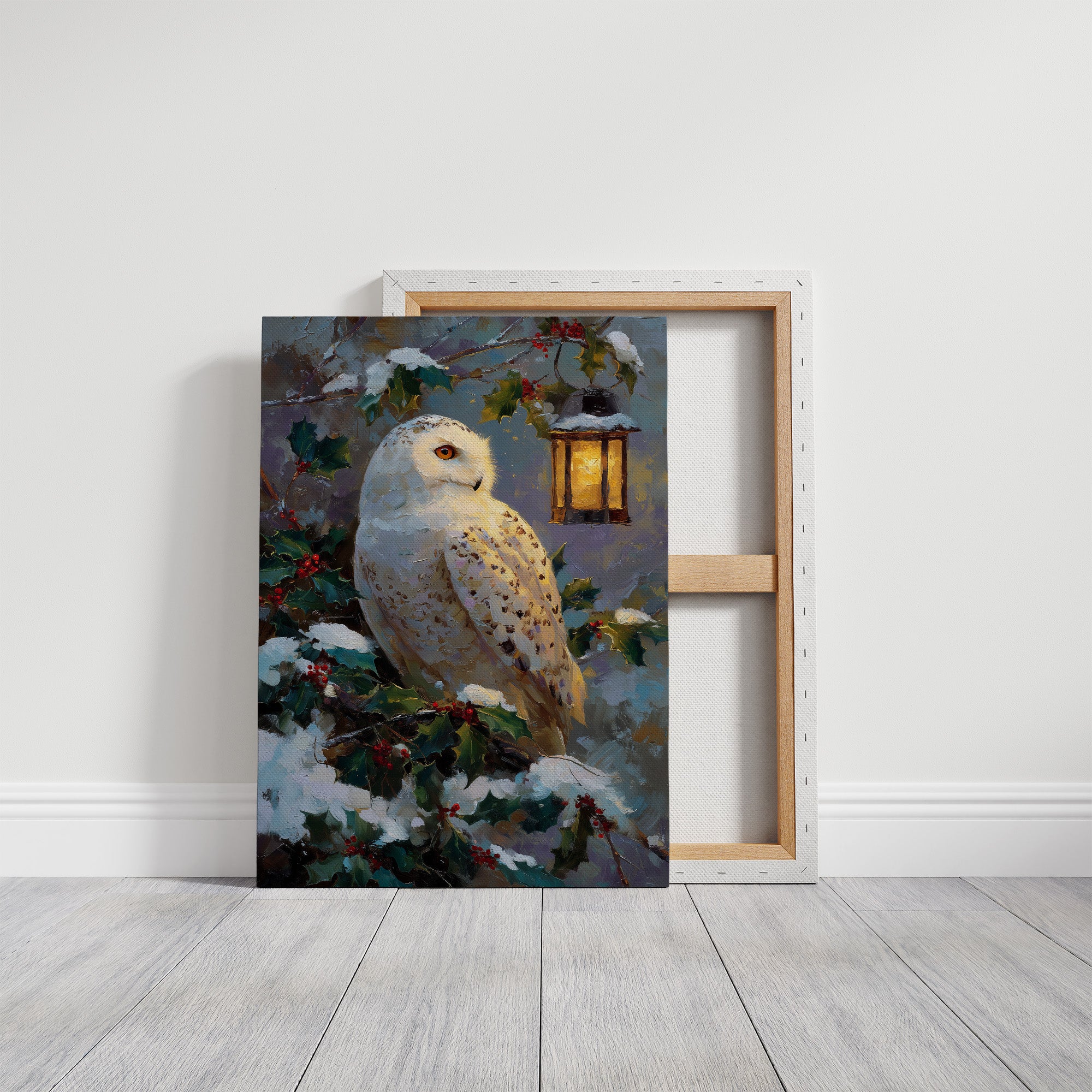 A silent white owl rests among snow-dusted holly branches, its amber eye reflecting the warm flicker of a nearby lantern. Thick, painterly brushstrokes bring texture and depth to the cool winter blues and rich evergreen tones, creating a scene that feels both peaceful and quietly magical. Part of our Winter Wildlife collection, this piece blends festive charm with serene nature art. A cozy statement for living rooms, holiday spaces, or rustic cabins that embrace the stillness of the season.