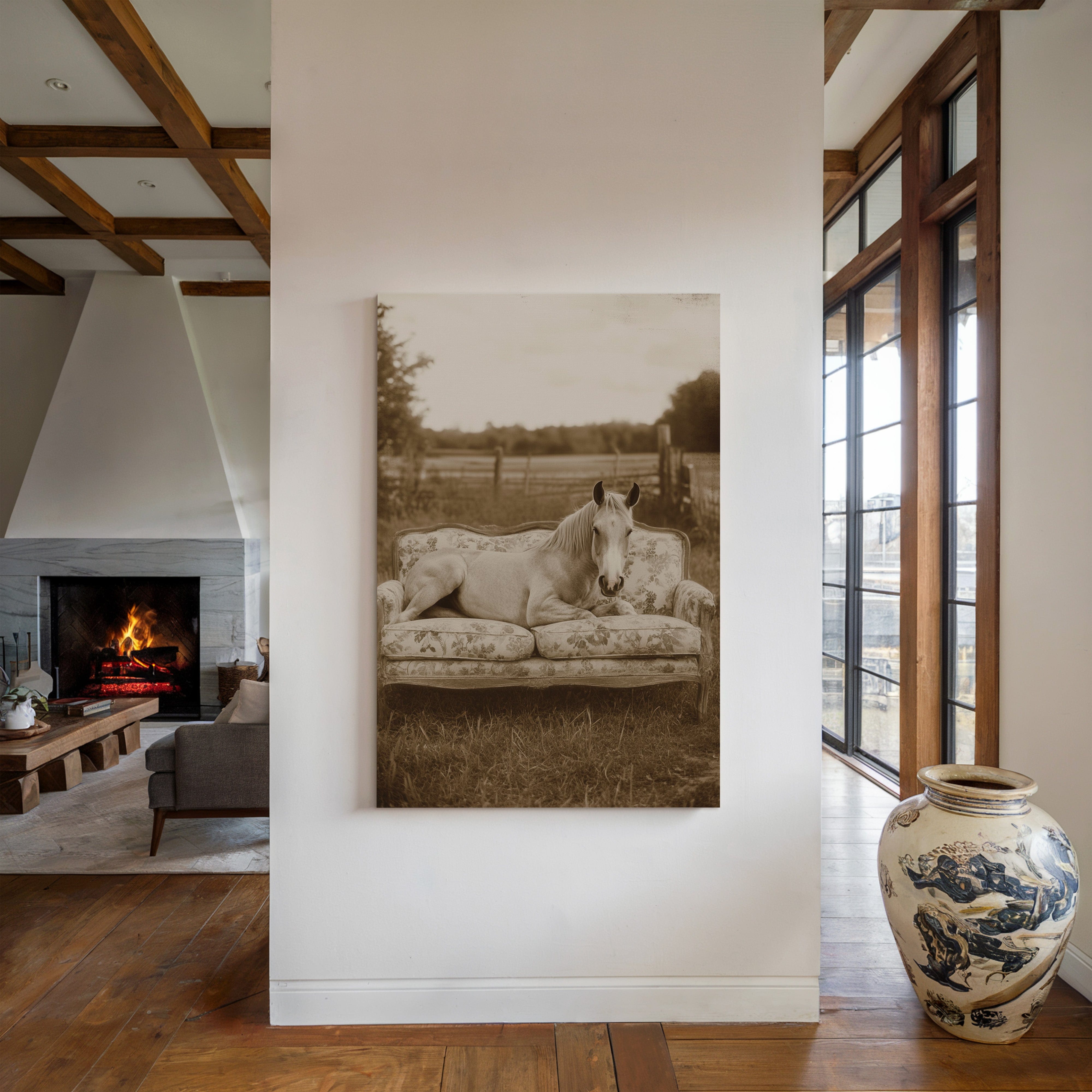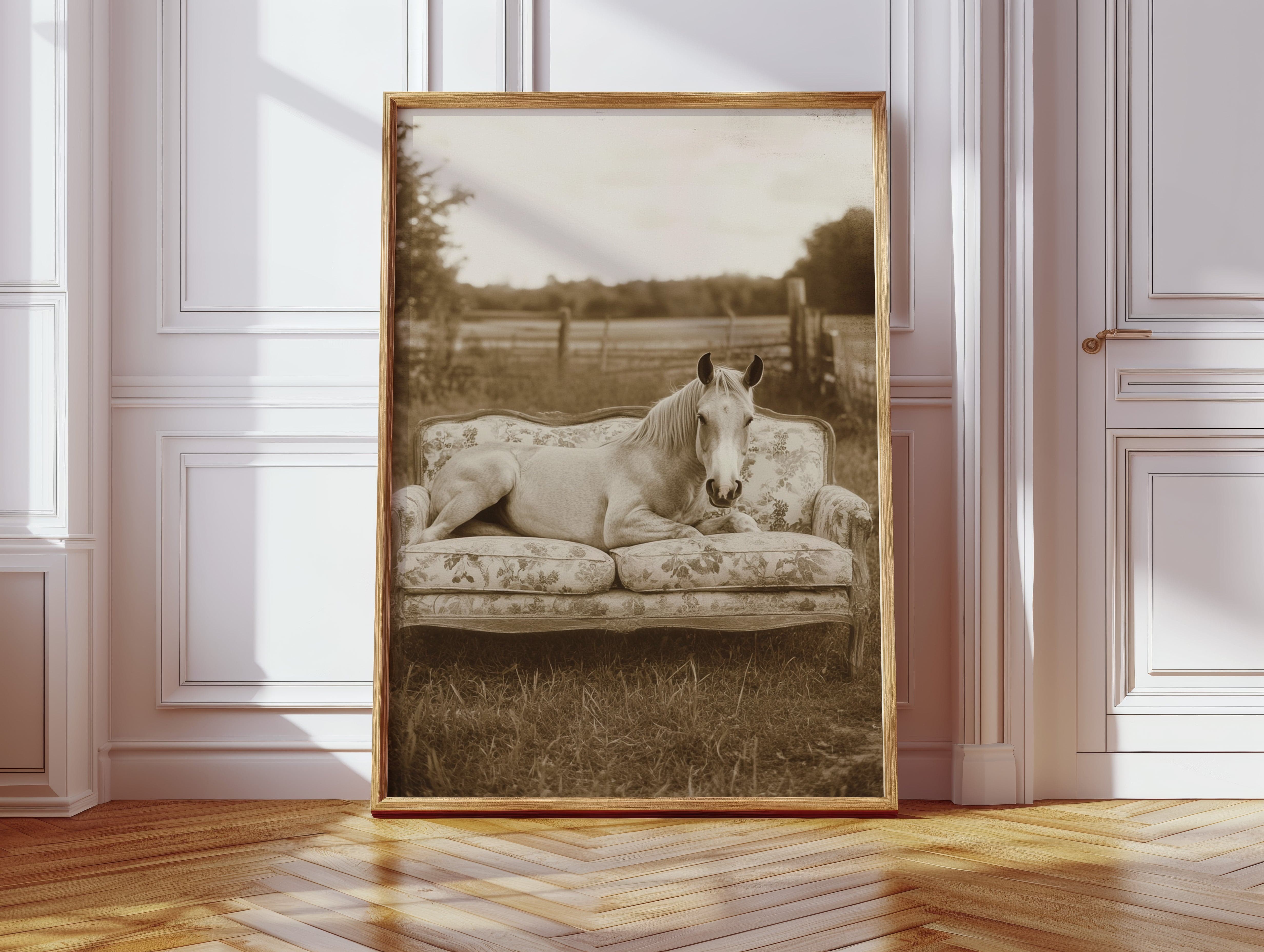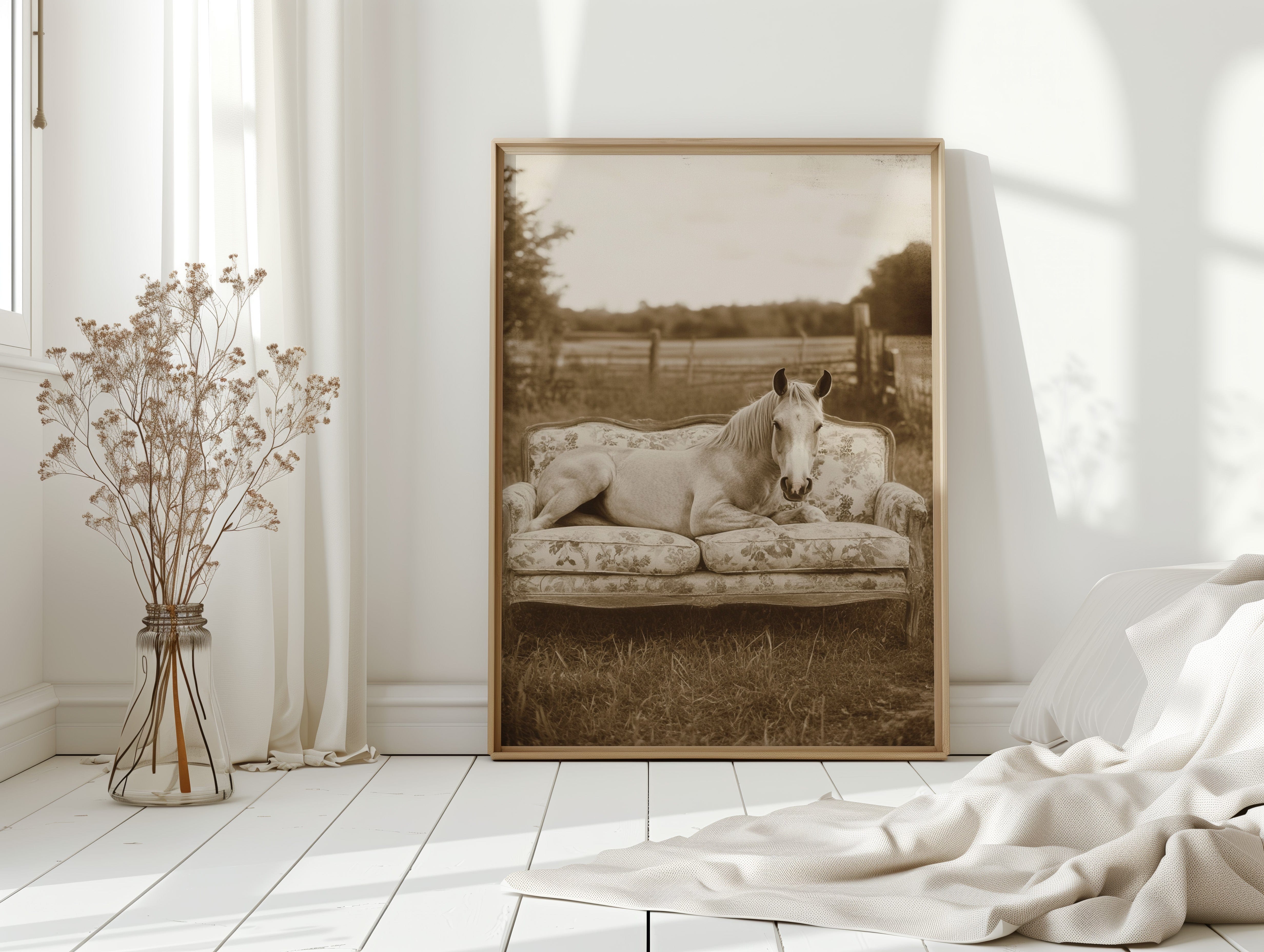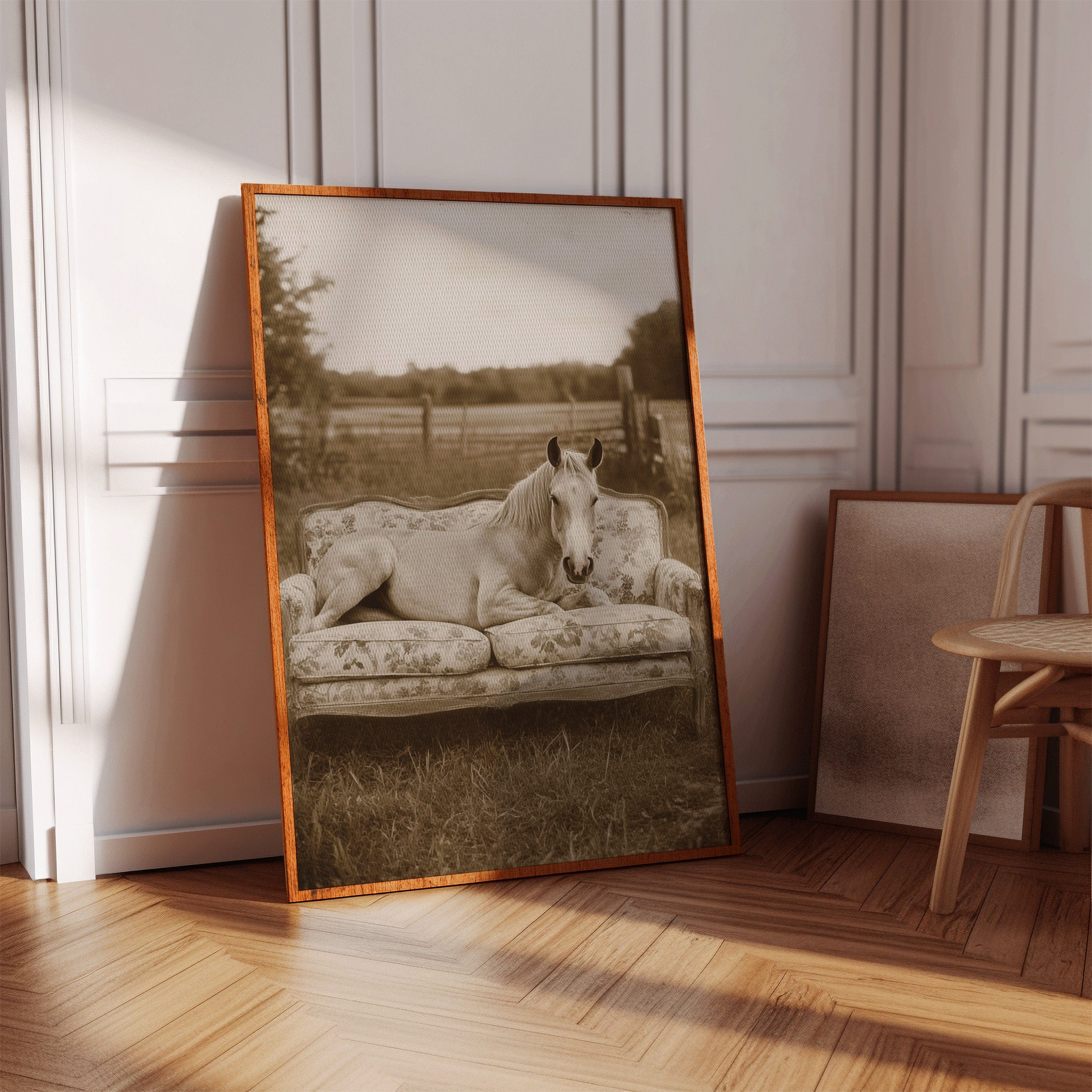Unbridled charm meets unexpected whimsy in this unforgettable sepia-toned print. A majestic horse reclines with serene confidence on a vintage floral sofa in the middle of a field — blending rustic elegance with surreal humor. This artwork is perfect for lovers of horses, quirky farmhouse style, or anyone with a taste for the extraordinary. Whether in a living room, stable office, or gallery wall, this piece never fails to spark conversation and admiration.