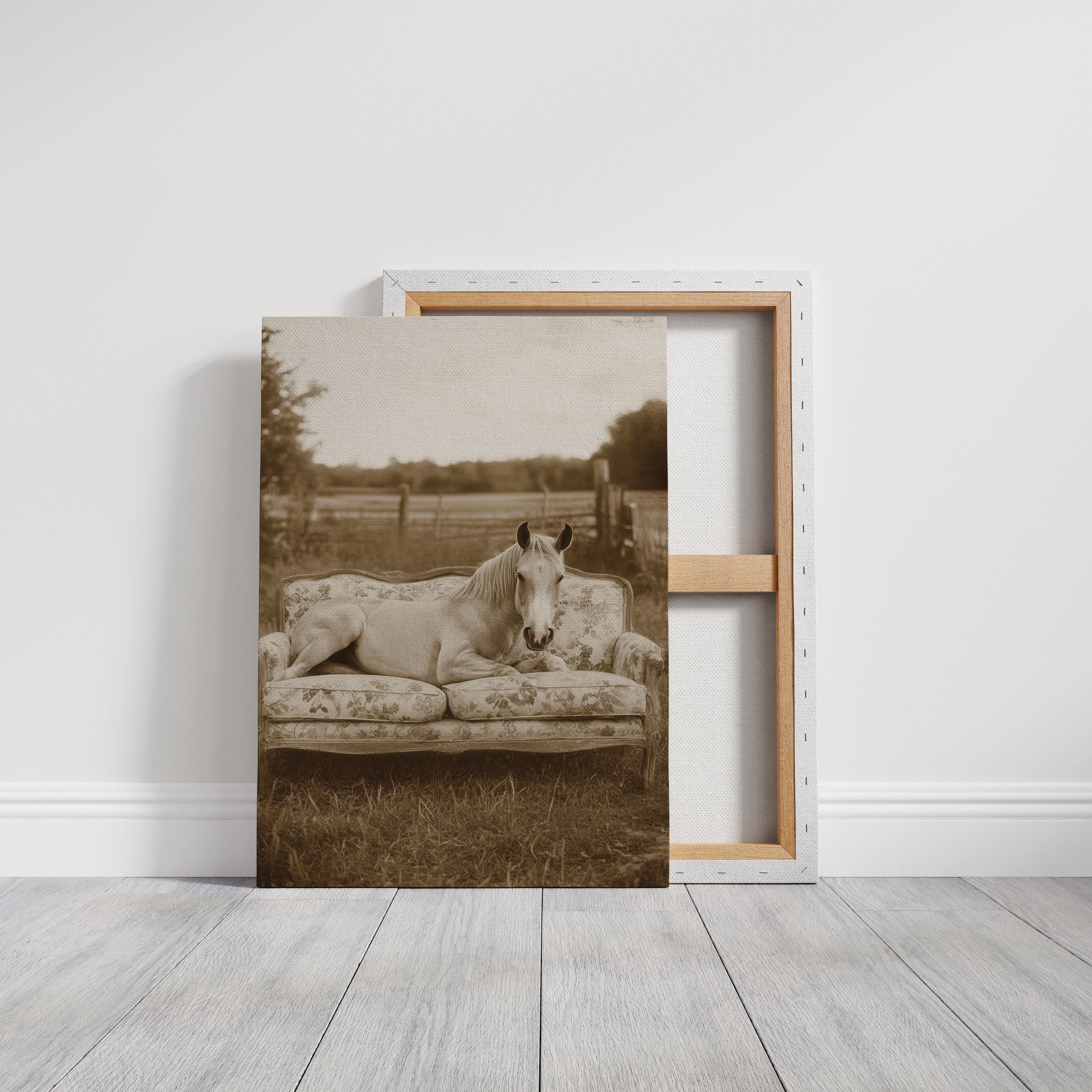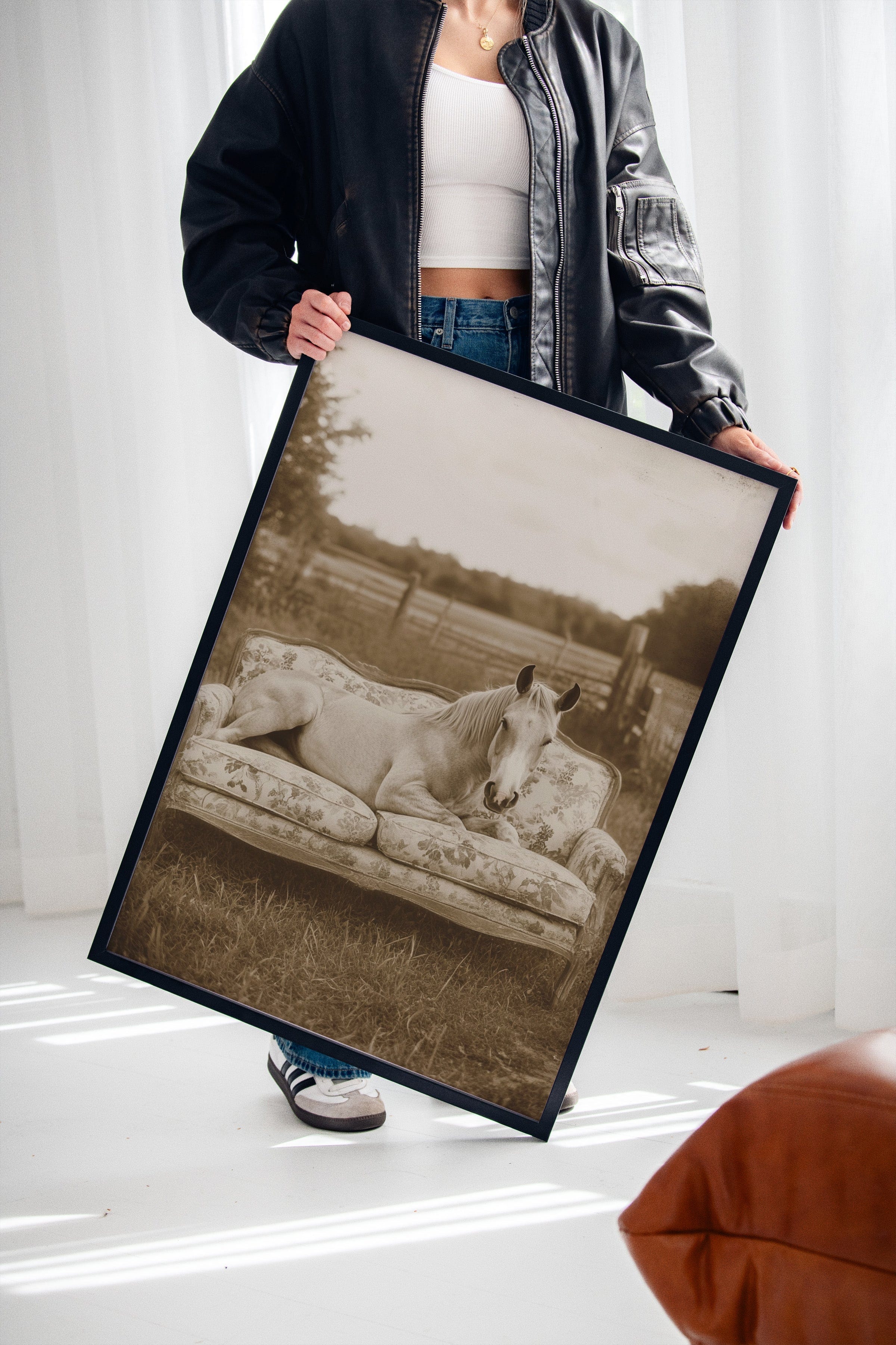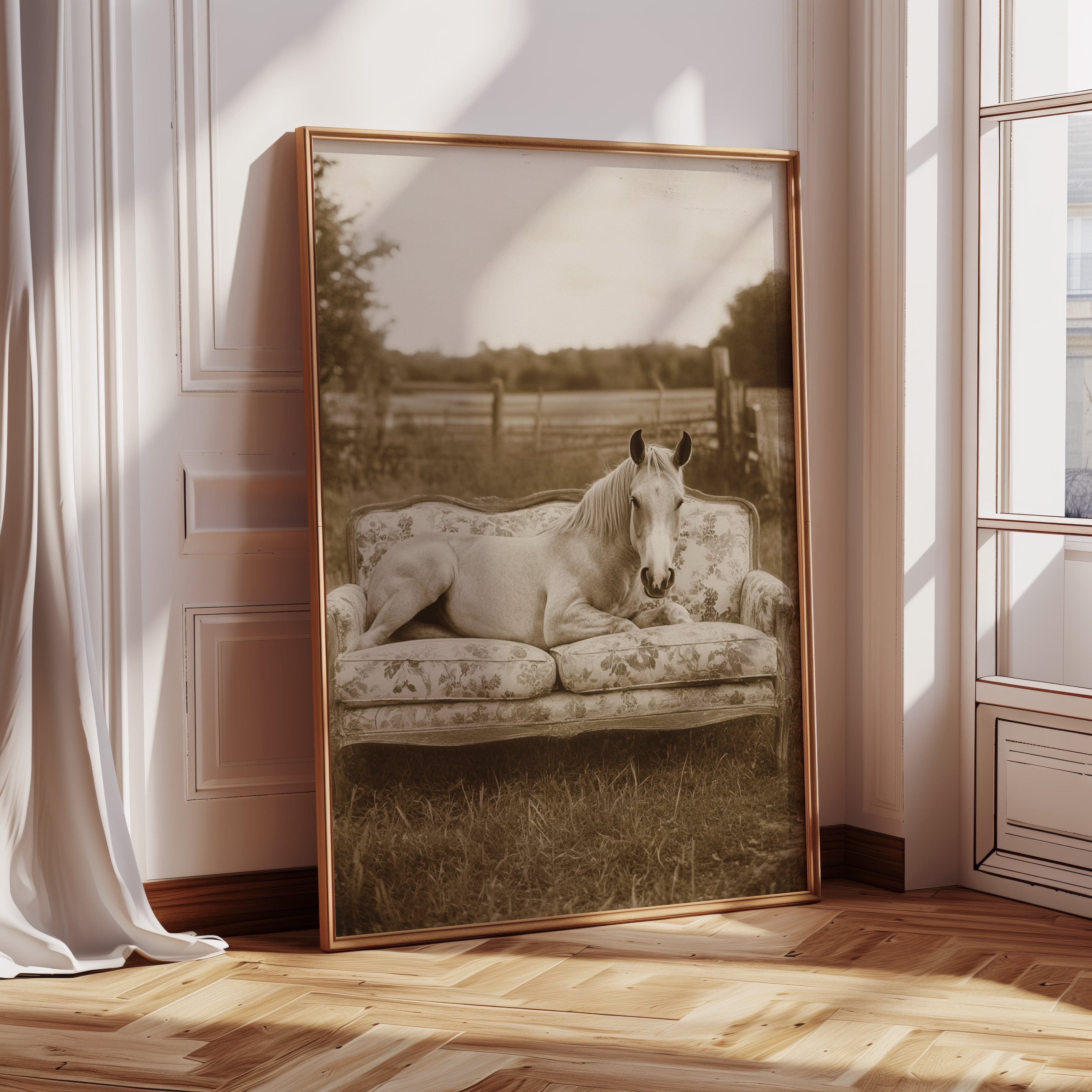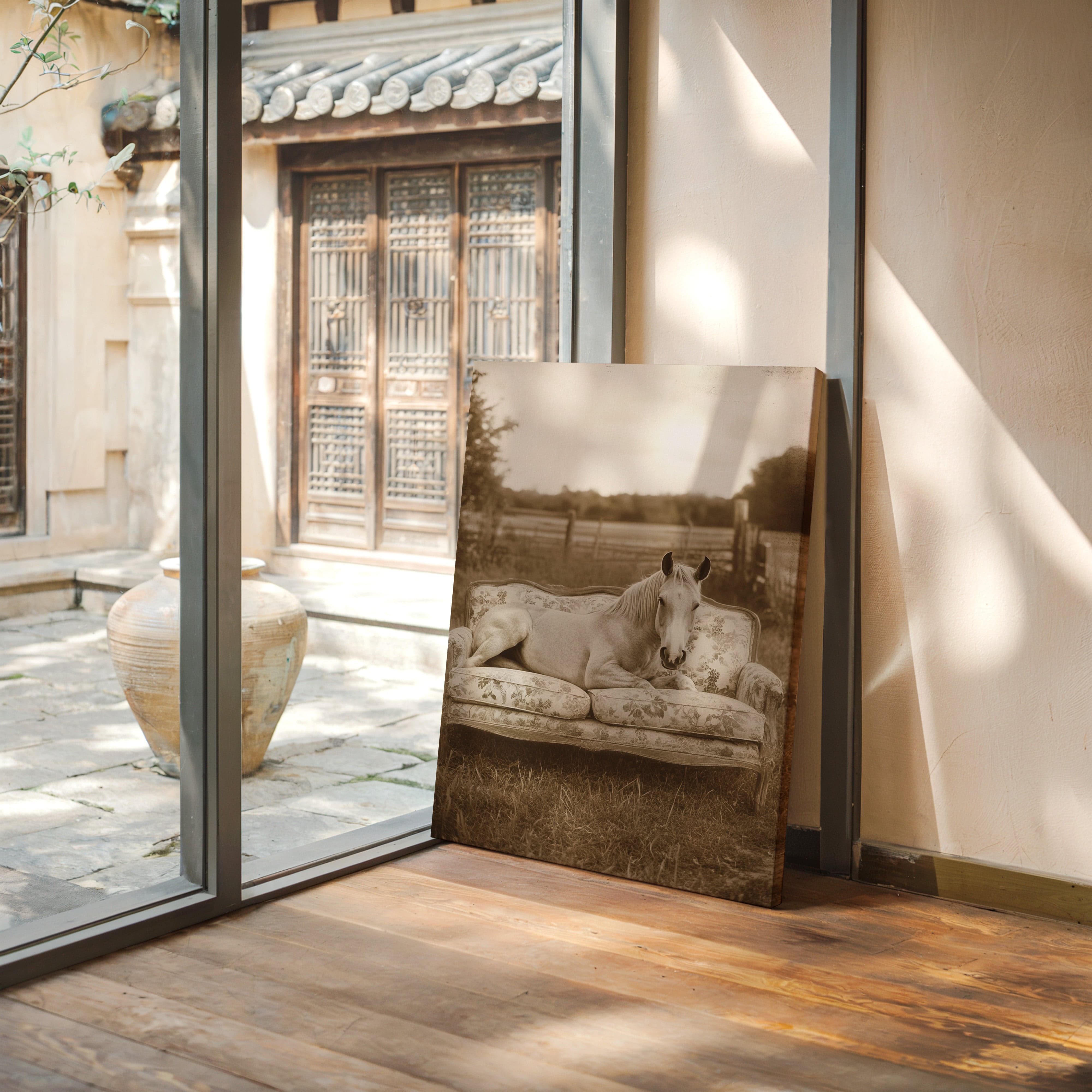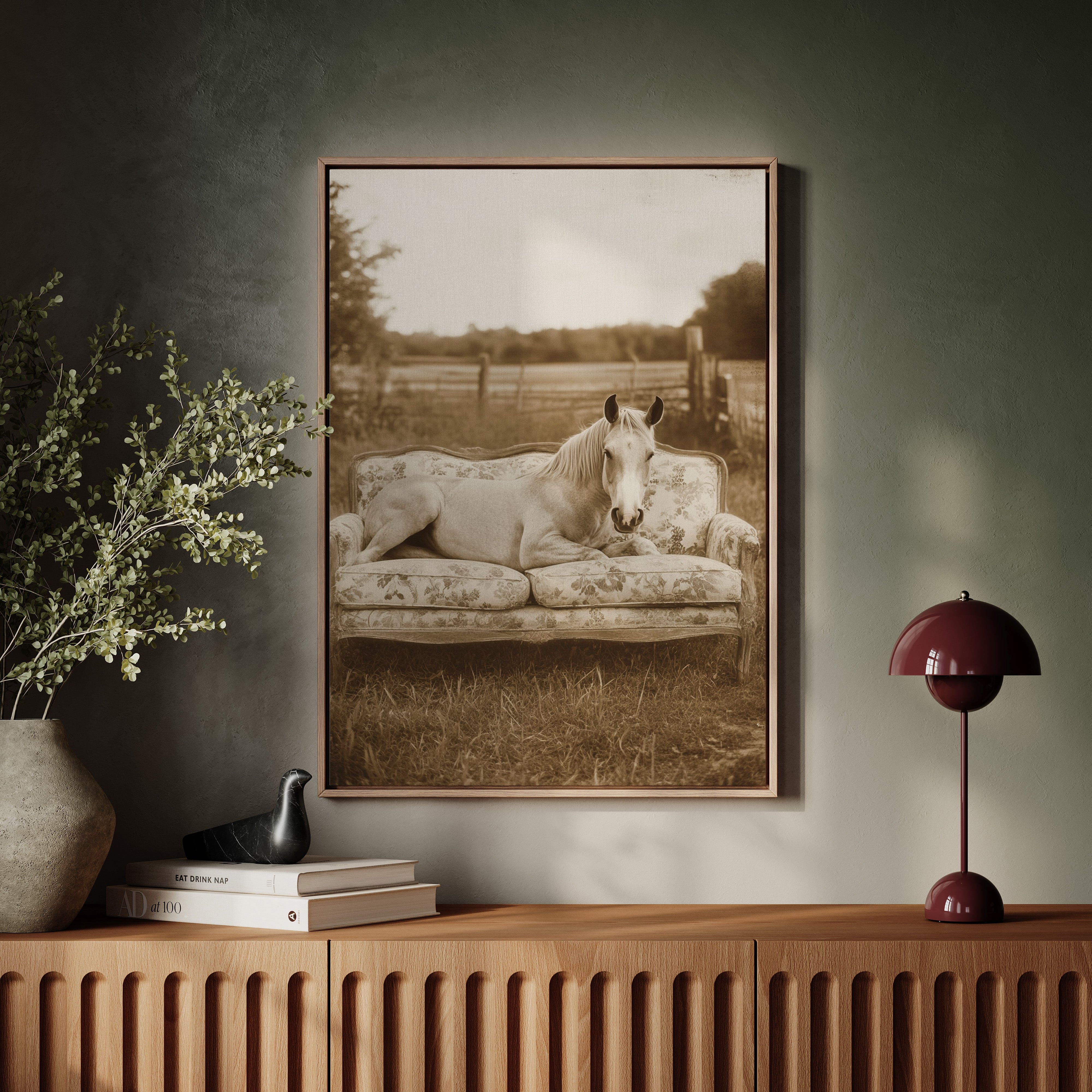 Unbridled charm meets unexpected whimsy in this unforgettable sepia-toned print. A majestic horse reclines with serene confidence on a vintage floral sofa in the middle of a field — blending rustic elegance with surreal humor. This artwork is perfect for lovers of horses, quirky farmhouse style, or anyone with a taste for the extraordinary. Whether in a living room, stable office, or gallery wall, this piece never fails to spark conversation and admiration.