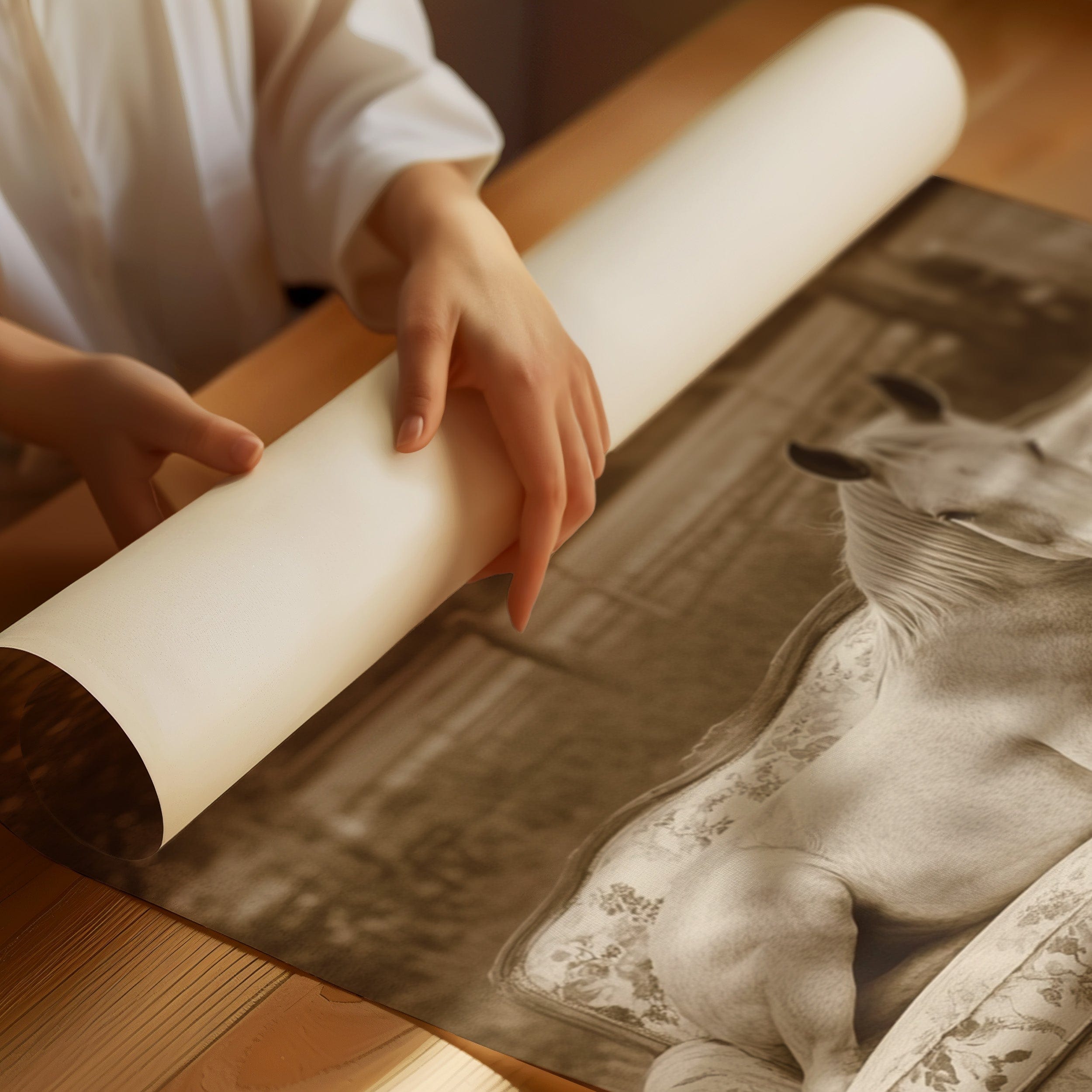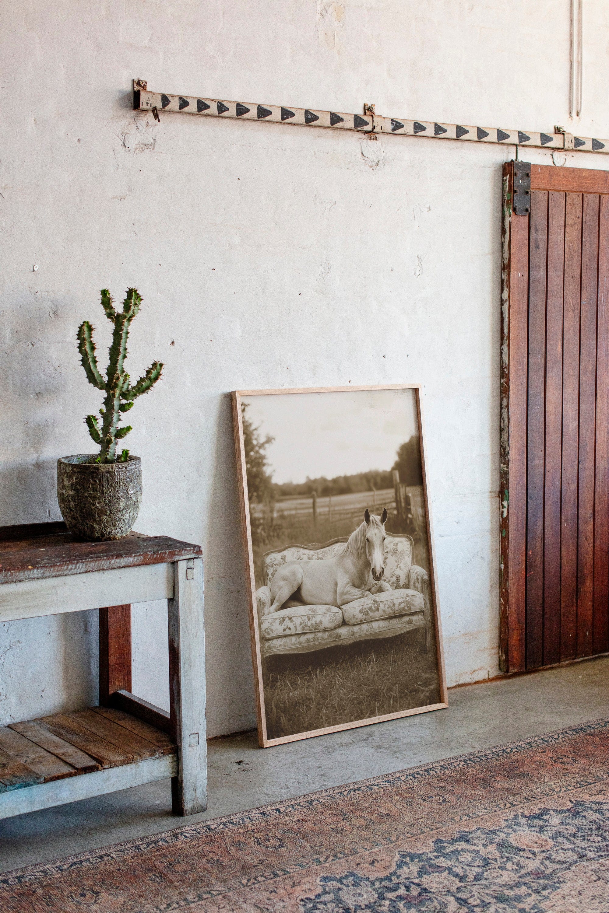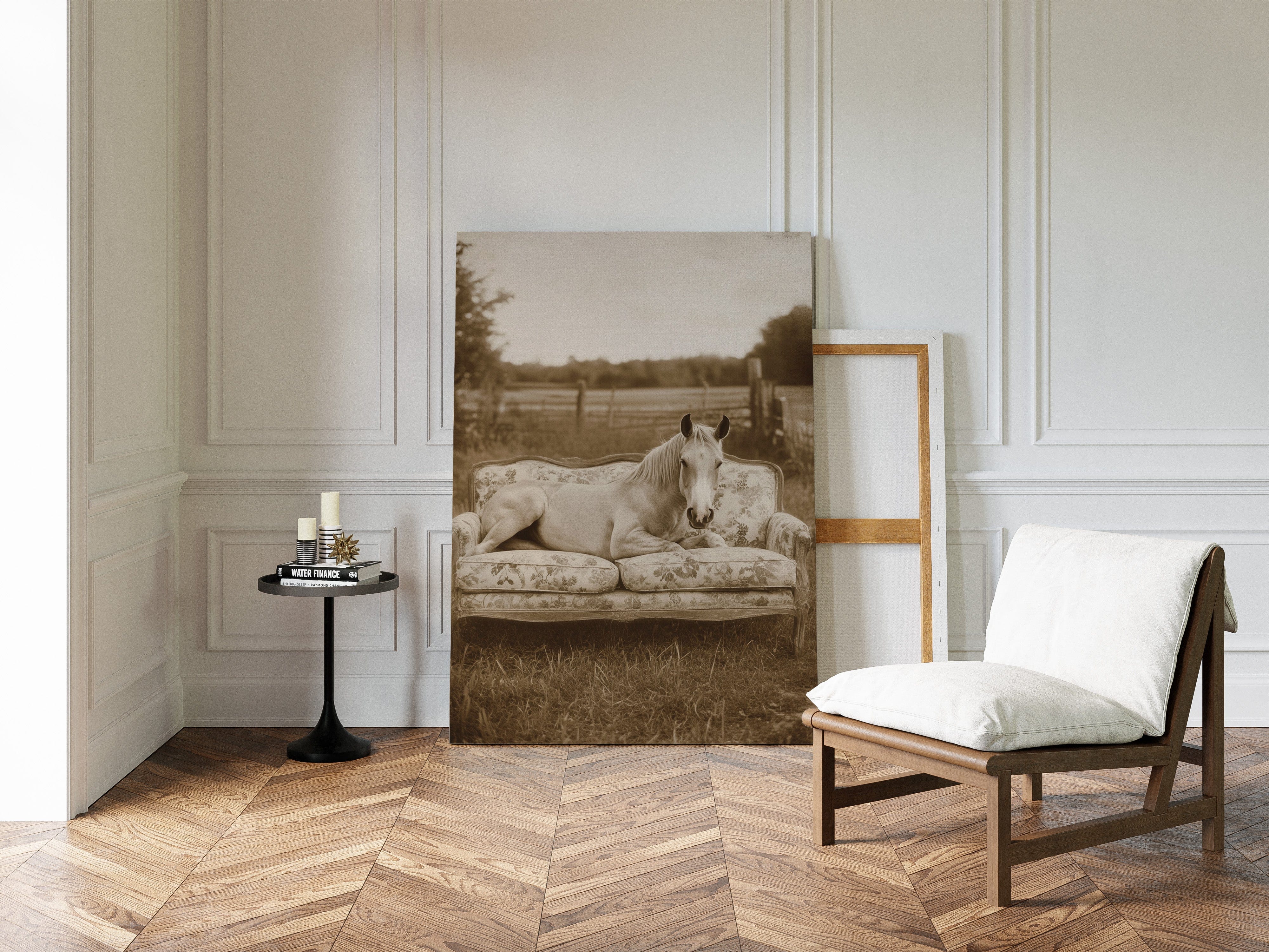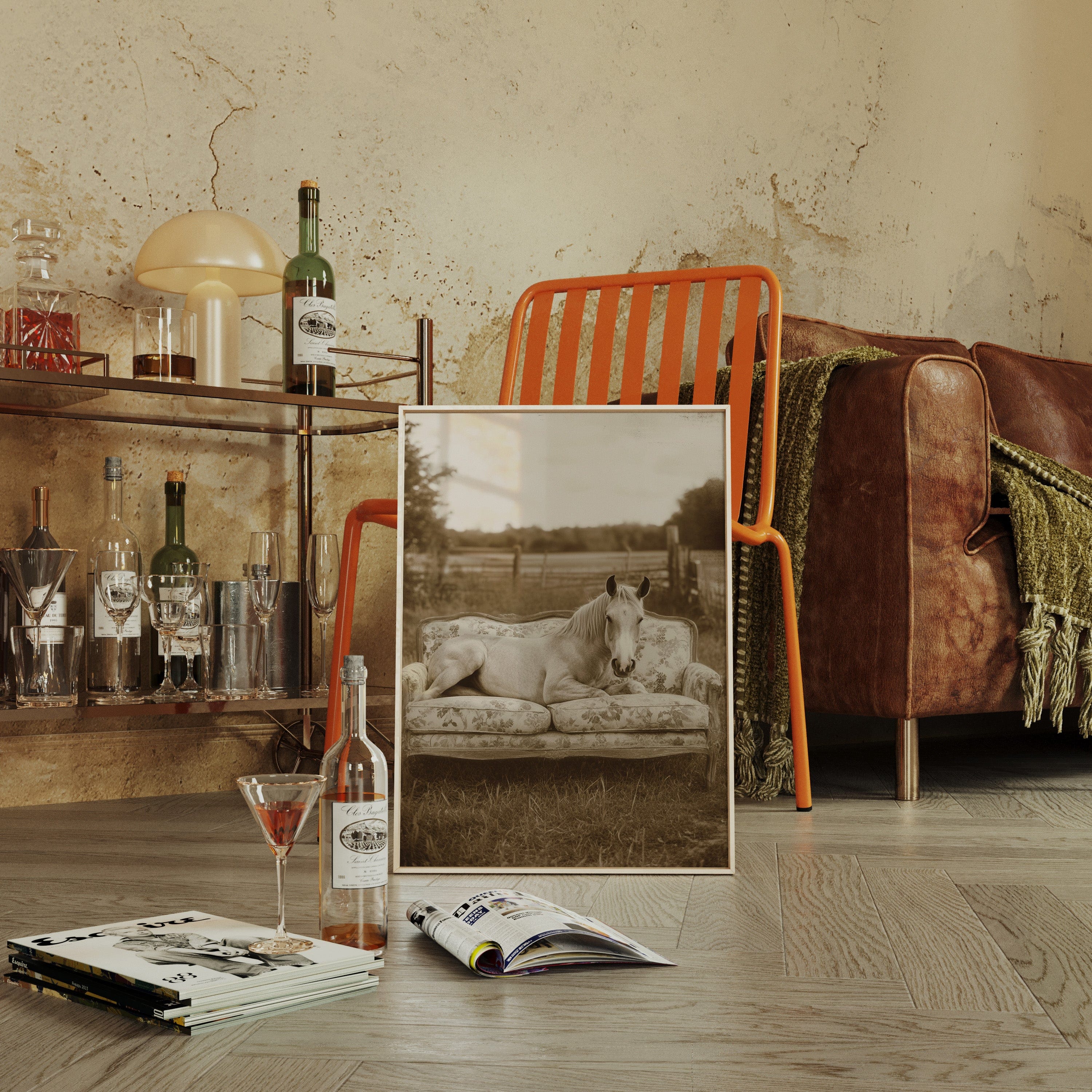 Unbridled charm meets unexpected whimsy in this unforgettable sepia-toned print. A majestic horse reclines with serene confidence on a vintage floral sofa in the middle of a field — blending rustic elegance with surreal humor. This artwork is perfect for lovers of horses, quirky farmhouse style, or anyone with a taste for the extraordinary. Whether in a living room, stable office, or gallery wall, this piece never fails to spark conversation and admiration.
