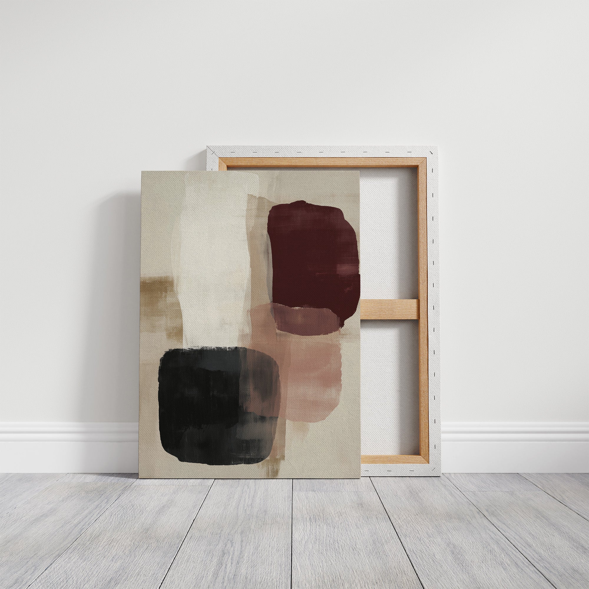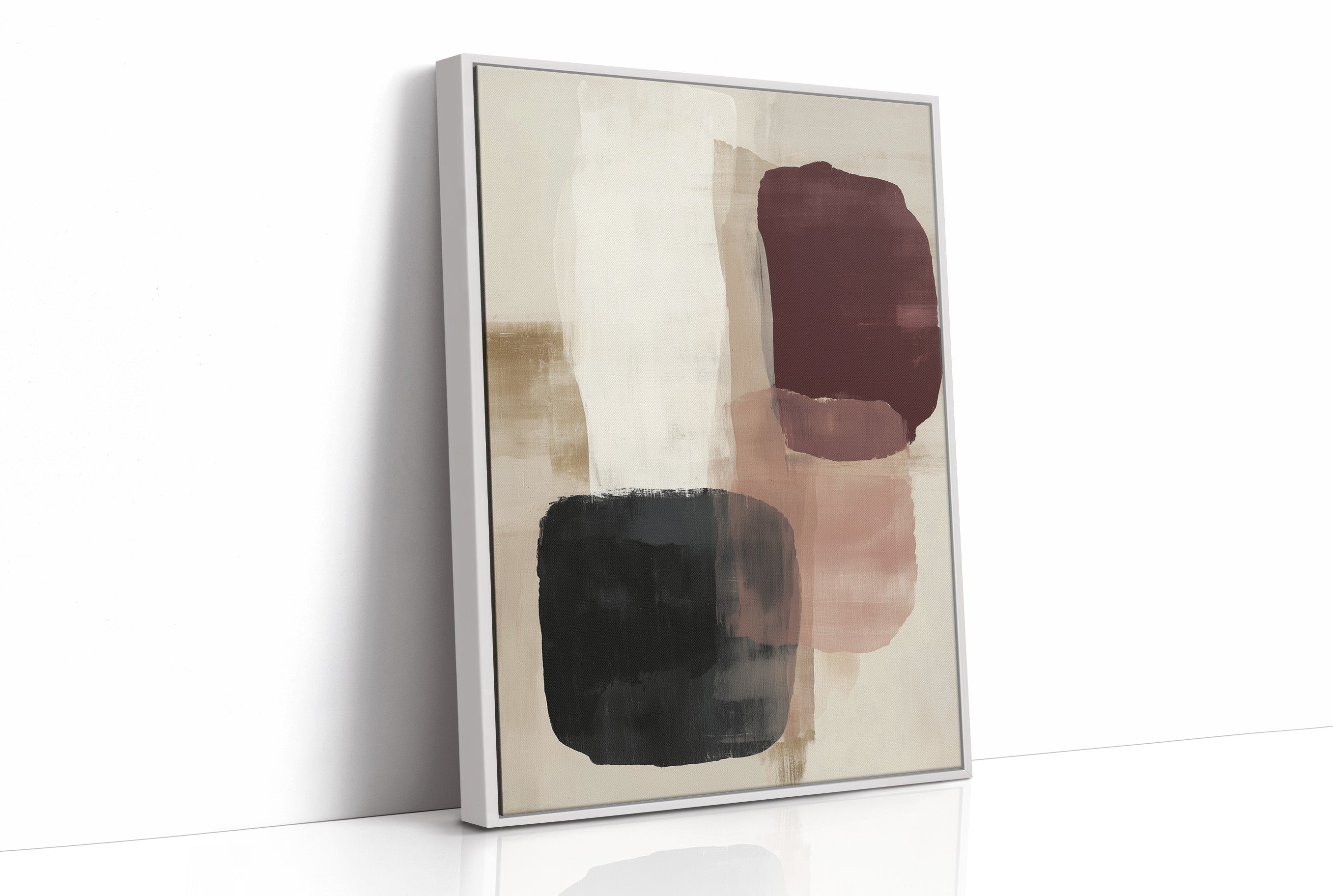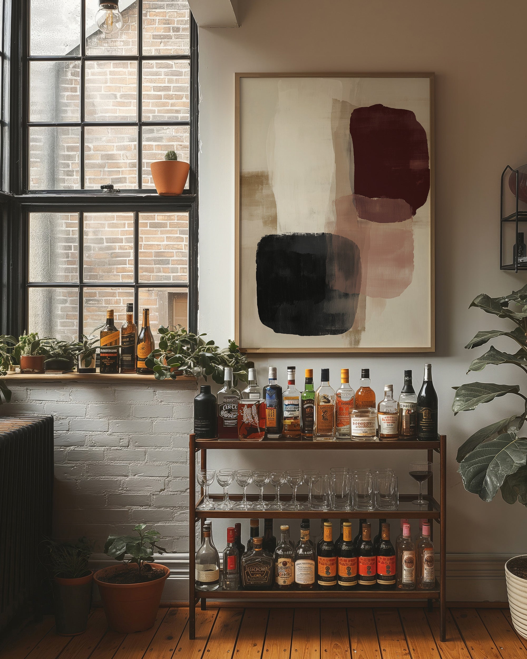 Sunlight streams across a serene corner, casting gentle shadows that play with an abstract composition of burgundy, black, and blush forms. The artwork's organic shapes float against a cream background, creating a sophisticated dialogue between color and negative space. This contemporary piece brings warmth and movement to a thoughtfully curated space, where books, plants, and carefully chosen objects create a harmonious sanctuary. This piece would elevate a reading nook, home office, or modern living space where its subtle palette can inspire moments of quiet contemplation.