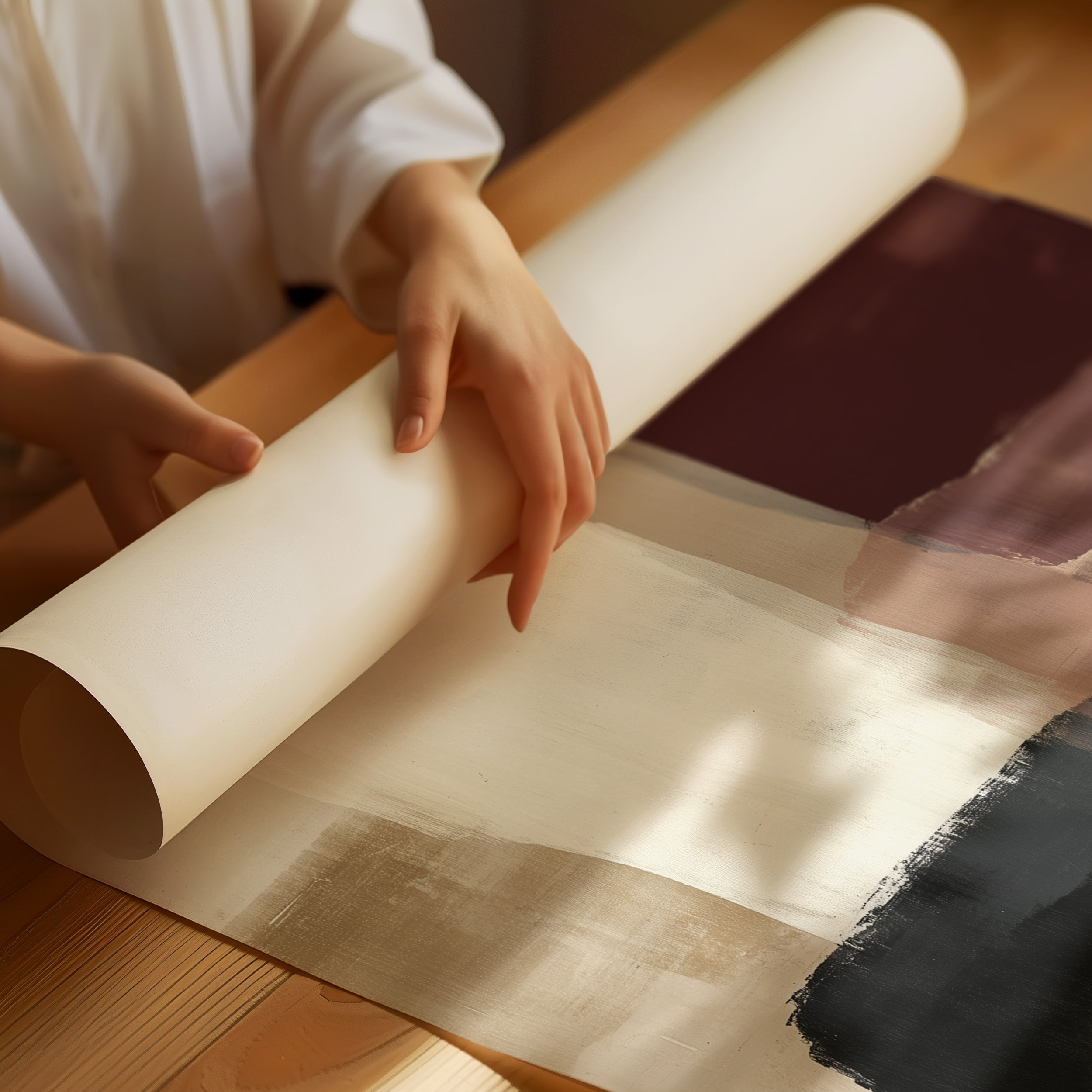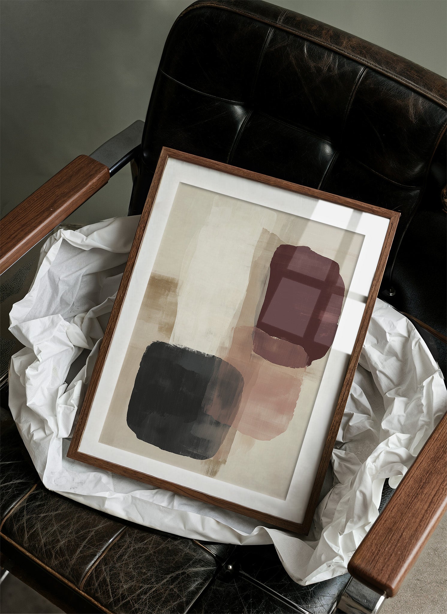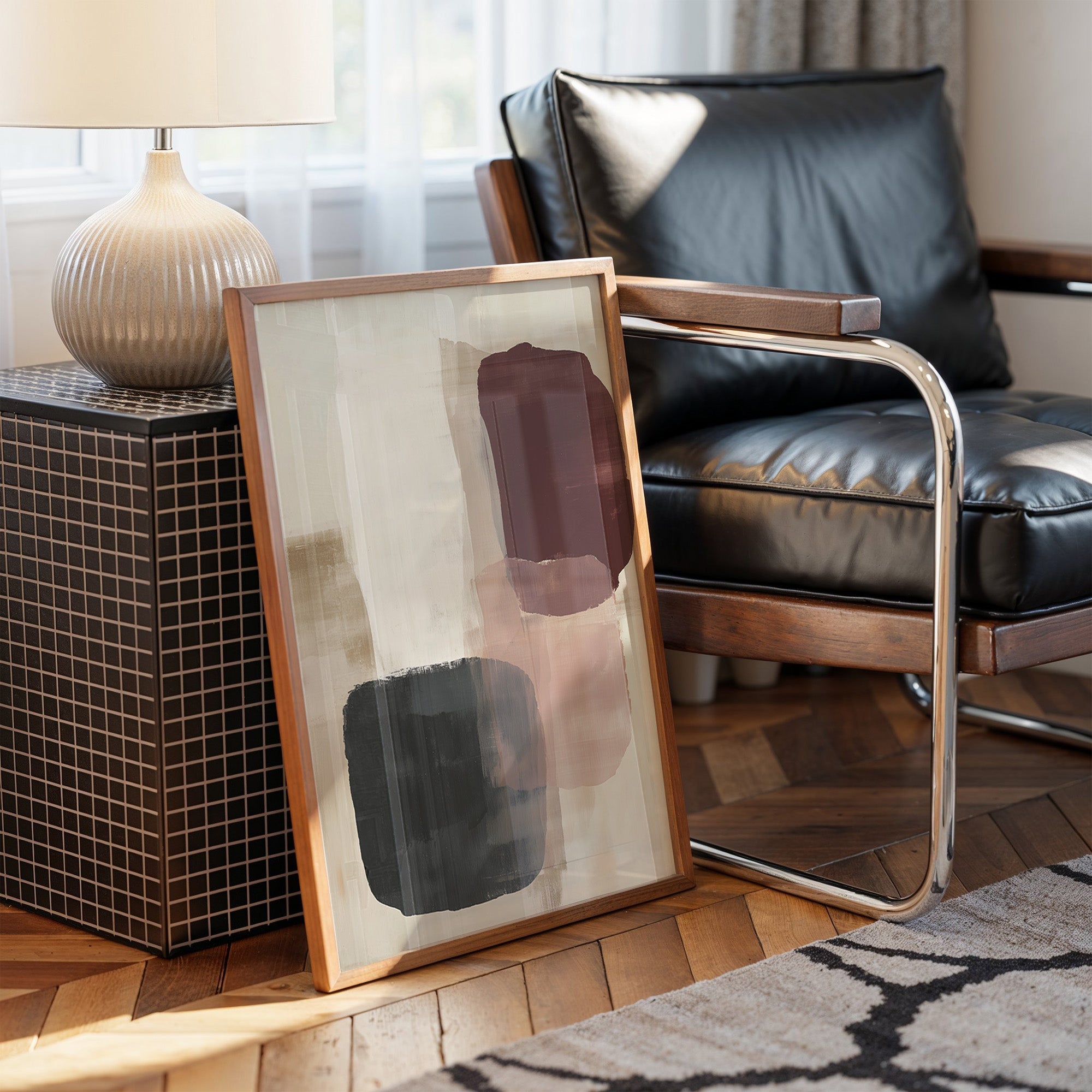 Sunlight streams across a serene corner, casting gentle shadows that play with an abstract composition of burgundy, black, and blush forms. The artwork's organic shapes float against a cream background, creating a sophisticated dialogue between color and negative space. This contemporary piece brings warmth and movement to a thoughtfully curated space, where books, plants, and carefully chosen objects create a harmonious sanctuary. This piece would elevate a reading nook, home office, or modern living space where its subtle palette can inspire moments of quiet contemplation.