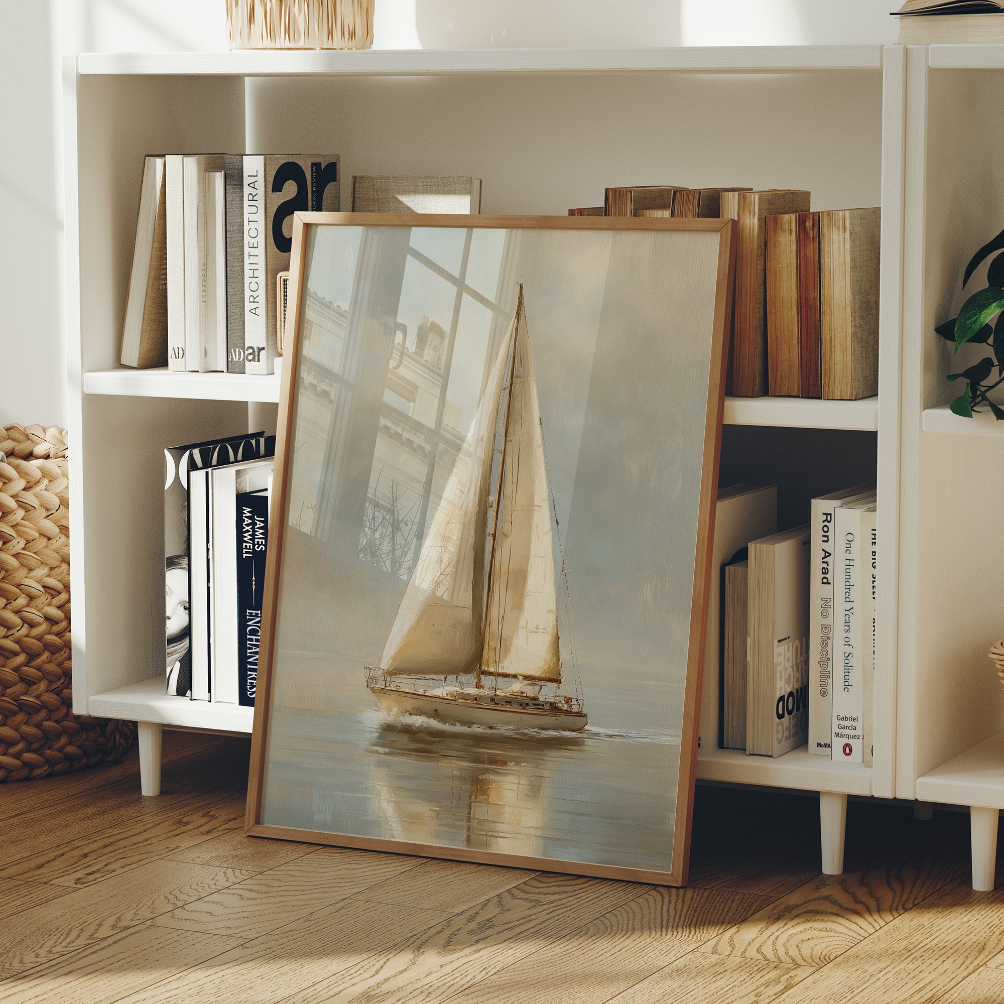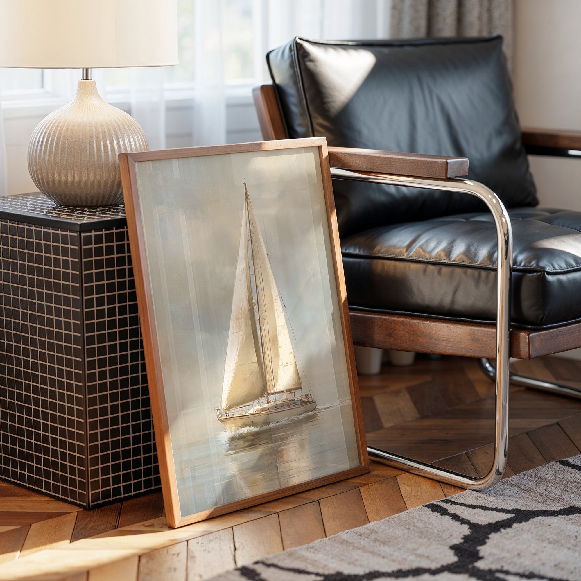 Morning light filters through the scene, illuminating the elegant sailboat artwork that leans casually against a sophisticated leather chair. The muted palette of creams and grays creates a peaceful narrative of distant shores and quiet adventures. Warm wooden tones from the frame and herringbone flooring complement the nautical theme, while the ribbed ceramic lamp adds textural harmony to this thoughtful corner. This piece would bring a subtle maritime elegance to a coastal home office or reading nook where contemplative moments unfold.