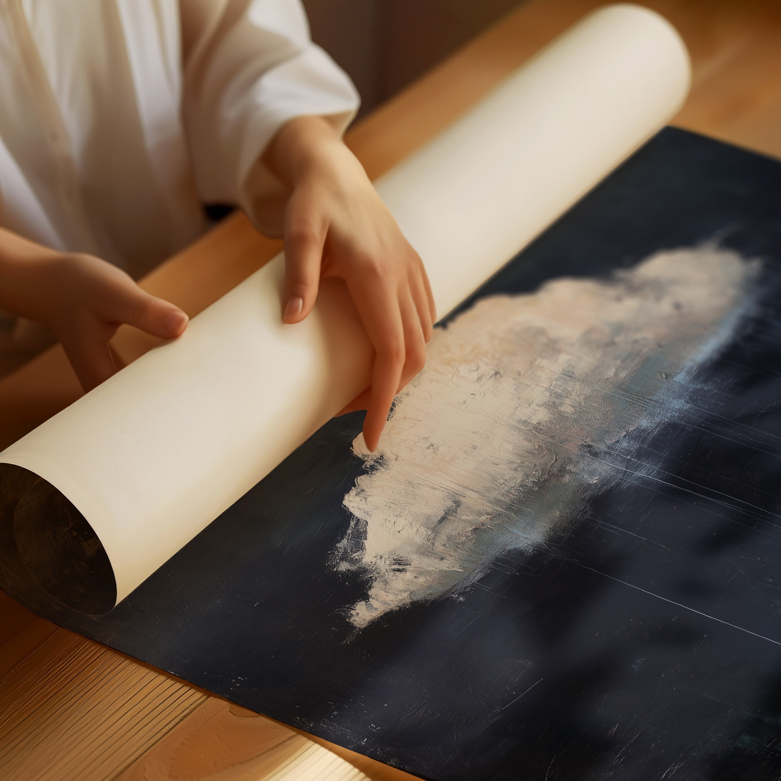 A single luminous cloud floats suspended in a stormy atmosphere, its soft white form creating a powerful contrast against the moody indigo backdrop. The textured brushwork reveals layers of deep blues and grays, evoking the feeling of a moment frozen between turbulence and serenity. The painting's minimalist approach speaks volumes about solitude and hope, with delicate drips of paint suggesting the ephemeral nature of both clouds and emotions. This statement piece brings contemplative drama to modern spaces with high ceilings or minimal decor.