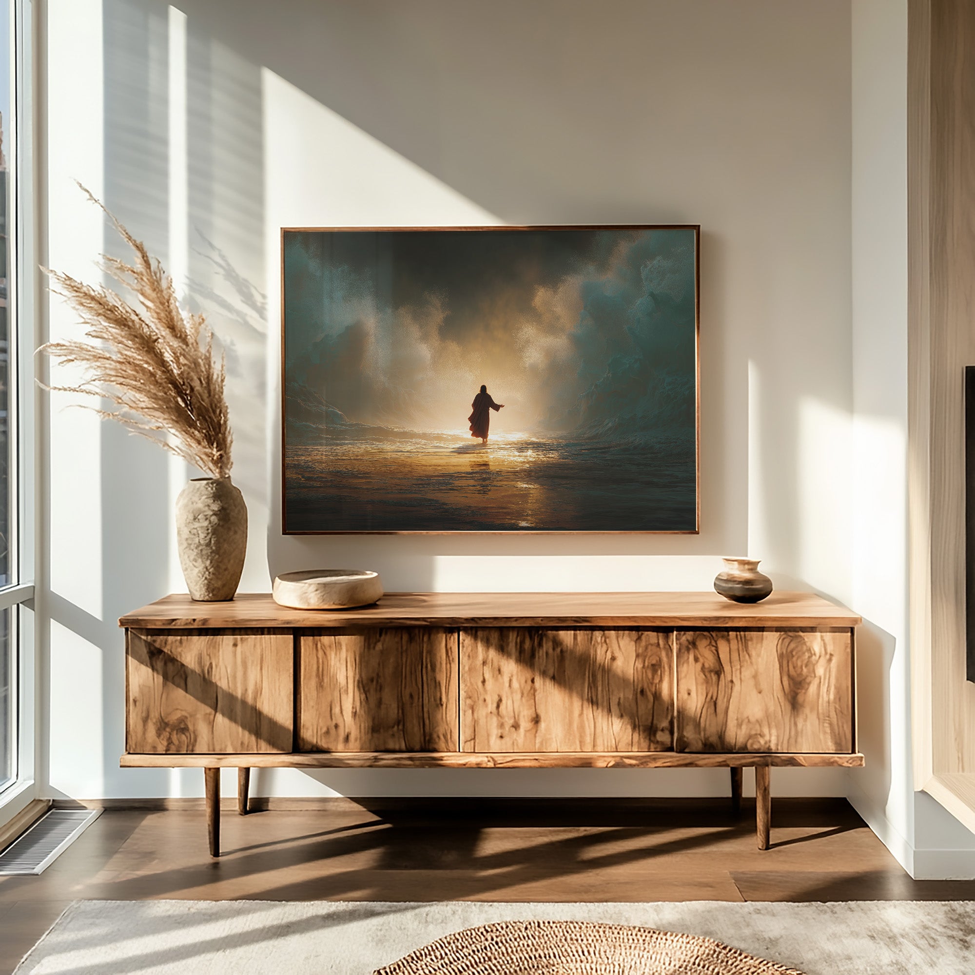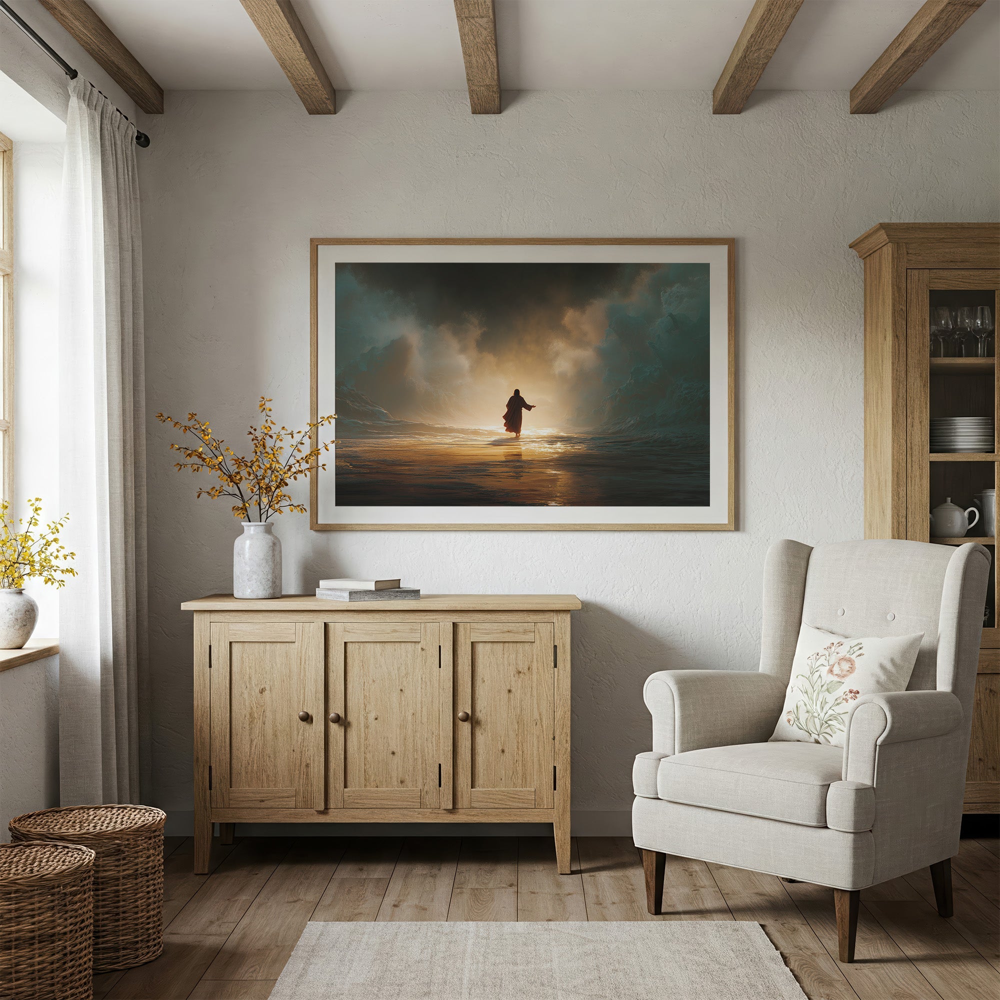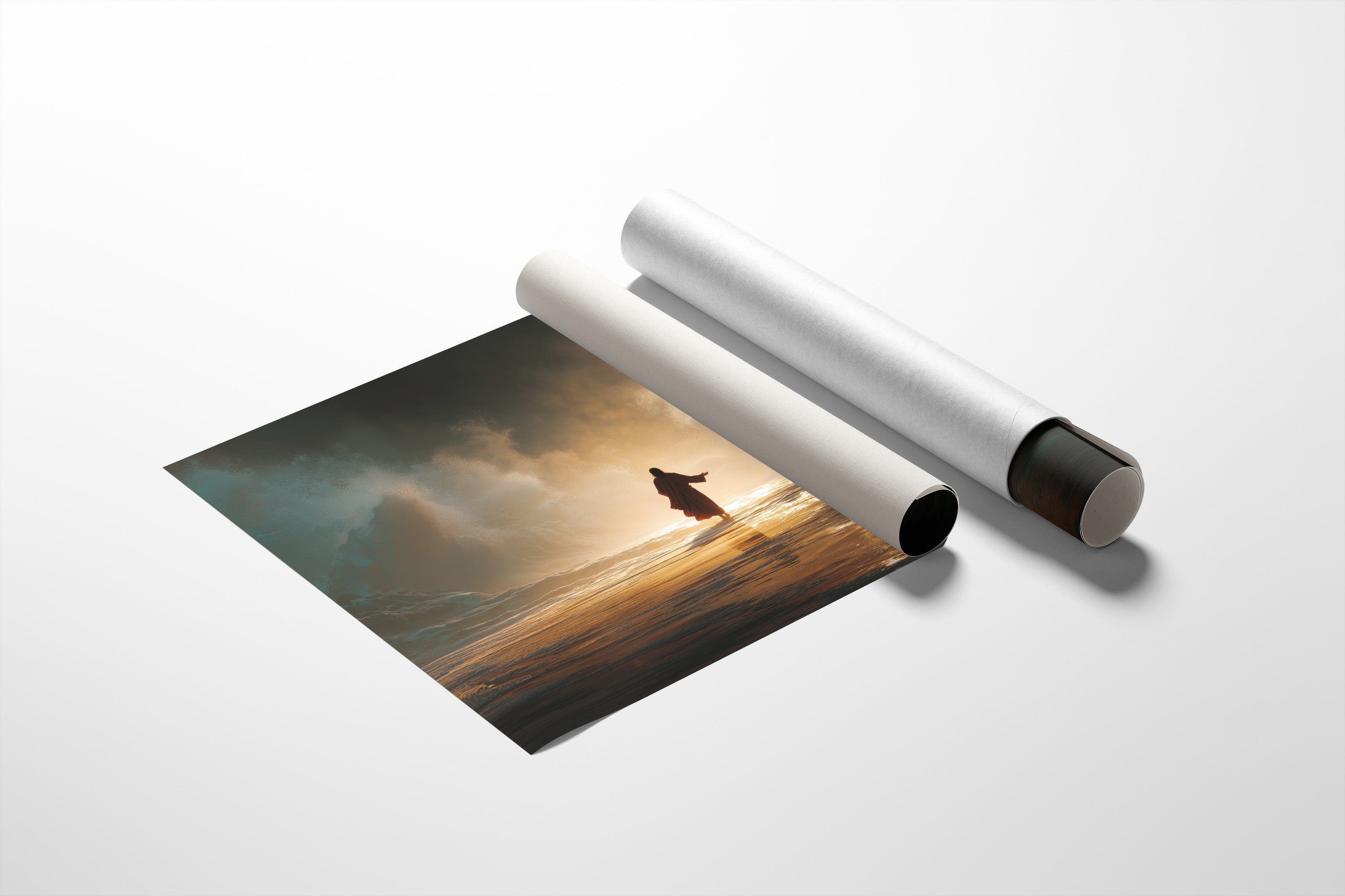 A moment of profound stillness captured between chaos and calm. A lone silhouette stands at the threshold of towering waves and golden light, creating a powerful contrast between human fragility and nature's might. The dramatic sky swirls with teal and amber tones, casting an ethereal glow across the turbulent waters as the figure appears to command or commune with the sea. This contemplative piece brings a sense of spiritual depth and philosophical wonder to a study, reading nook, or meditation space.