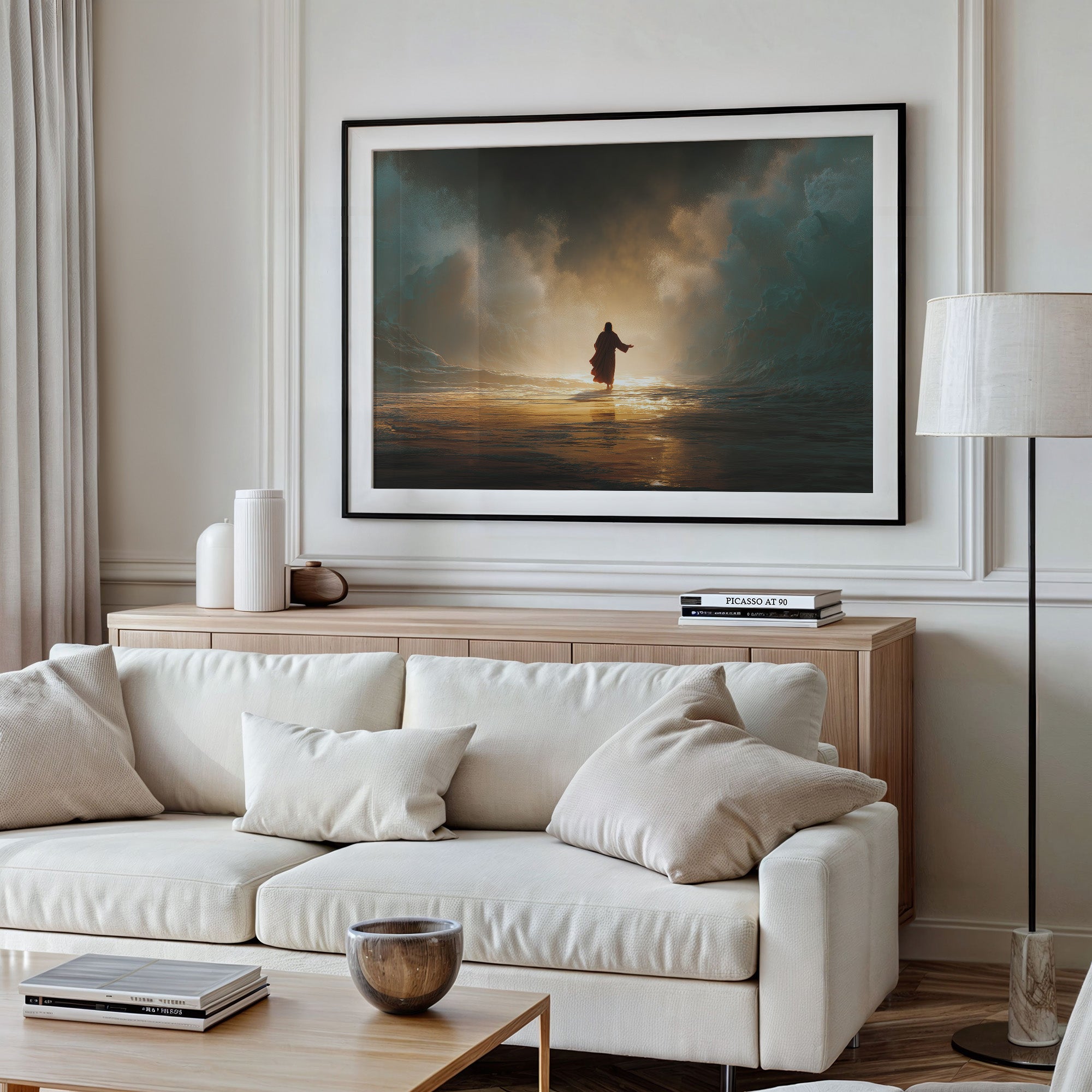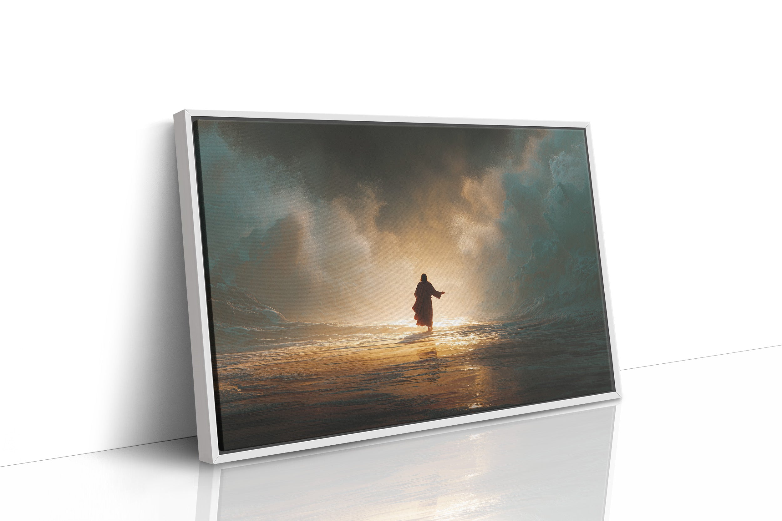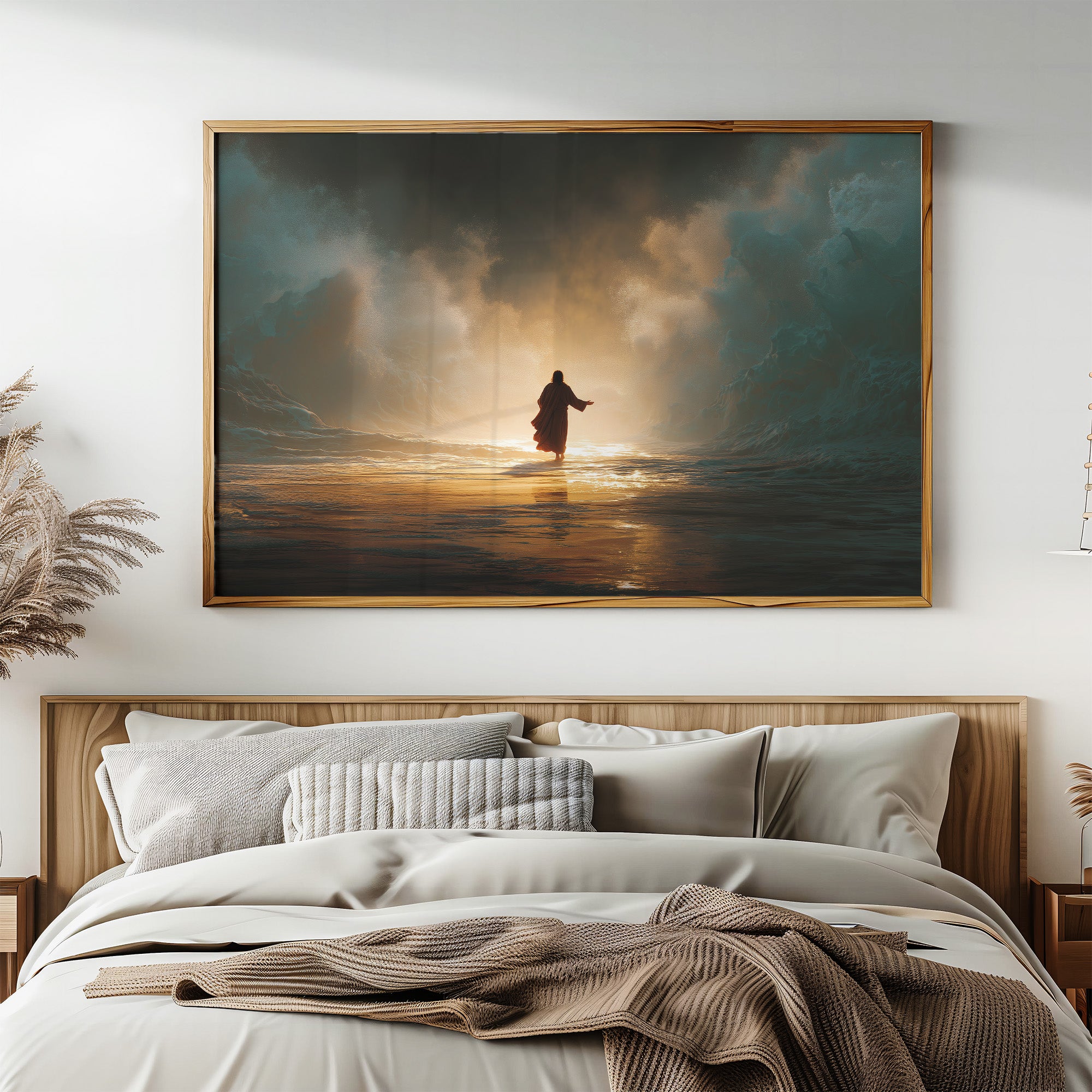 A moment of profound stillness captured between chaos and calm. A lone silhouette stands at the threshold of towering waves and golden light, creating a powerful contrast between human fragility and nature's might. The dramatic sky swirls with teal and amber tones, casting an ethereal glow across the turbulent waters as the figure appears to command or commune with the sea. This contemplative piece brings a sense of spiritual depth and philosophical wonder to a study, reading nook, or meditation space.