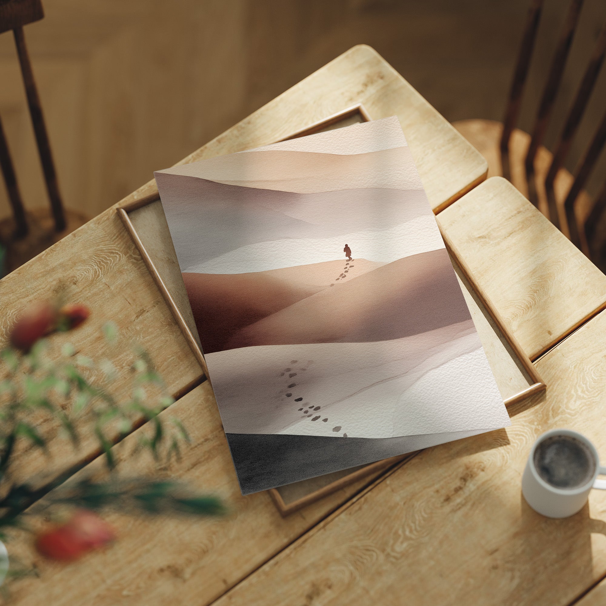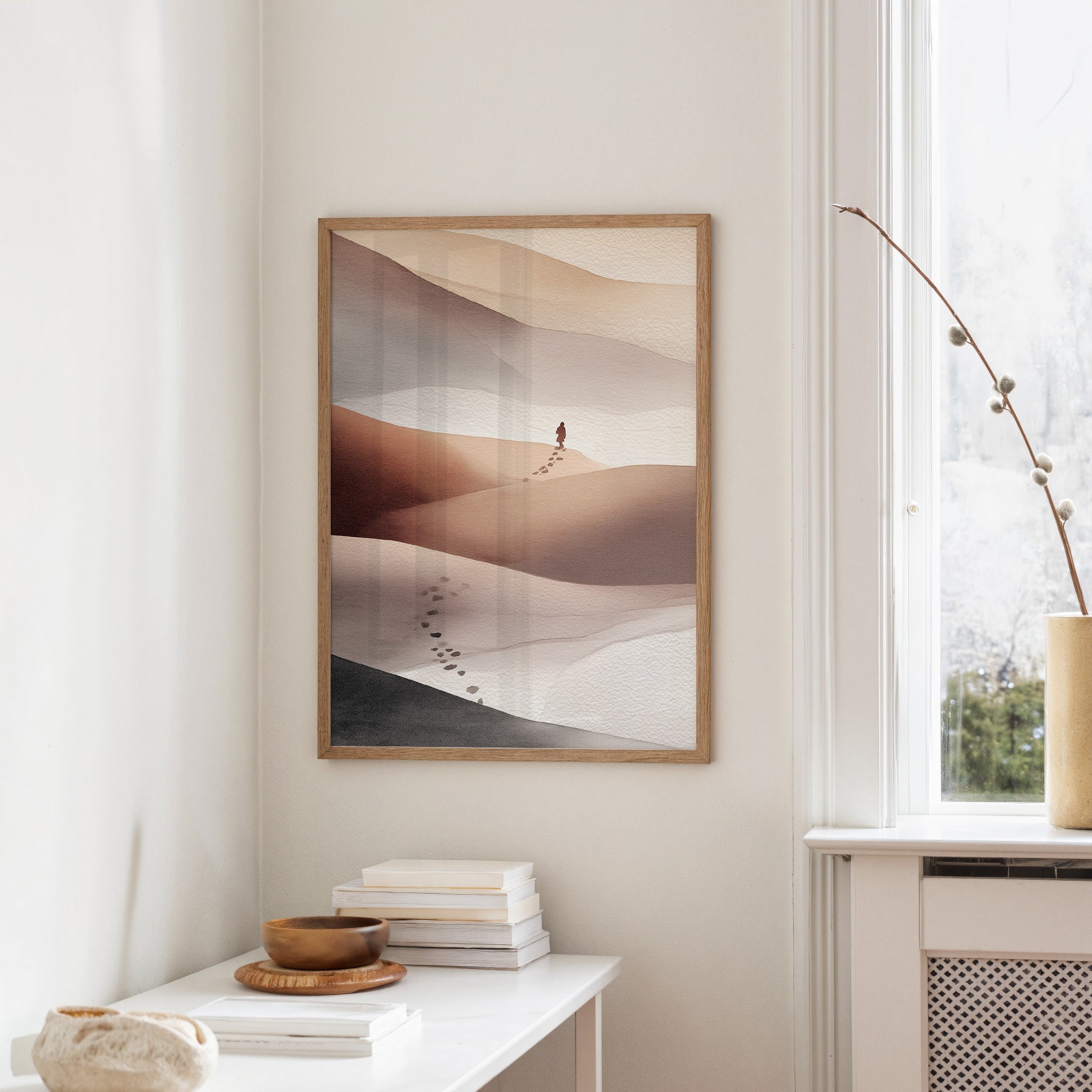 Morning light washes over undulating dunes where a lone traveler leaves their mark. The soft palette of cream, rose, and taupe creates a dreamlike landscape where human scale is humbled by nature's vastness. Footprints trace a story of determination, a silent testament to paths less traveled and distances conquered in solitude. This contemplative piece brings serene minimalism to home offices or reading nooks where quiet reflection is treasured.