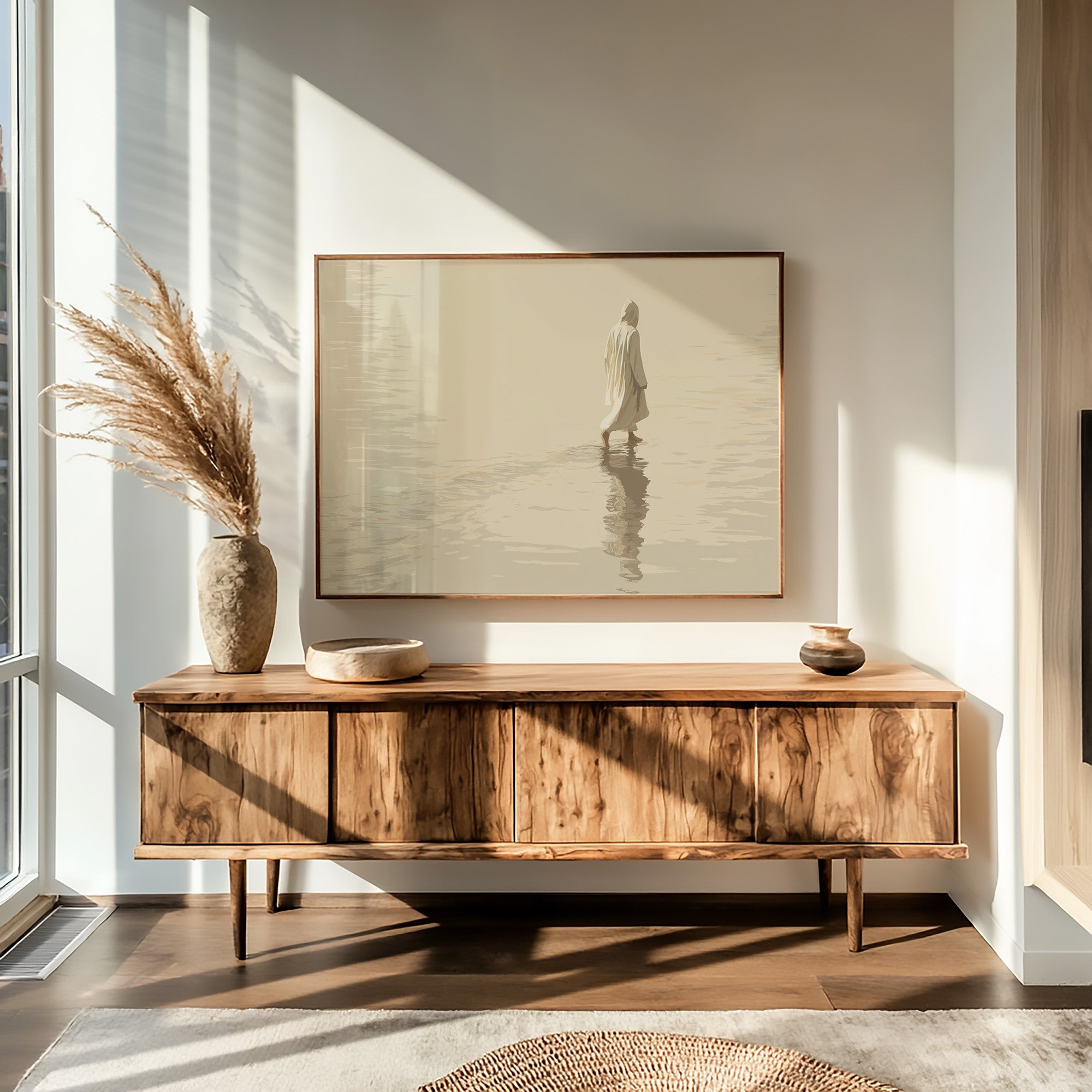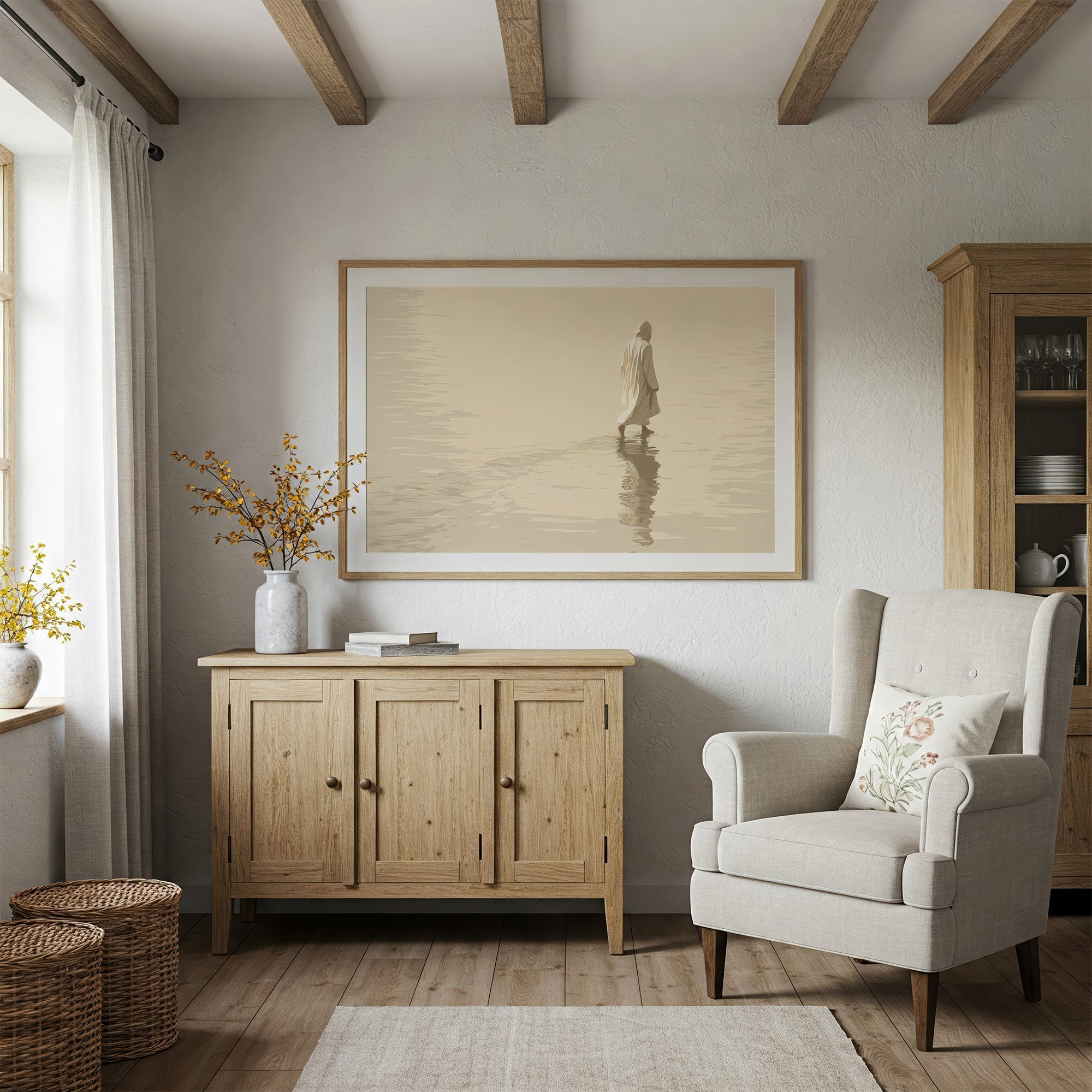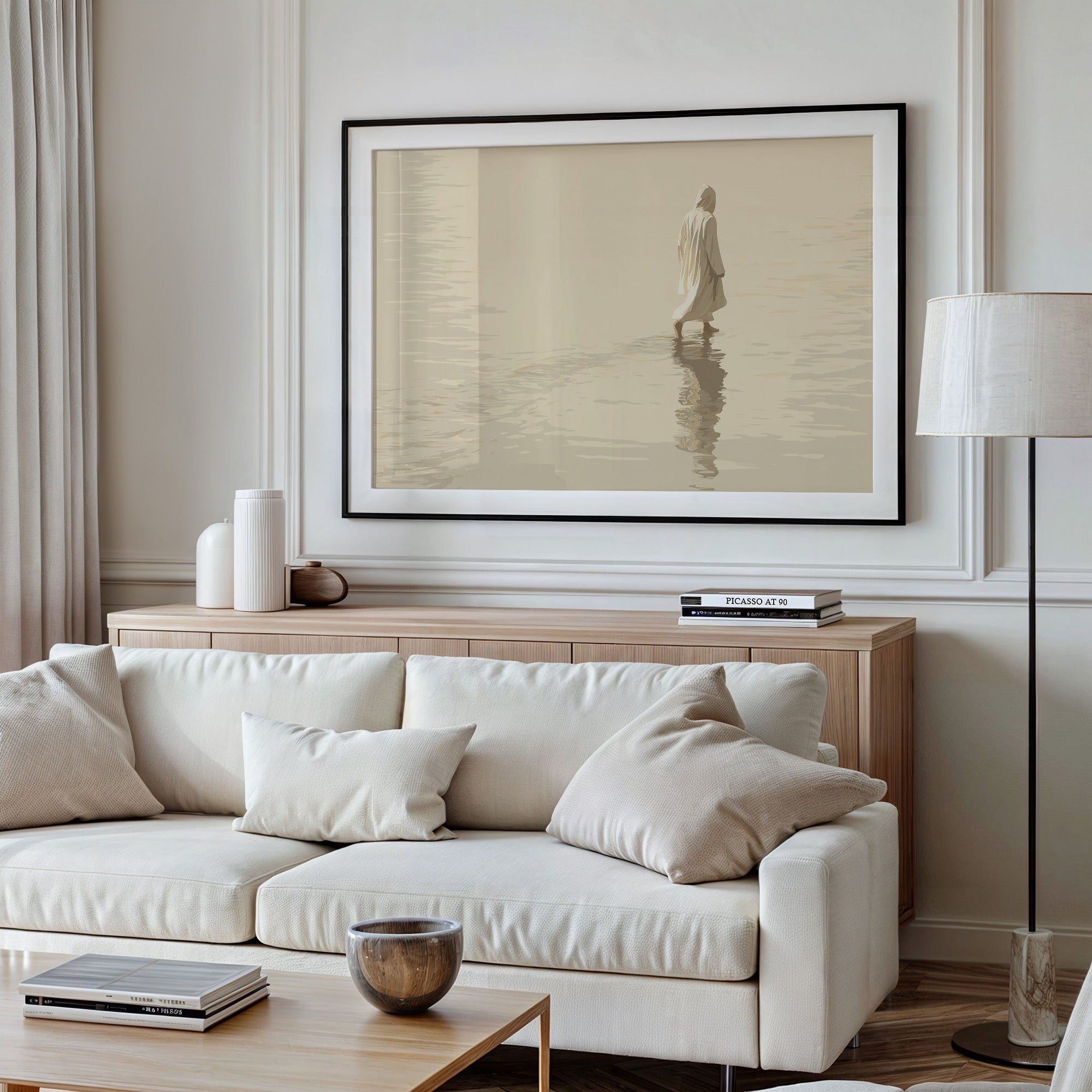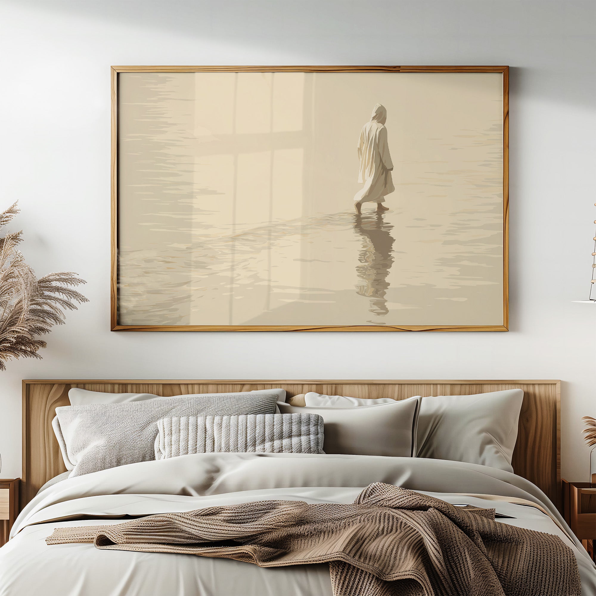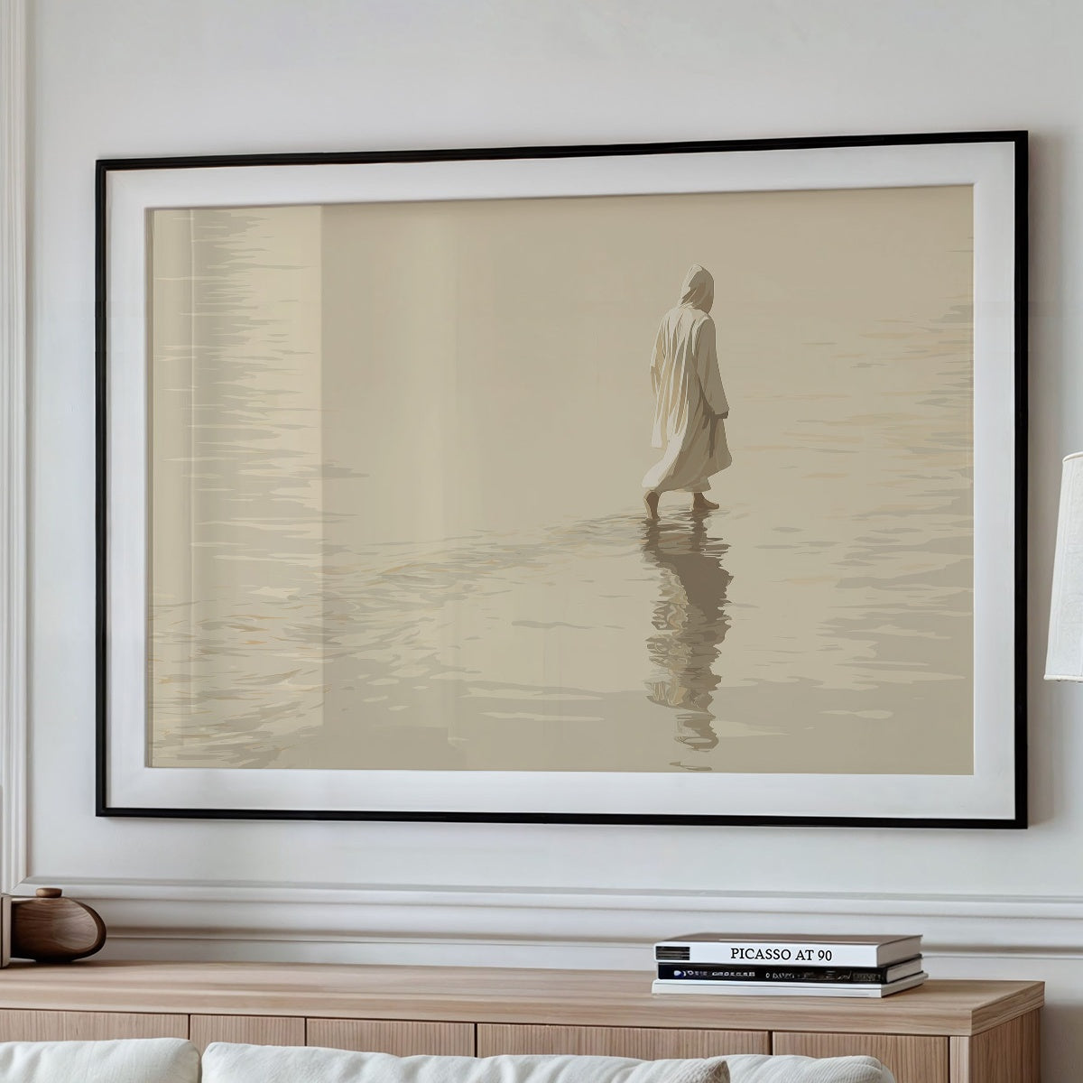 A lone figure walks across a misty, ethereal expanse of shallow water, their reflection creating a perfect mirror image below. The monochromatic palette bathes the scene in serene neutrals, evoking a sense of peaceful solitude and contemplative journey. Displayed elegantly against wooden bookshelves, the framed artwork creates a philosophical focal point that invites quiet reflection. This piece brings a meditative quality to a reading nook, home office, or hallway where moments of pause are treasured.