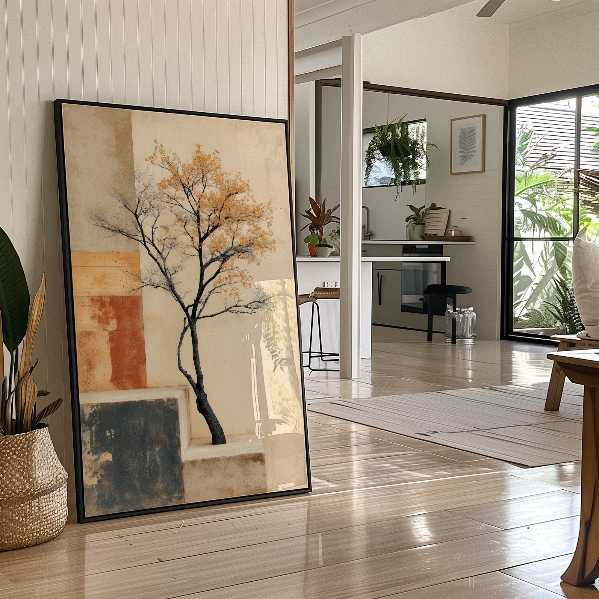 A gentle stillness emanates from this minimalist composition, where a lone tree reaches skyward with delicate branches adorned in golden autumn leaves. The abstract blocks of rust and navy create a modernist foundation, while cream tones soften the geometric elements. The piece masterfully balances organic and architectural forms, creating a meditation on solitude and strength. This contemporary artwork brings sophistication to any room, perfectly positioned against white bookshelves where its subtle palette can dialogue with curated literature and natural textures.