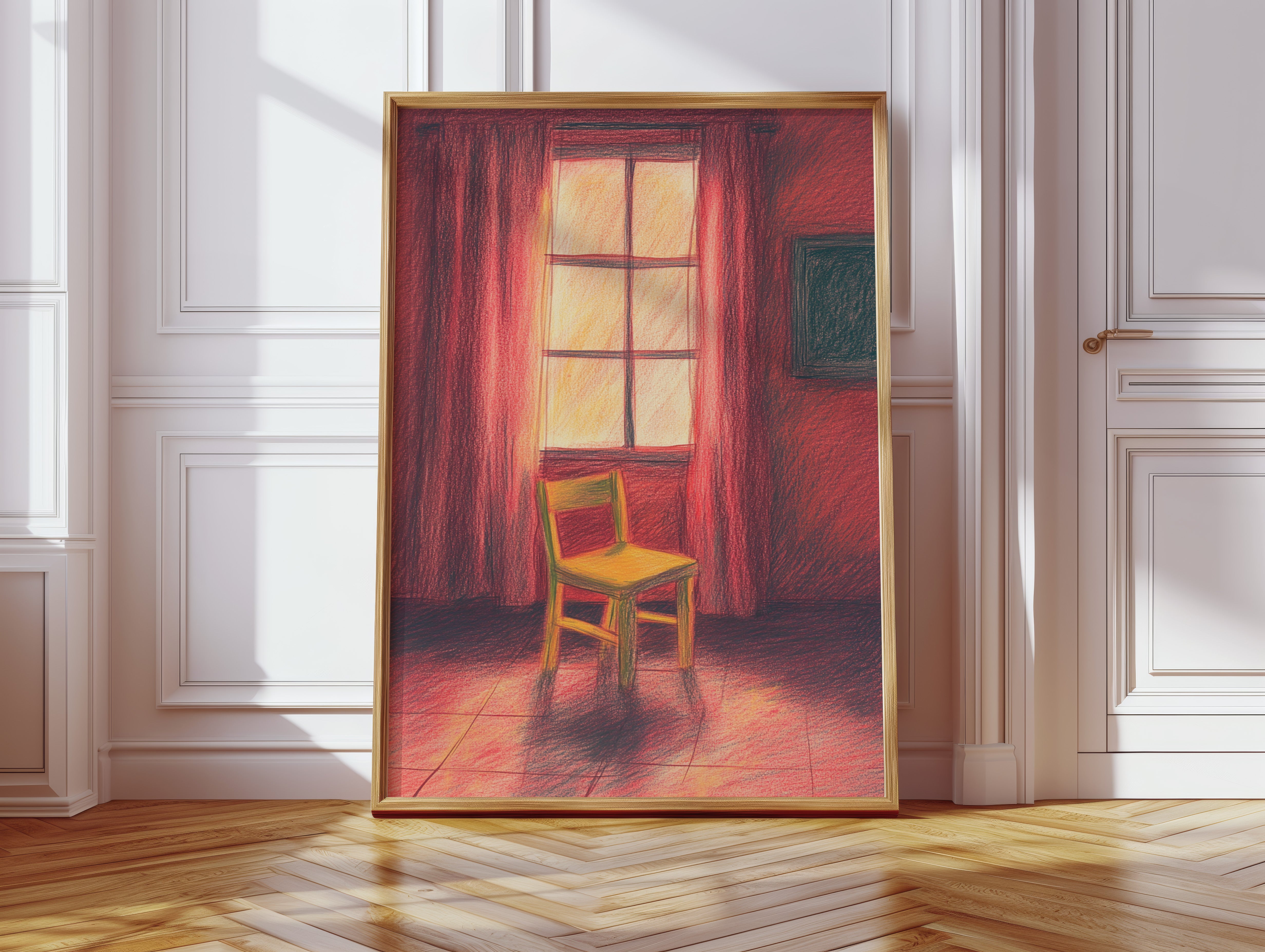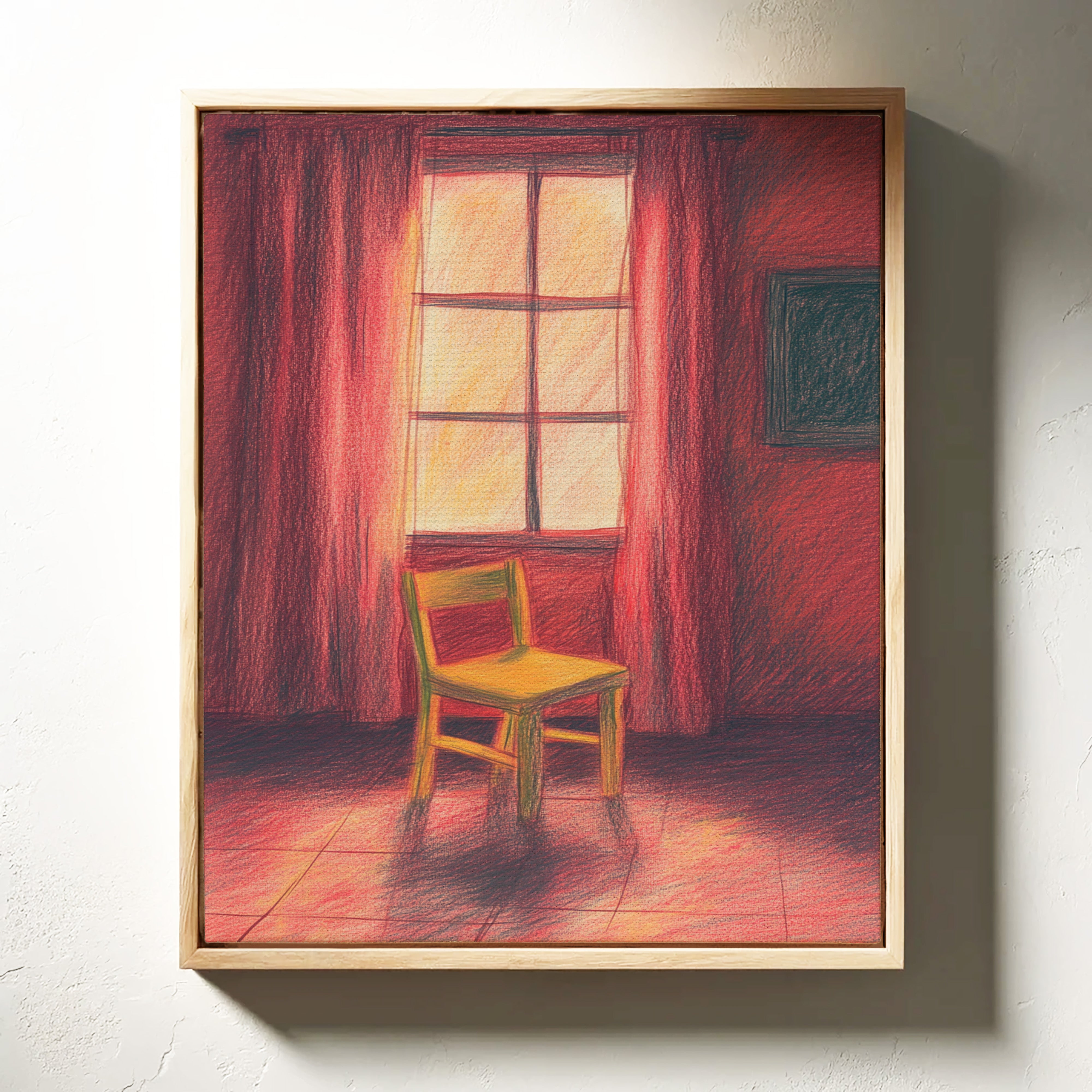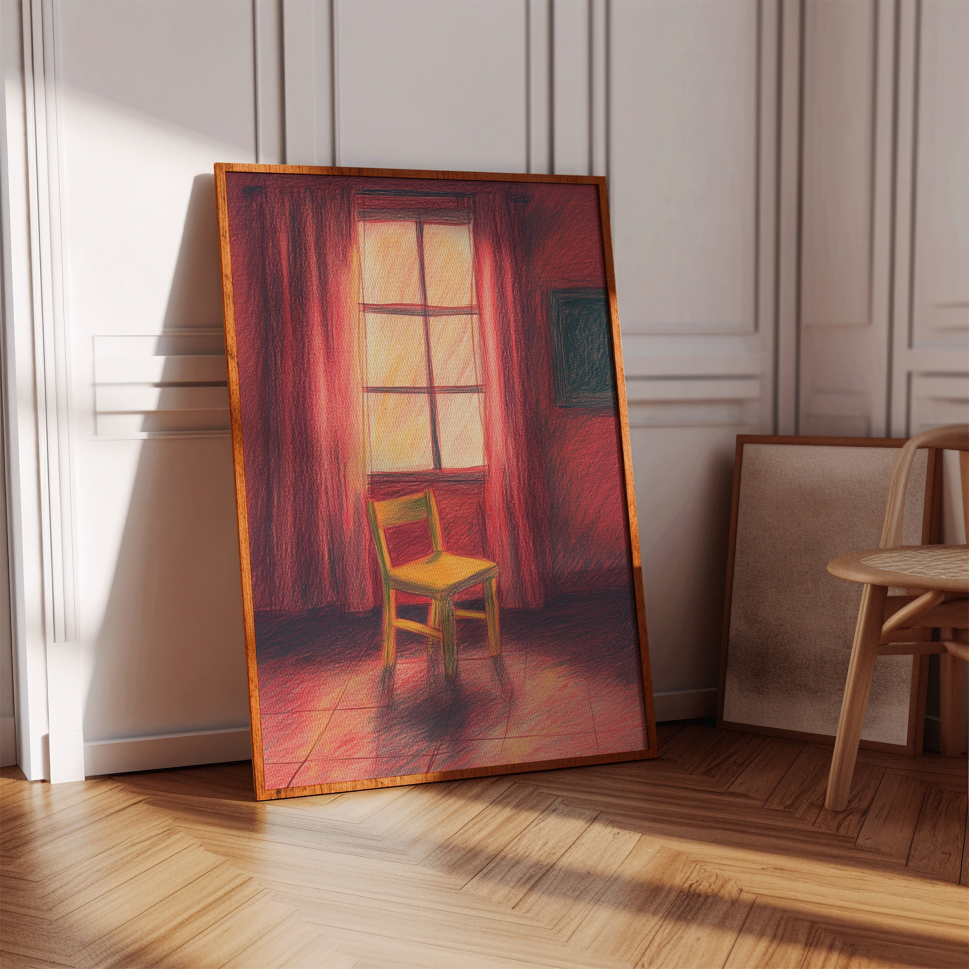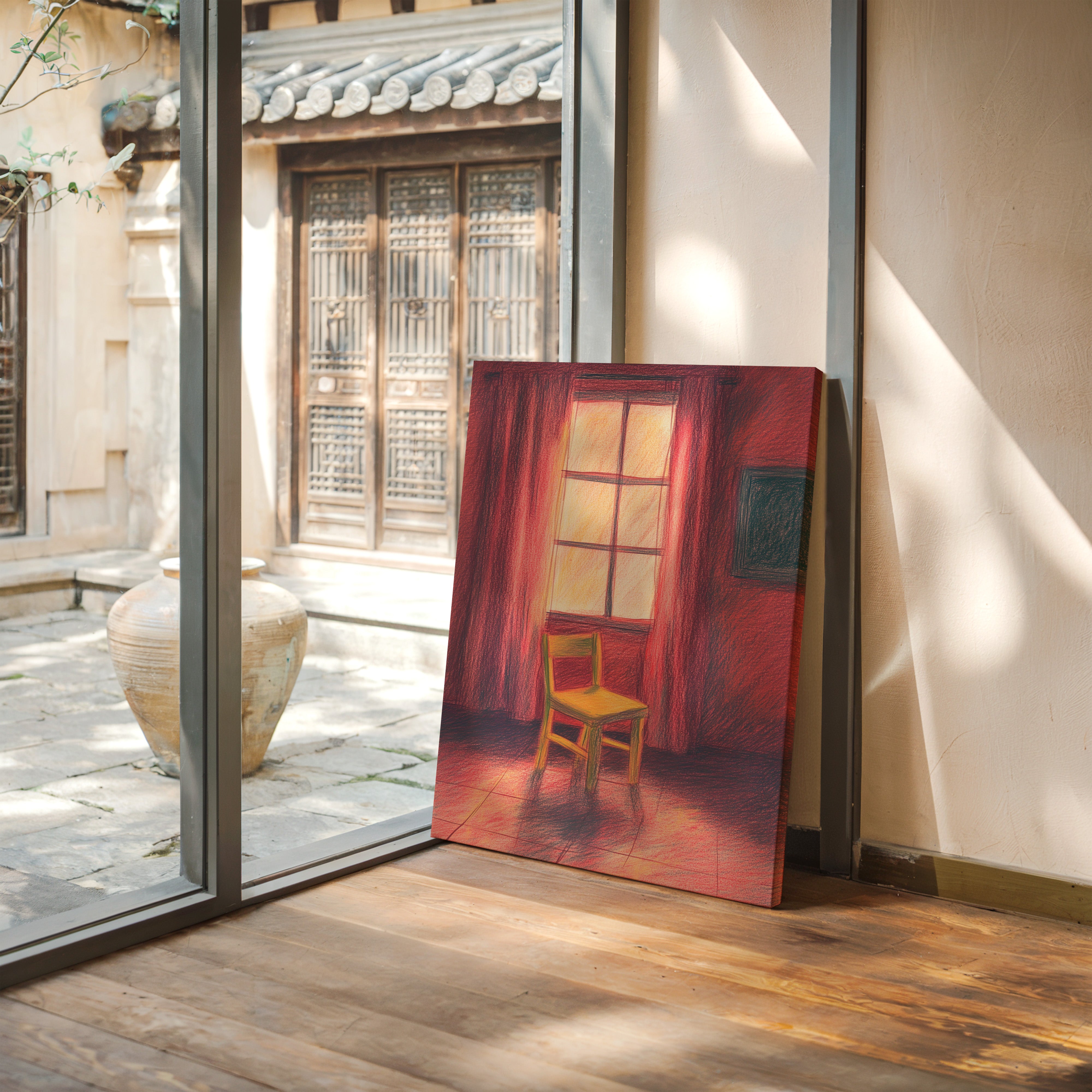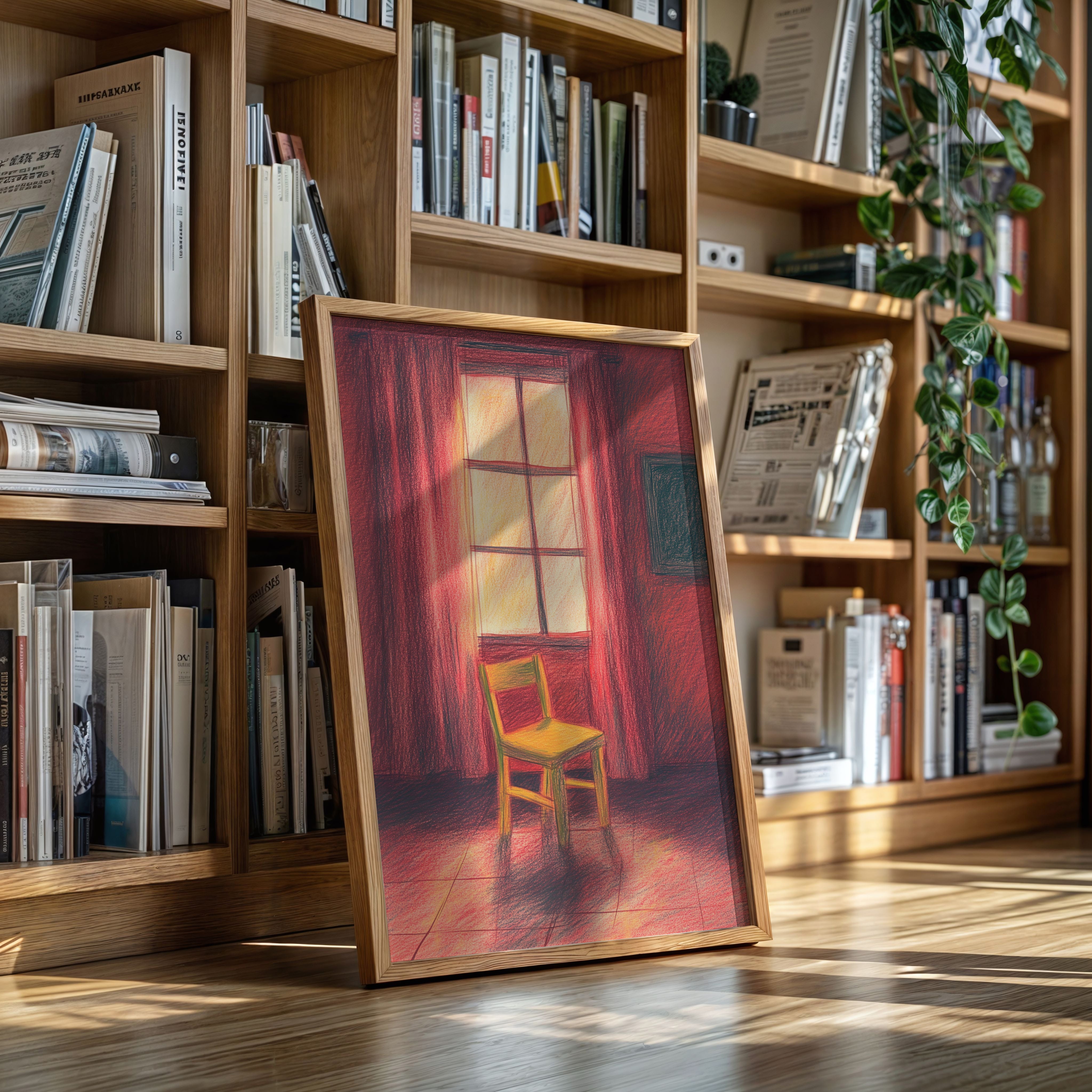 A single wooden chair stands sentinel in a room awash with deep crimson hues, catching the warm glow of unseen sunset. The scene speaks of quiet contemplation, where time seems to pause between day and evening. Rich burgundy curtains frame a luminous window, casting long shadows across the tiled floor while creating an intimate sanctuary of light and color. This contemplative piece invites viewers into a moment of peaceful solitude, where the ordinary transforms into the extraordinary through careful observation.