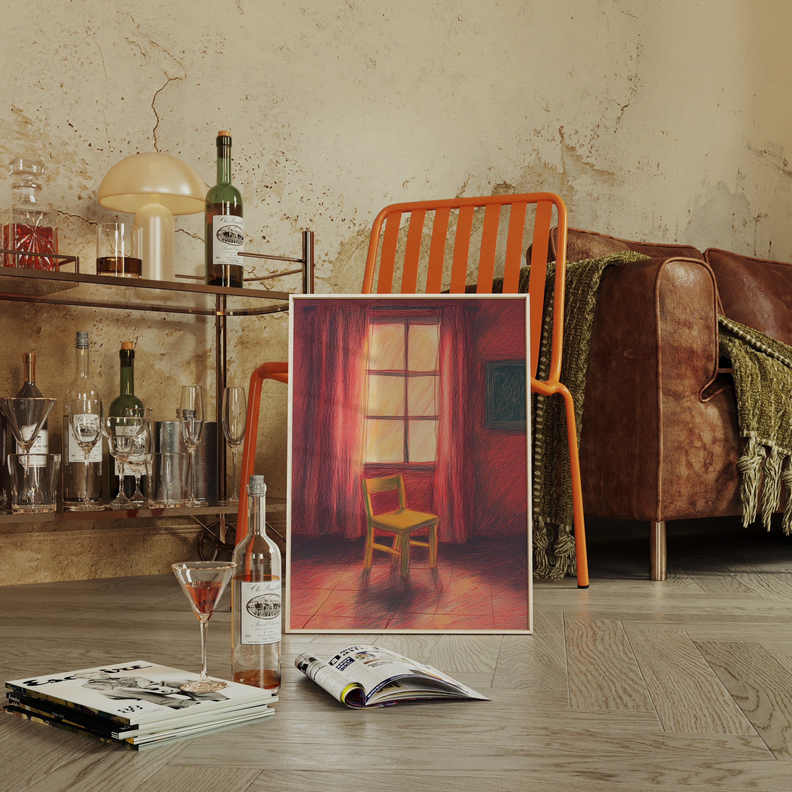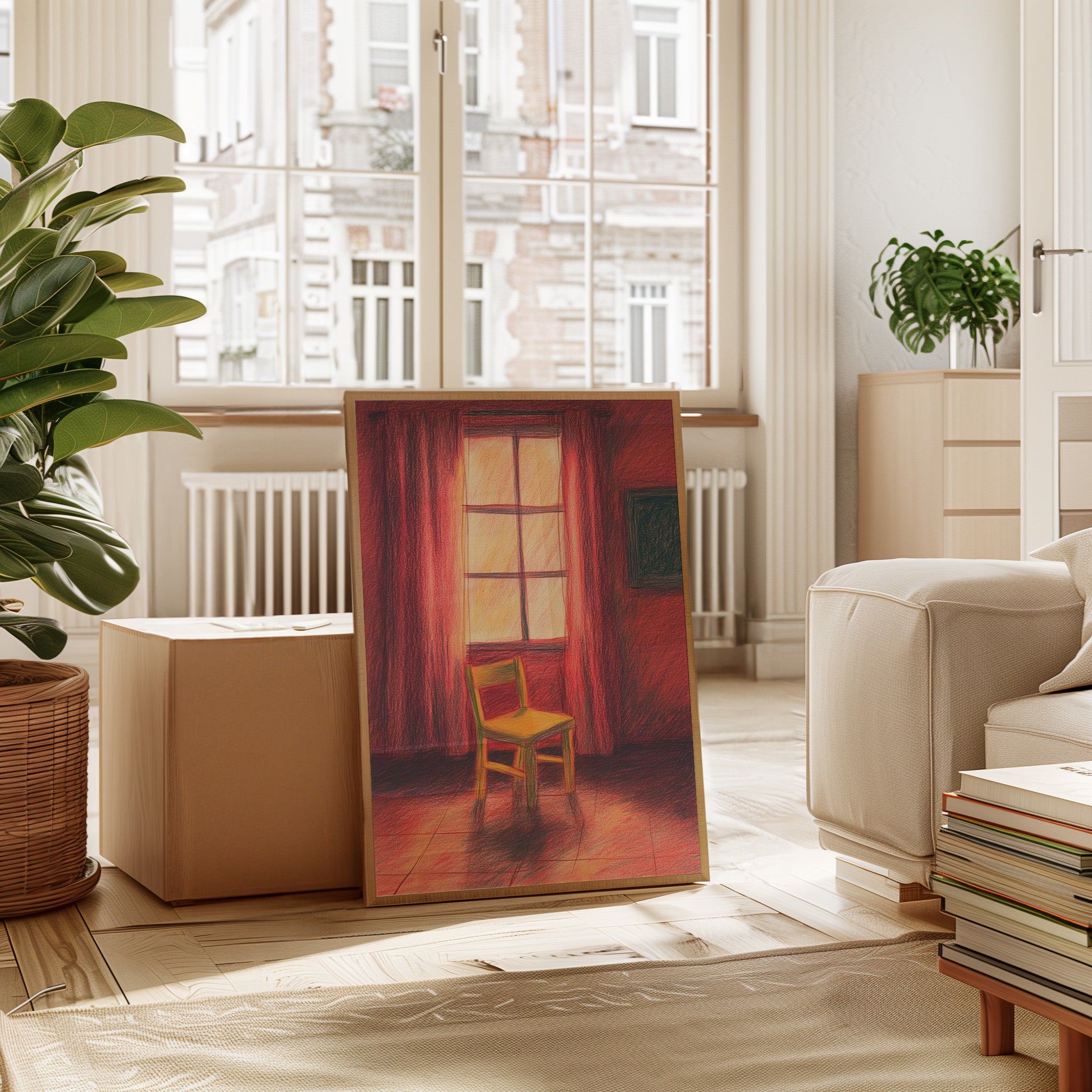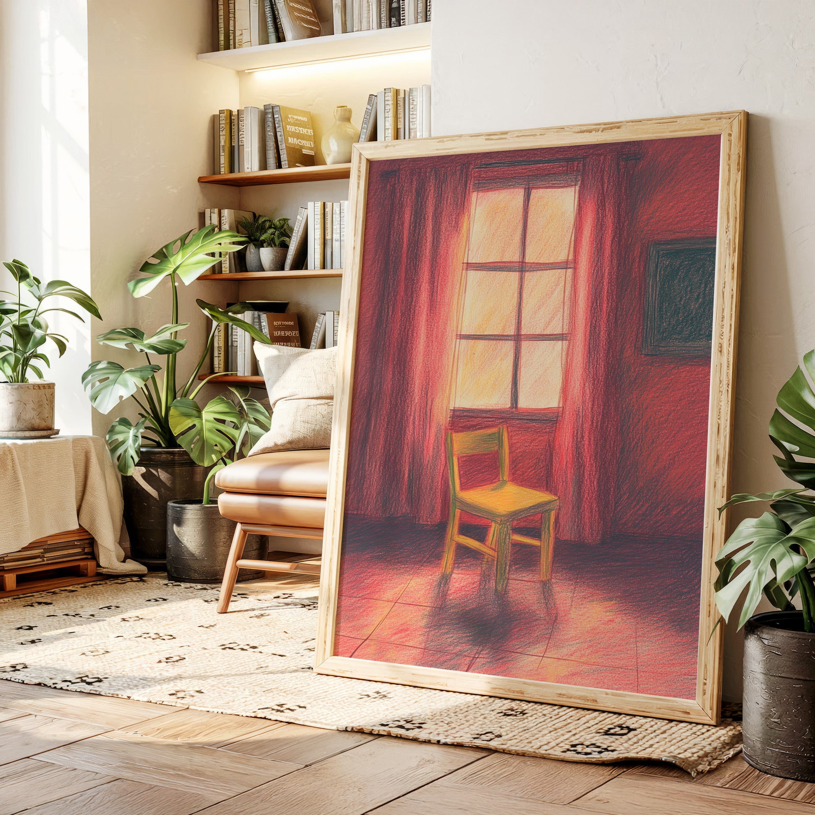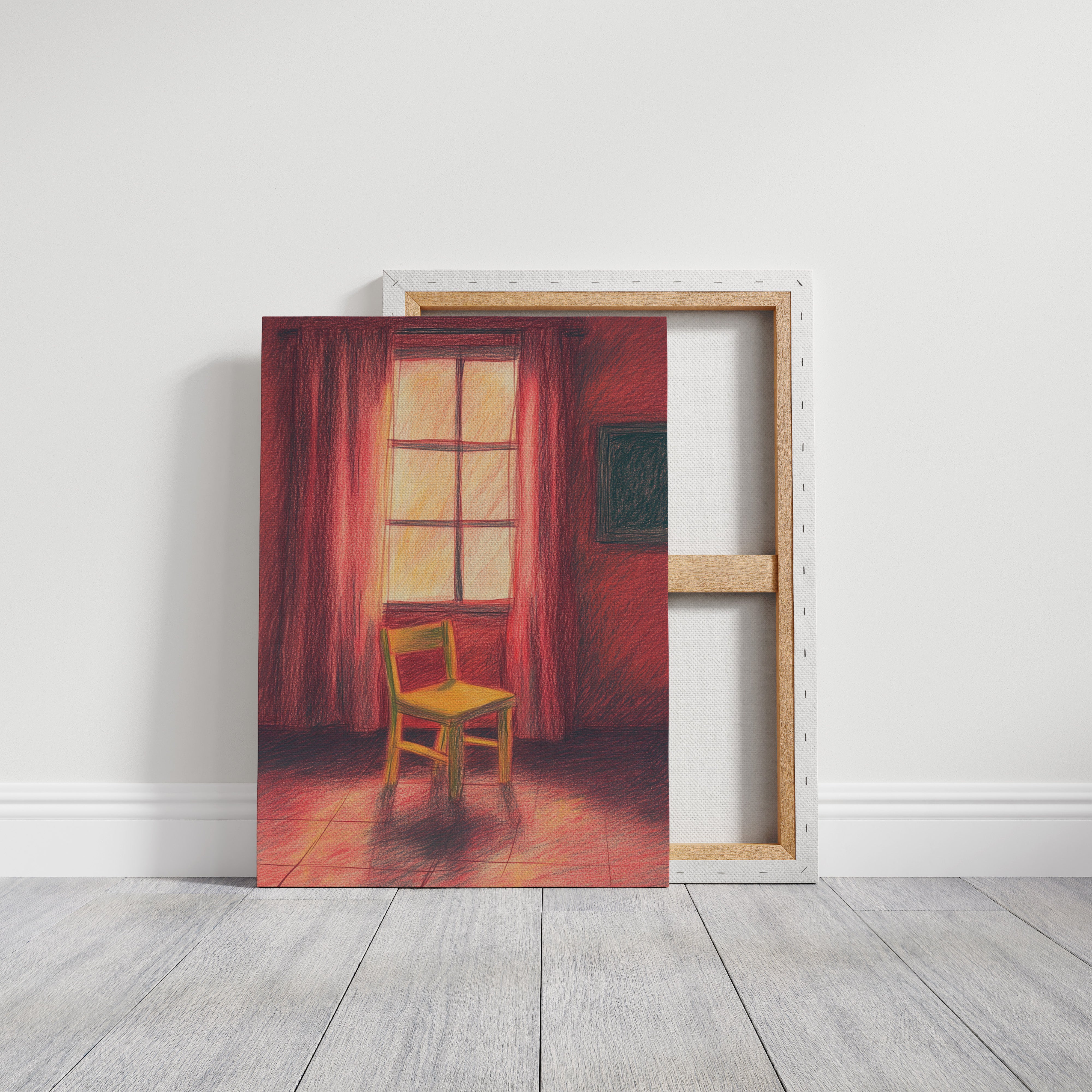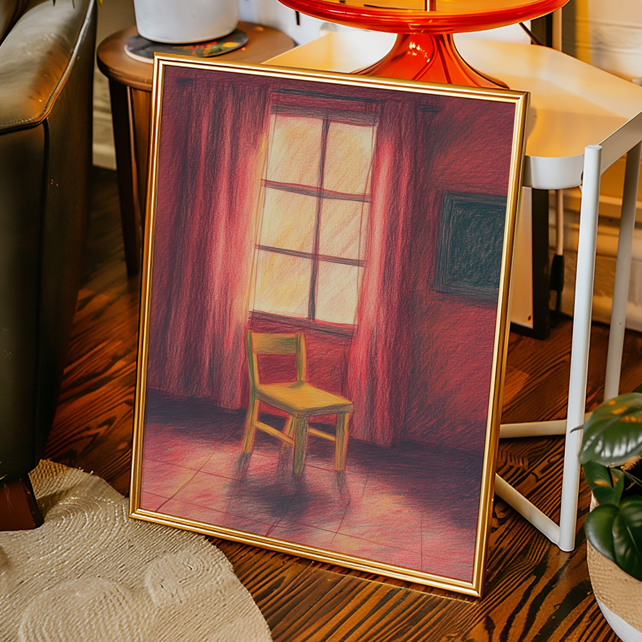 A single wooden chair stands sentinel in a room awash with deep crimson hues, catching the warm glow of unseen sunset. The scene speaks of quiet contemplation, where time seems to pause between day and evening. Rich burgundy curtains frame a luminous window, casting long shadows across the tiled floor while creating an intimate sanctuary of light and color. This contemplative piece invites viewers into a moment of peaceful solitude, where the ordinary transforms into the extraordinary through careful observation.