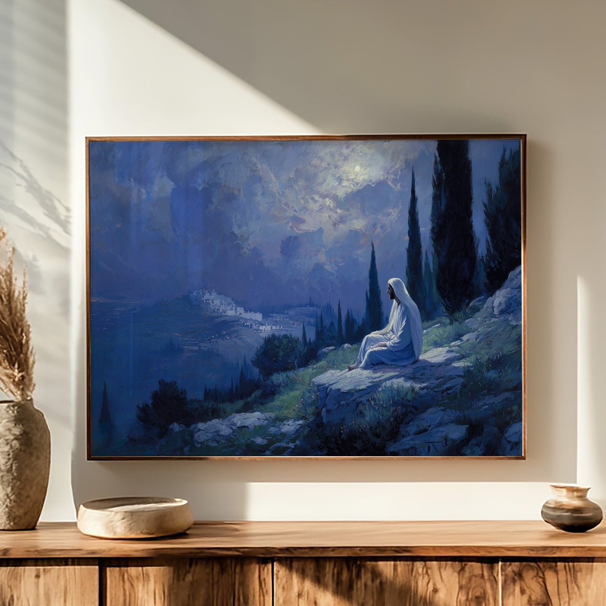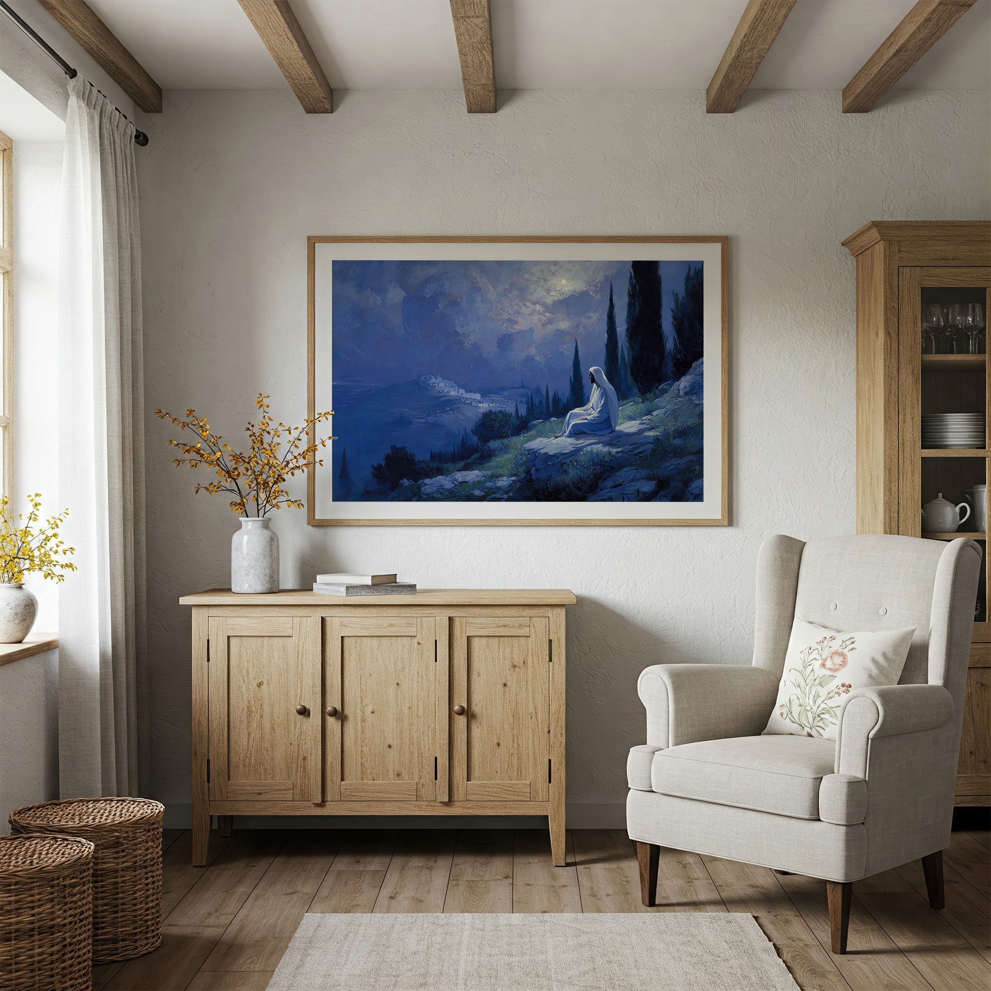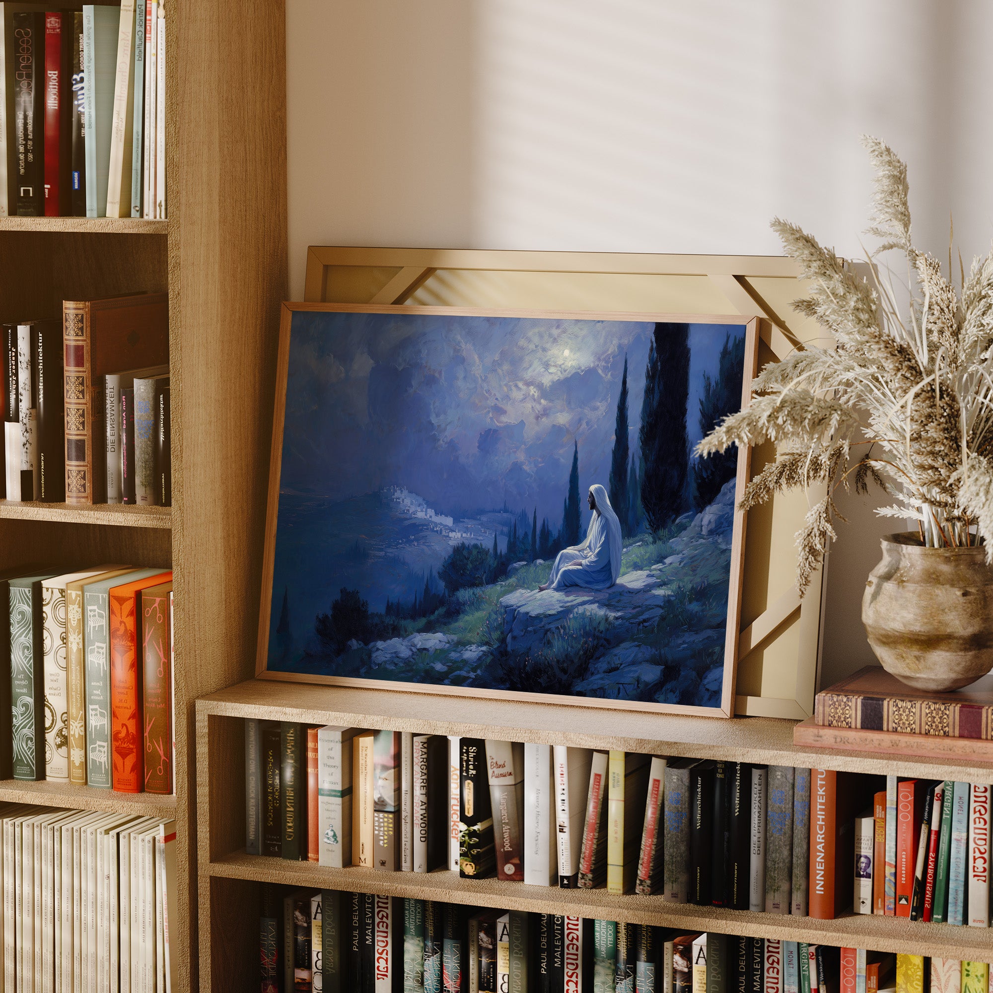 Moonlight bathes the landscape in ethereal blue, creating a sanctuary of stillness where time seems suspended. A solitary figure draped in white contemplates the distant valley view, surrounded by the sentinel-like cypress trees reaching toward the night sky. The painting captures that profound moment between dusk and darkness, where the world feels both vast and intimate at once. This tranquil scene finds perfect harmony nestled among books and dried pampas grass, creating a thoughtful focal point for a reading nook or study.
