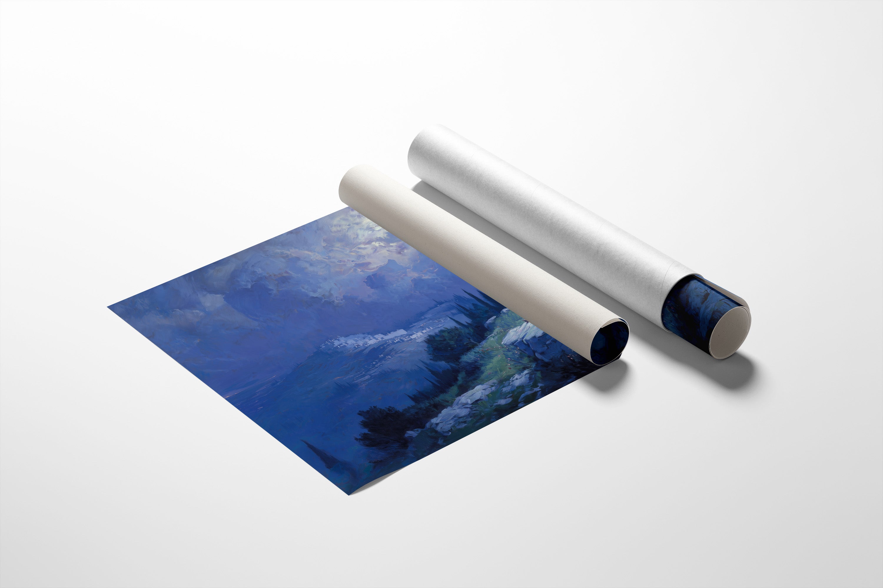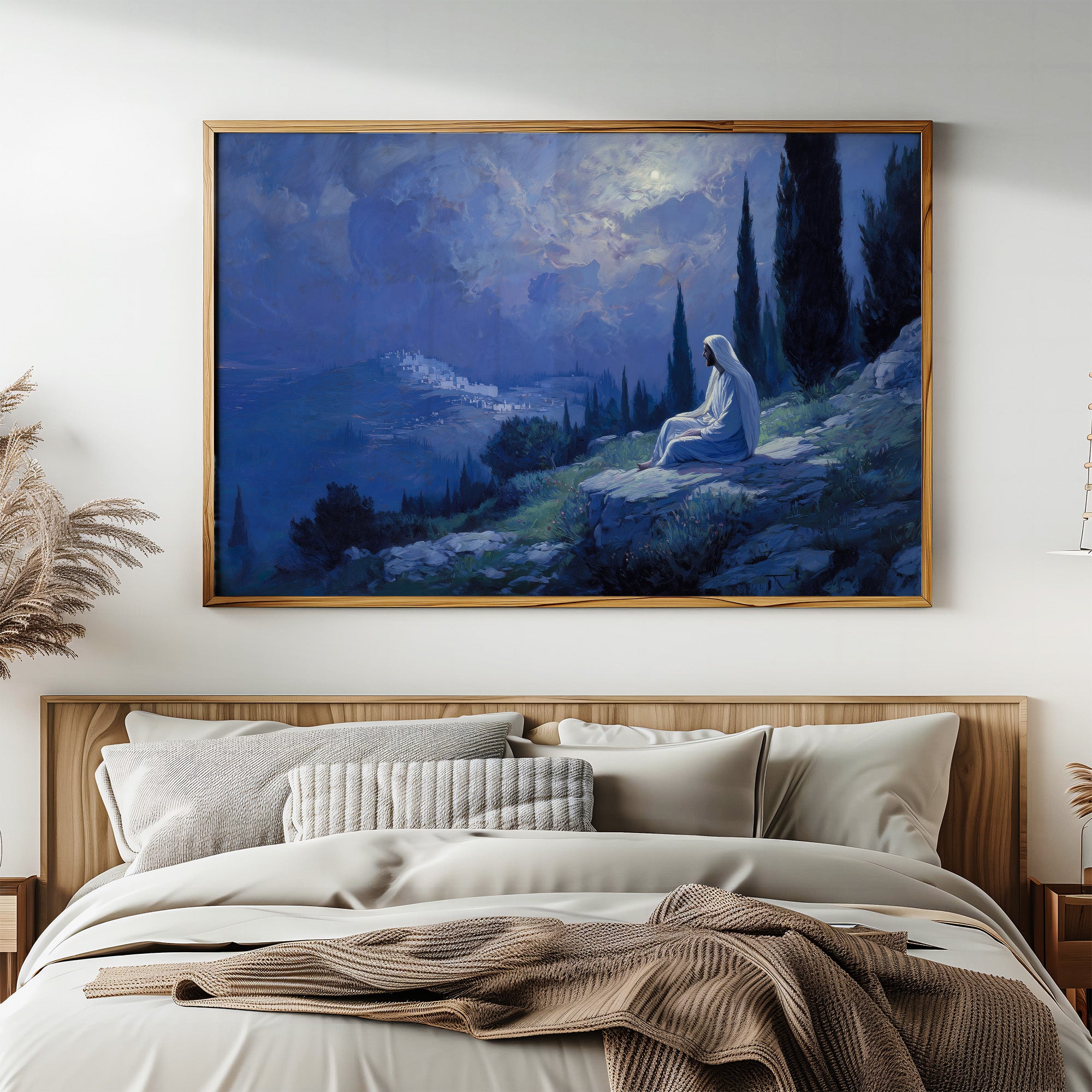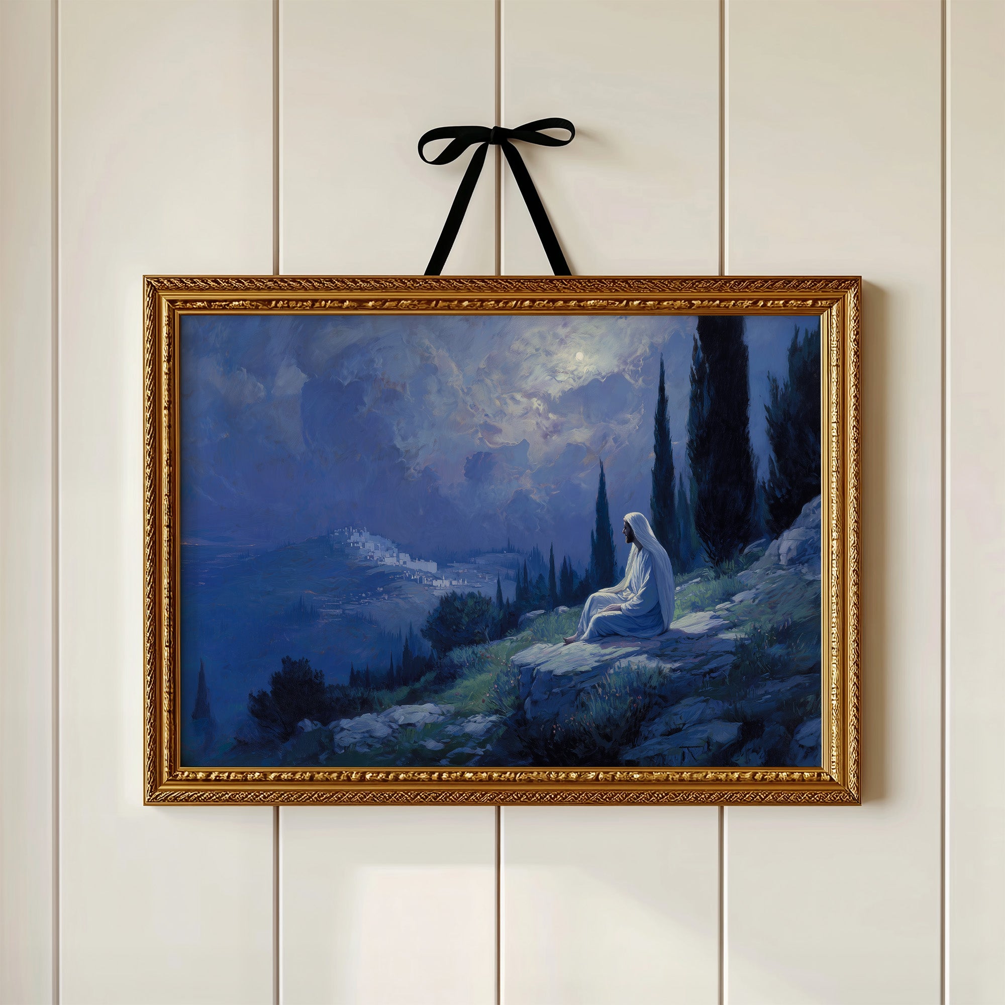 Moonlight bathes the landscape in ethereal blue, creating a sanctuary of stillness where time seems suspended. A solitary figure draped in white contemplates the distant valley view, surrounded by the sentinel-like cypress trees reaching toward the night sky. The painting captures that profound moment between dusk and darkness, where the world feels both vast and intimate at once. This tranquil scene finds perfect harmony nestled among books and dried pampas grass, creating a thoughtful focal point for a reading nook or study.