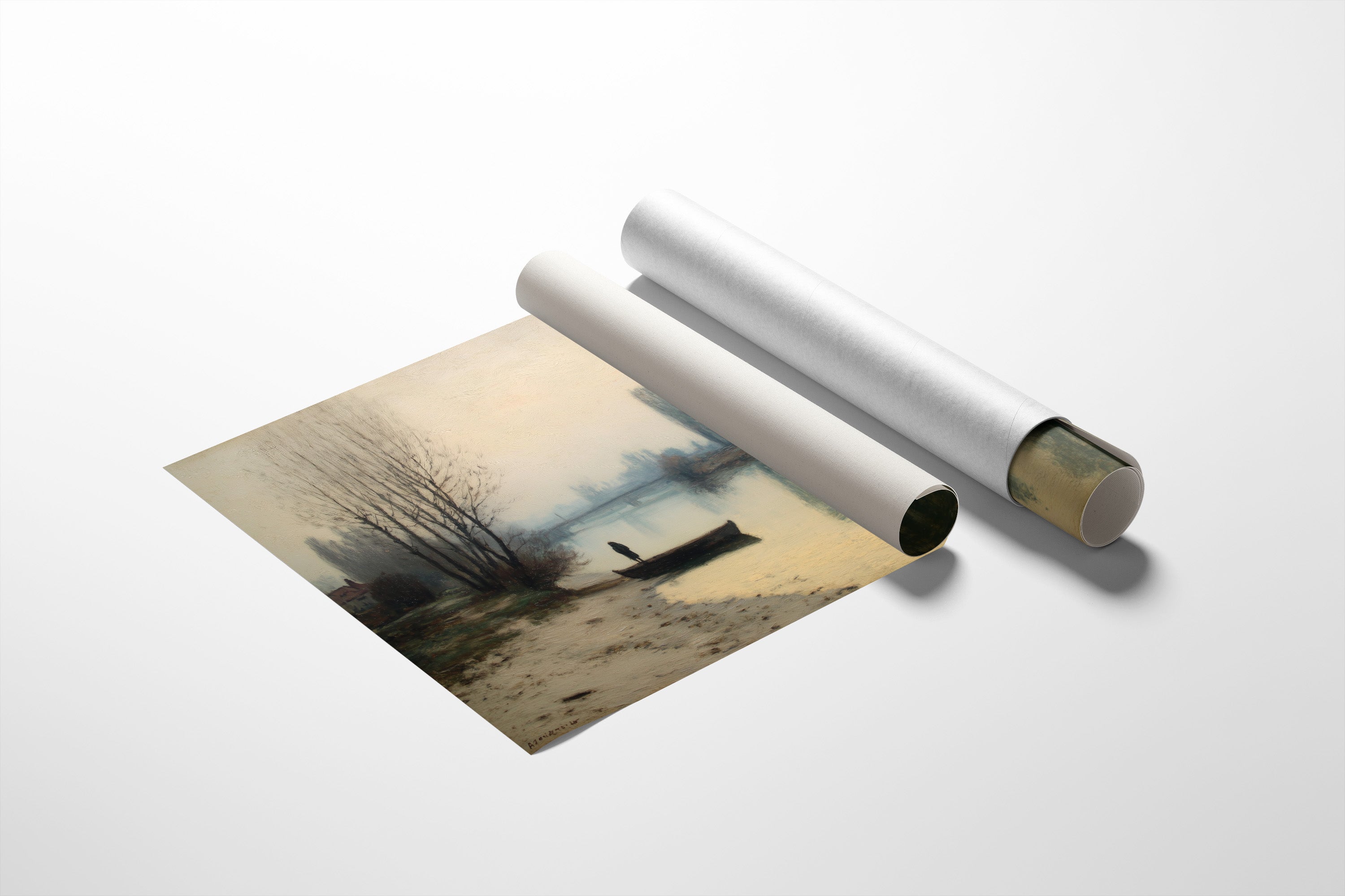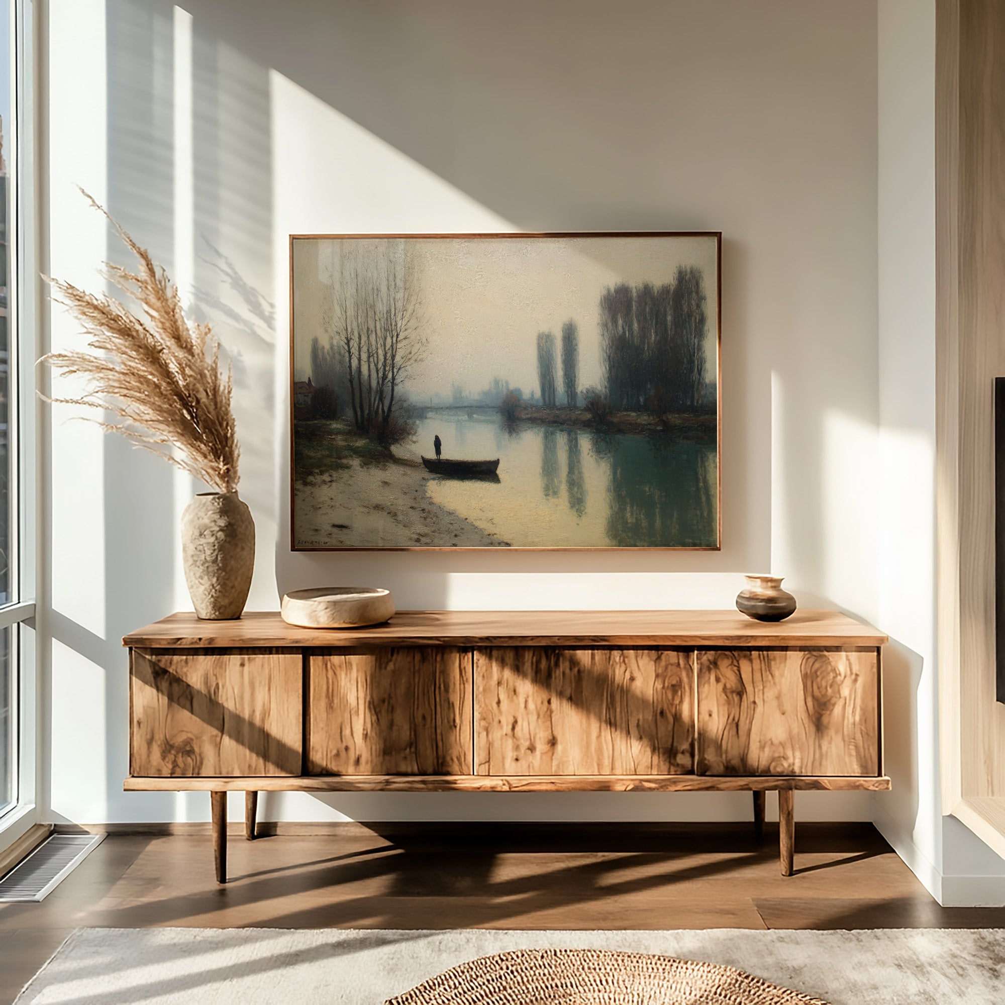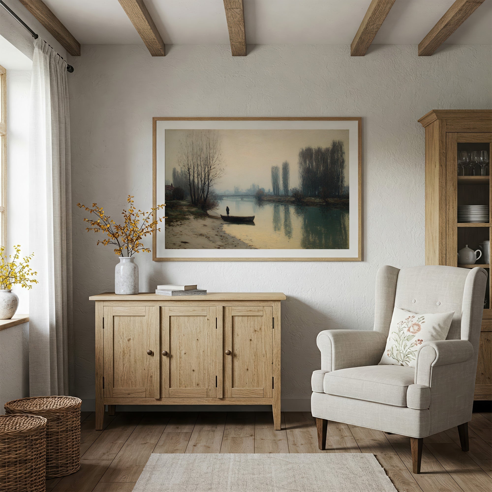 Morning fog hangs suspended over still waters, creating a sense of timeless solitude. A lone figure stands beside a boat on the shoreline, contemplating the ethereal landscape where bare trees rise like sentinels against the hazy horizon. The muted palette of blues and grays creates a dreamy atmosphere, evoking feelings of peaceful melancholy and quiet reflection. This contemplative piece brings serene sophistication to a reading nook, study, or any space where you seek moments of tranquility.