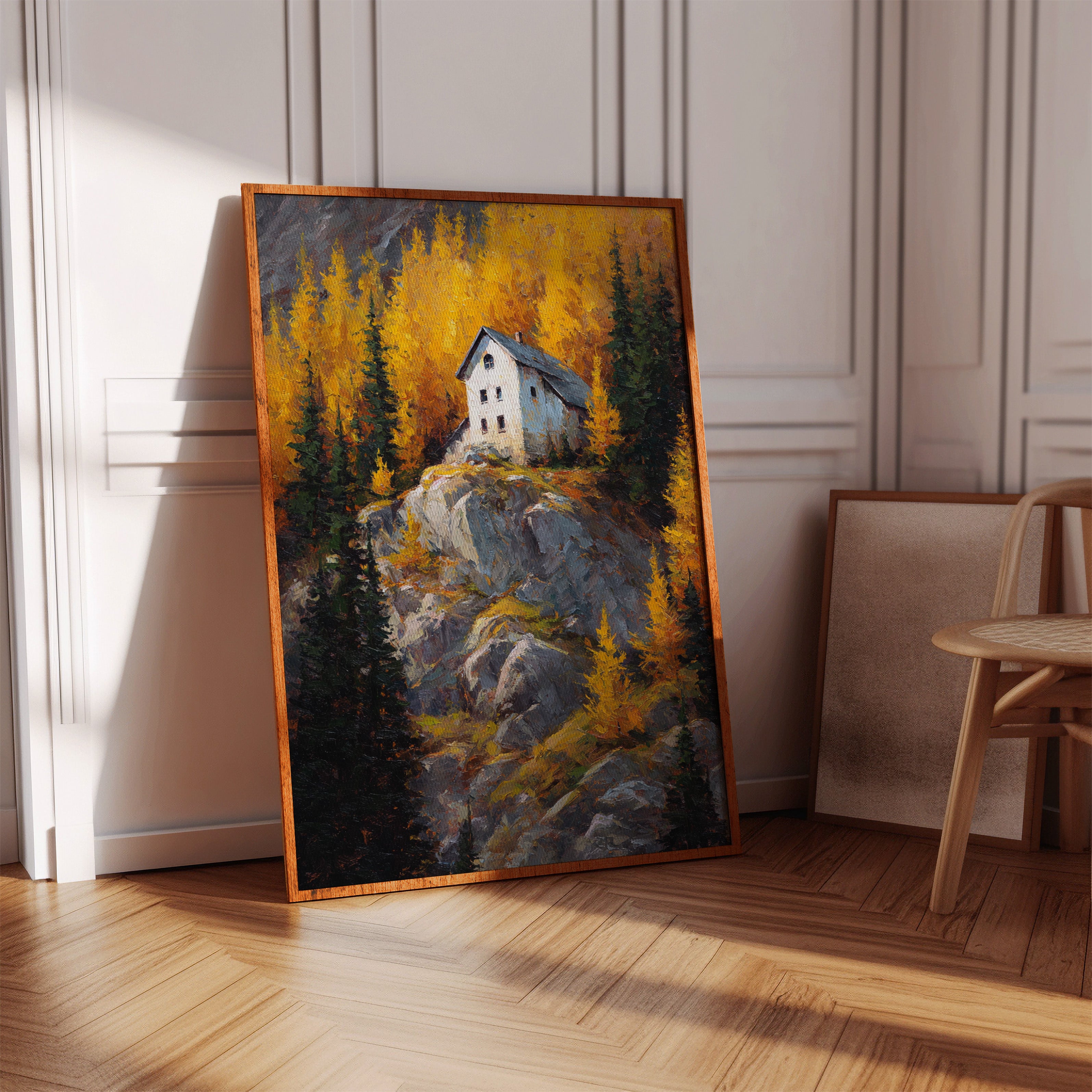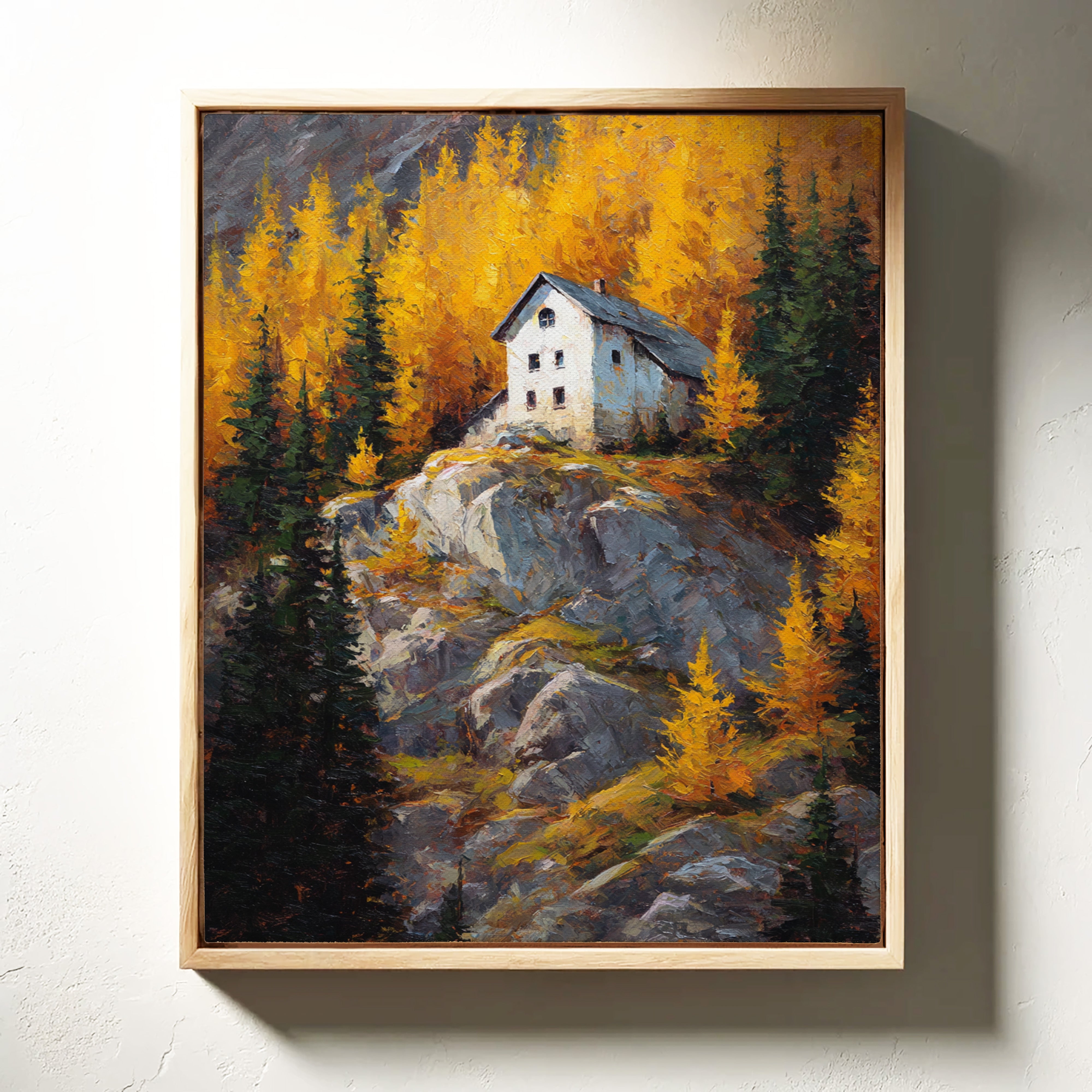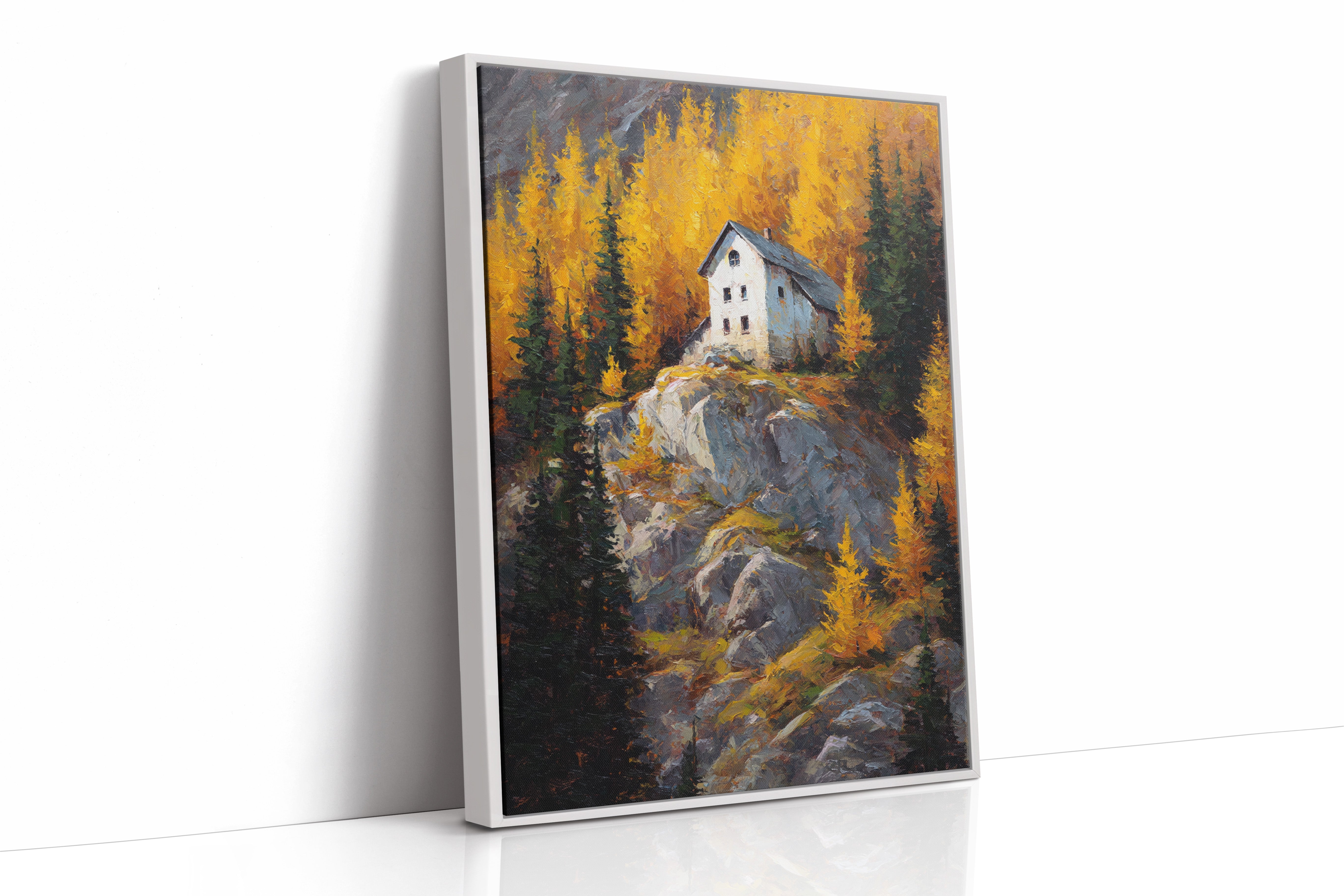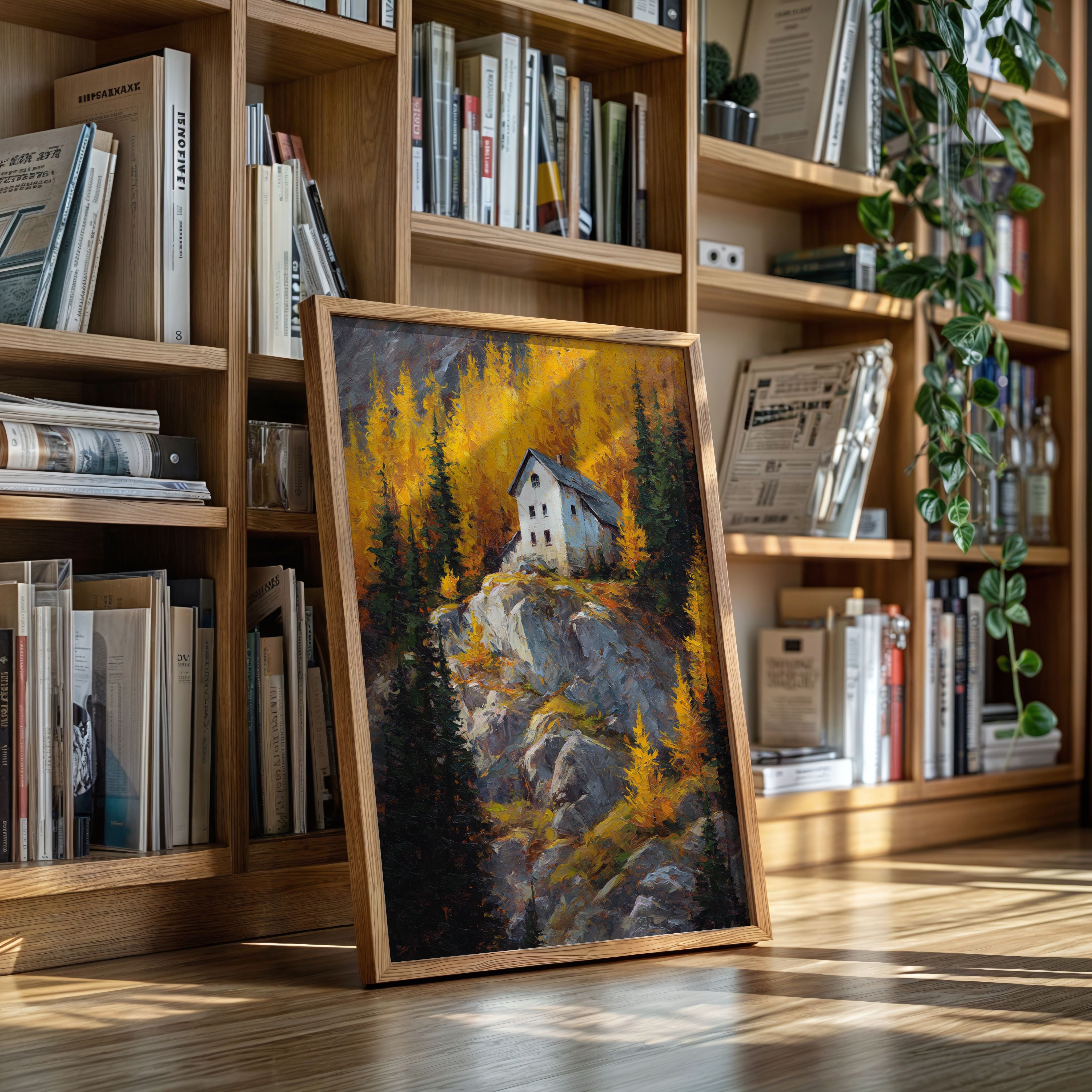 A lone white house perches defiantly atop a rugged granite cliff, surrounded by a blazing display of autumn aspens. The dramatic contrast between the stark architecture and nature's wild palette creates a compelling narrative of isolation and beauty. Thick impasto brushstrokes capture the texture of weathered rock and dancing foliage, while the house stands as a silent sentinel against the untamed landscape. This piece would create a stunning focal point in a mountain home's great room or add dramatic flair to a contemporary urban loft seeking to capture the majesty of alpine wilderness.