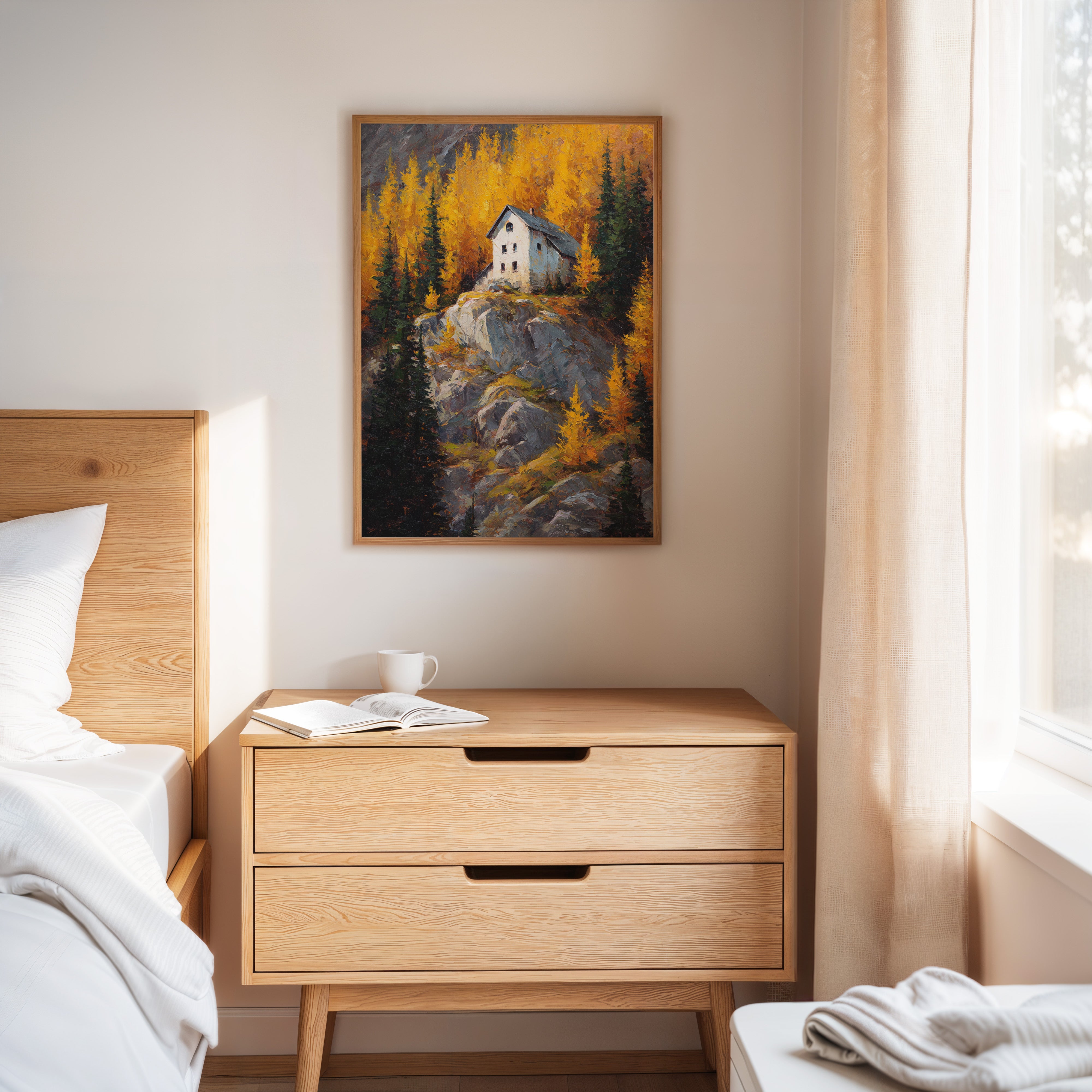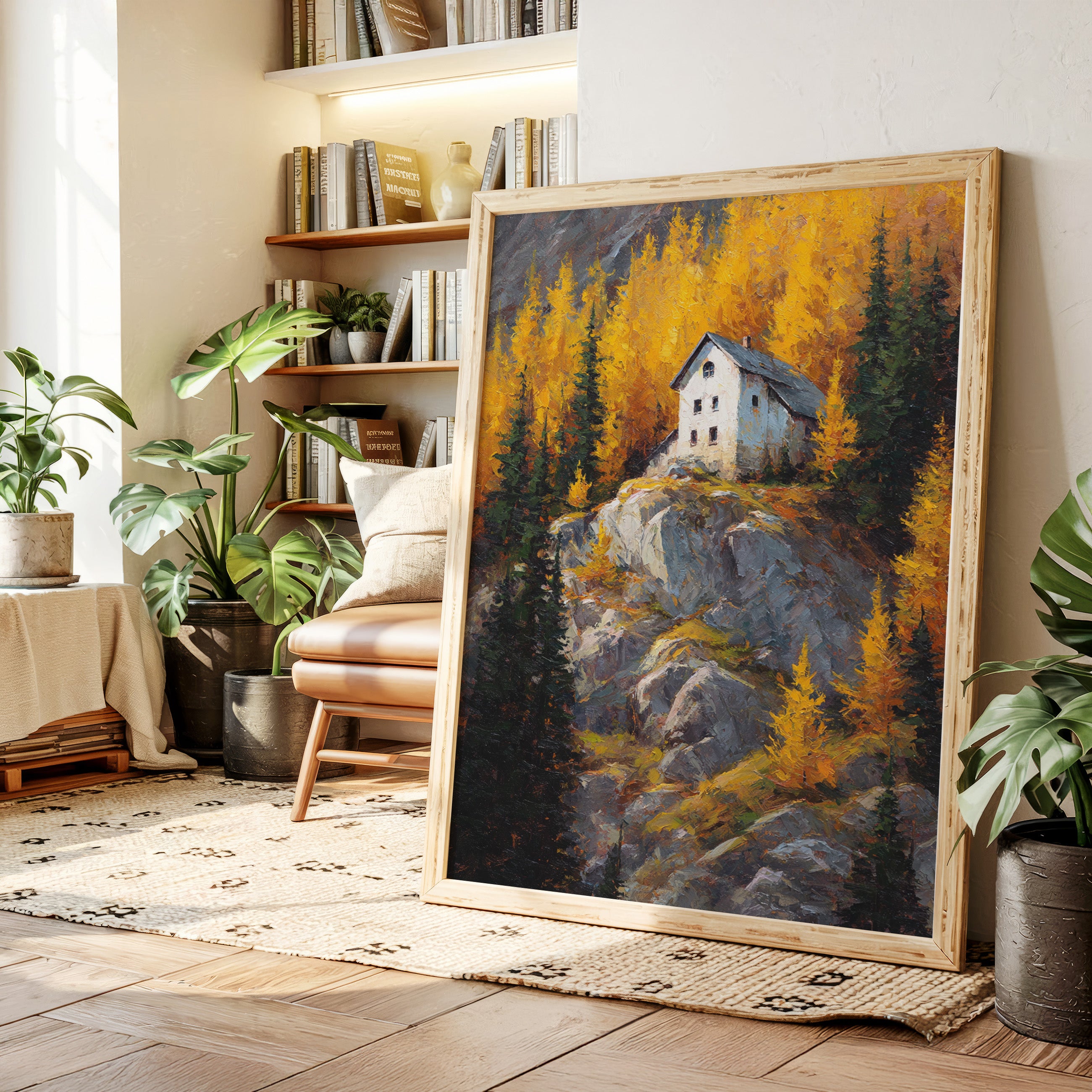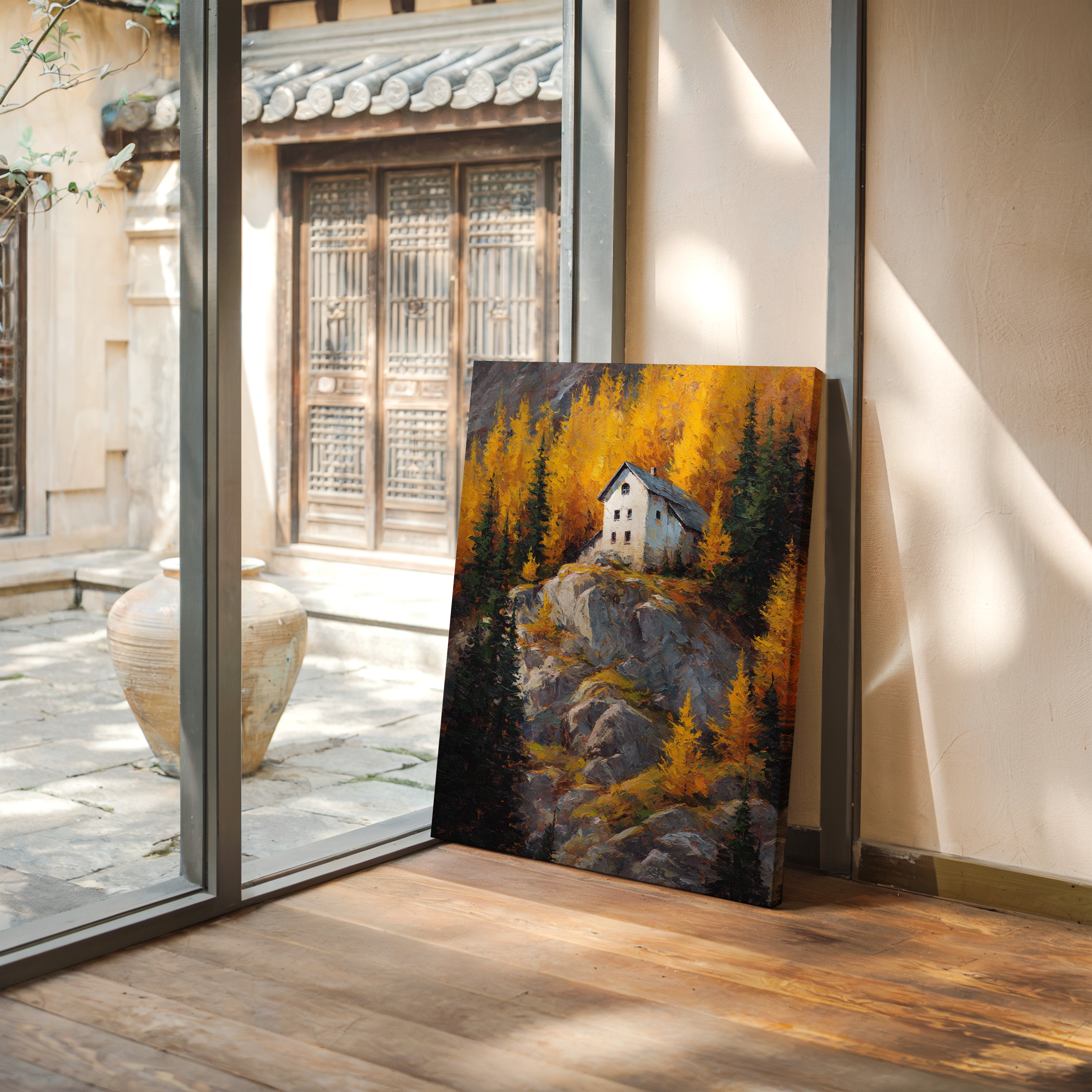 A lone white house perches defiantly atop a rugged granite cliff, surrounded by a blazing display of autumn aspens. The dramatic contrast between the stark architecture and nature's wild palette creates a compelling narrative of isolation and beauty. Thick impasto brushstrokes capture the texture of weathered rock and dancing foliage, while the house stands as a silent sentinel against the untamed landscape. This piece would create a stunning focal point in a mountain home's great room or add dramatic flair to a contemporary urban loft seeking to capture the majesty of alpine wilderness.