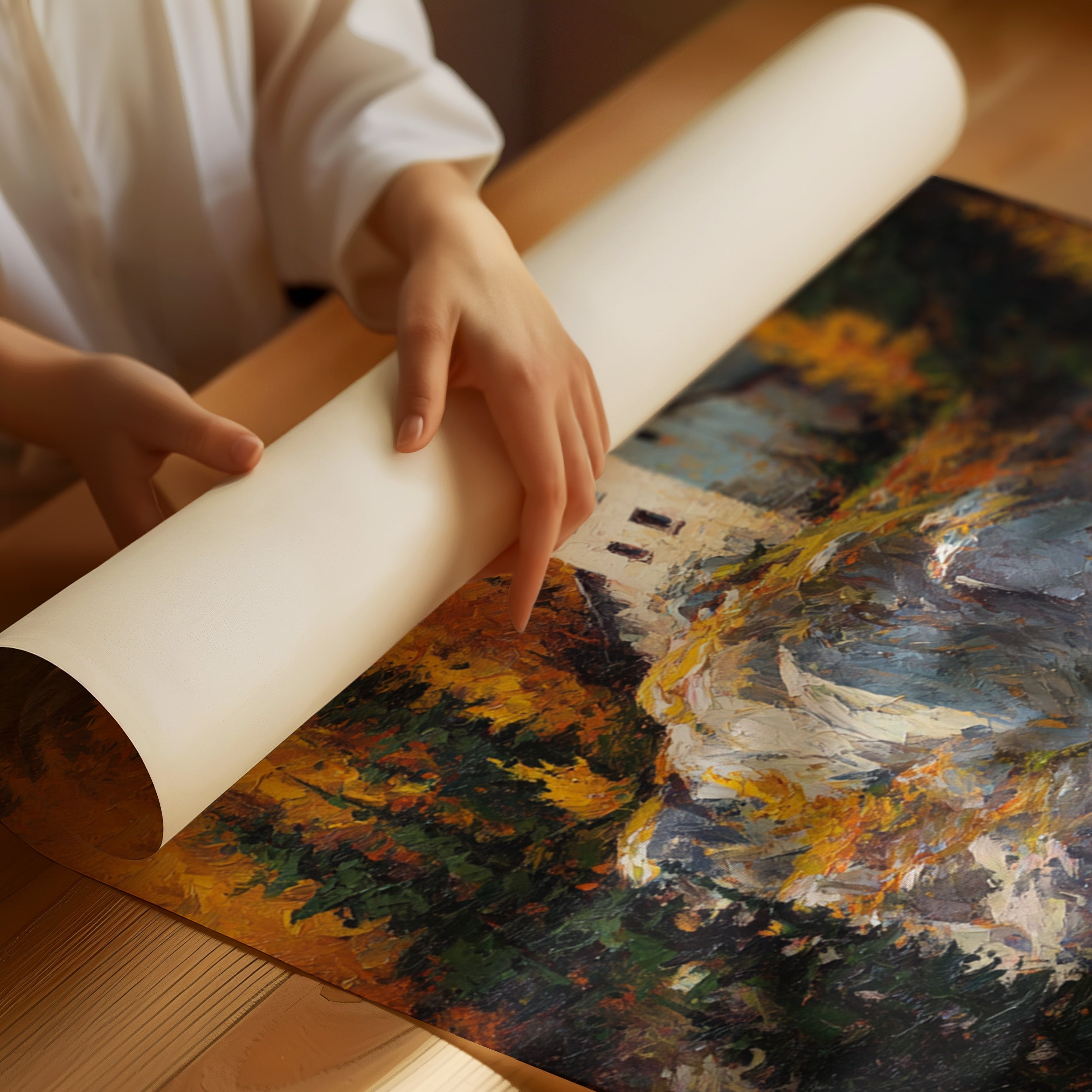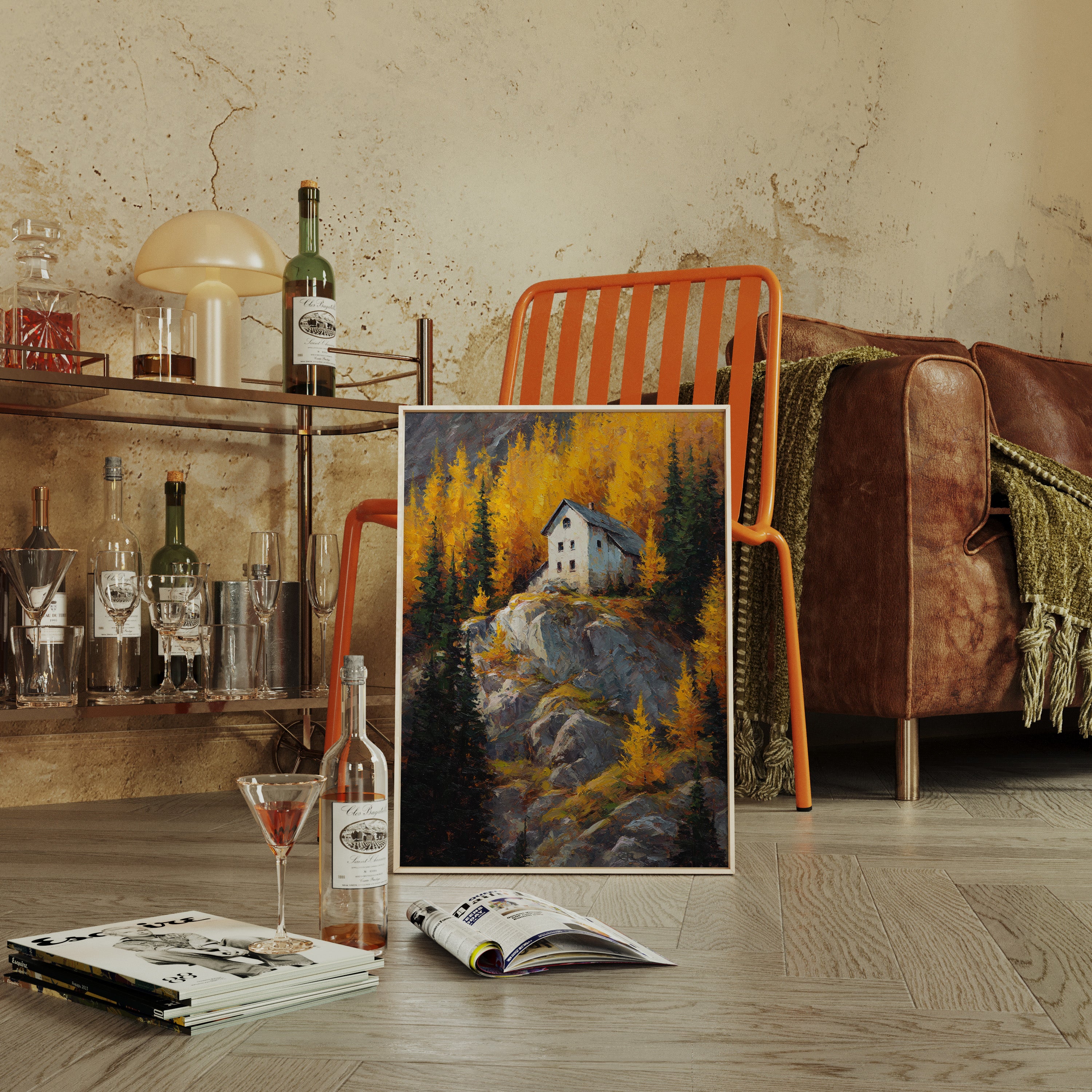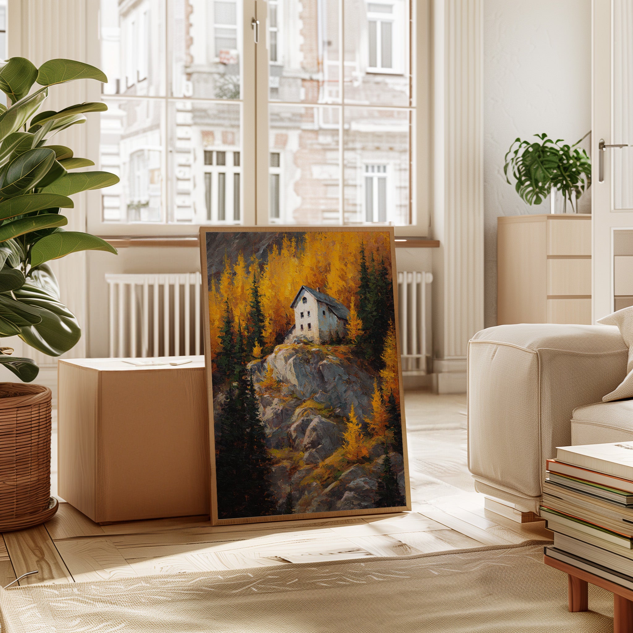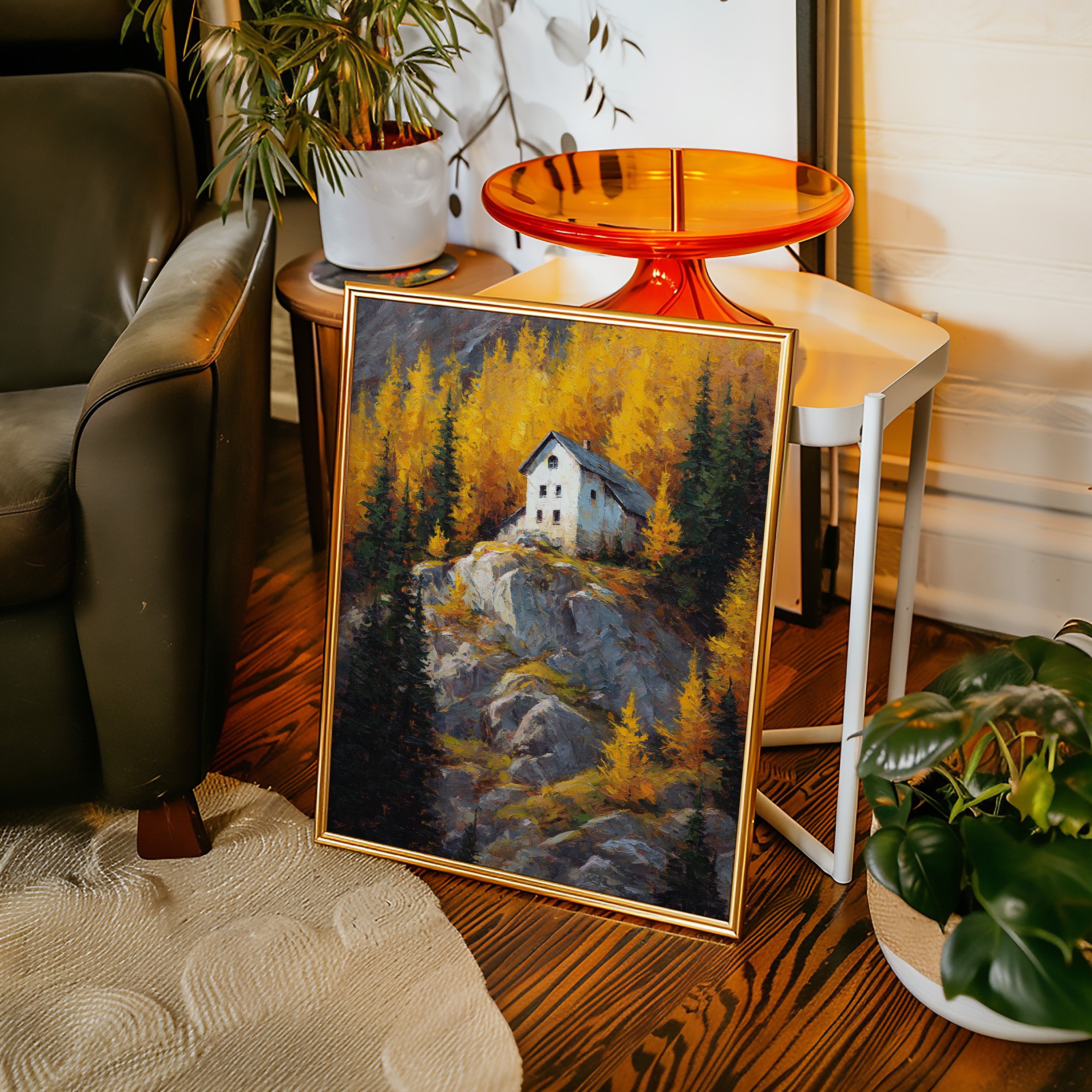 A lone white house perches defiantly atop a rugged granite cliff, surrounded by a blazing display of autumn aspens. The dramatic contrast between the stark architecture and nature's wild palette creates a compelling narrative of isolation and beauty. Thick impasto brushstrokes capture the texture of weathered rock and dancing foliage, while the house stands as a silent sentinel against the untamed landscape. This piece would create a stunning focal point in a mountain home's great room or add dramatic flair to a contemporary urban loft seeking to capture the majesty of alpine wilderness.