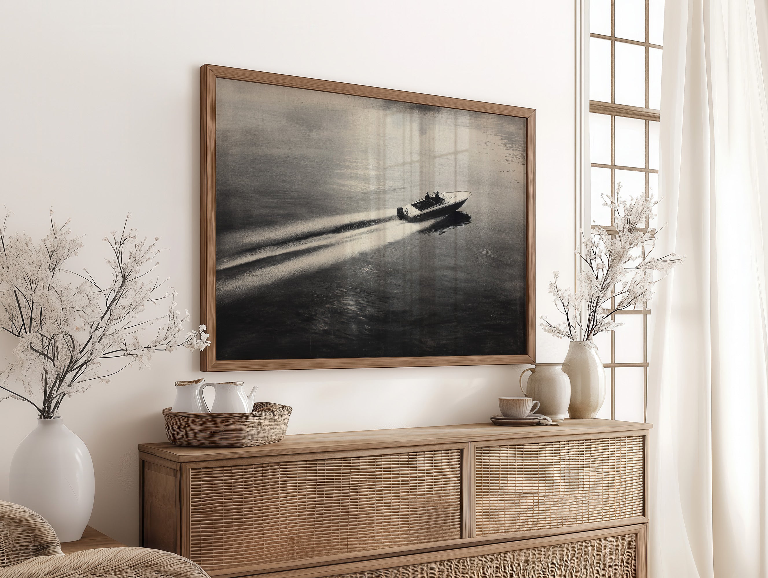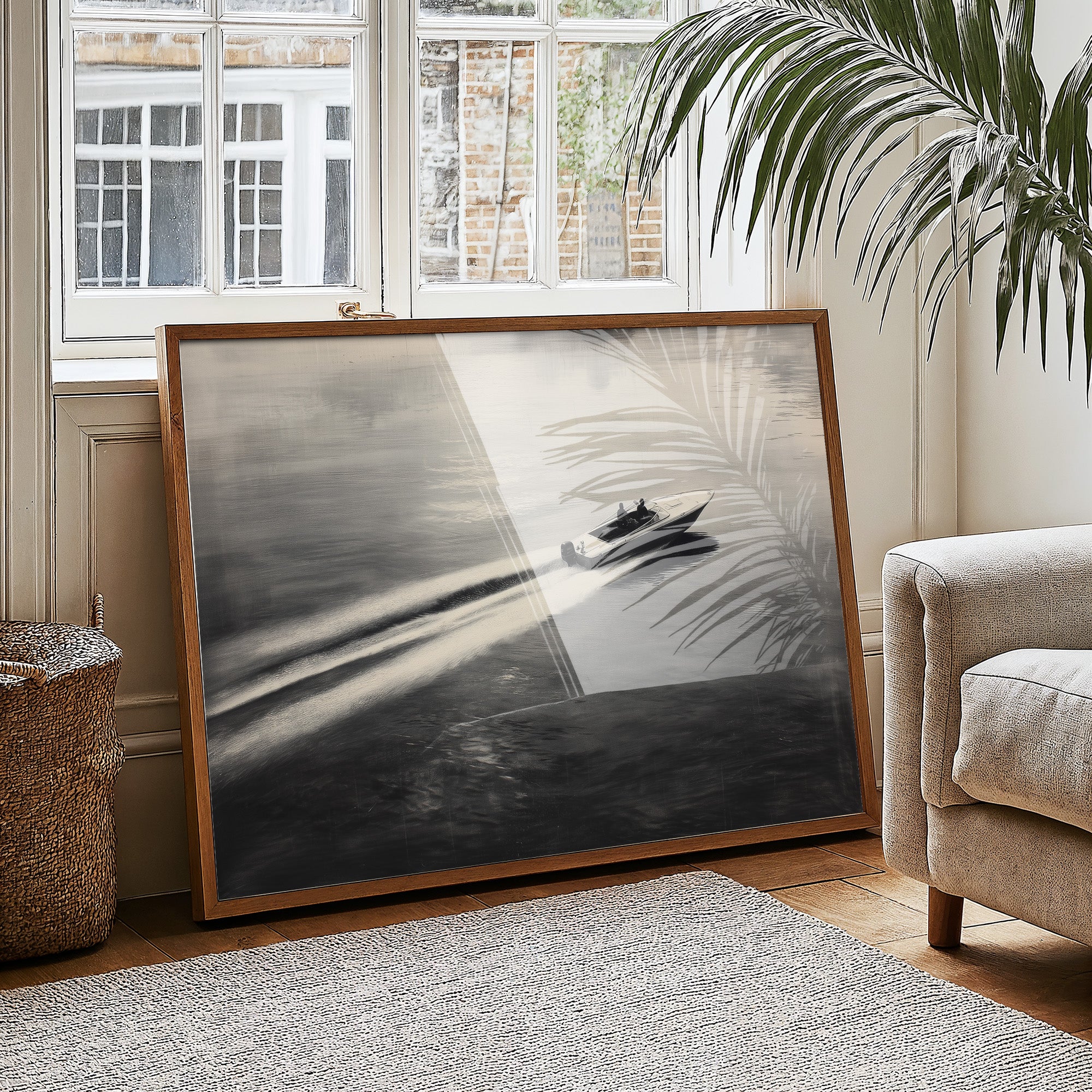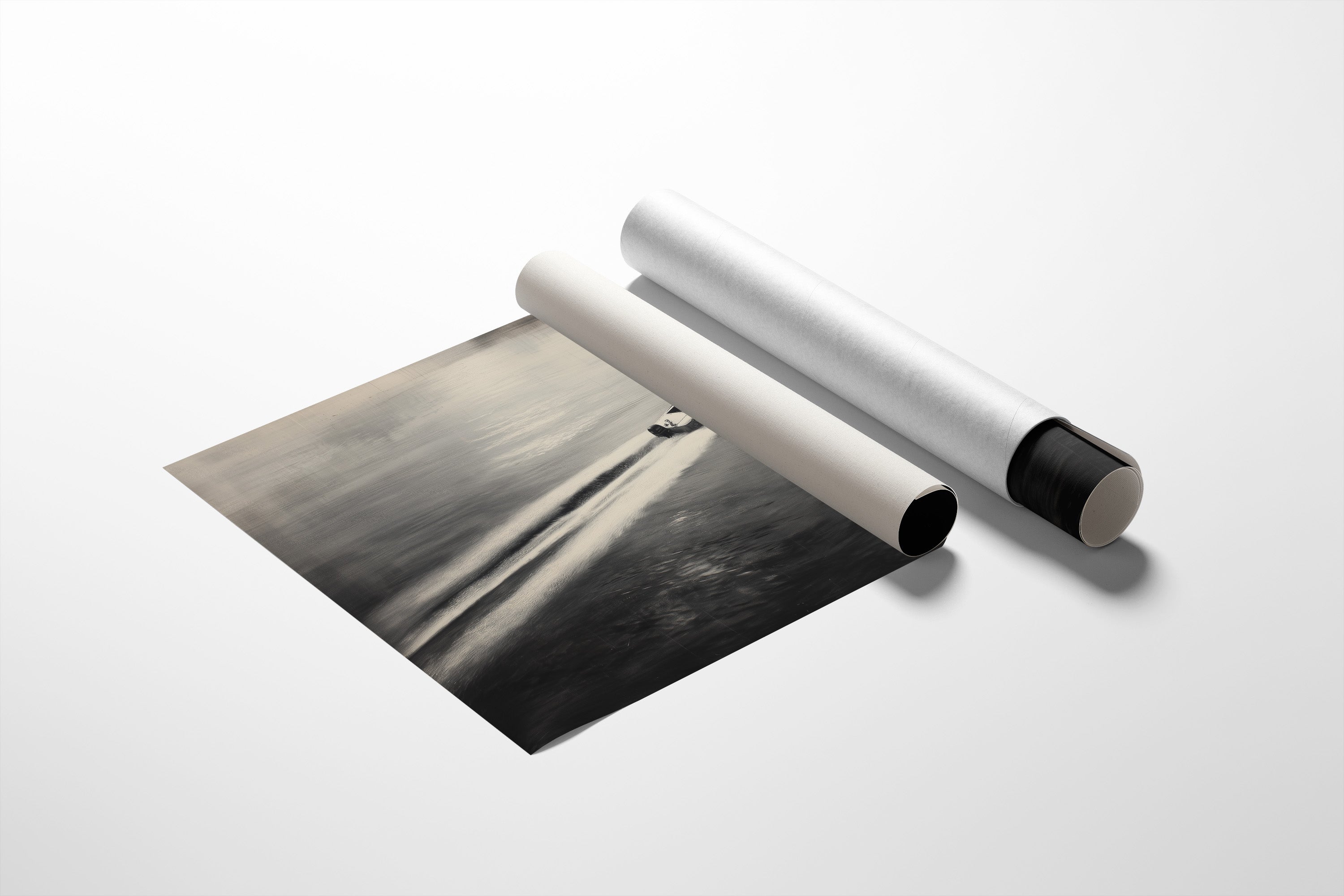 A lone boat slices through the misty waters, leaving elegant ripples in its monochromatic wake. The photograph captures that fleeting moment between departure and destination, where time seems suspended in silvery stillness. Soft gradients of gray create a dreamlike quality, as if this journey exists somewhere between memory and reality. This contemplative piece invites viewers to imagine their own story of where the vessel might be heading across these tranquil waters. This striking black and white photography would bring sophisticated drama to a coastal home study, minimalist living room, or any space where you seek to evoke feelings of peaceful solitude and adventure.