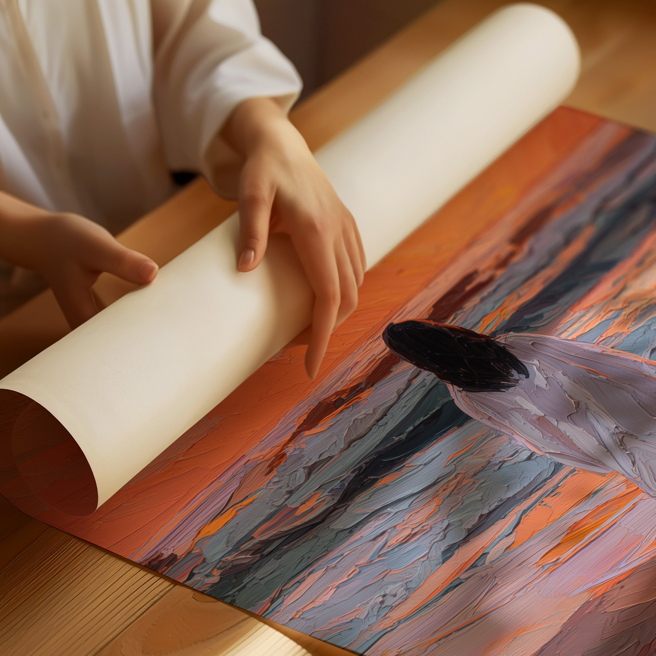 A moment of perfect stillness where time suspends itself between day and night. Thick brushstrokes capture a solitary figure in white, standing at the edge of waves painted in deep blues and reflective corals. The textured impasto technique creates a tangible depth to the sunset scene, where each layer of paint builds the story of contemplation against nature's most spectacular daily performance. This piece brings tranquil energy to living rooms and bedrooms where moments of reflection are treasured.