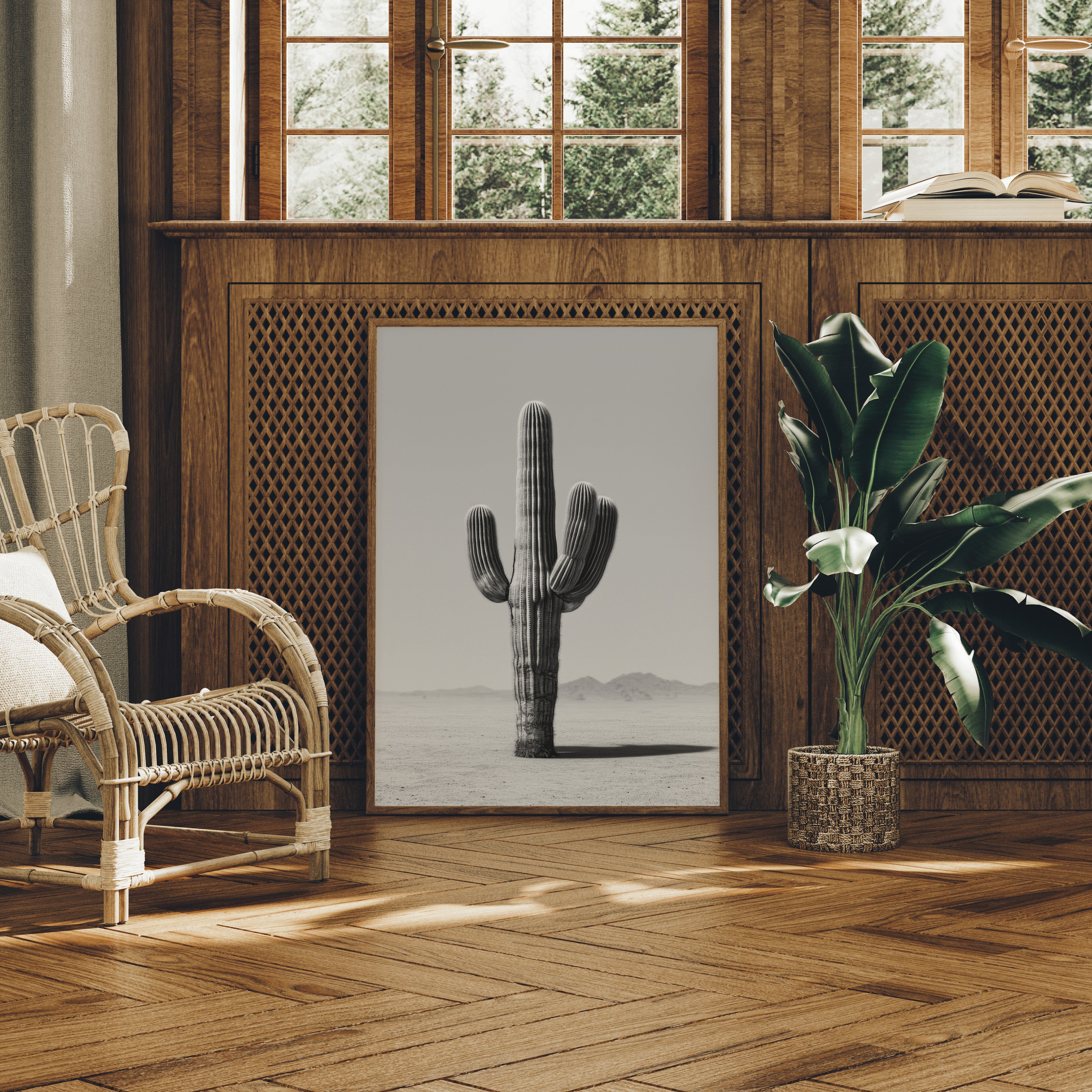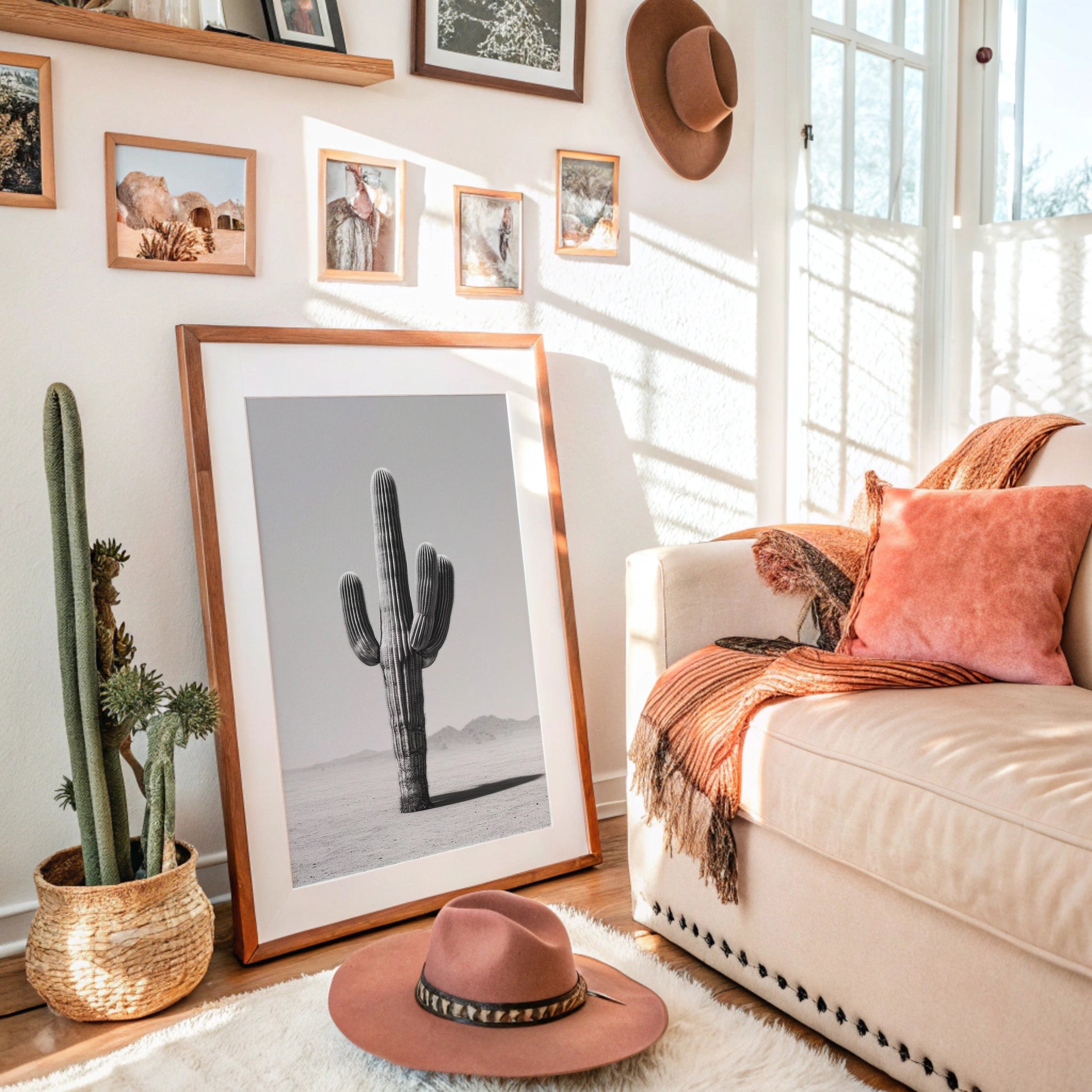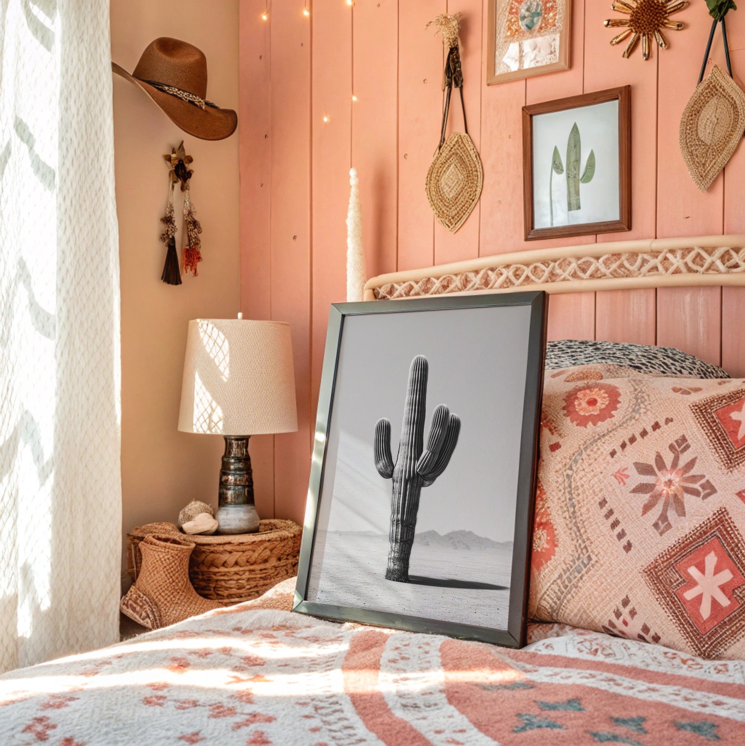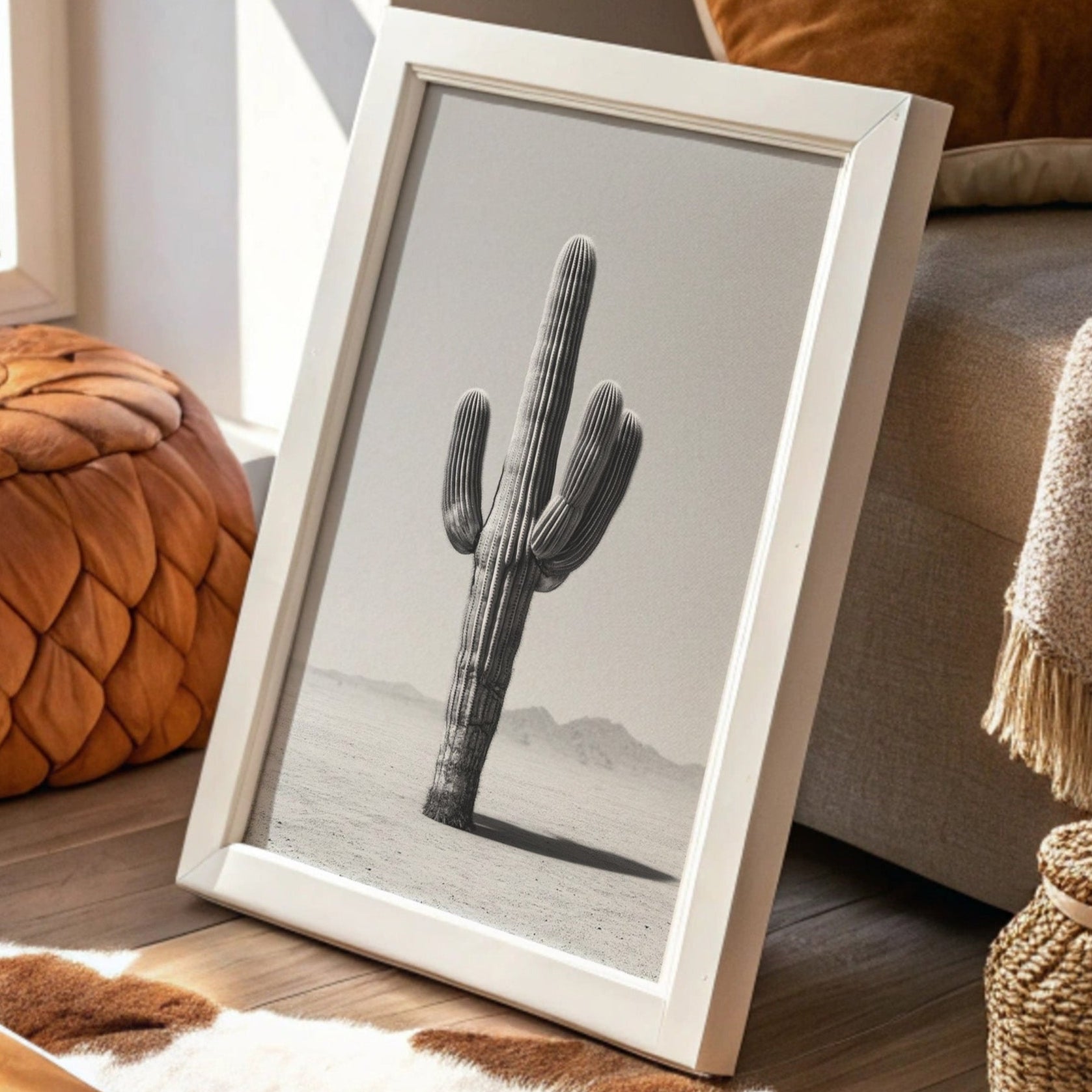 This minimalist black-and-white artwork captures the stark elegance of a lone saguaro cactus rising from the desert floor. Standing tall and unyielding against the horizon, the cactus becomes a timeless symbol of resilience, solitude, and quiet strength. The muted tones and simple composition create a calming atmosphere, making this piece a striking addition to modern, bohemian, or southwestern-inspired spaces. Whether displayed in a living room, bedroom, or office, it invites reflection on endurance and the beauty of simplicity.
