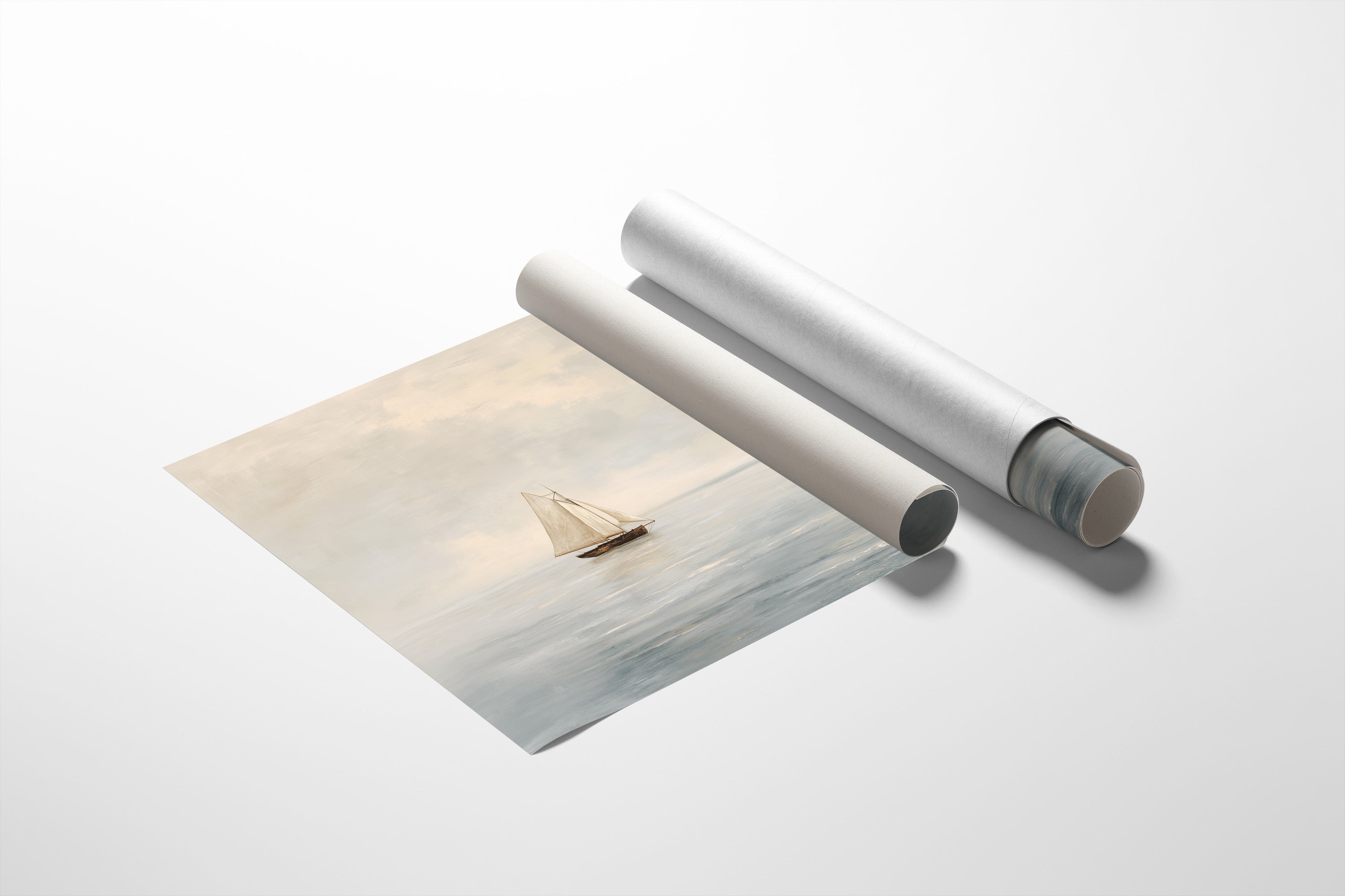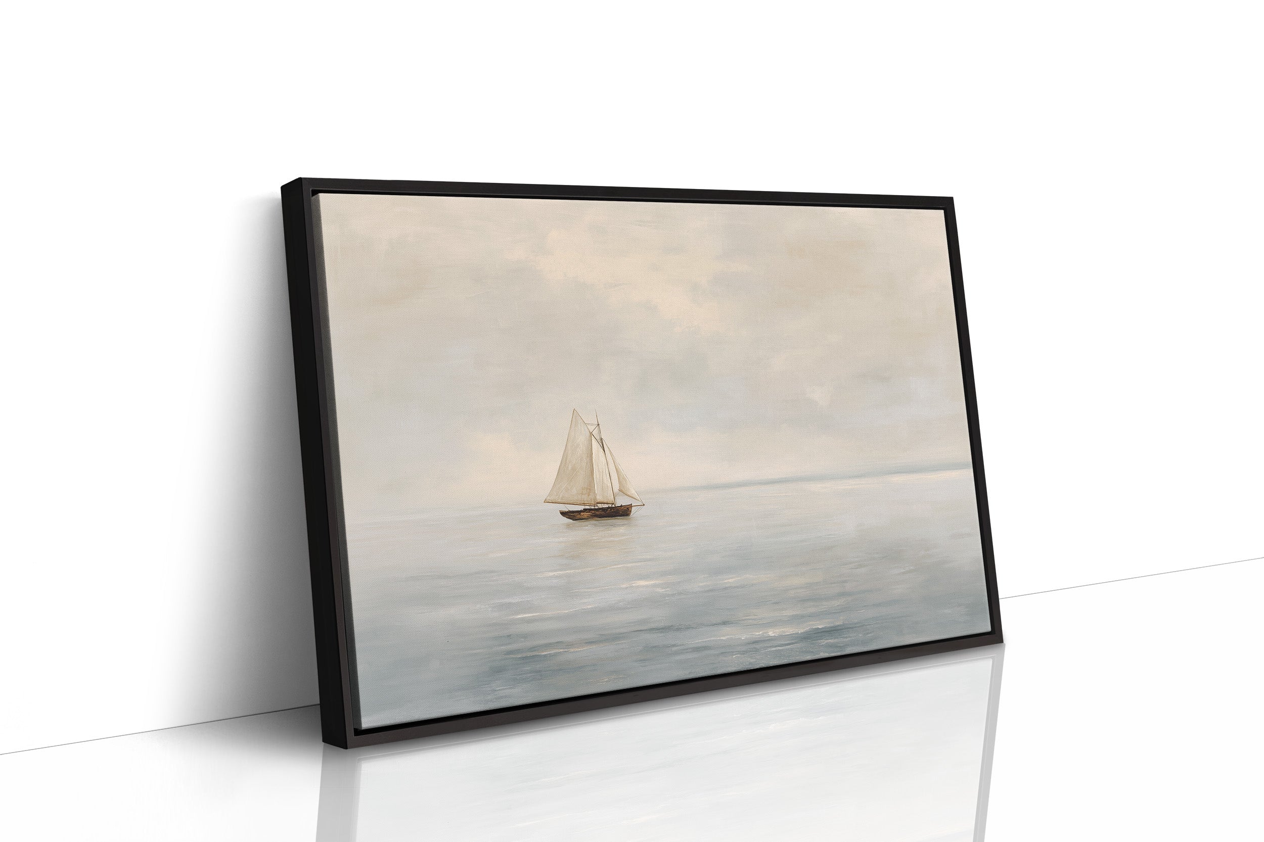 A minimalist maritime painting capturing the serene solitude of a single sailboat adrift on calm waters. The composition features a delicate balance of negative space, with the small vessel centered against an expansive, misty seascape. Soft, muted tones of ivory, cream, and pale blue create an ethereal atmosphere, while the billowing white sails catch what little light filters through the hazy sky. The horizon line blurs gently between sea and clouds, suggesting either dawn or dusk, enhancing the dreamlike quality of this contemplative scene. The painting evokes feelings of peaceful isolation, quiet adventure, and the timeless relationship between humanity and the vast open sea.