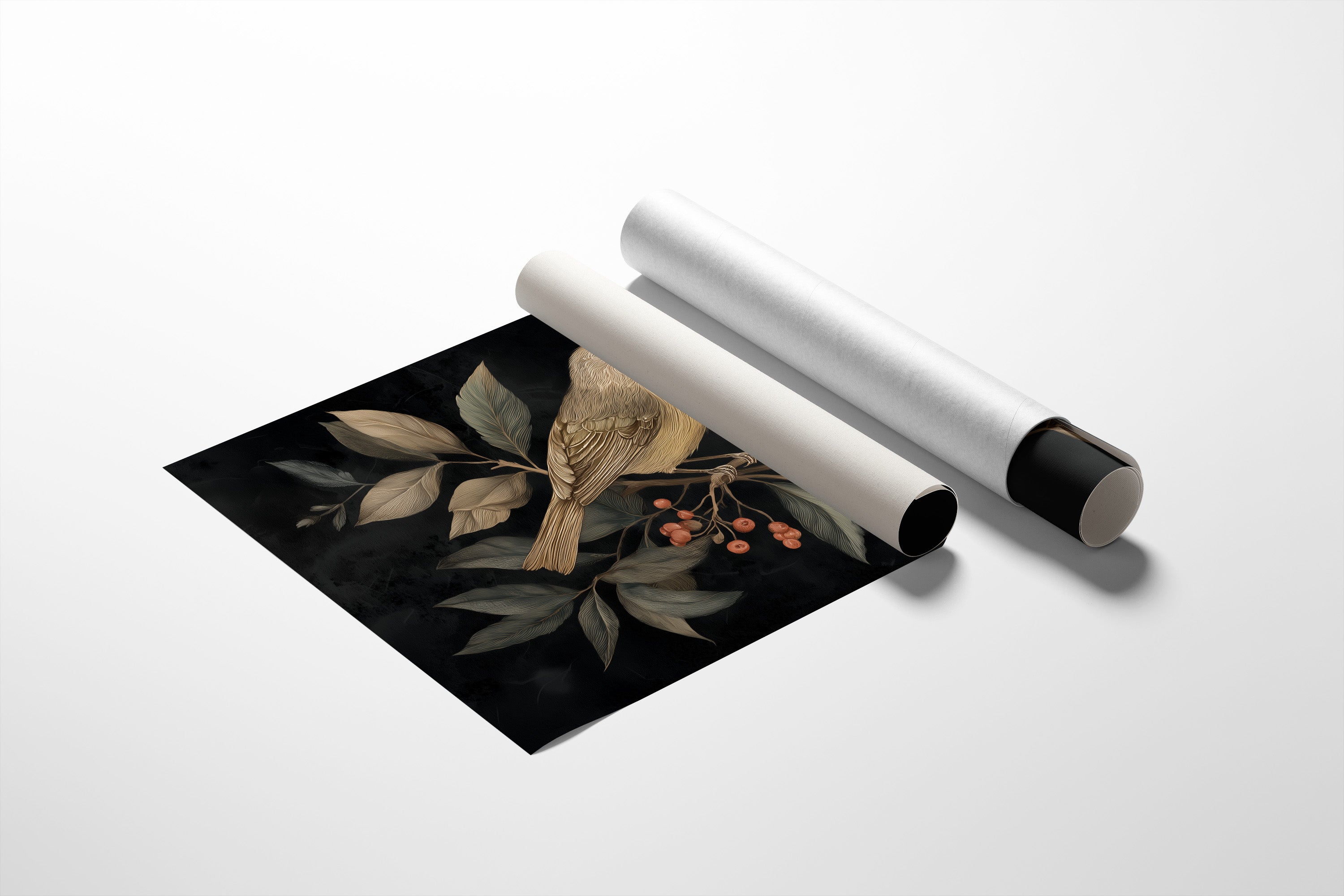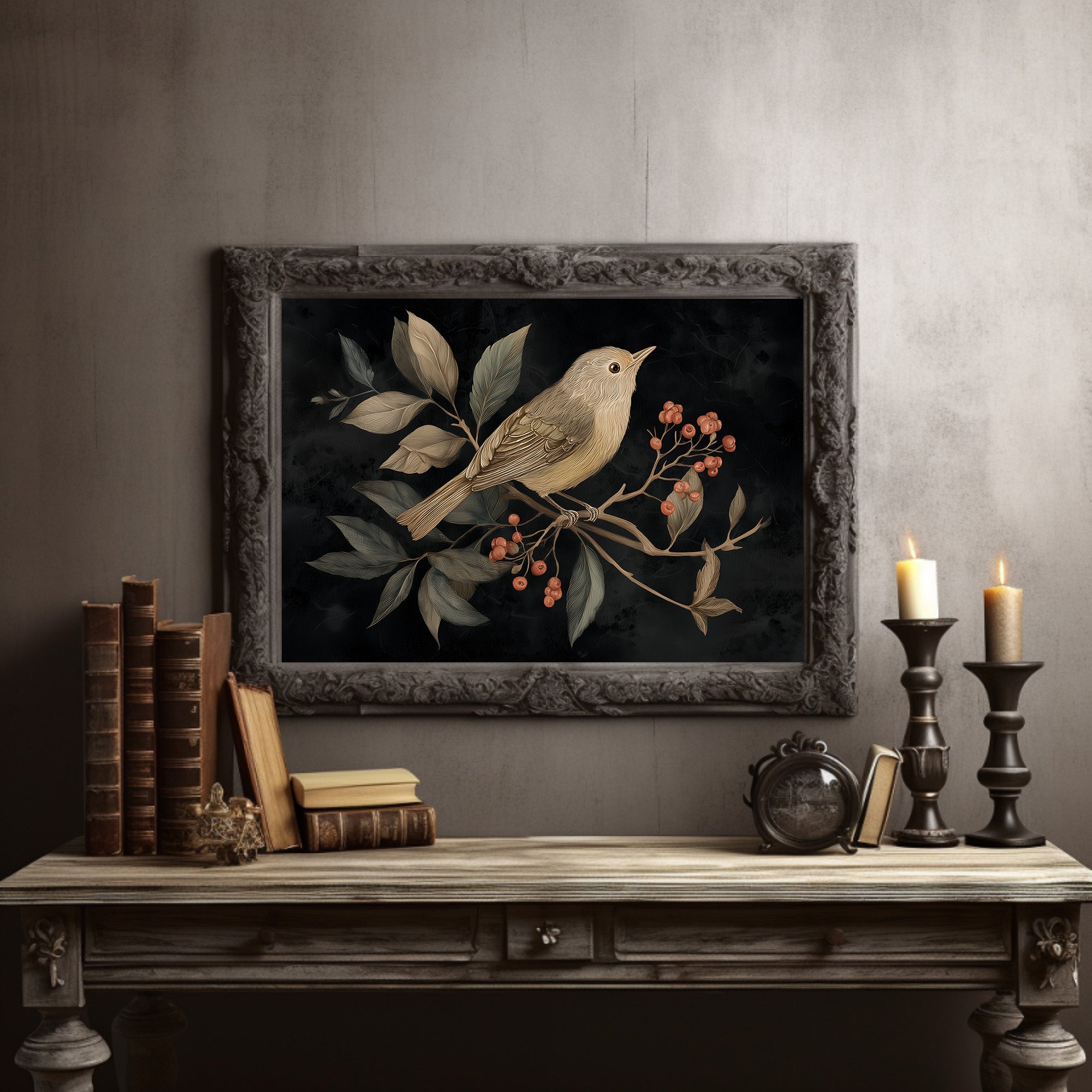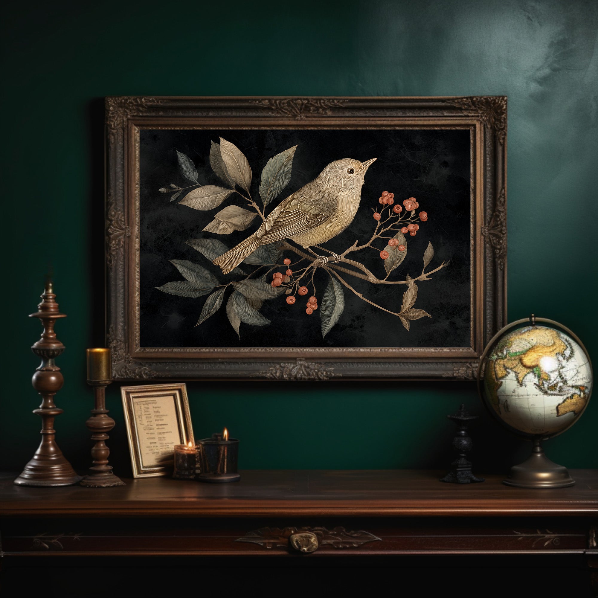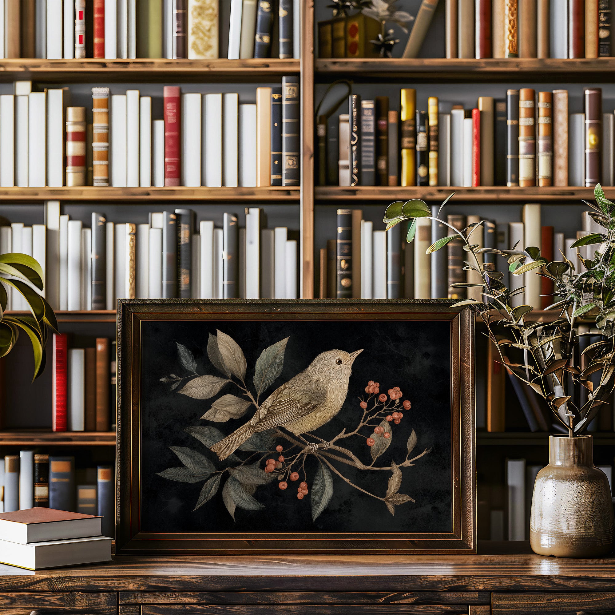 Soft light falls across a scholarly sanctuary where stories wait patiently on wooden shelves. A delicate painting of a pale songbird perched among sage-colored leaves and coral berries commands attention against its dramatic black background. The vintage-inspired botanical illustration brings a touch of nature's quiet poetry into this literary space, creating a perfect harmony between the wild and the cultivated mind.