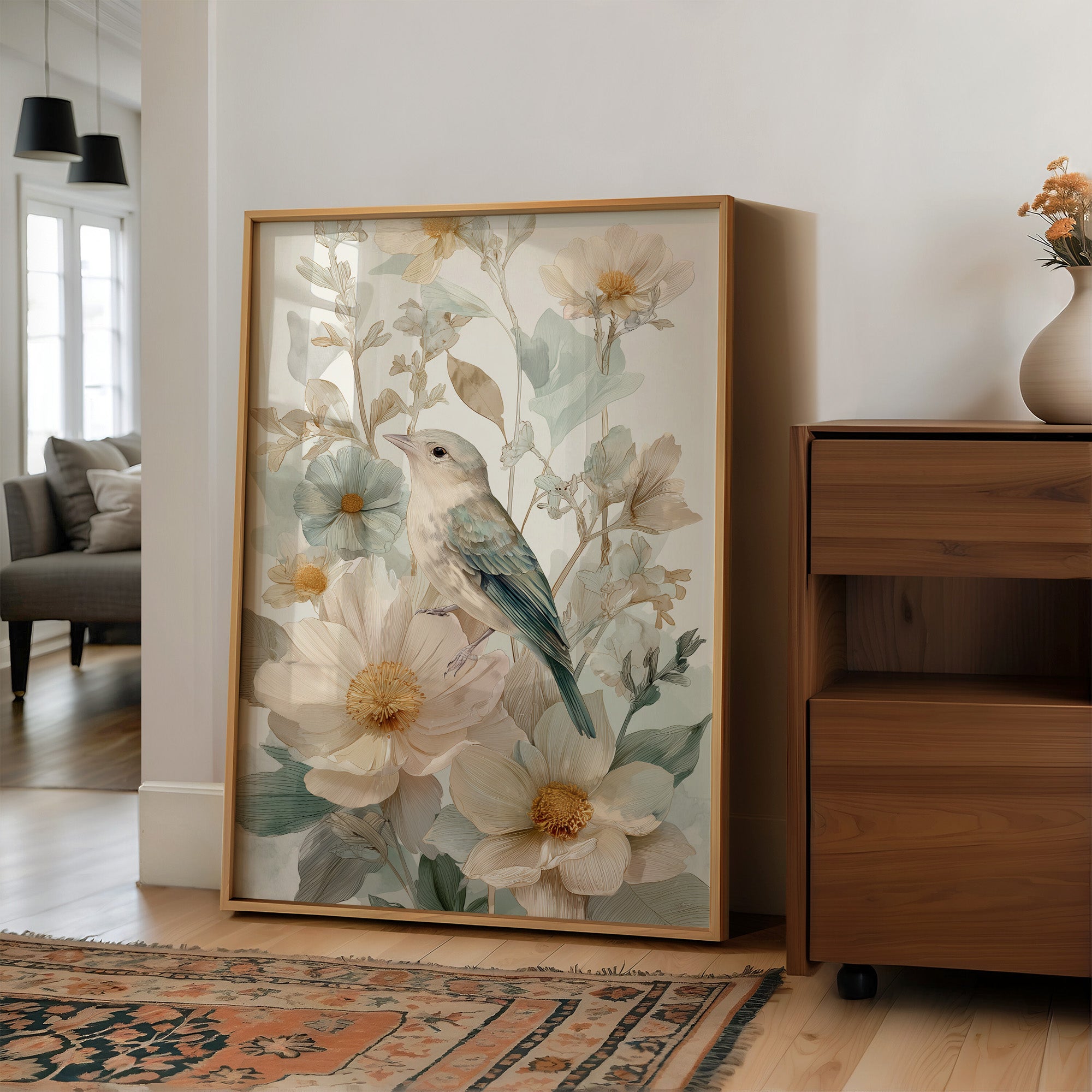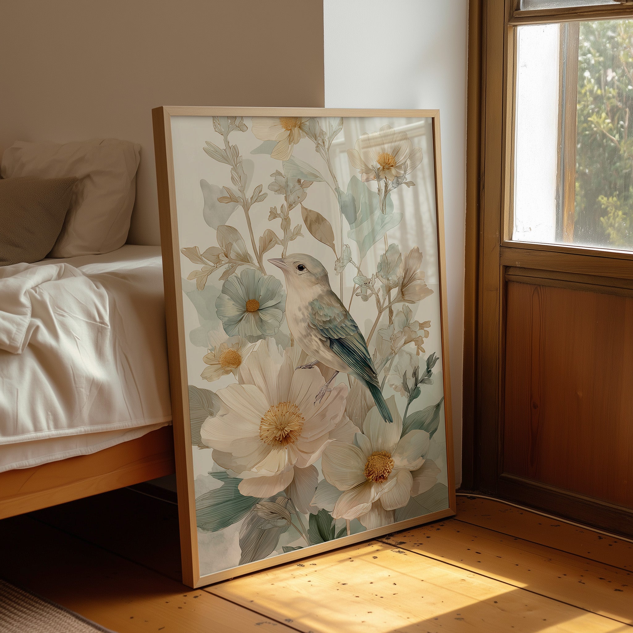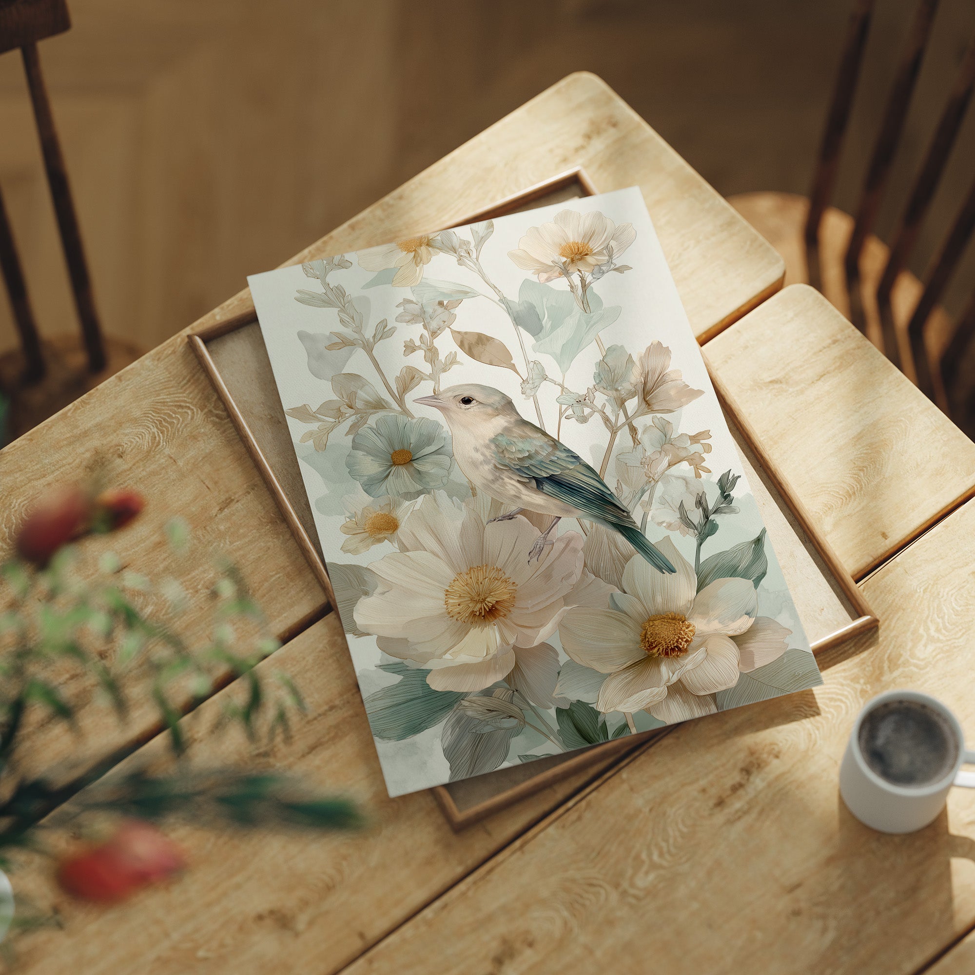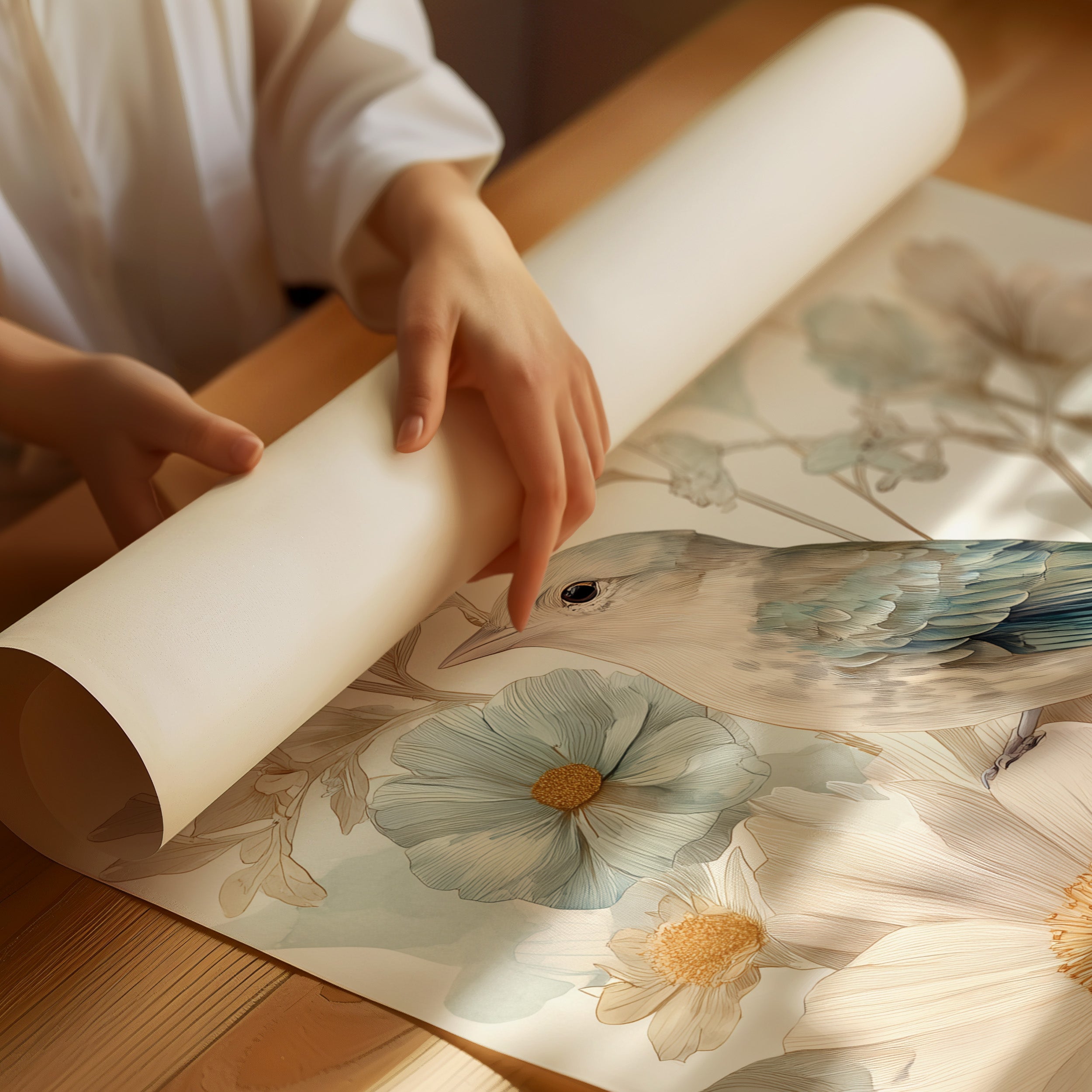 Morning light spills across the wooden table, illuminating delicate artwork of a small bird nestled among cream-colored flowers. The gentle illustration captures soft blue feathers against pale petals, creating a harmonious blend of nature's subtle palette. Golden centers of the blooms echo the warm tones of the rustic wooden surface below, while muted sage-green leaves add depth to the tranquil composition. This serene piece brings a touch of botanical elegance to reading nooks, breakfast corners, or any space where quiet moments are treasured.