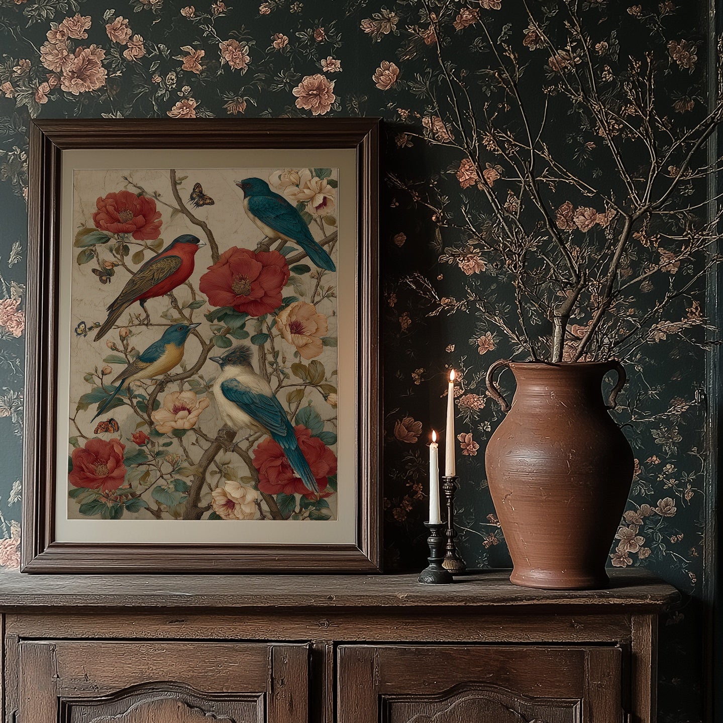 Morning light washes over a delicate gathering of vibrant birds perched among lush floral branches. Teal, scarlet, and azure feathers create a striking contrast against the soft coral and blush peonies, while delicate butterflies dance between the blooms. The vintage-inspired illustration captures nature's perfect harmonyeach bird positioned with intention against the backdrop of intricate botanical details and subtle cream tones.