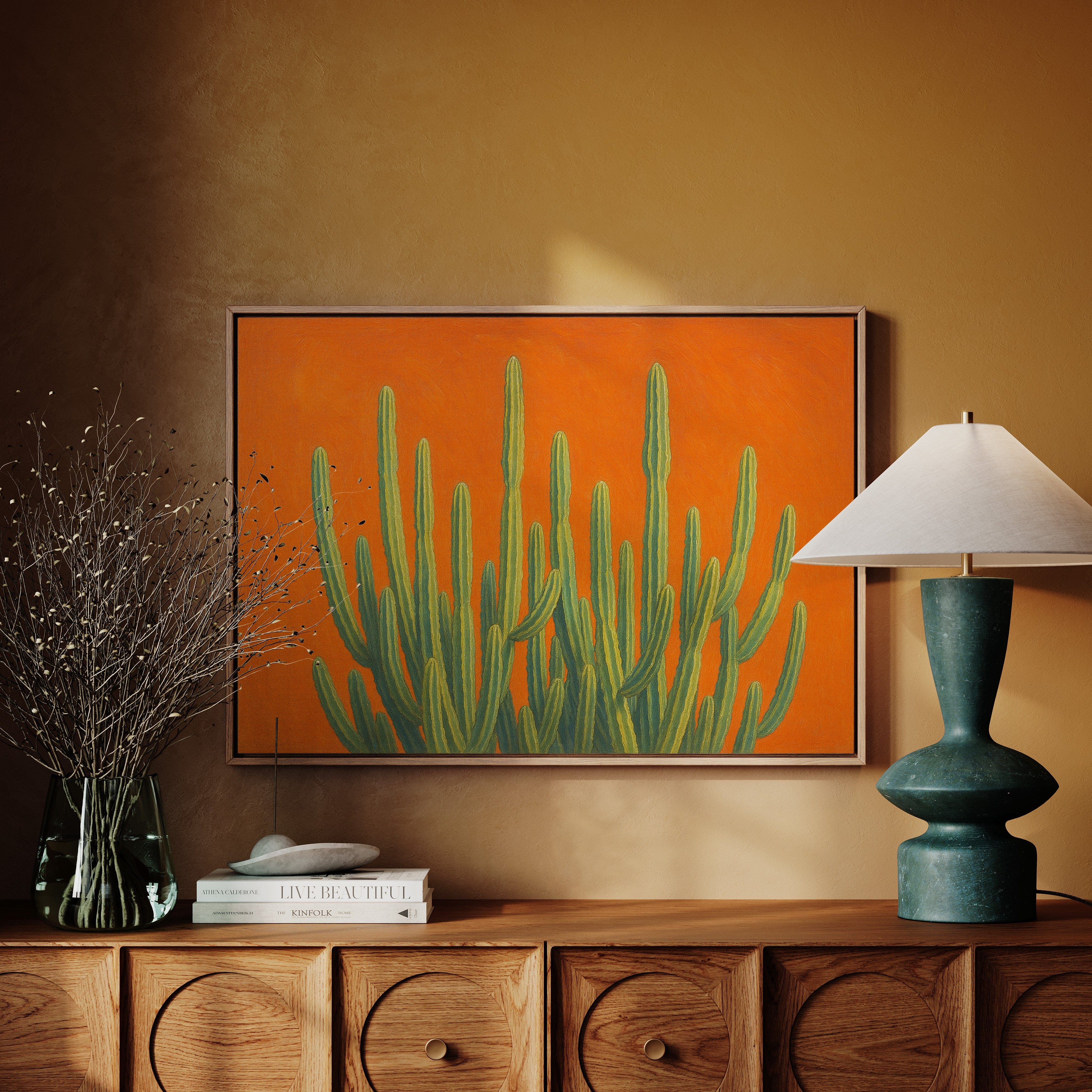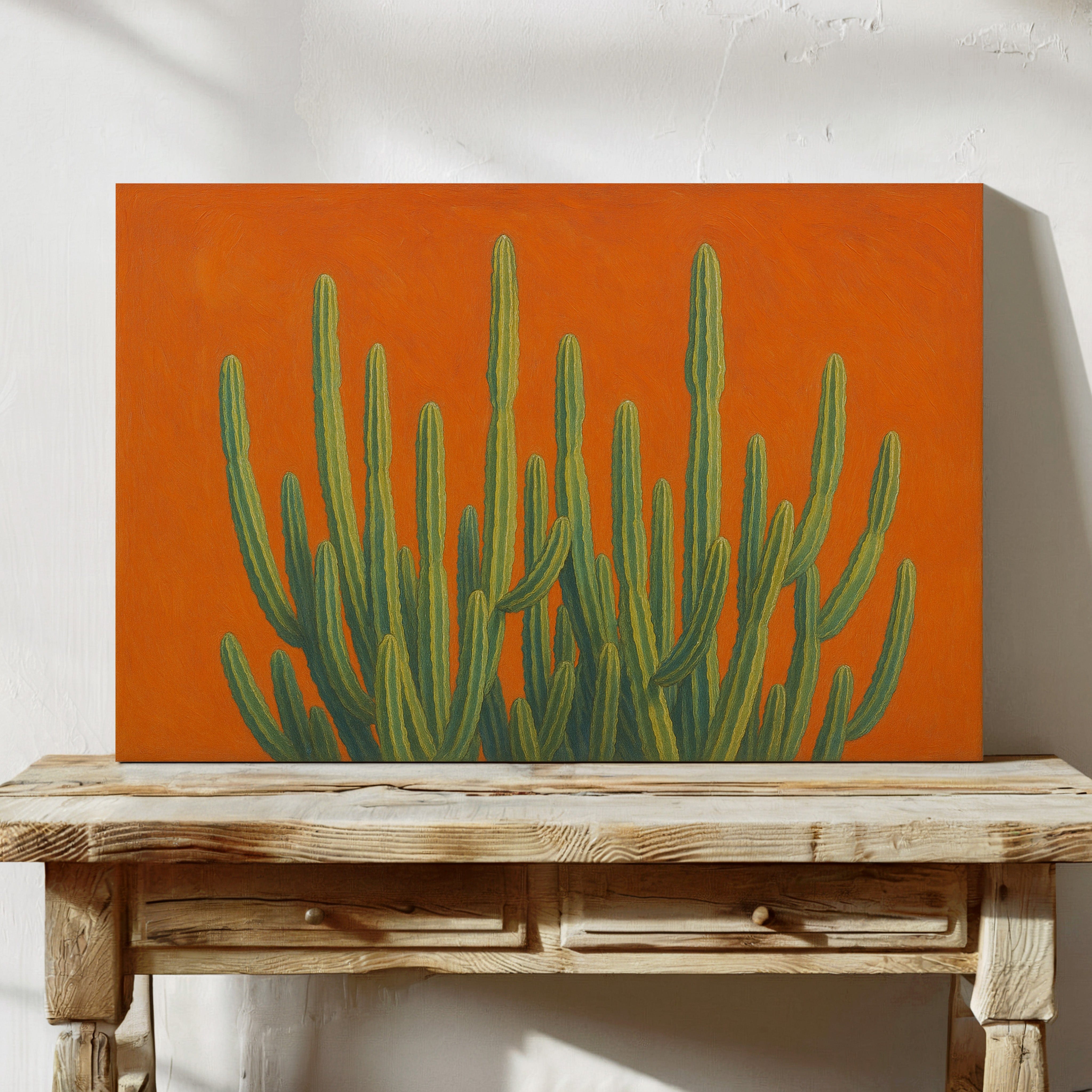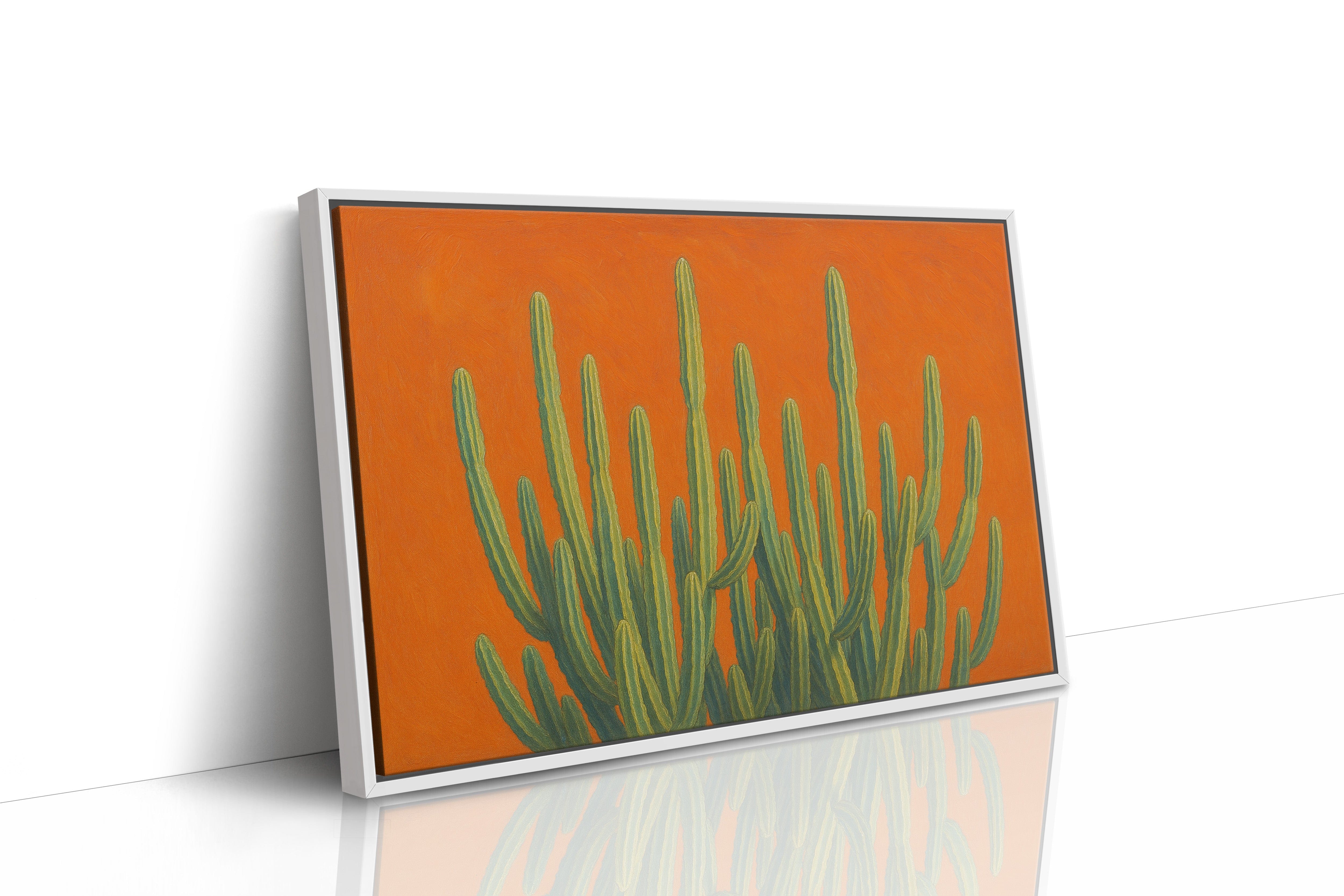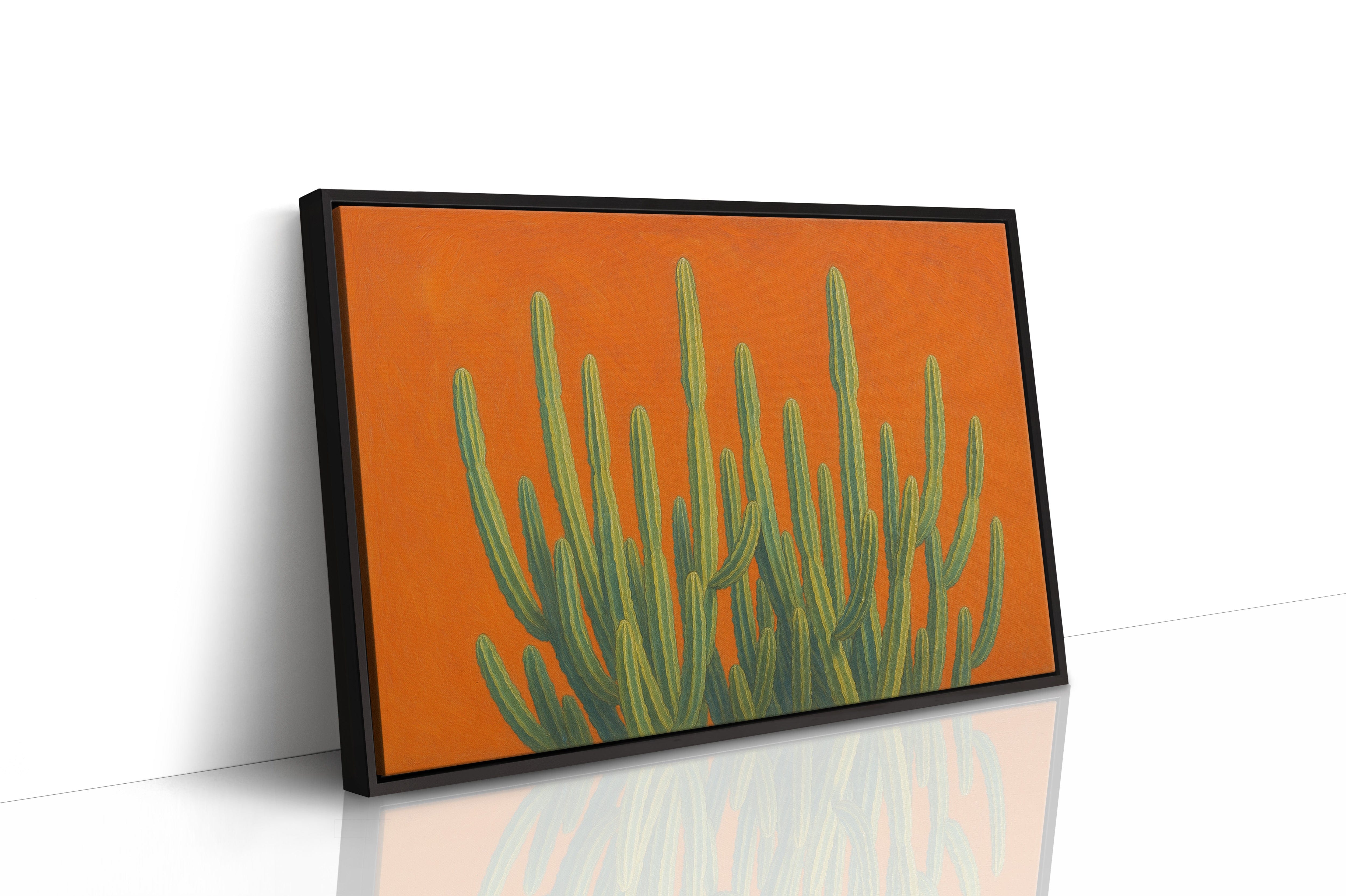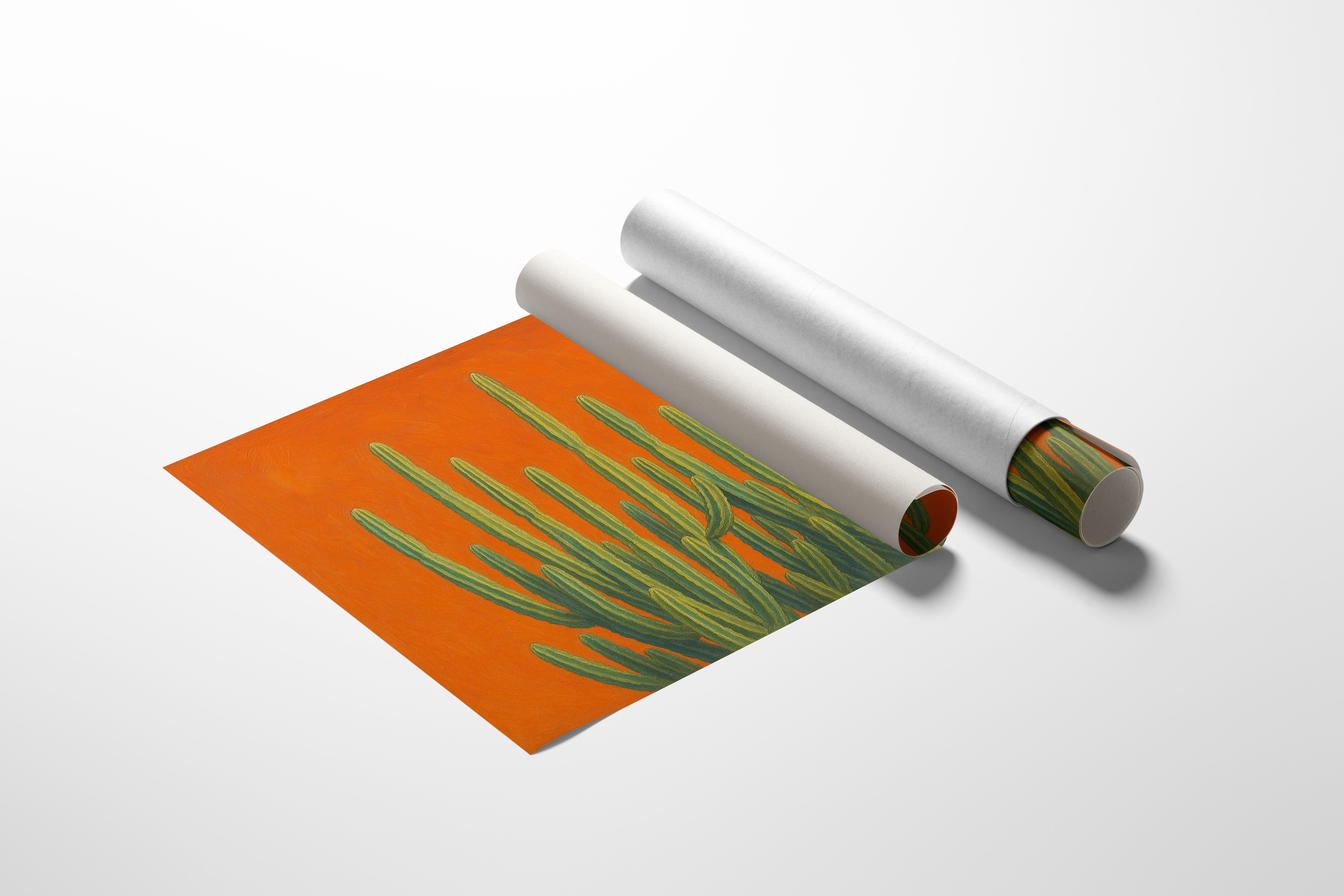 Bask in the bold brilliance of the desert with Sonoran Sunrise, a striking canvas print featuring tall green cacti reaching skyward against a radiant orange backdrop. This contemporary Southwestern artwork blends botanical beauty with vibrant color theory, creating a piece that’s equal parts serene and electric. Perfect for desert homes, modern bohemian spaces, or lovers of all things Arizona-inspired.