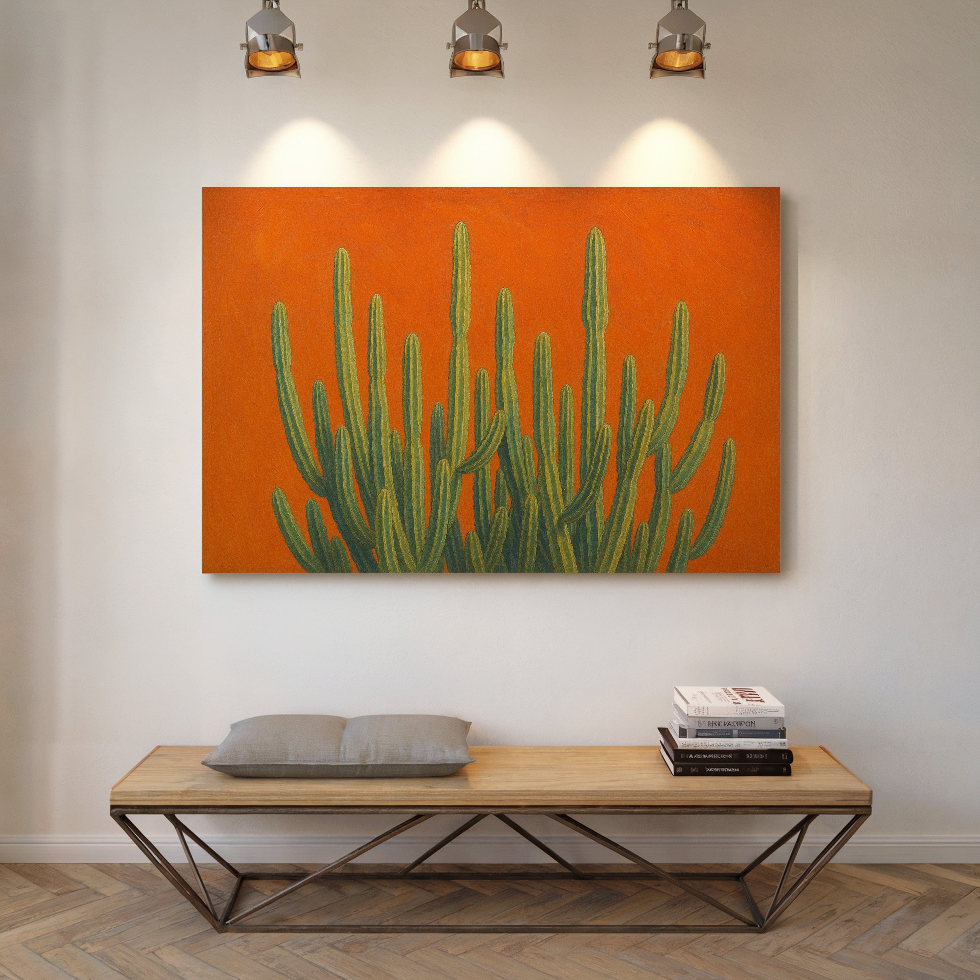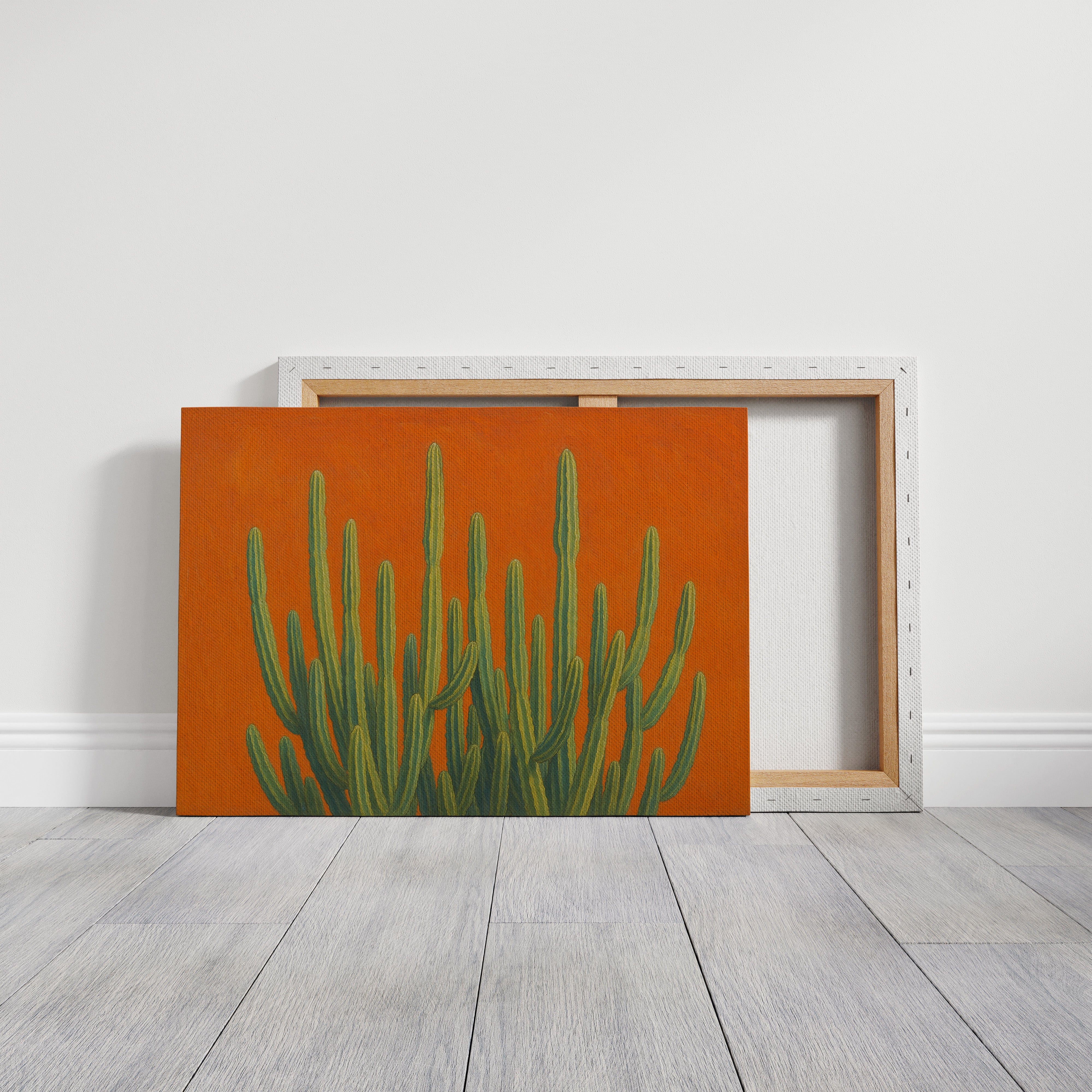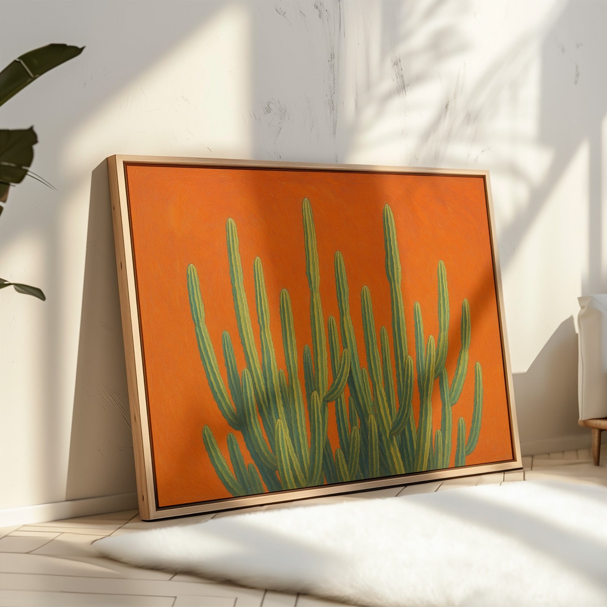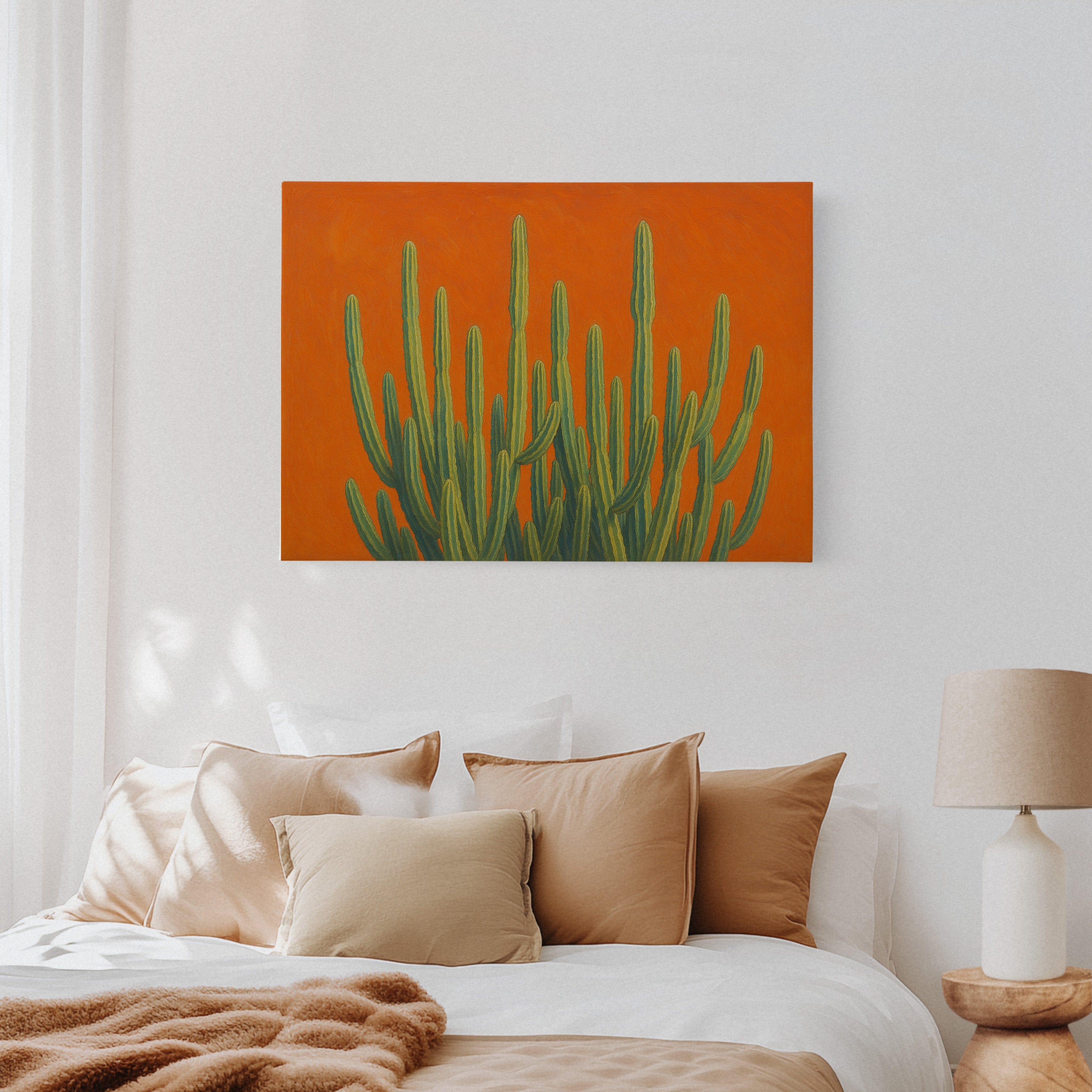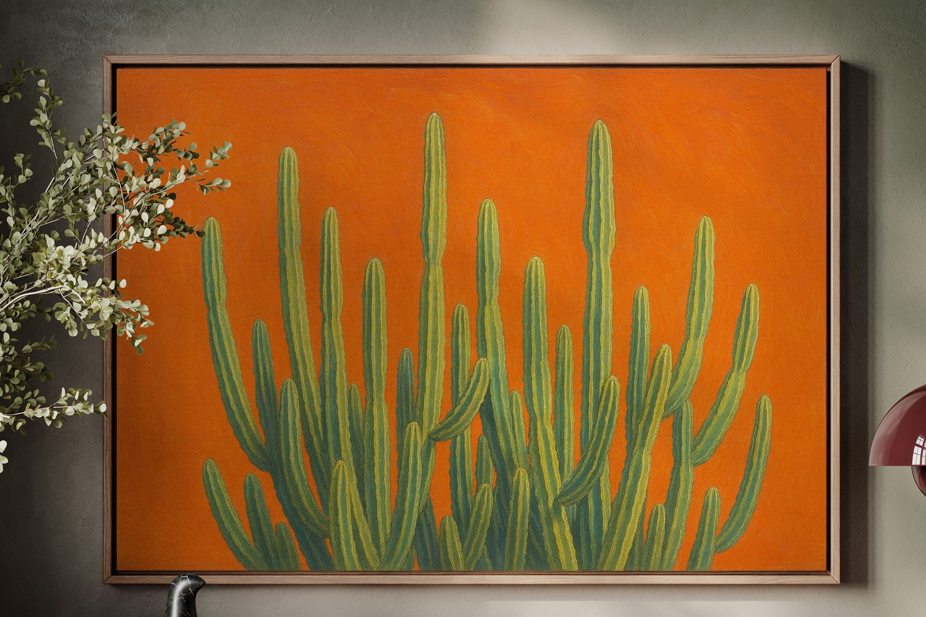 Bask in the bold brilliance of the desert with Sonoran Sunrise, a striking canvas print featuring tall green cacti reaching skyward against a radiant orange backdrop. This contemporary Southwestern artwork blends botanical beauty with vibrant color theory, creating a piece that’s equal parts serene and electric. Perfect for desert homes, modern bohemian spaces, or lovers of all things Arizona-inspired.