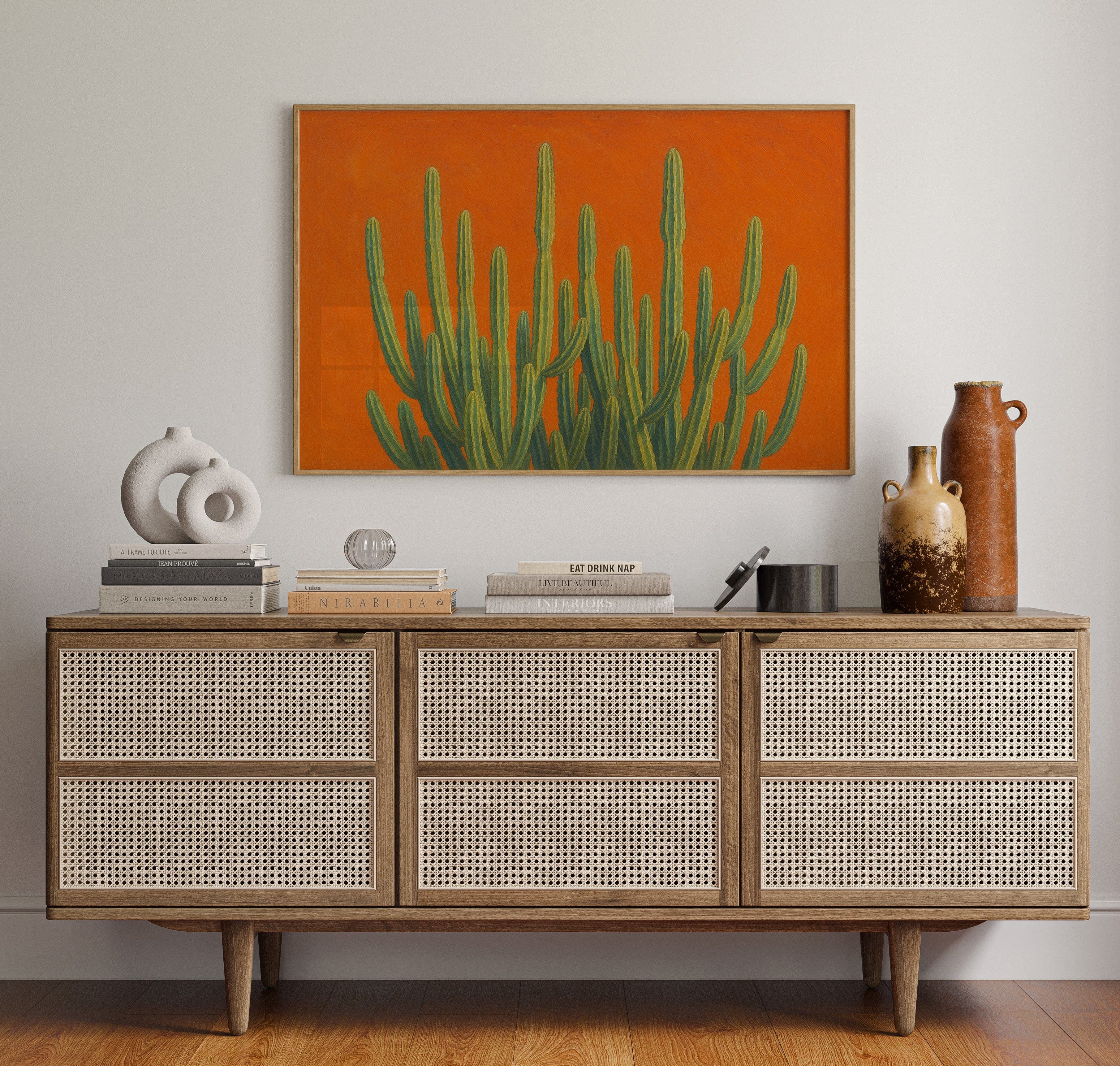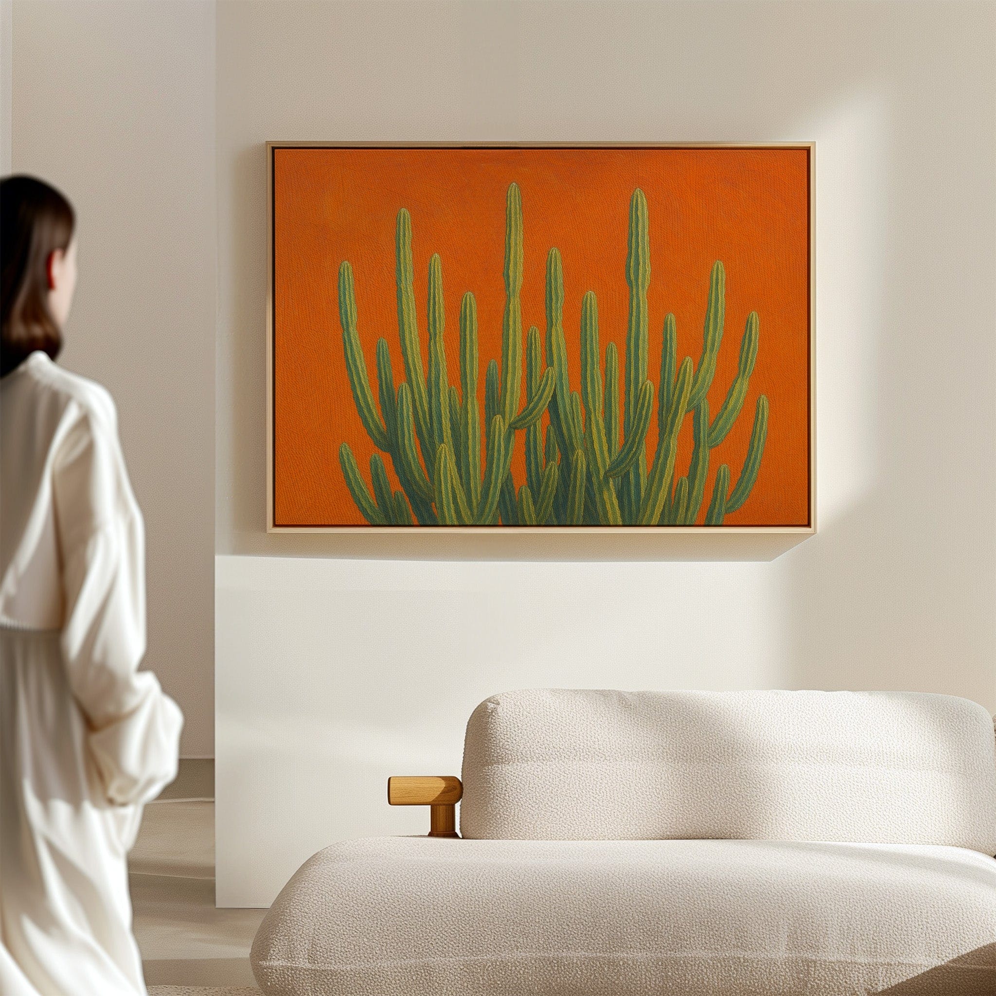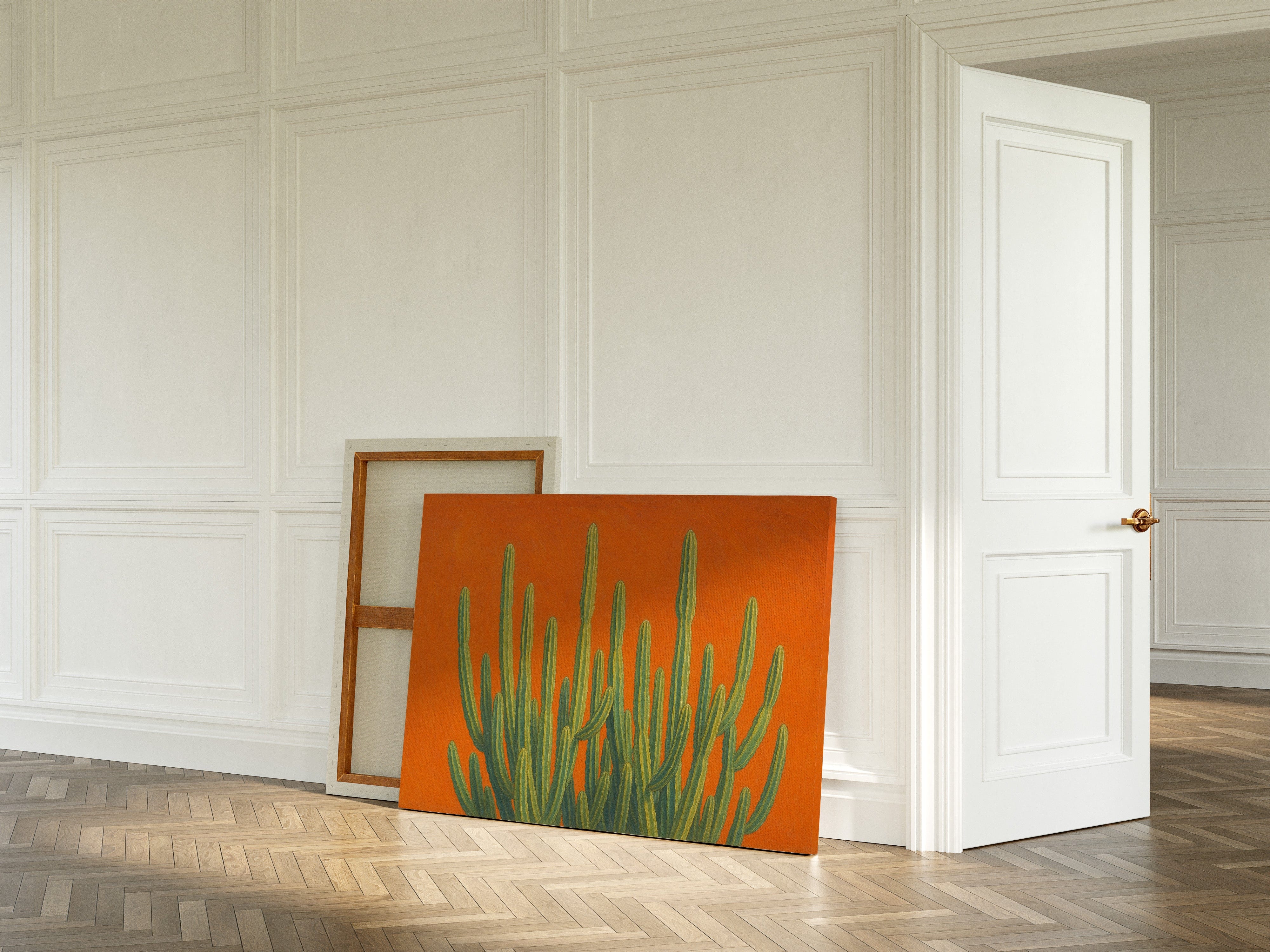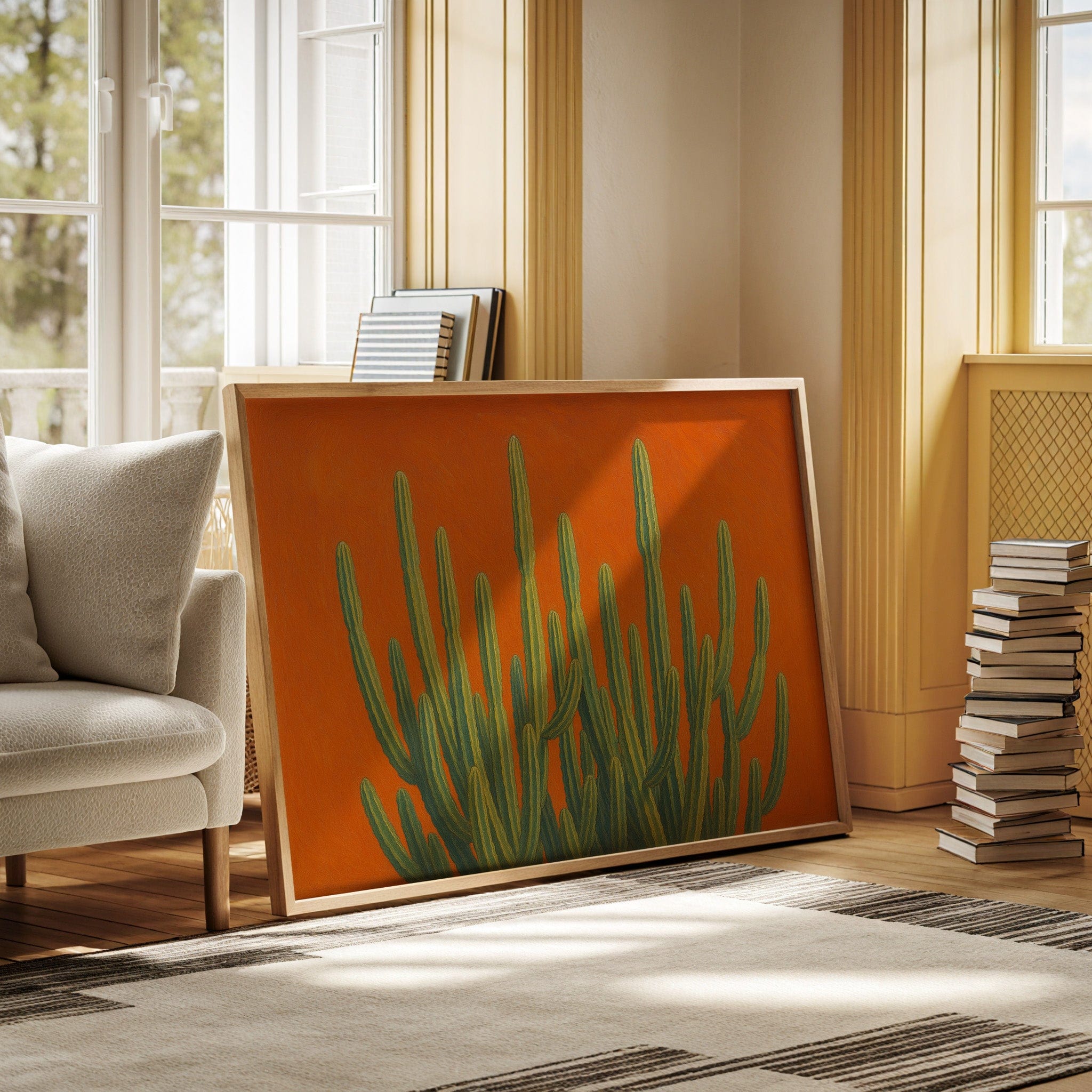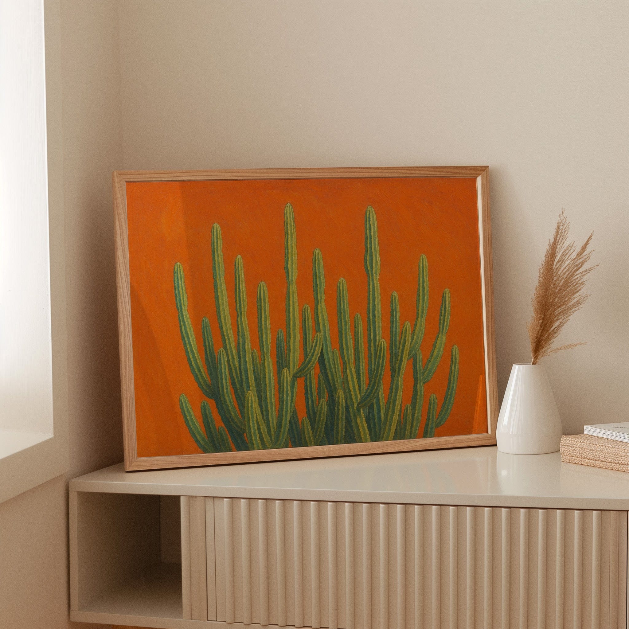 Bask in the bold brilliance of the desert with Sonoran Sunrise, a striking canvas print featuring tall green cacti reaching skyward against a radiant orange backdrop. This contemporary Southwestern artwork blends botanical beauty with vibrant color theory, creating a piece that’s equal parts serene and electric. Perfect for desert homes, modern bohemian spaces, or lovers of all things Arizona-inspired.
