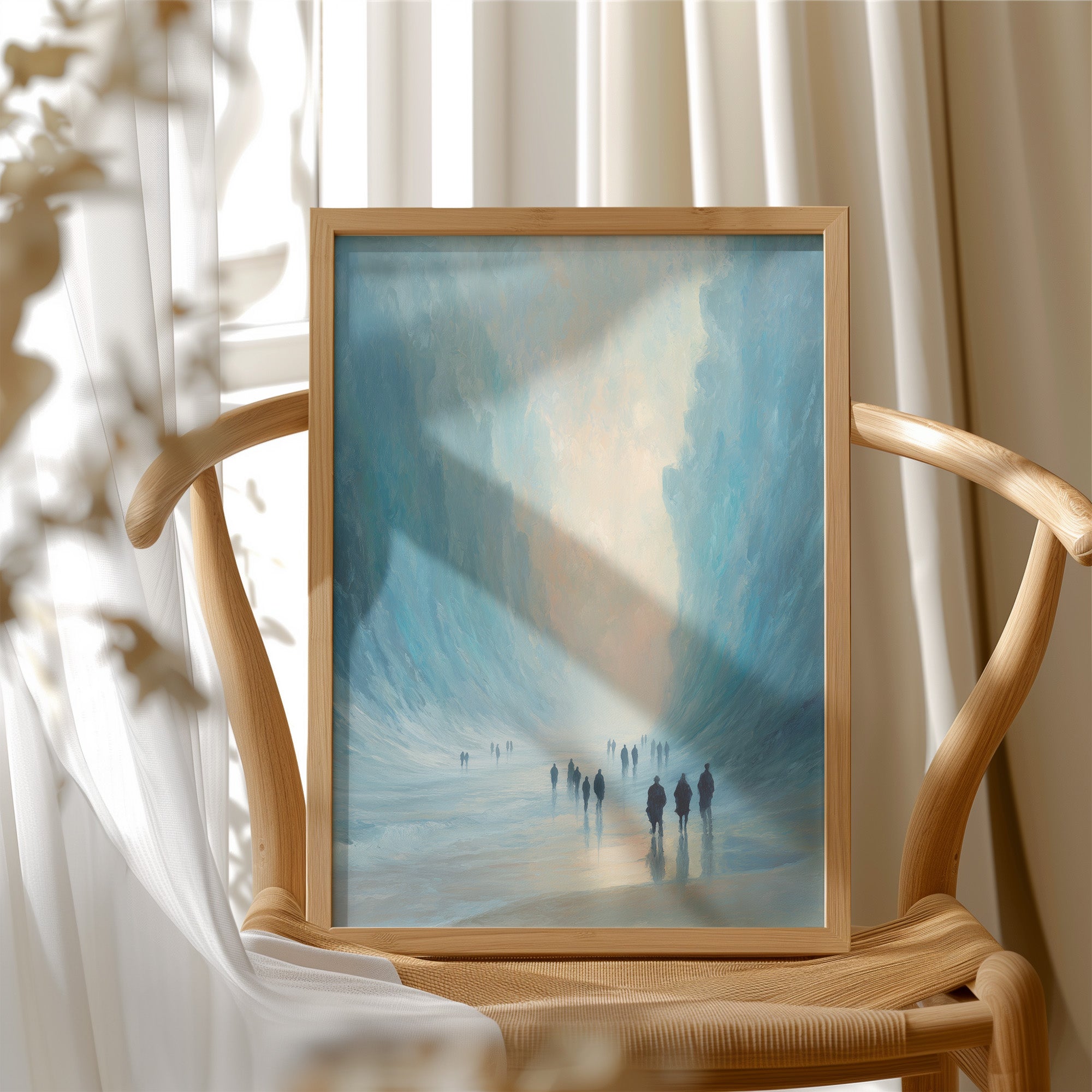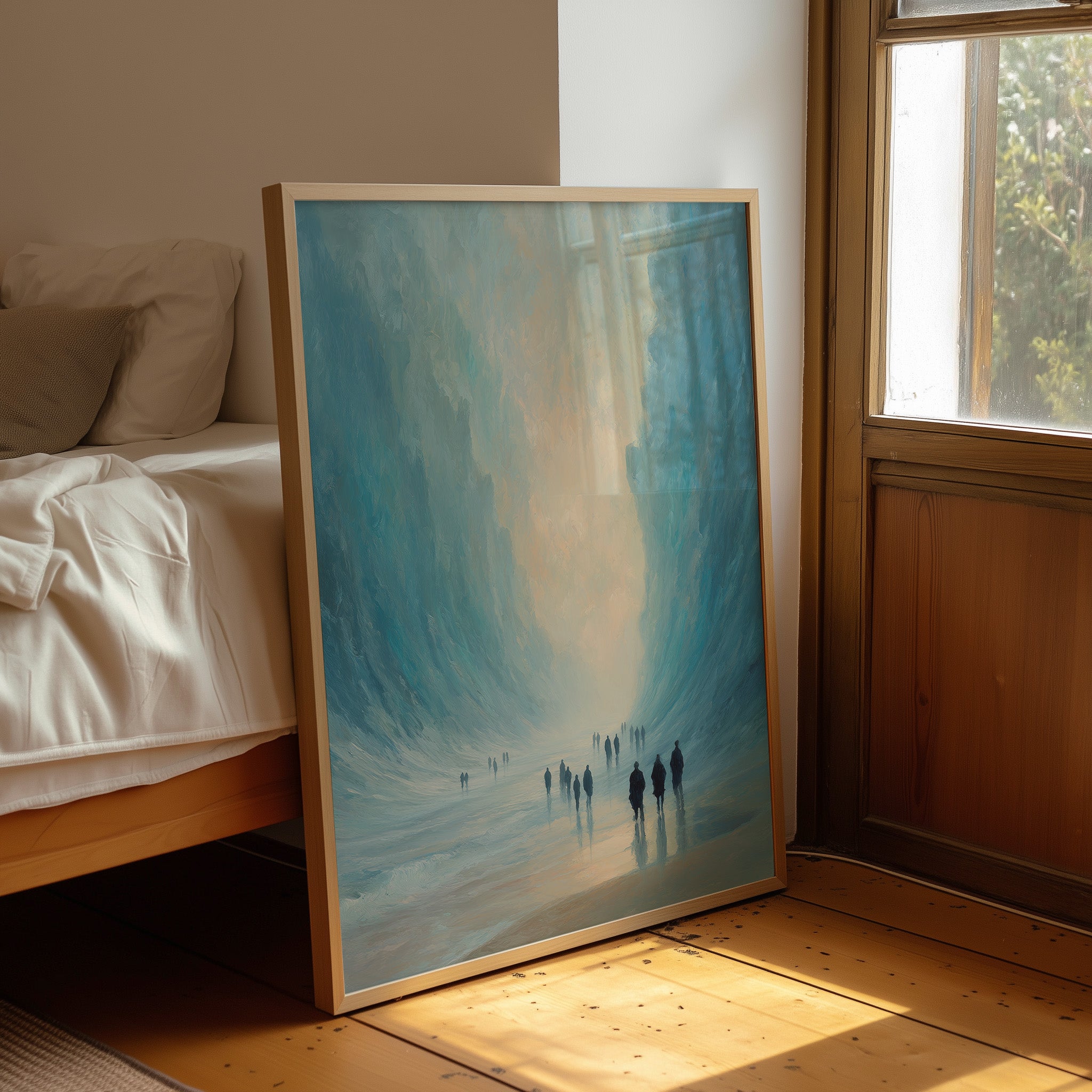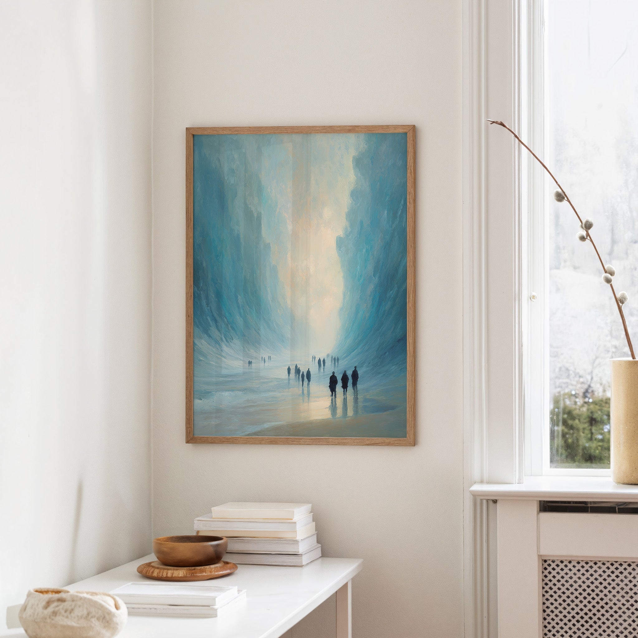A moment suspended between worlds, where azure waves part to reveal a luminous pathway. Small silhouettes journey forward through towering walls of blue, their figures diminishing into the brilliant white horizon that beckons them onward. The painting's ethereal quality creates a sense of transcendence, with its gradient of deep cerulean to misty white capturing that liminal space between reality and something beyond. This contemplative piece brings a touch of spiritual serenity to a reading nook or meditation space, inviting quiet reflection on life's greater journey.