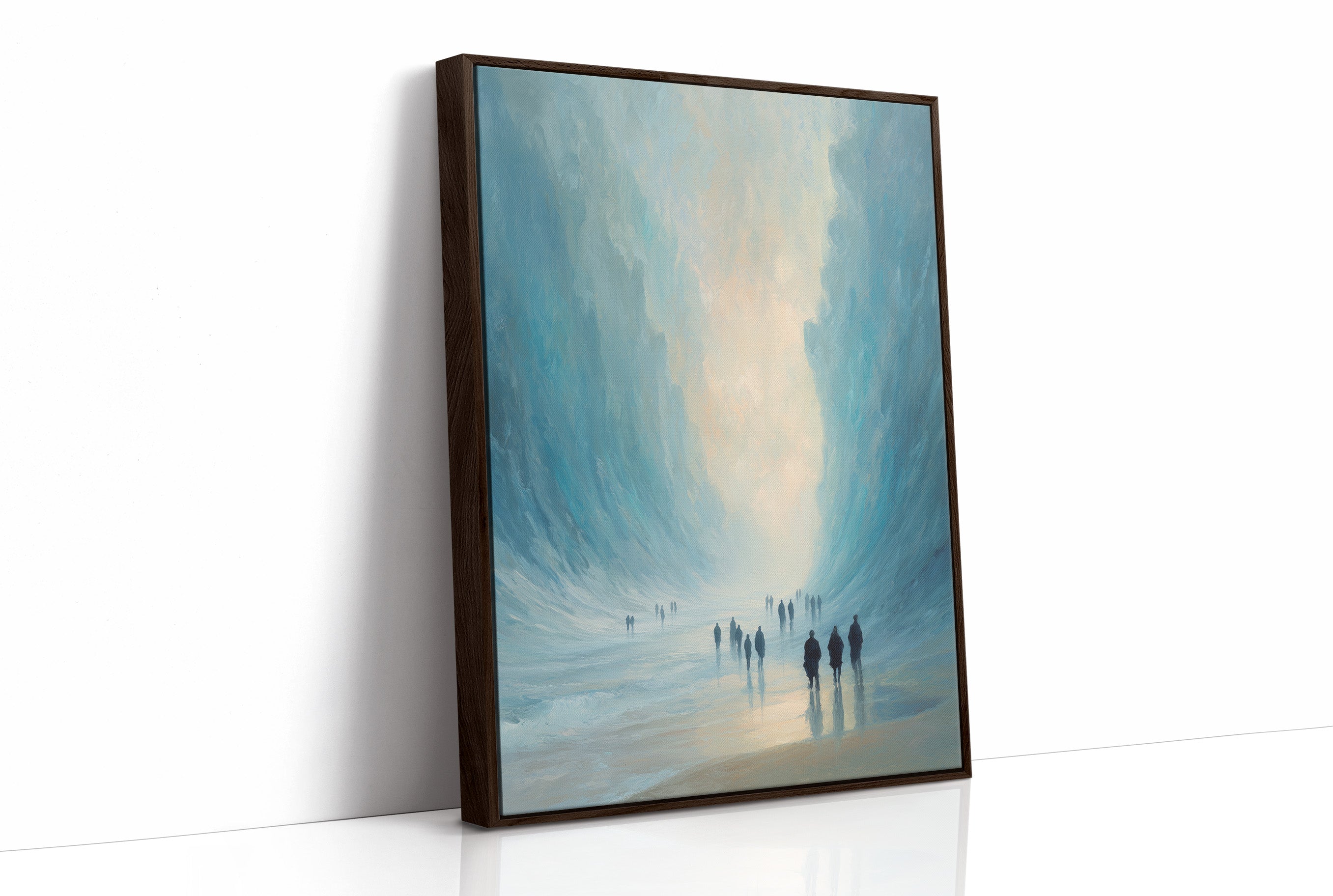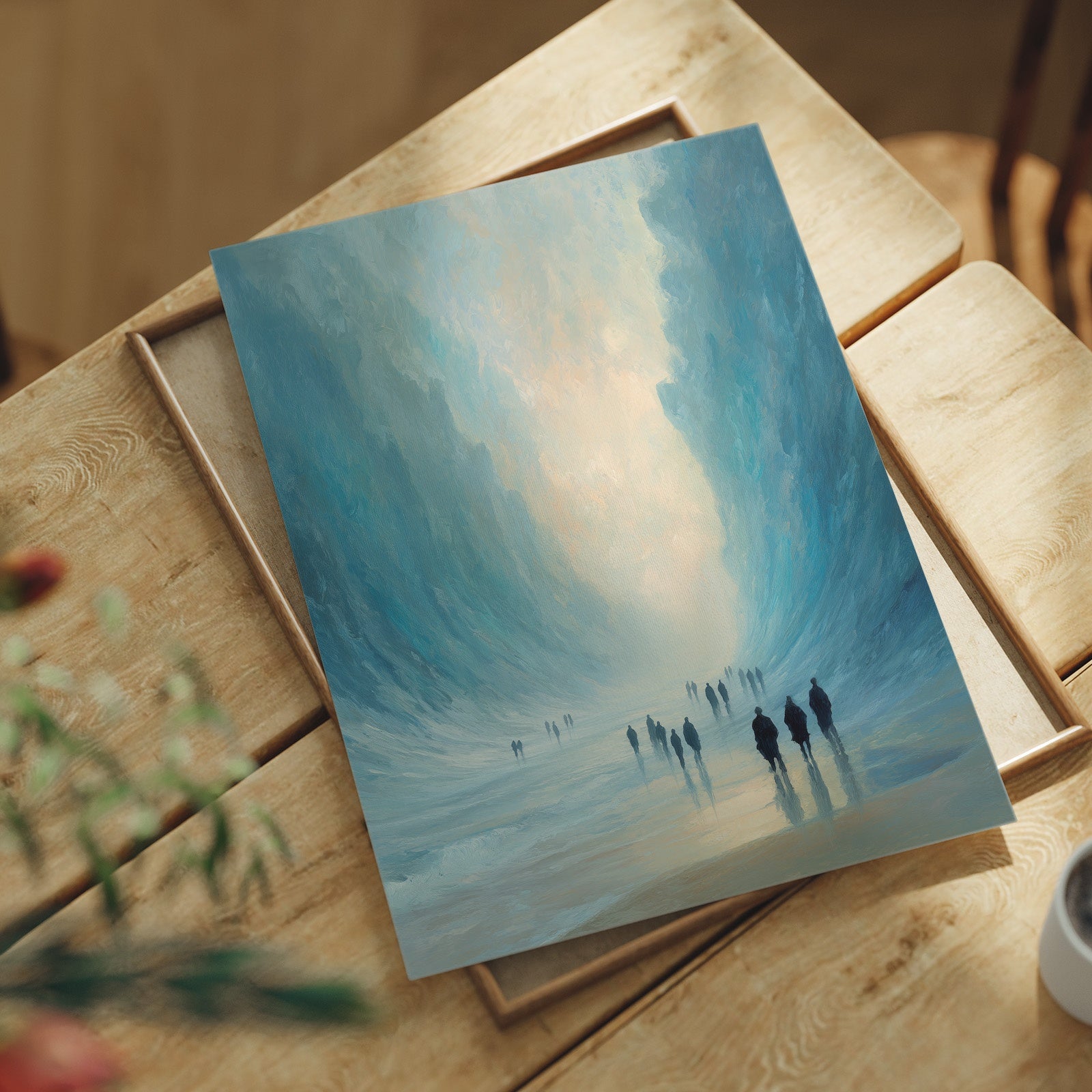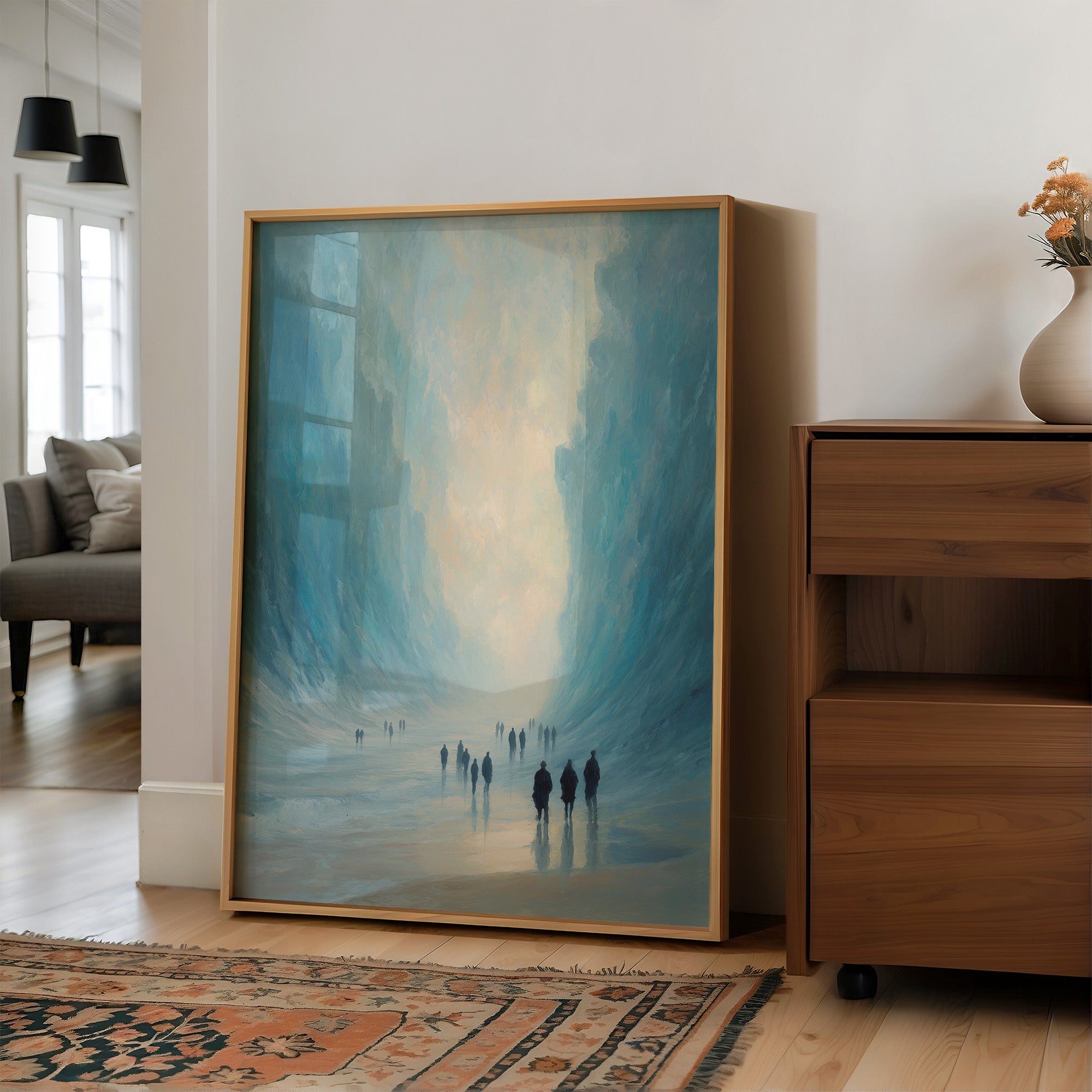 A moment suspended between worlds, where azure waves part to reveal a luminous pathway. Small silhouettes journey forward through towering walls of blue, their figures diminishing into the brilliant white horizon that beckons them onward. The painting's ethereal quality creates a sense of transcendence, with its gradient of deep cerulean to misty white capturing that liminal space between reality and something beyond. This contemplative piece brings a touch of spiritual serenity to a reading nook or meditation space, inviting quiet reflection on life's greater journey.