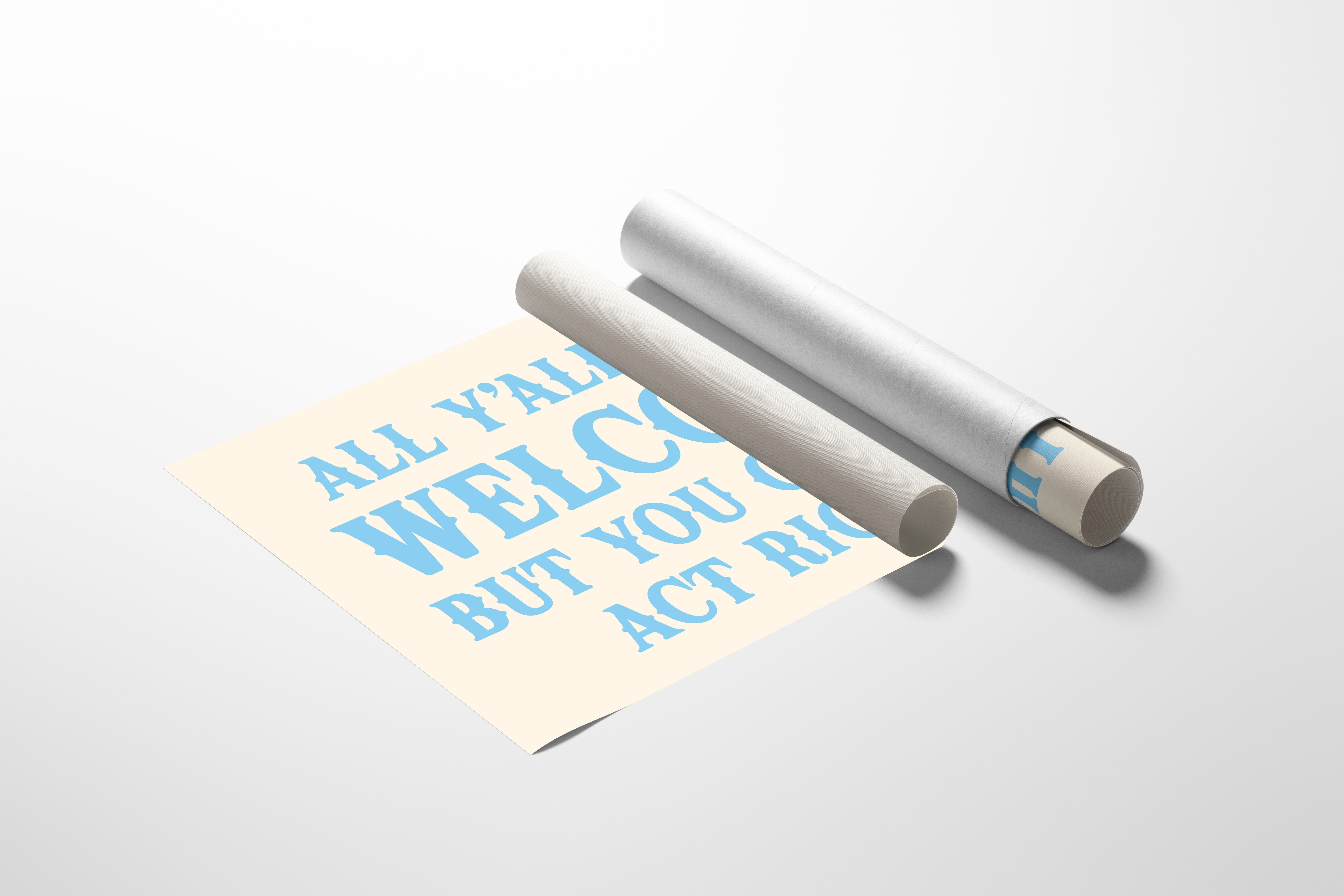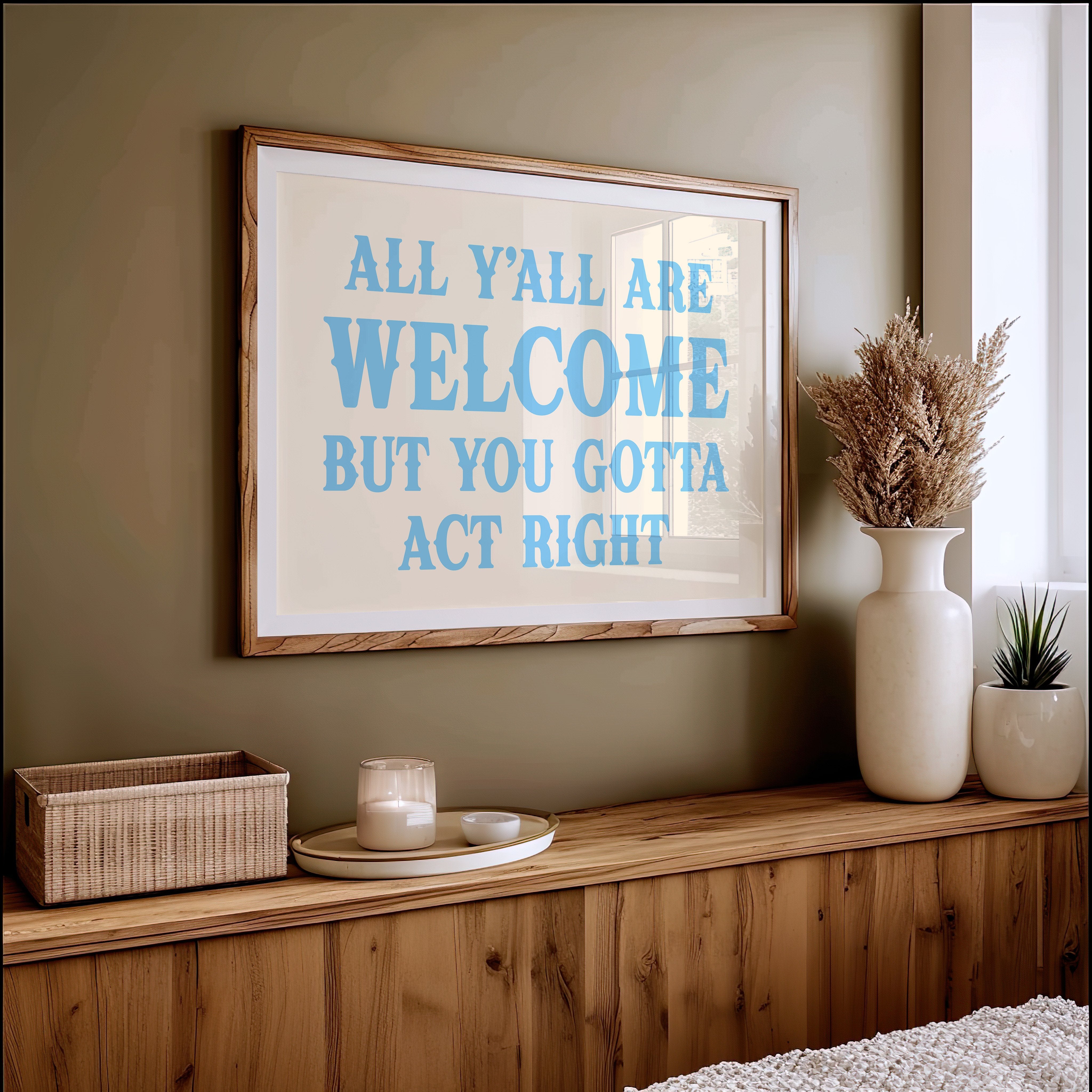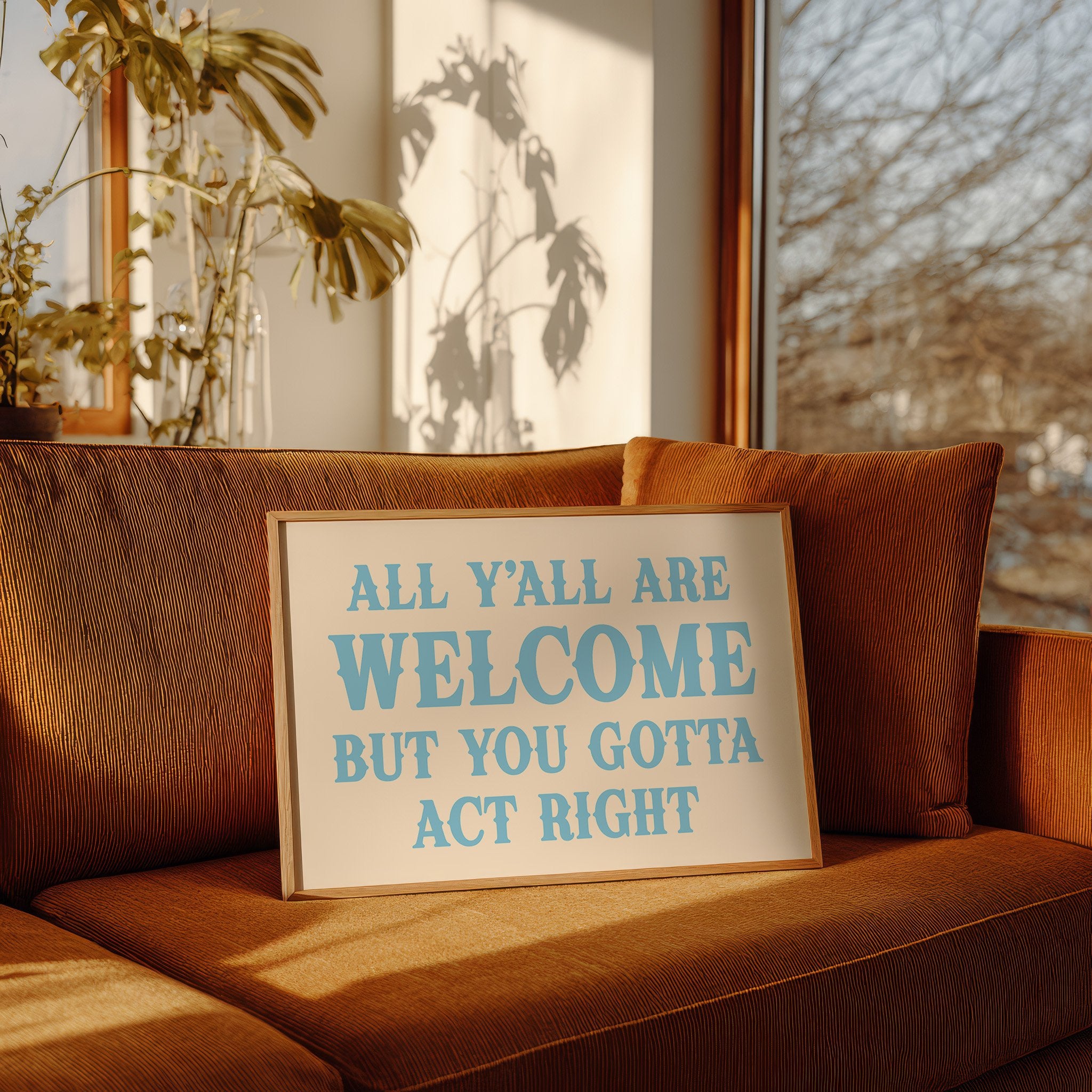 Soft blue letters float against warm cream, offering a gentle yet firm reminder of hospitality's boundaries. The playful typography captures that uniquely Southern blend of warmth and straightforwardness, where welcome comes with good-natured expectations. The contrast between the inviting message and its gentle warning creates a charming tension, like sweet tea with just enough bite to keep things interesting.