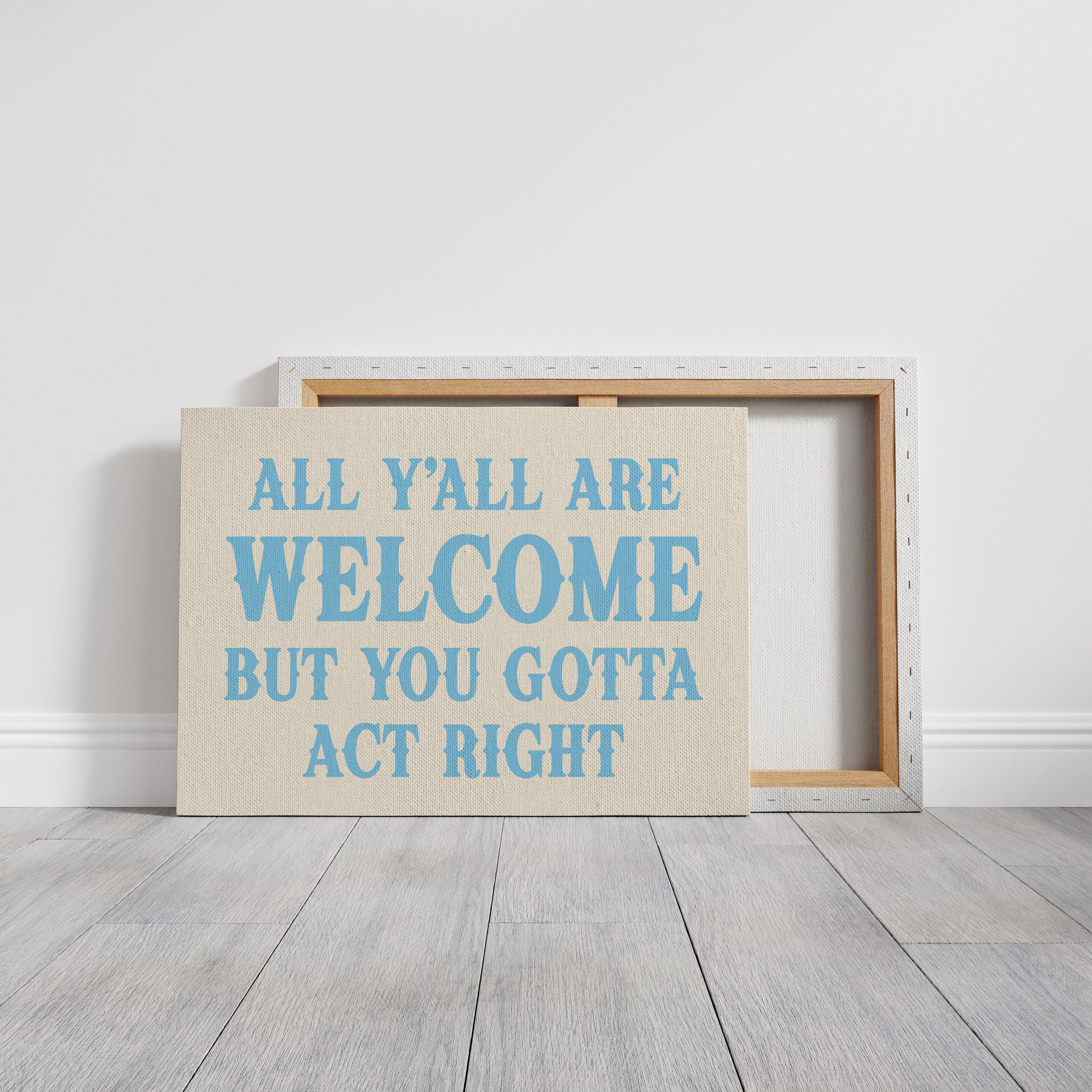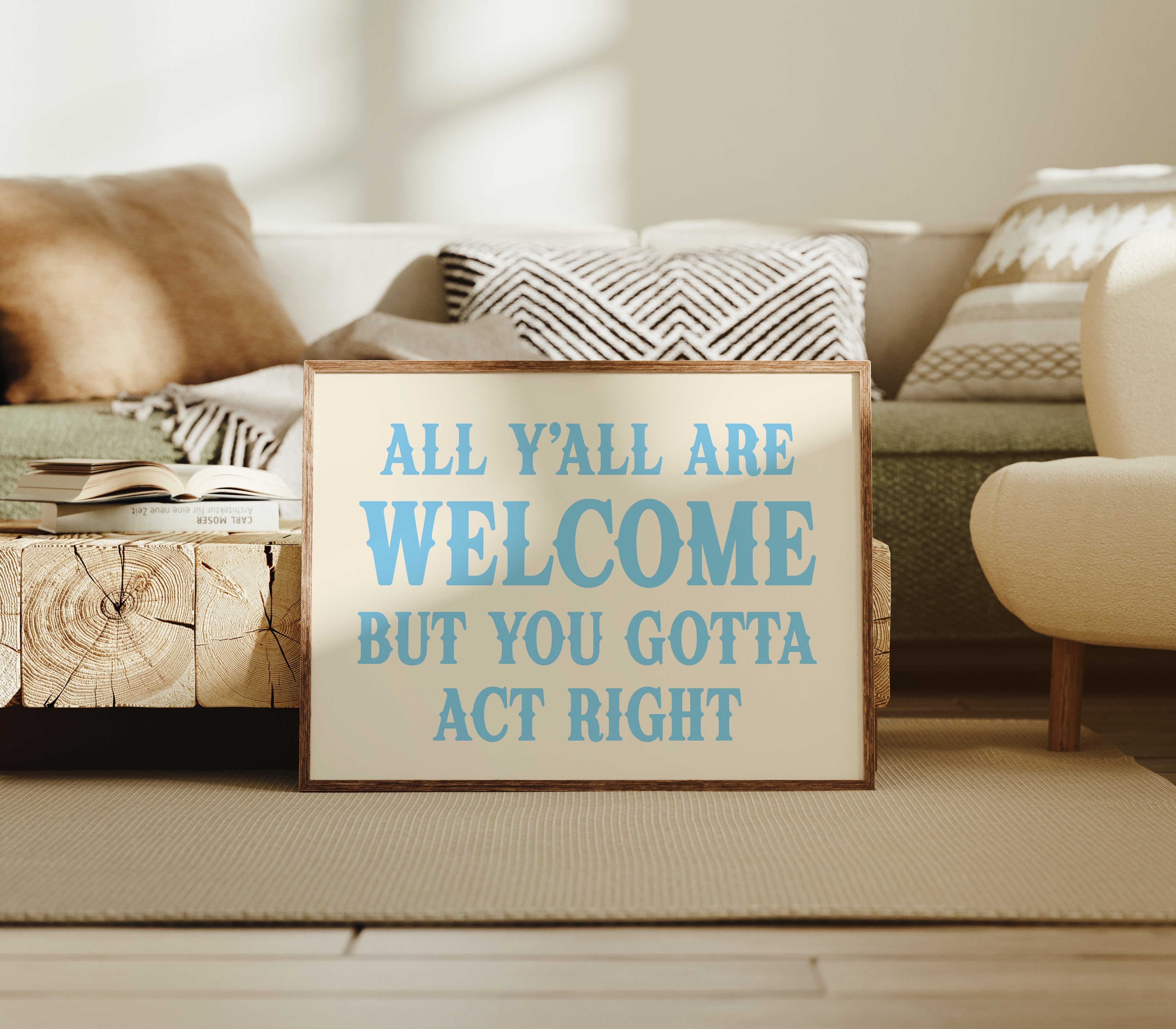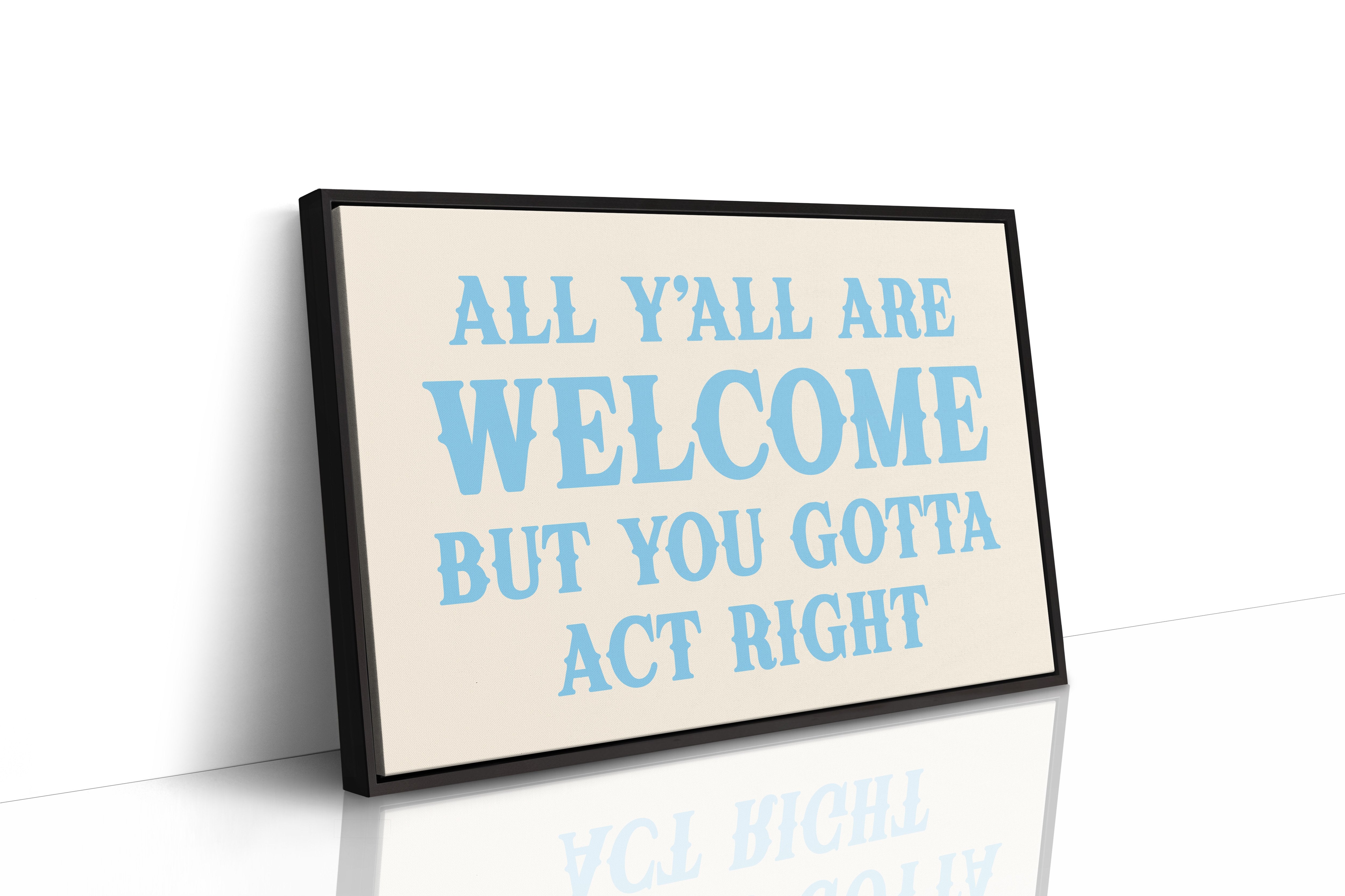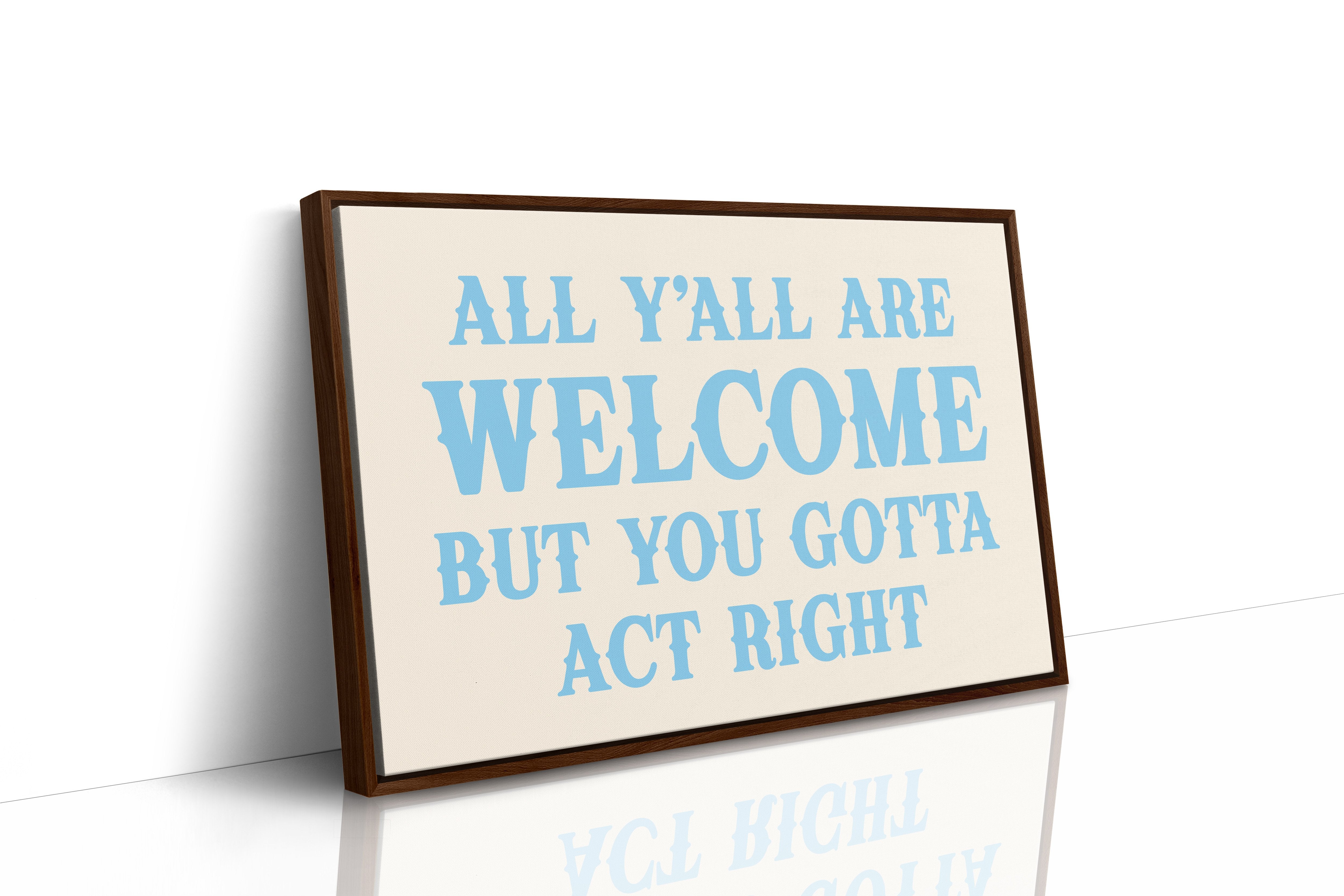 Soft blue letters float against warm cream, offering a gentle yet firm reminder of hospitality's boundaries. The playful typography captures that uniquely Southern blend of warmth and straightforwardness, where welcome comes with good-natured expectations. The contrast between the inviting message and its gentle warning creates a charming tension, like sweet tea with just enough bite to keep things interesting.