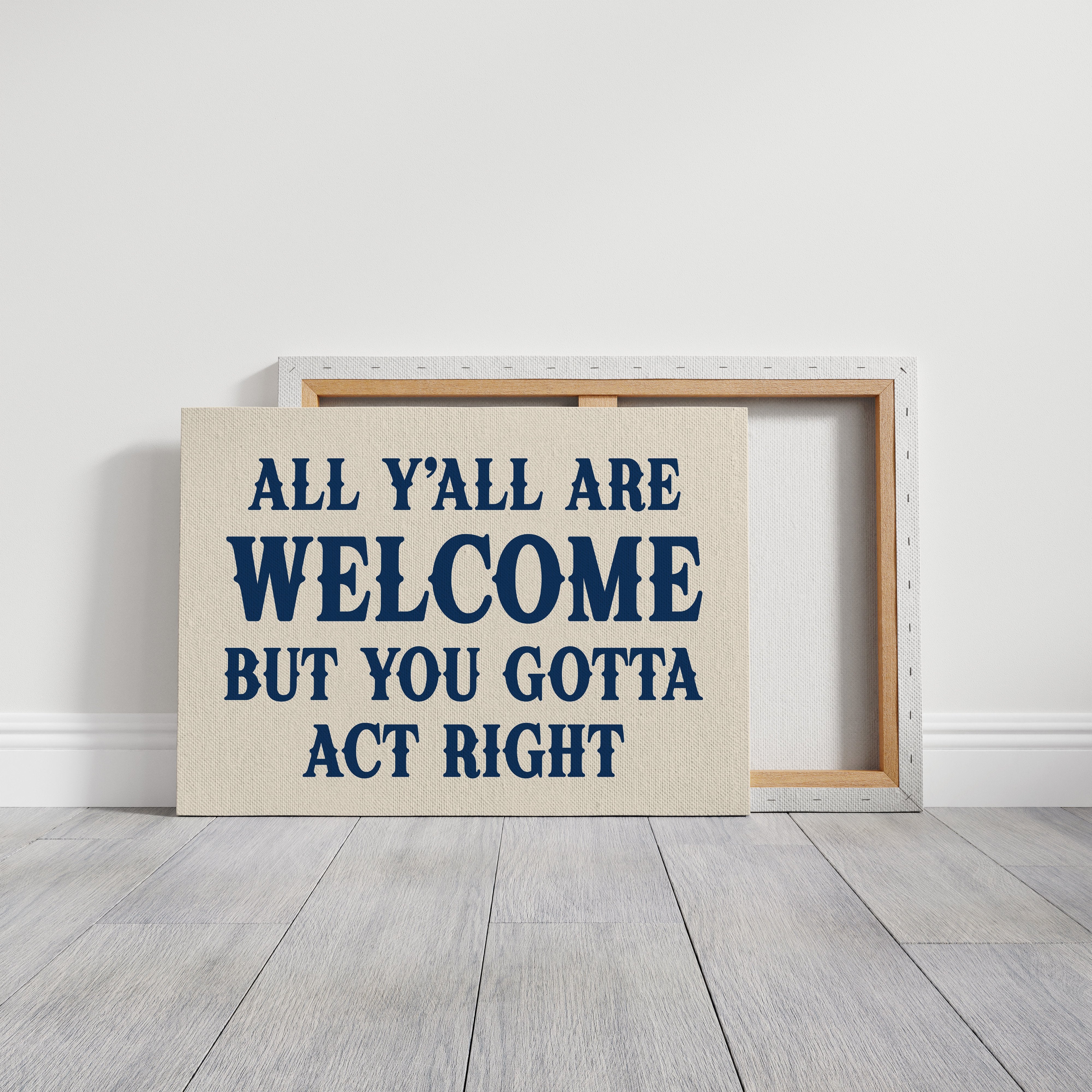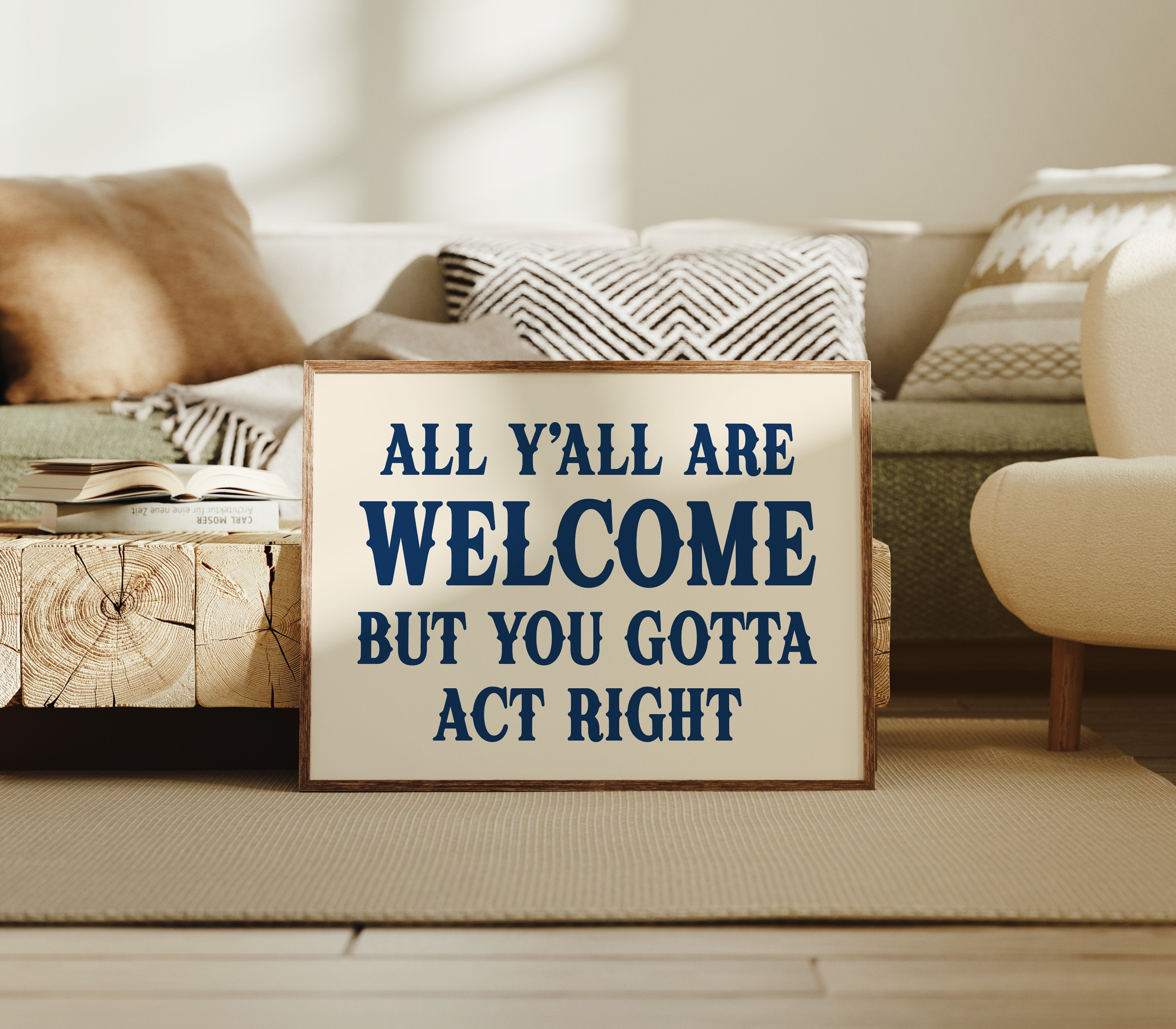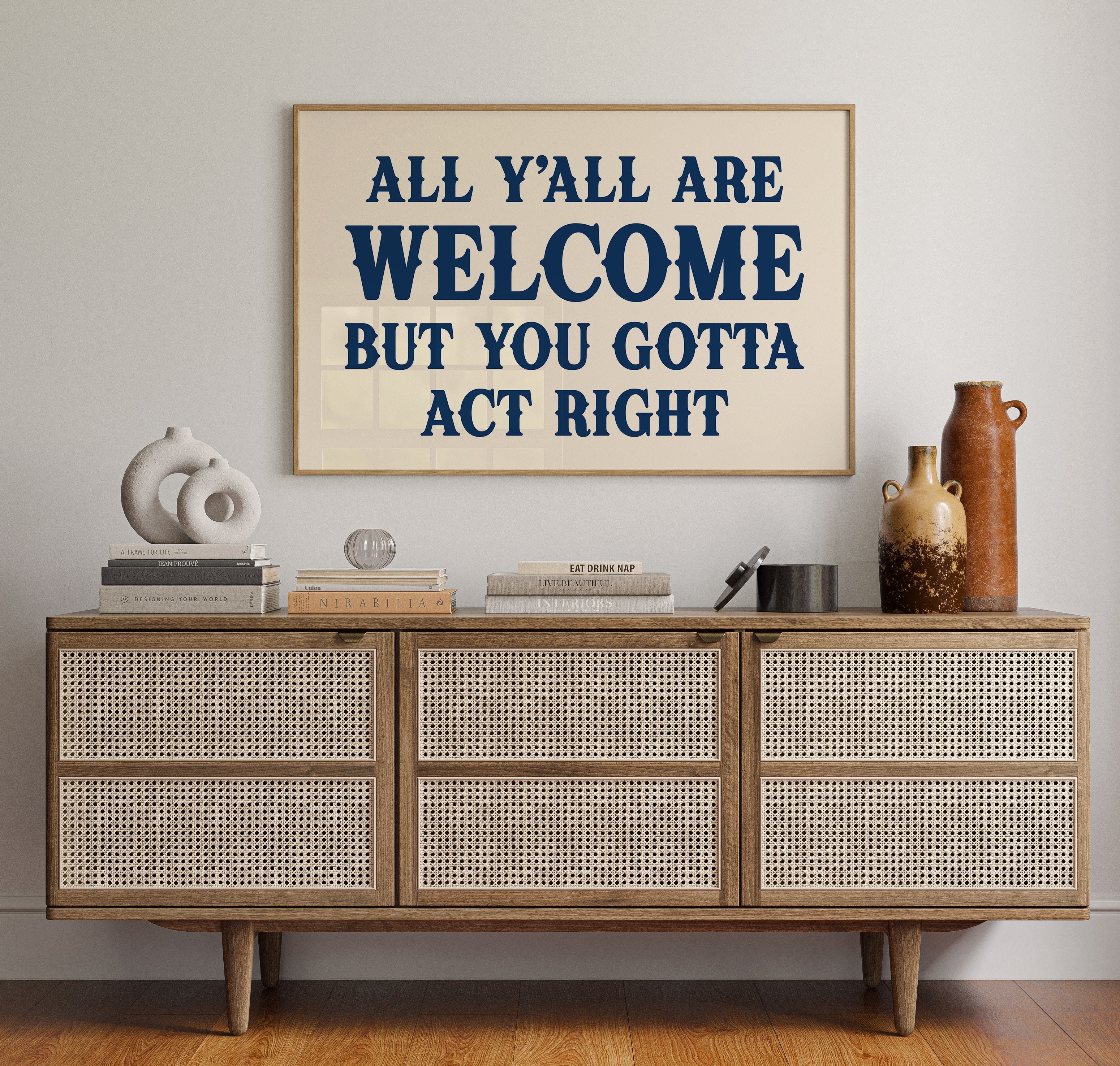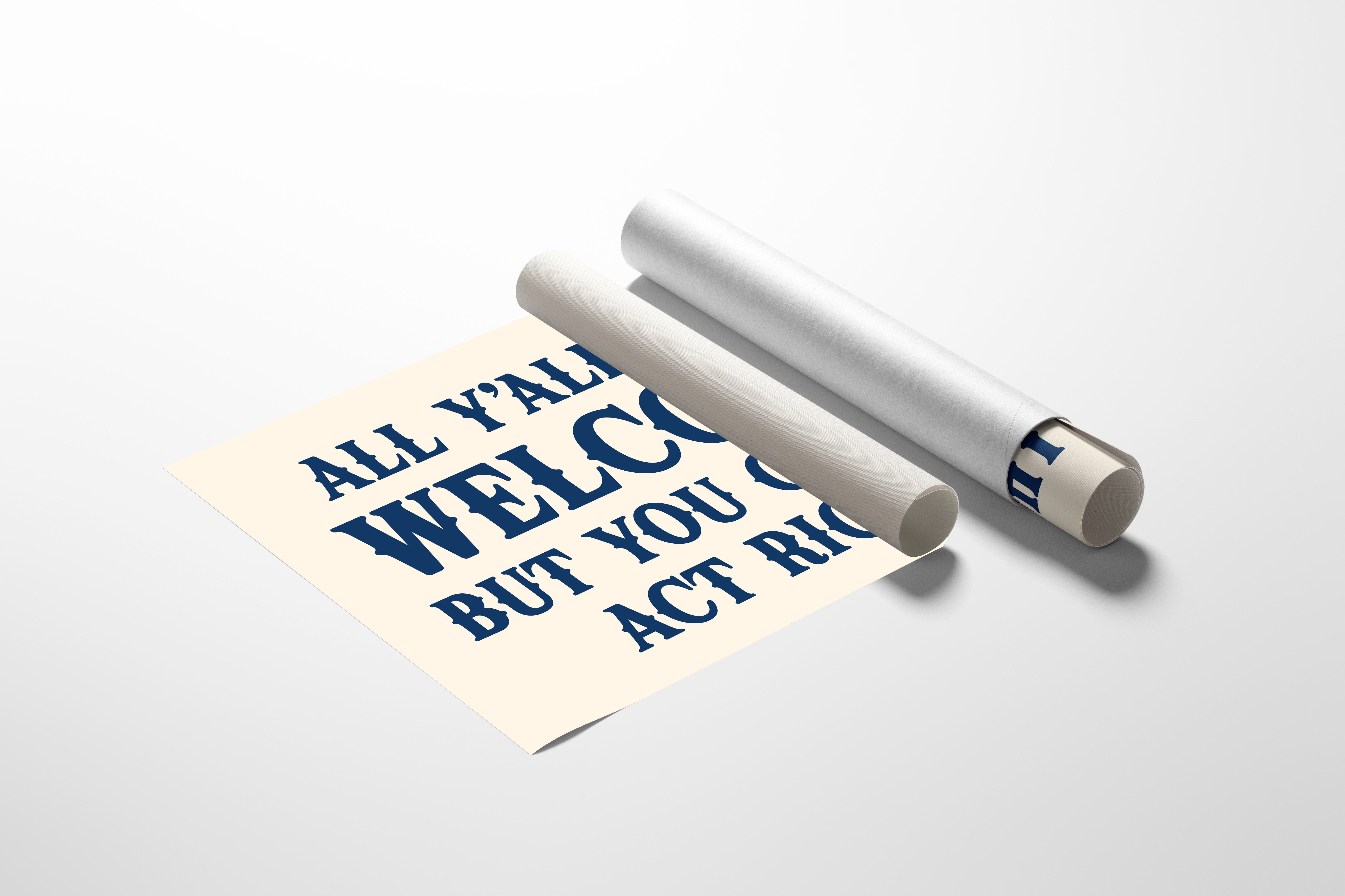 Deep navy letters stand bold against a warm cream backdrop, offering both invitation and gentle reminder. The playful Southern vernacular creates an immediate sense of hospitality with its charming directness. The typography feels both vintage and contemporary, with its slightly imperfect edges giving it an authentic, handcrafted quality that speaks to traditional values with a modern twist. This piece would bring character to an entryway, kitchen, or living room where it serves as both welcoming statement and conversation starter.