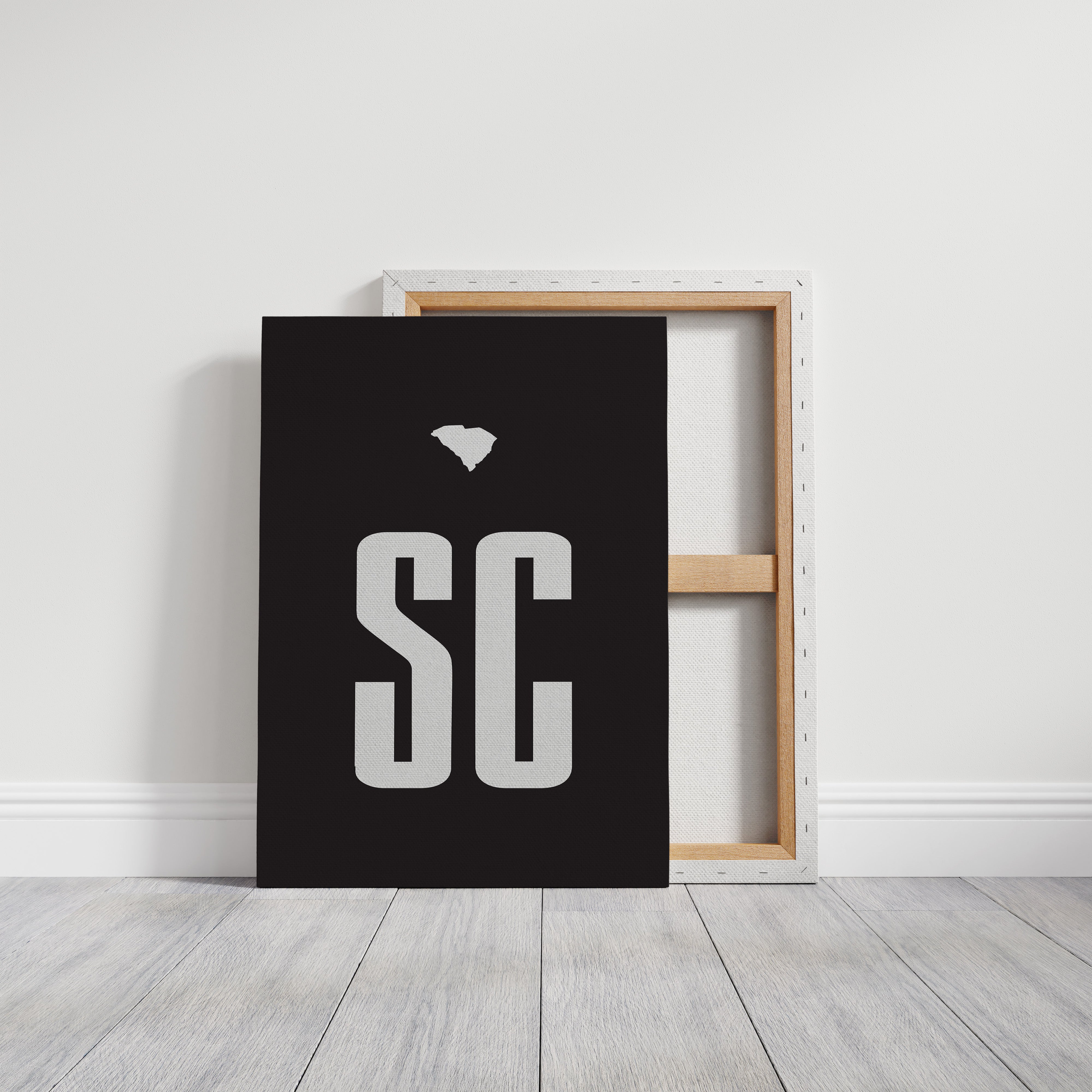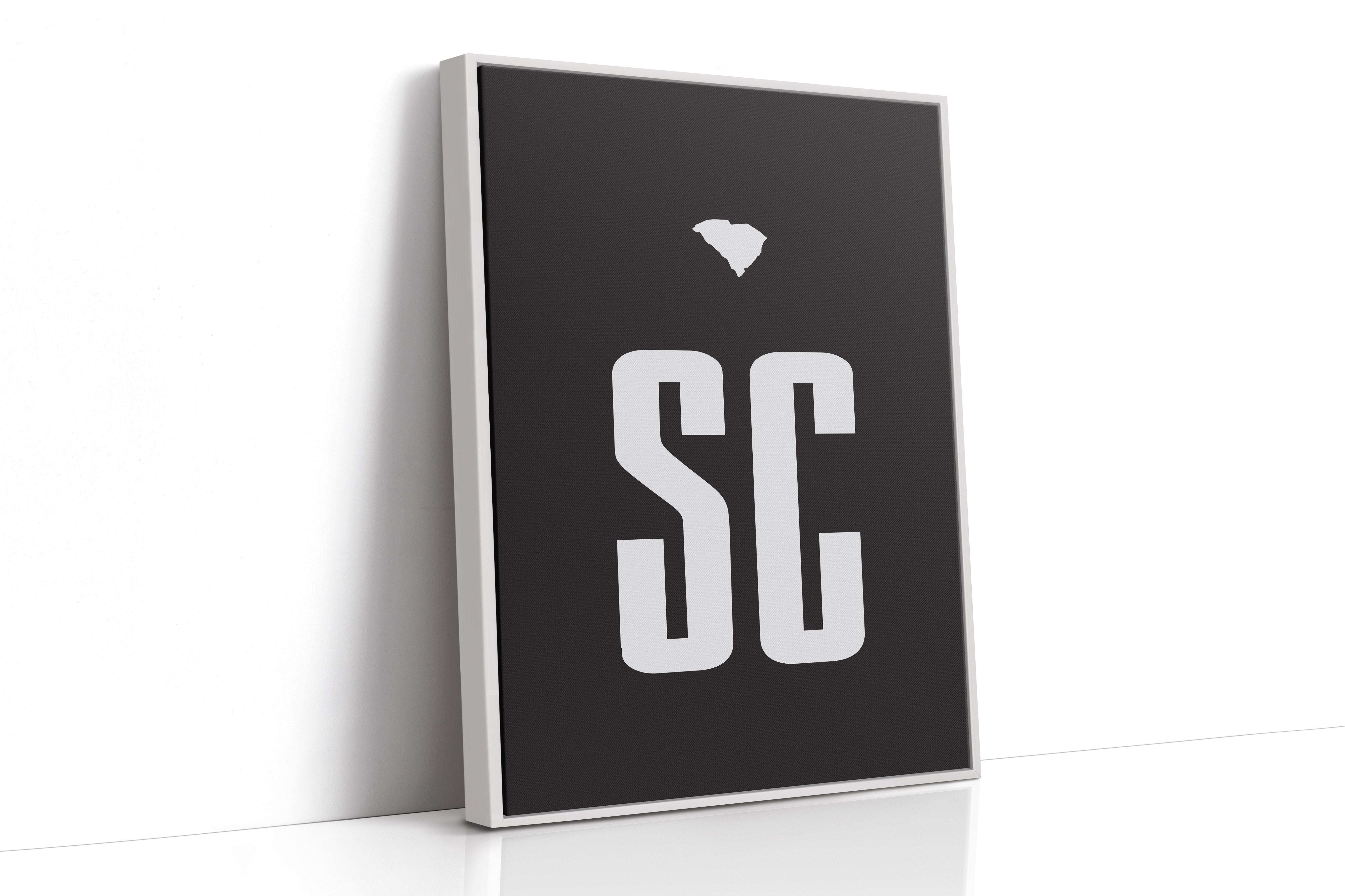 Bold typography stands stark against darkness, creating a powerful statement of regional identity. The crisp ""SC"" letterforms anchor the composition while South Carolina's distinctive silhouette floats above, a visual crown celebrating state heritage. The minimalist design speaks volumes through negative space, letting white shapes command attention against the deep black background. Perfect for a modern office, creative studio, or any space that celebrates clean design and local pride.